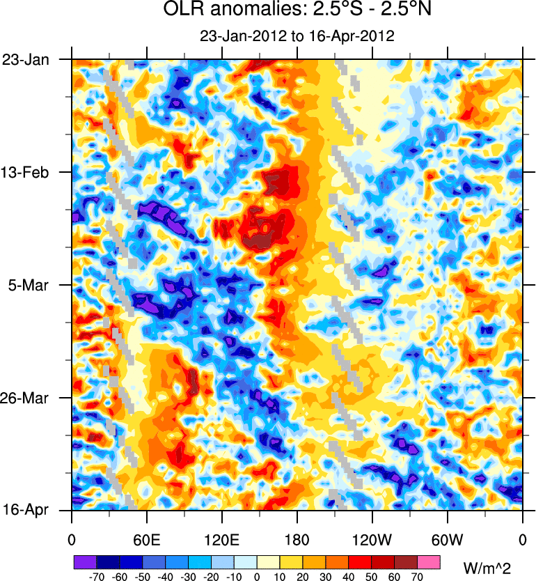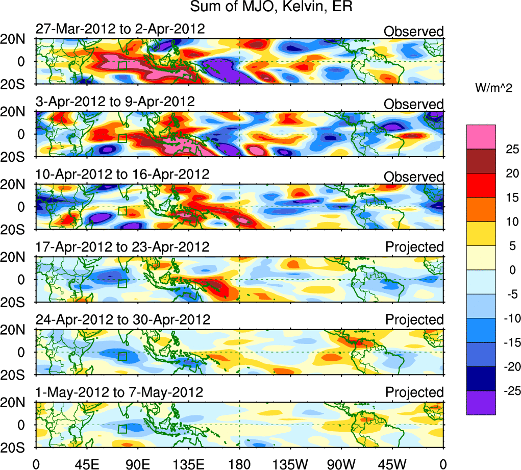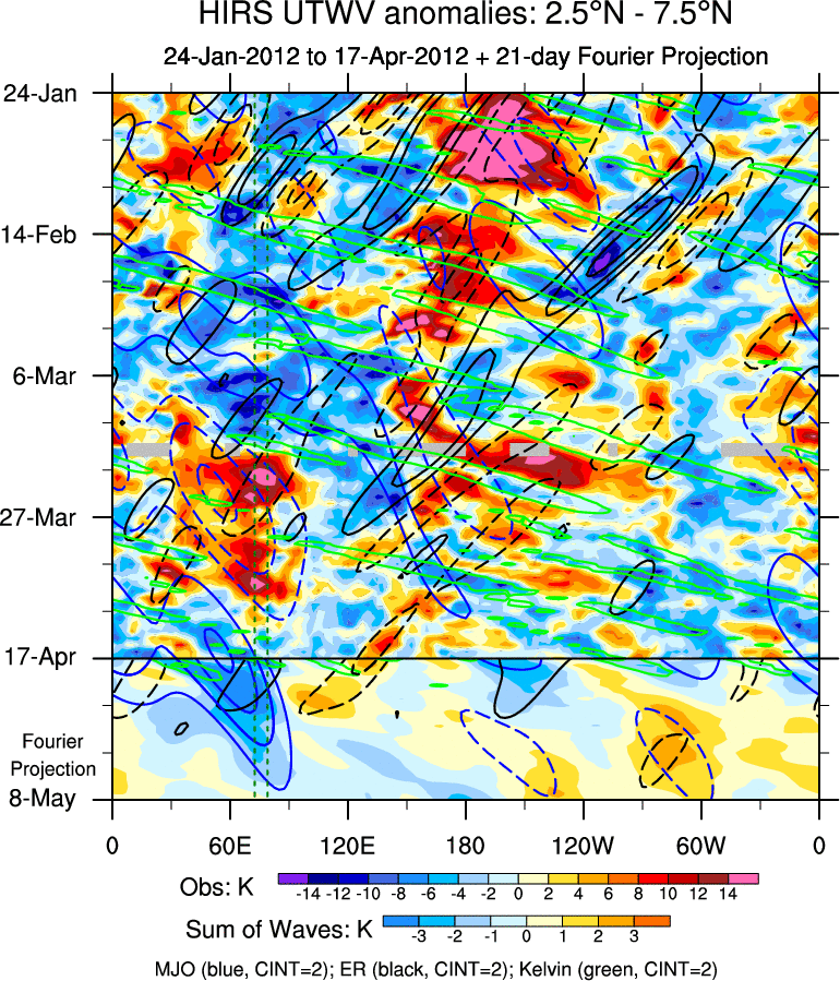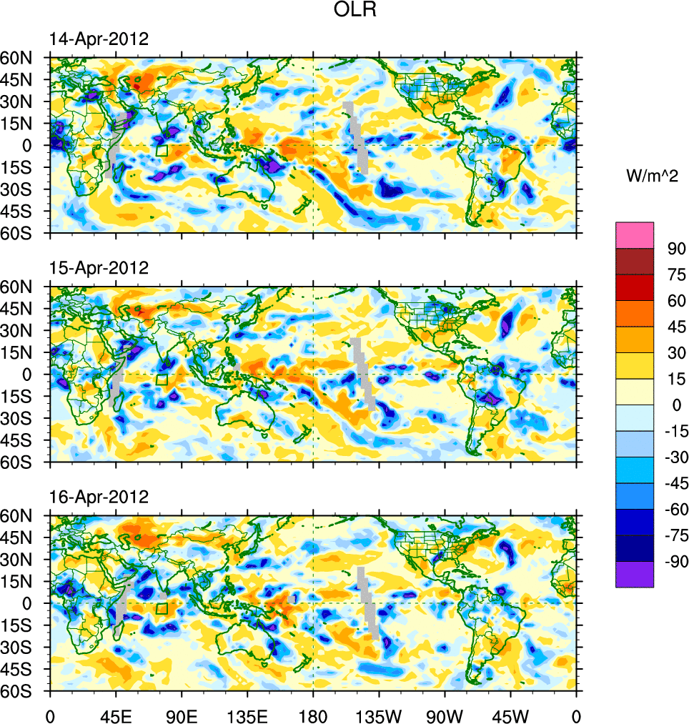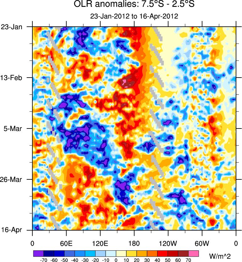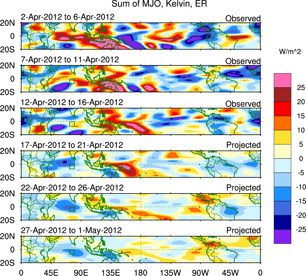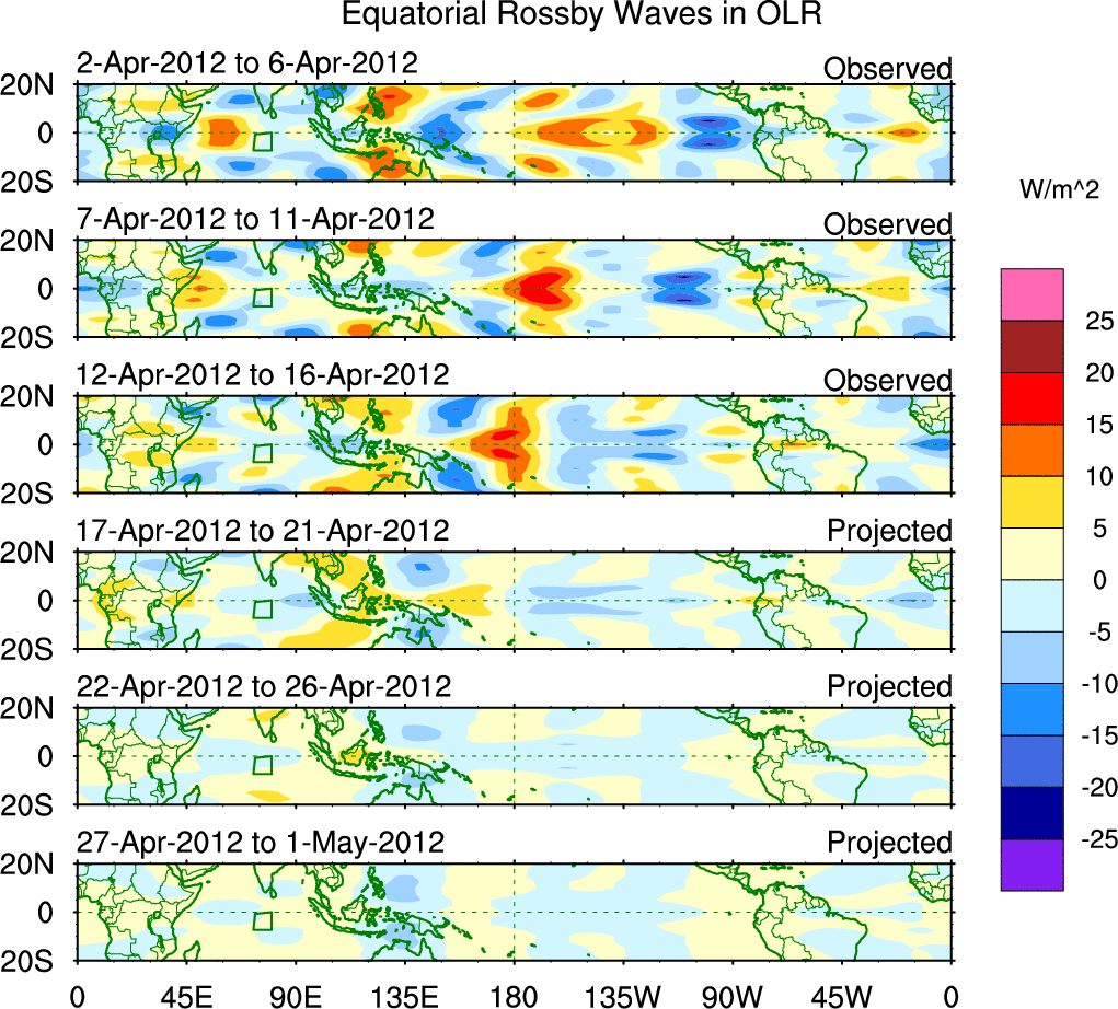 To identify tropical waves in near real-time, the OLR and UTWV data are filtered following Wheeler & Weickmann (2001 MWR). The daily anomalies are calculated using the first 3 harmonics of the seasonal cycle for 1979–2009. Missing values are then filled using linear interpolation in space and time. The most recent 365 days of anomalies are padded with 659 days of zeroes, and the result is filtered for each wave type.