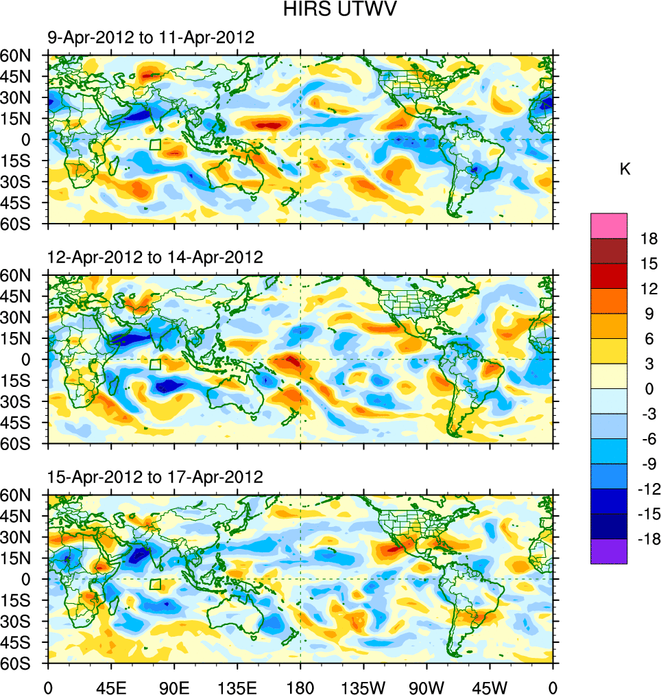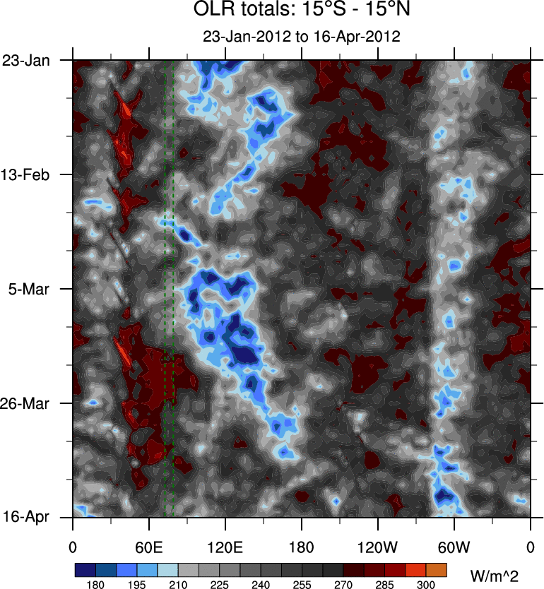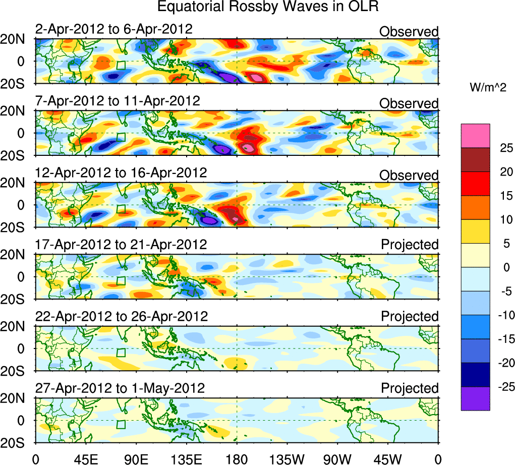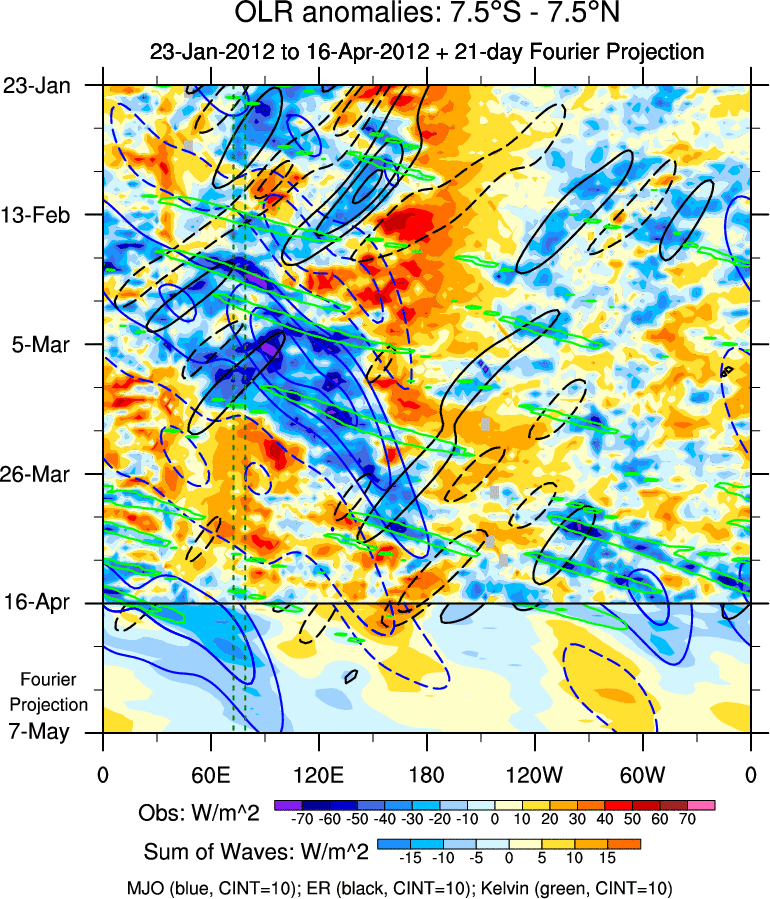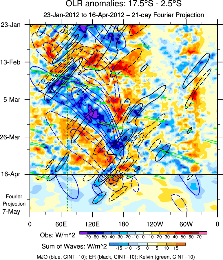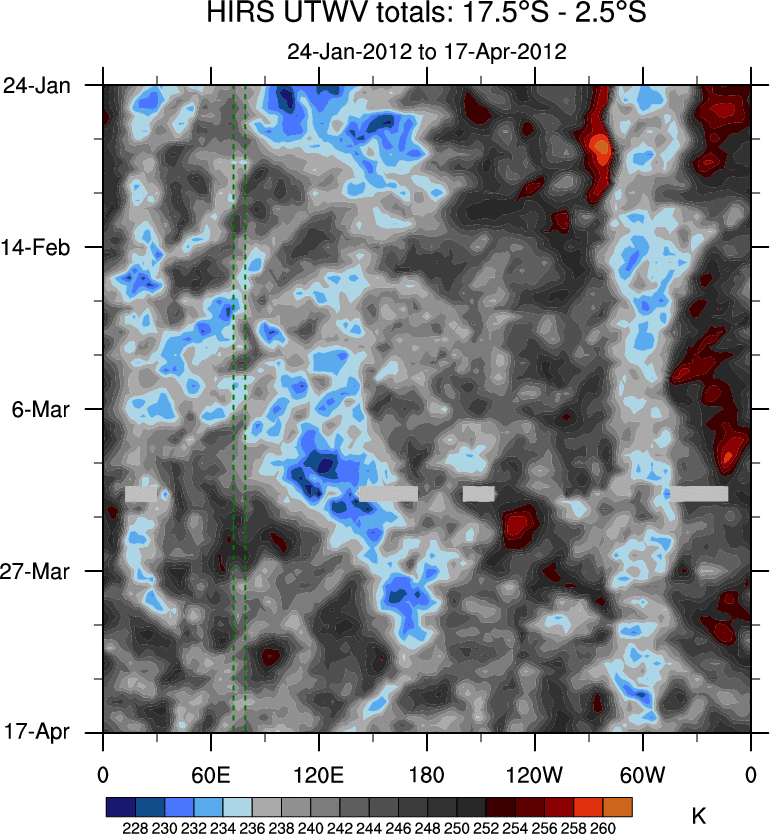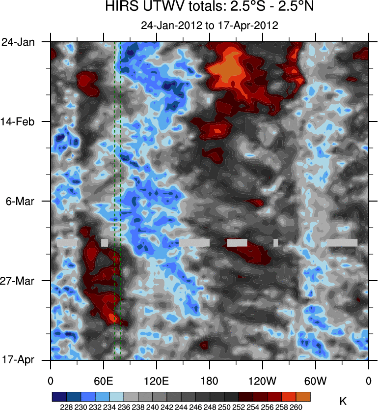 To identify tropical waves in near real-time, the OLR and UTWV data are filtered following Wheeler & Weickmann (2001 MWR). The daily anomalies are calculated using the first 3 harmonics of the seasonal cycle for 1979–2009. Missing values are then filled using linear interpolation in space and time. The most recent 365 days of anomalies are padded with 659 days of zeroes, and the result is filtered for each wave type.