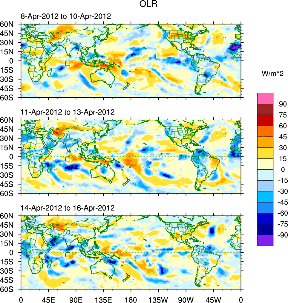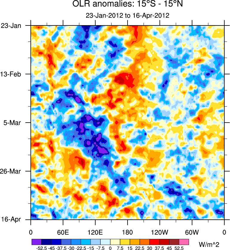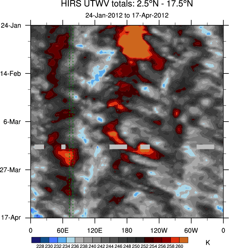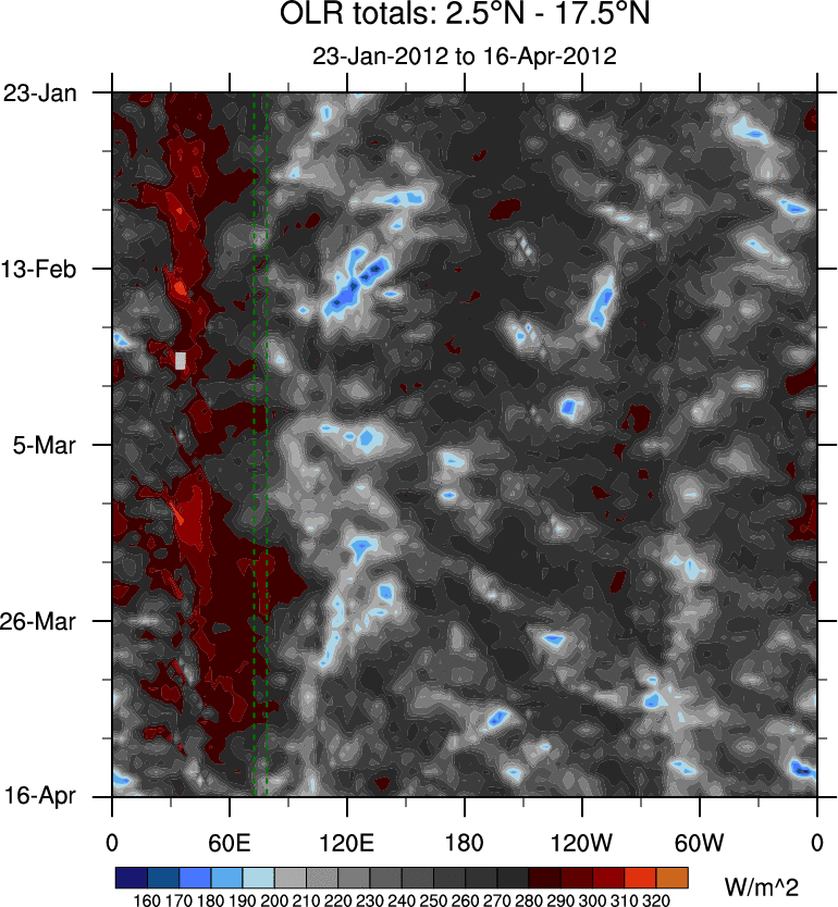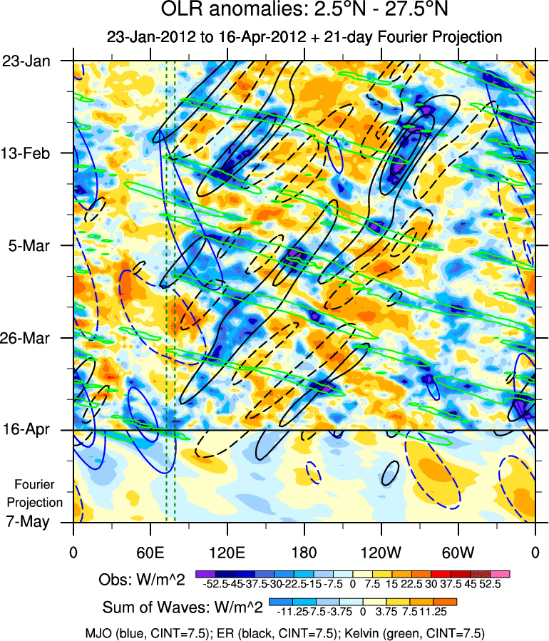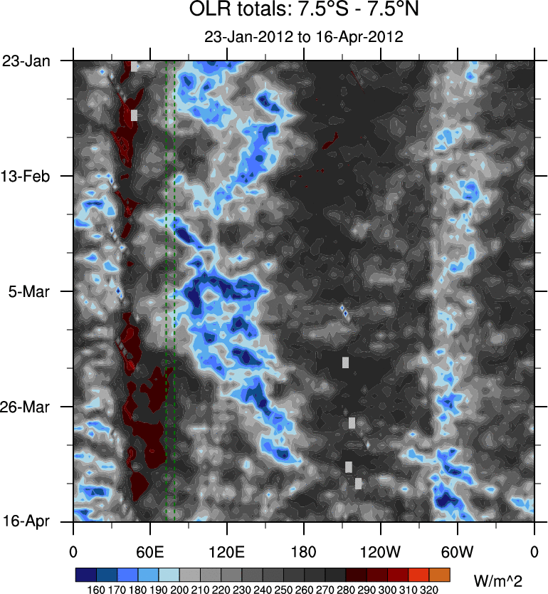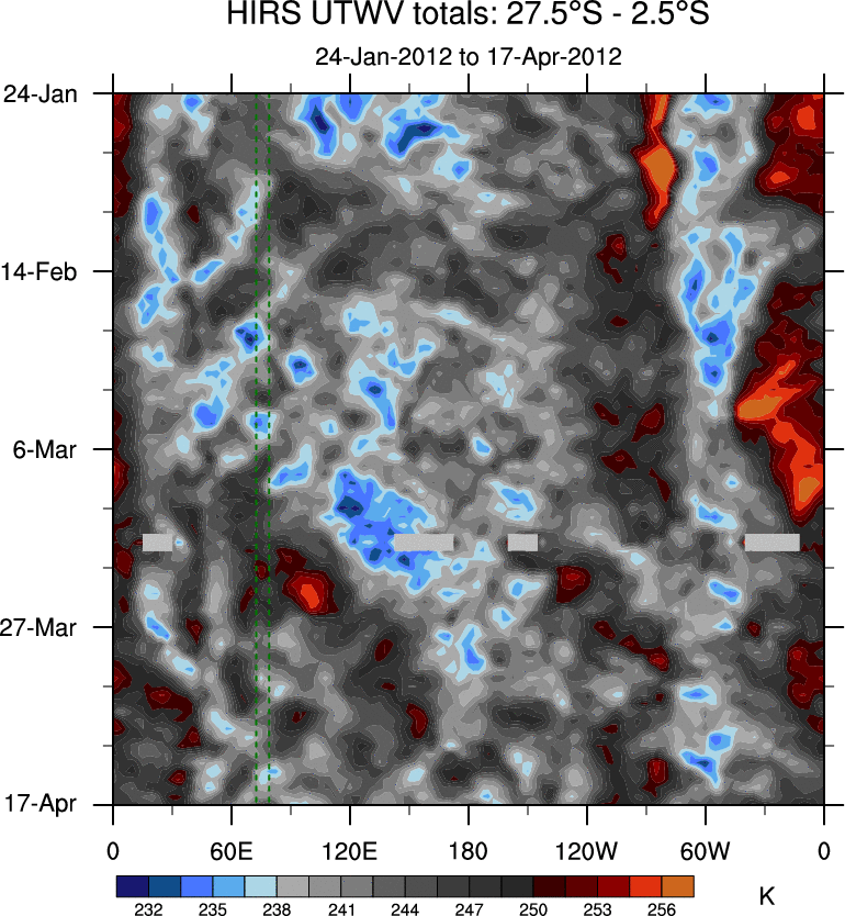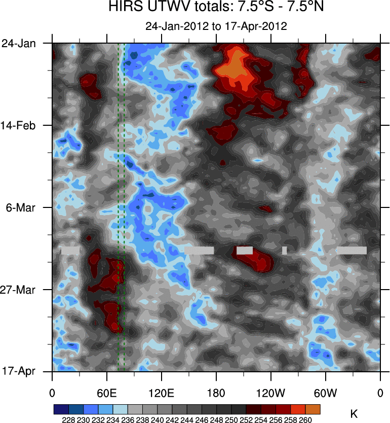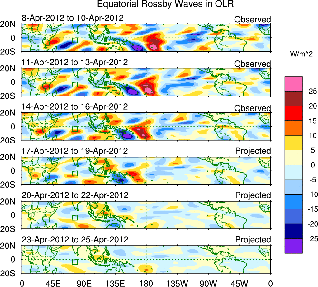To identify tropical waves in near real-time, the OLR and UTWV data are filtered following Wheeler & Weickmann (2001 MWR). The daily anomalies are calculated using the first 3 harmonics of the seasonal cycle for 1979–2009. Missing values are then filled using linear interpolation in space and time. The most recent 365 days of anomalies are padded with 659 days of zeroes, and the result is filtered for each wave type.