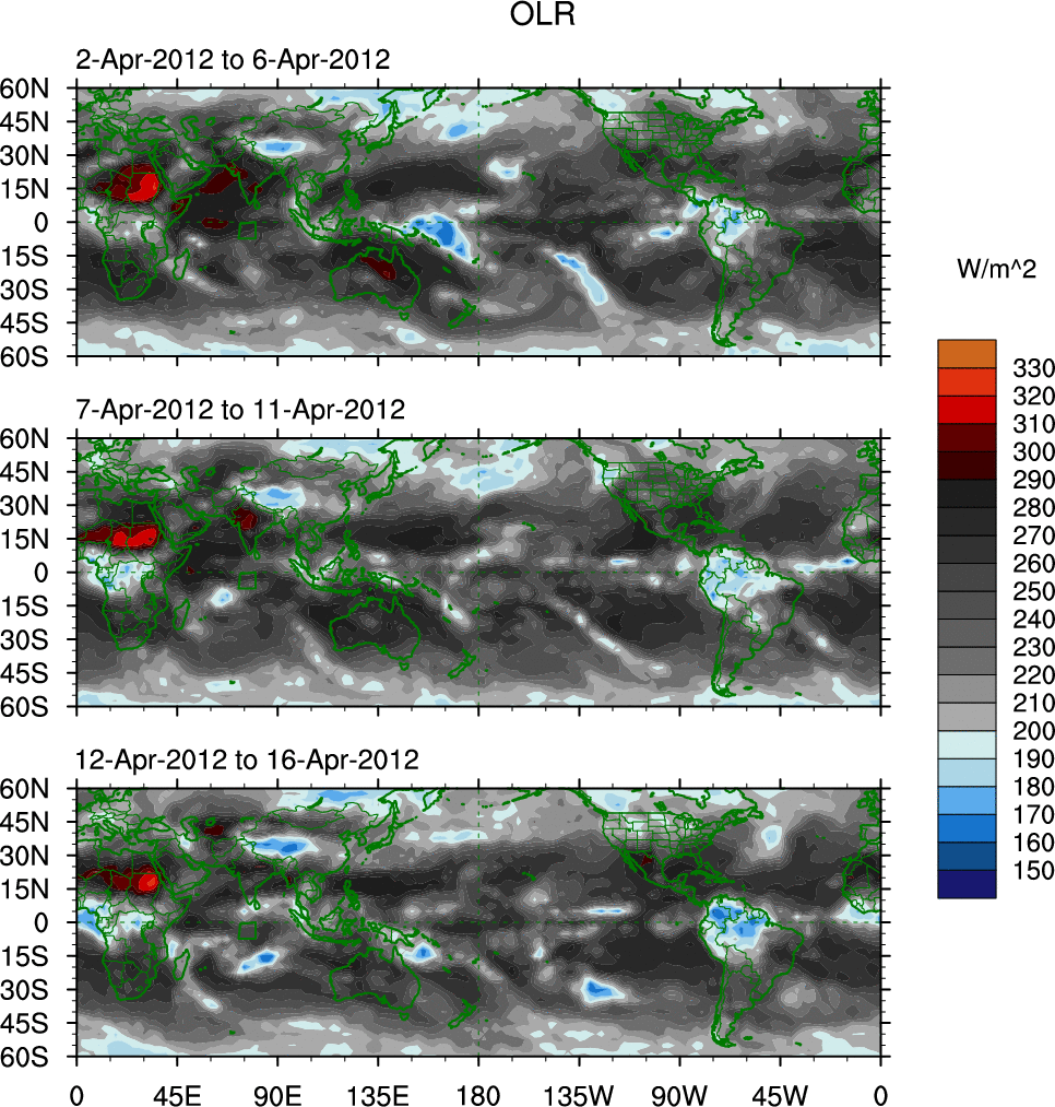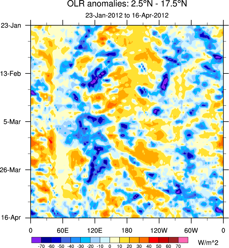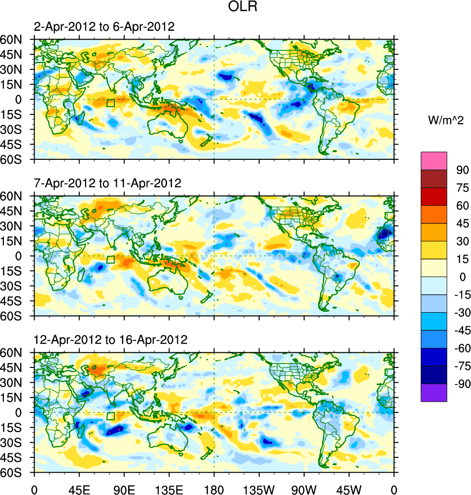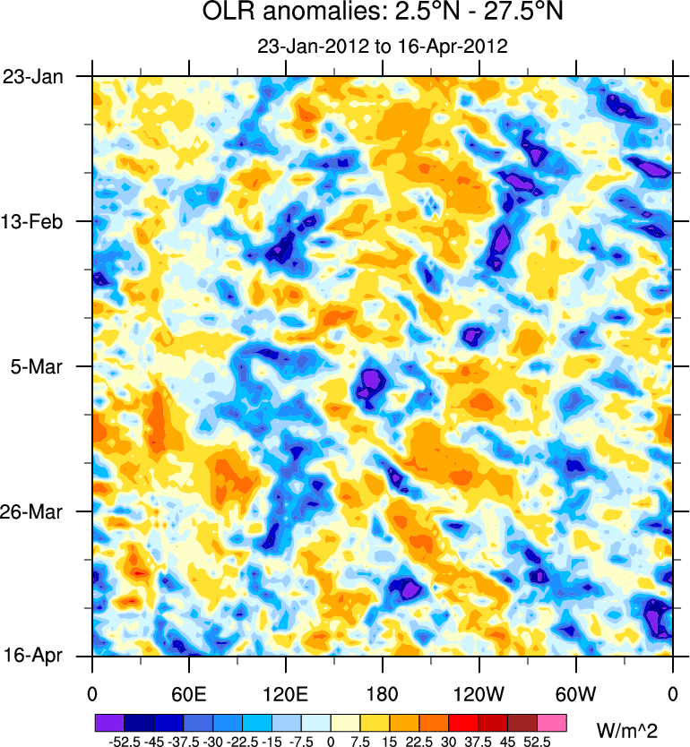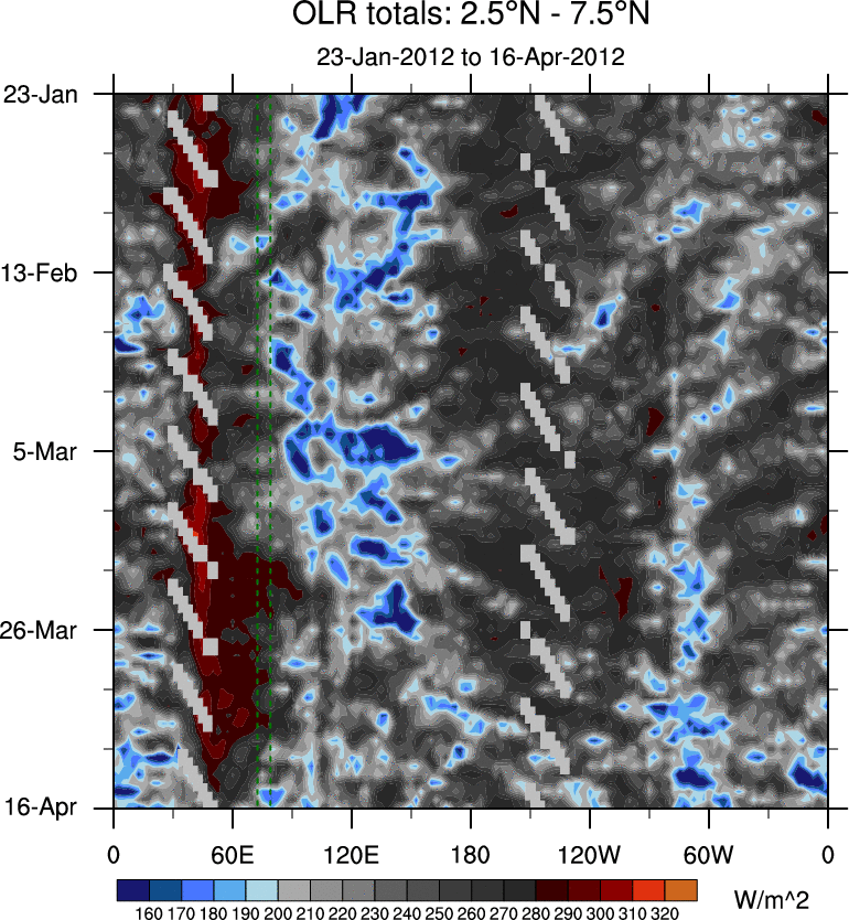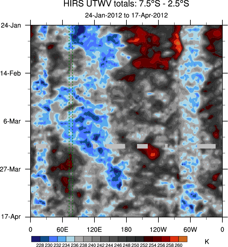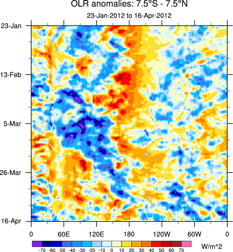 To identify tropical waves in near real-time, the OLR and UTWV data are filtered following Wheeler & Weickmann (2001 MWR). The daily anomalies are calculated using the first 3 harmonics of the seasonal cycle for 1979–2009. Missing values are then filled using linear interpolation in space and time. The most recent 365 days of anomalies are padded with 659 days of zeroes, and the result is filtered for each wave type.