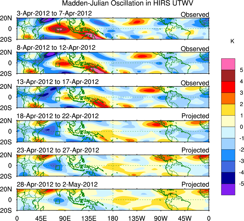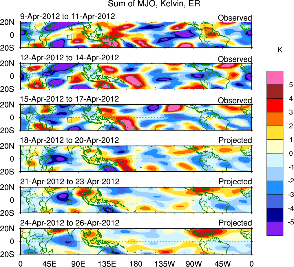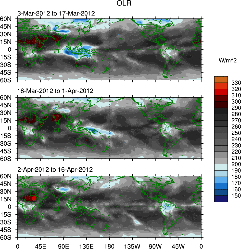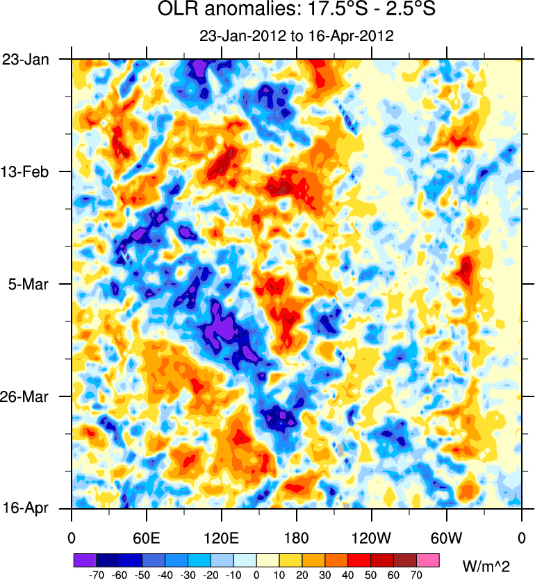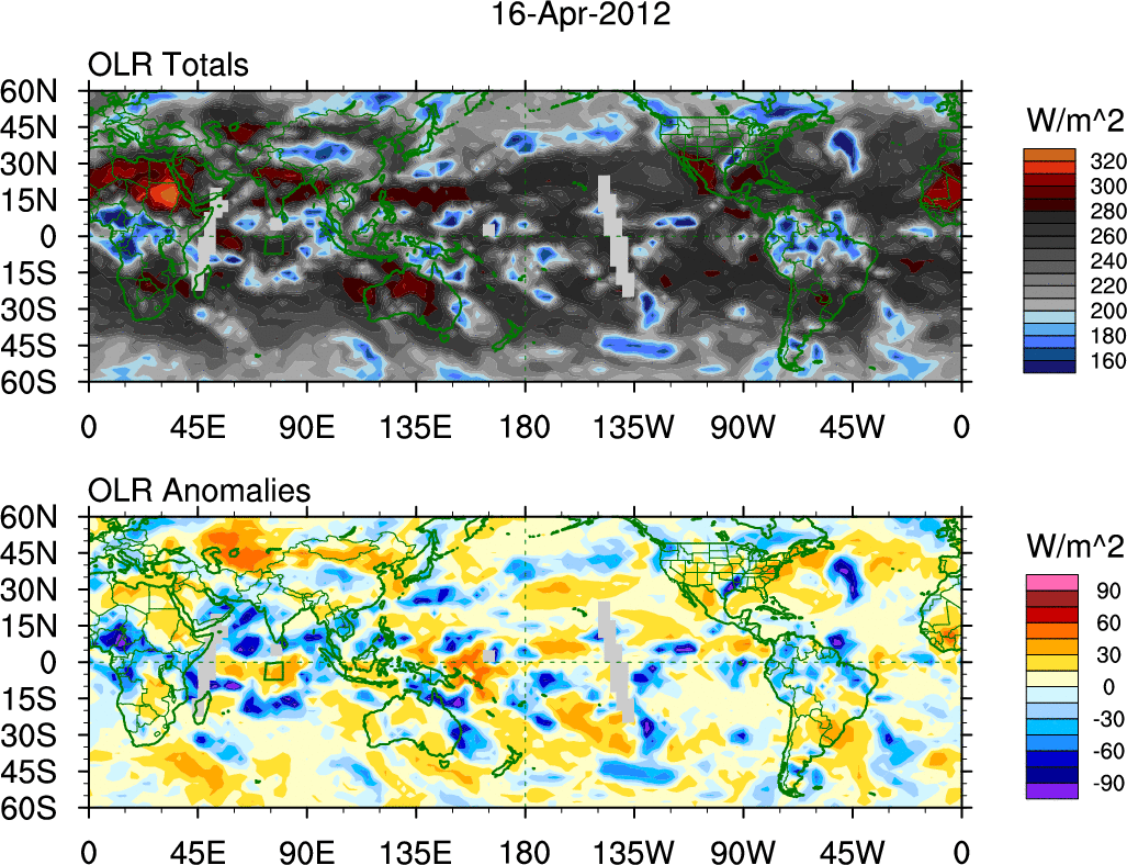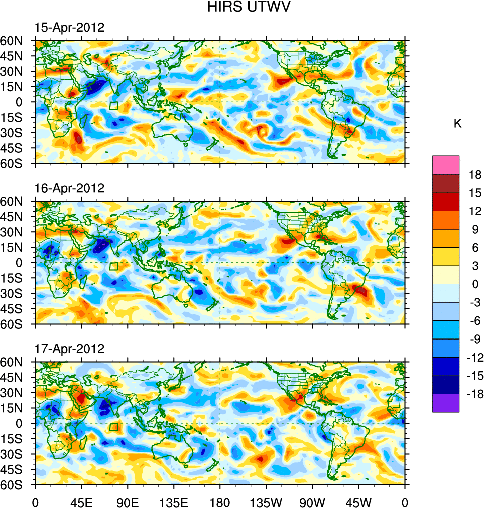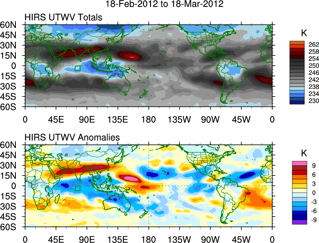 To identify tropical waves in near real-time, the OLR and UTWV data are filtered following Wheeler & Weickmann (2001 MWR). The daily anomalies are calculated using the first 3 harmonics of the seasonal cycle for 1979–2009. Missing values are then filled using linear interpolation in space and time. The most recent 365 days of anomalies are padded with 659 days of zeroes, and the result is filtered for each wave type.