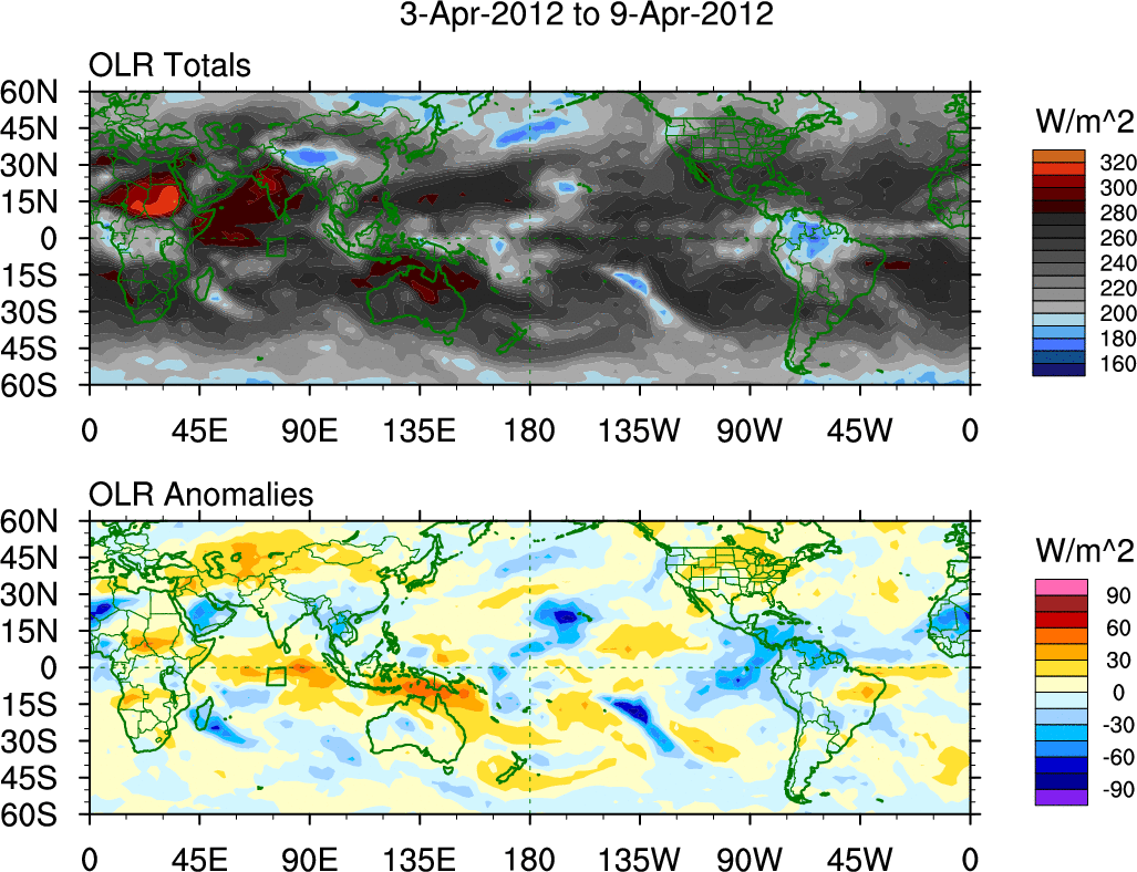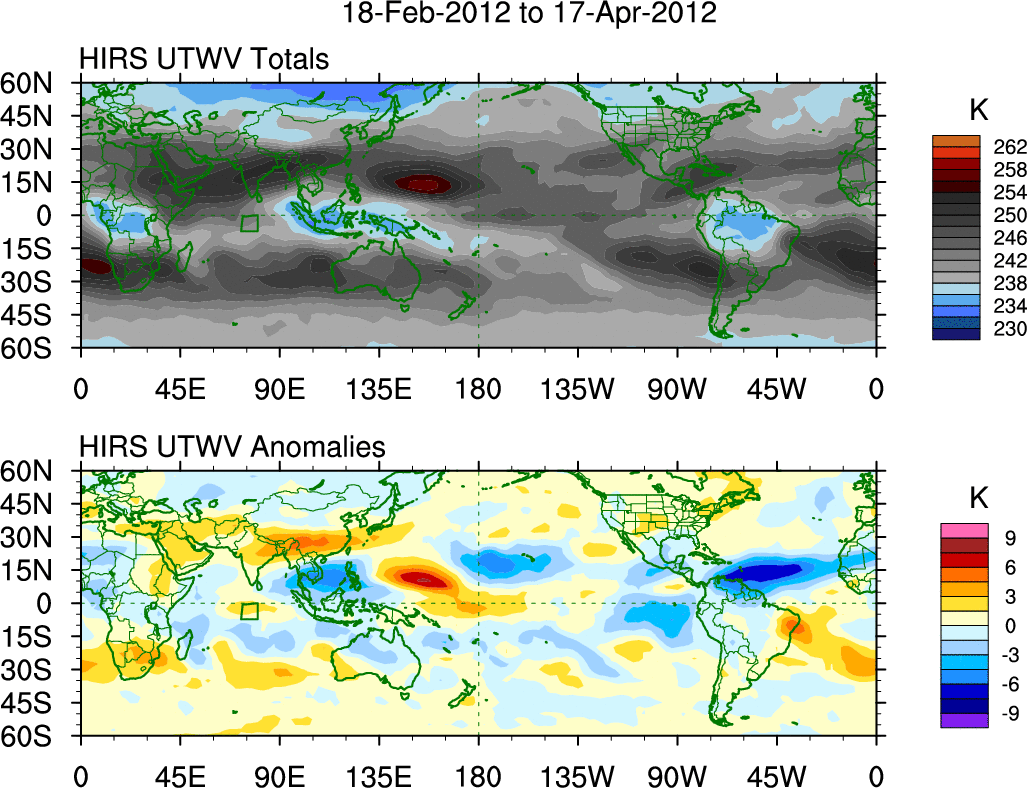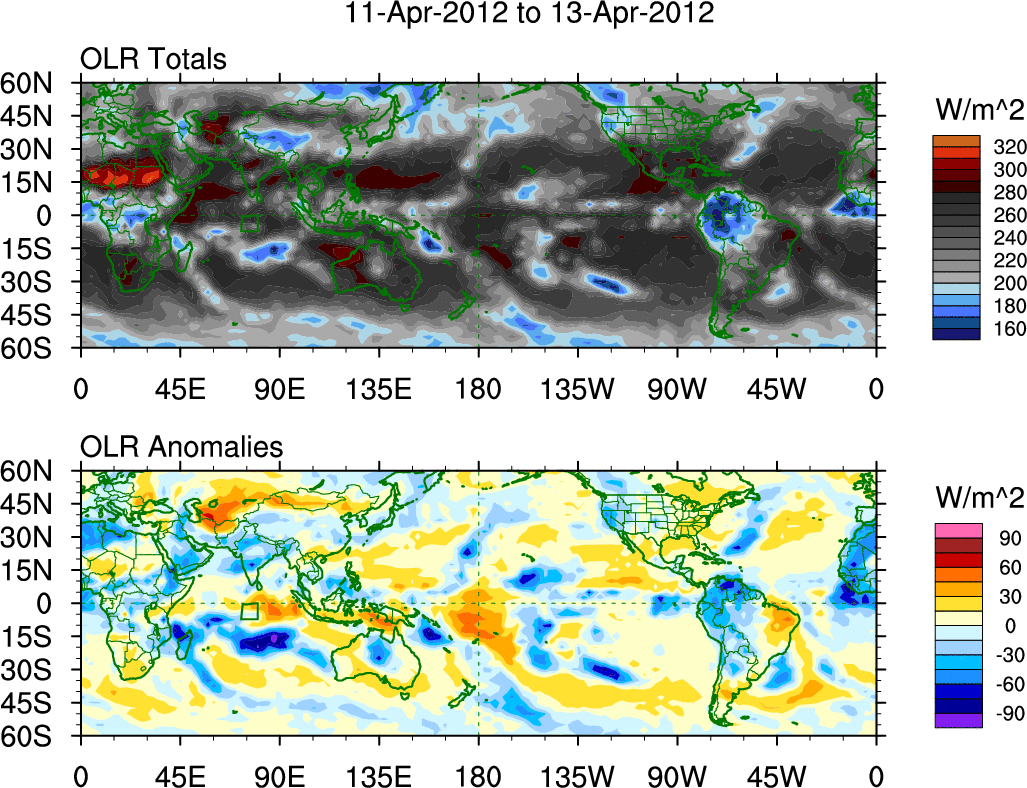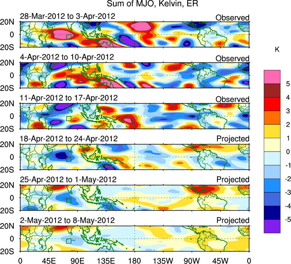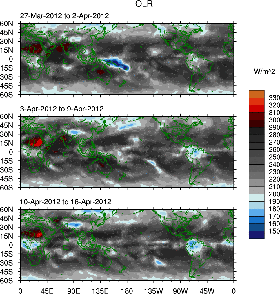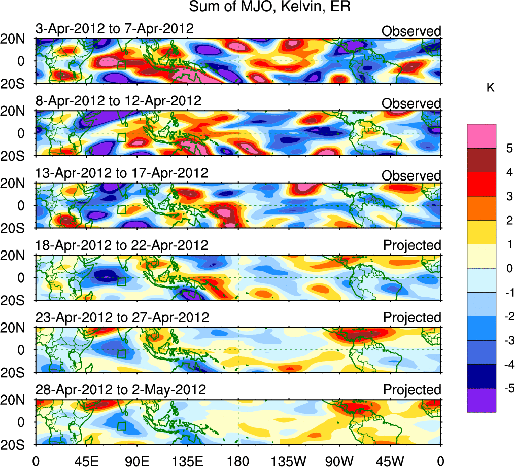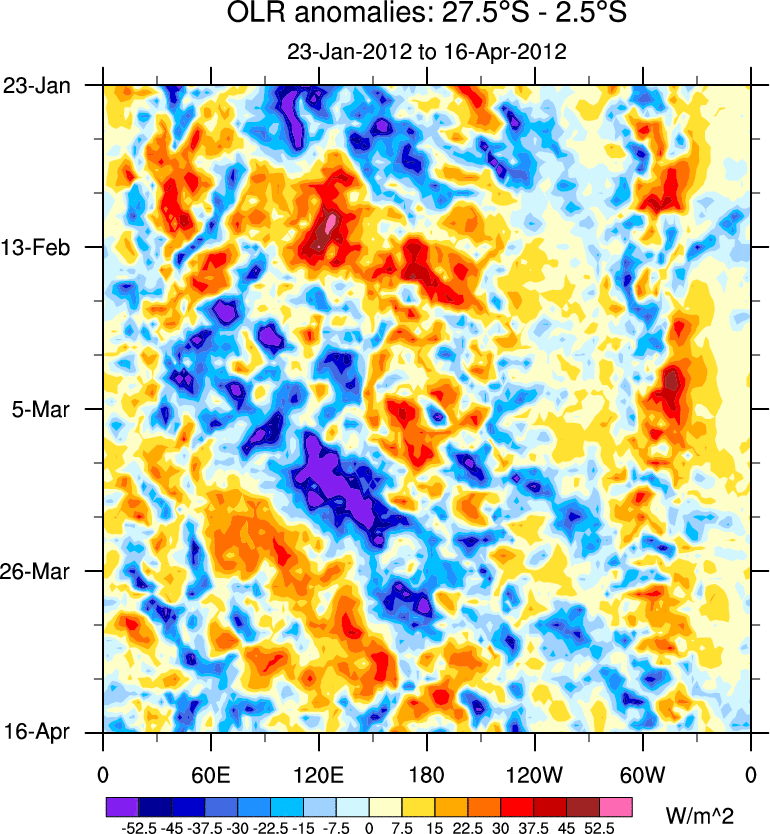 To identify tropical waves in near real-time, the OLR and UTWV data are filtered following Wheeler & Weickmann (2001 MWR). The daily anomalies are calculated using the first 3 harmonics of the seasonal cycle for 1979–2009. Missing values are then filled using linear interpolation in space and time. The most recent 365 days of anomalies are padded with 659 days of zeroes, and the result is filtered for each wave type.