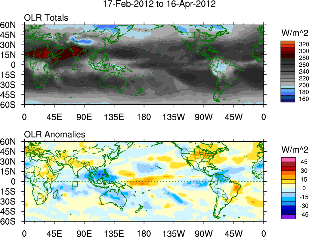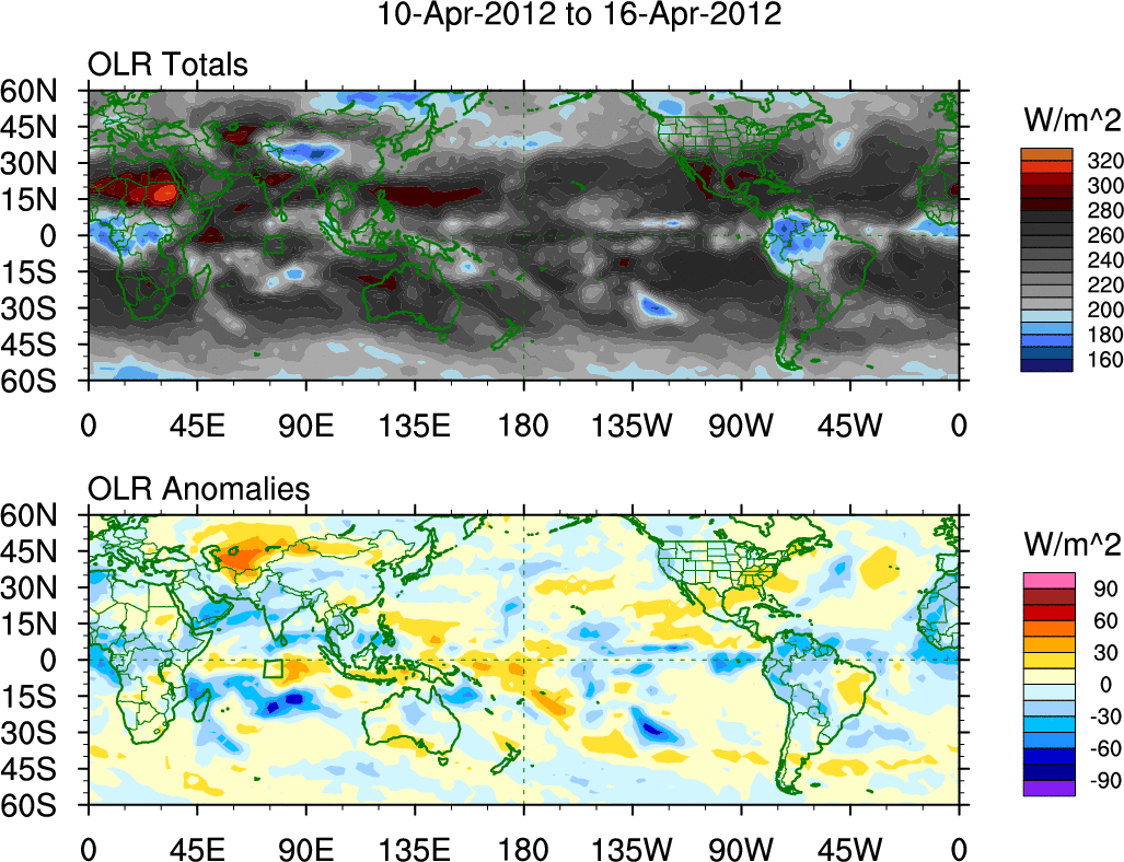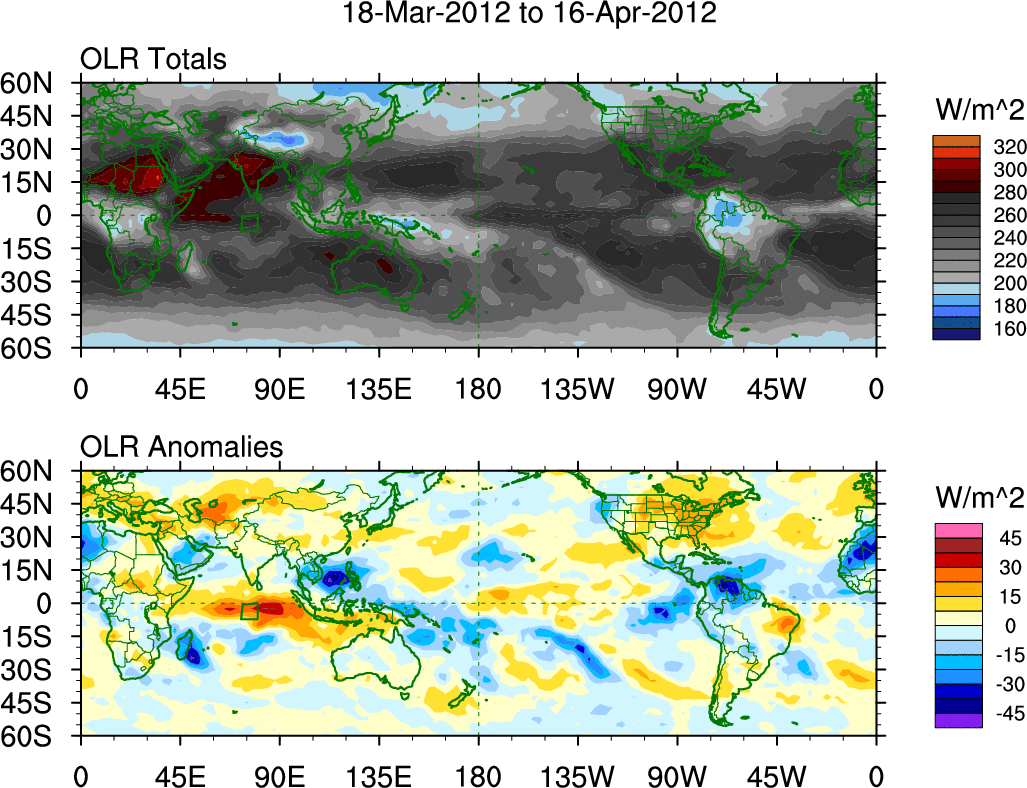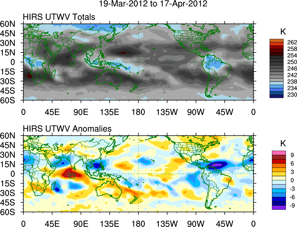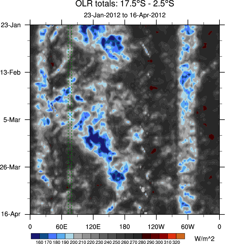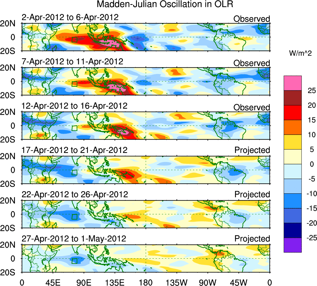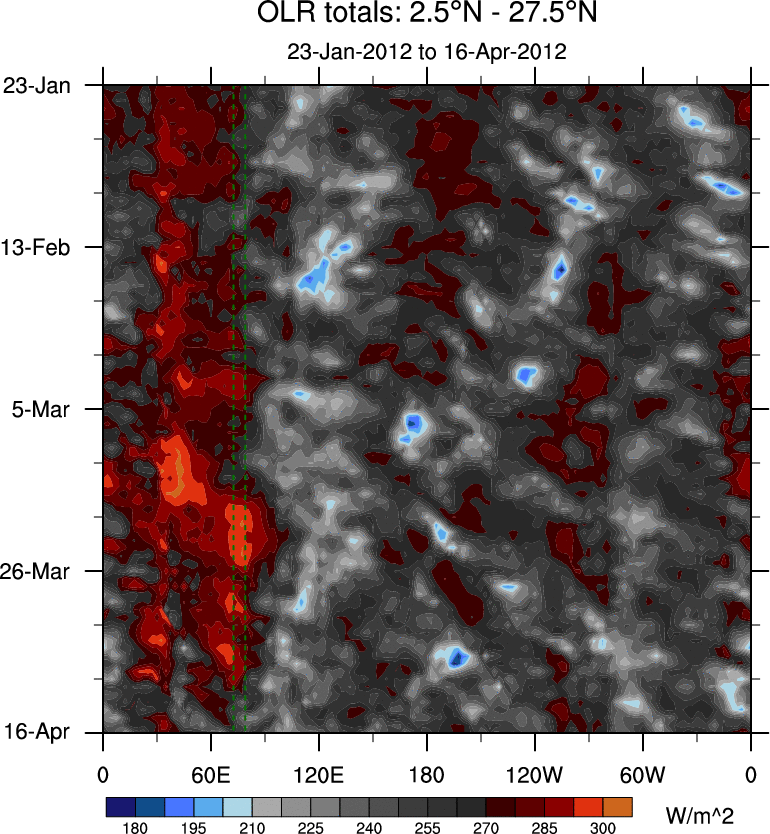 To identify tropical waves in near real-time, the OLR and UTWV data are filtered following Wheeler & Weickmann (2001 MWR). The daily anomalies are calculated using the first 3 harmonics of the seasonal cycle for 1979–2009. Missing values are then filled using linear interpolation in space and time. The most recent 365 days of anomalies are padded with 659 days of zeroes, and the result is filtered for each wave type.
