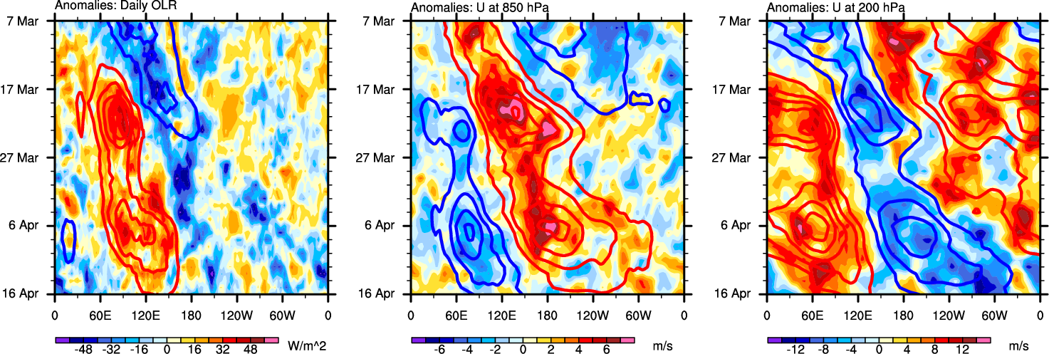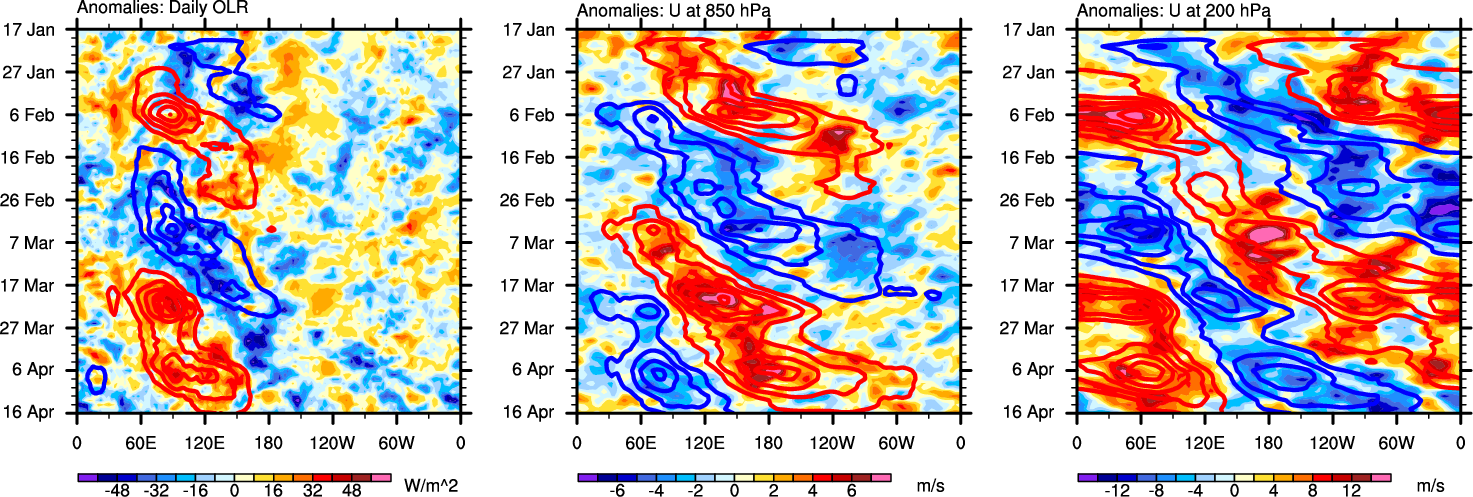 The Hovmollers show longitude-time plots for OLR, U-850, and U-200. The shading indicates the observed anomalies, while the contours are the projection of those anomalies onto the RMM EOFs.