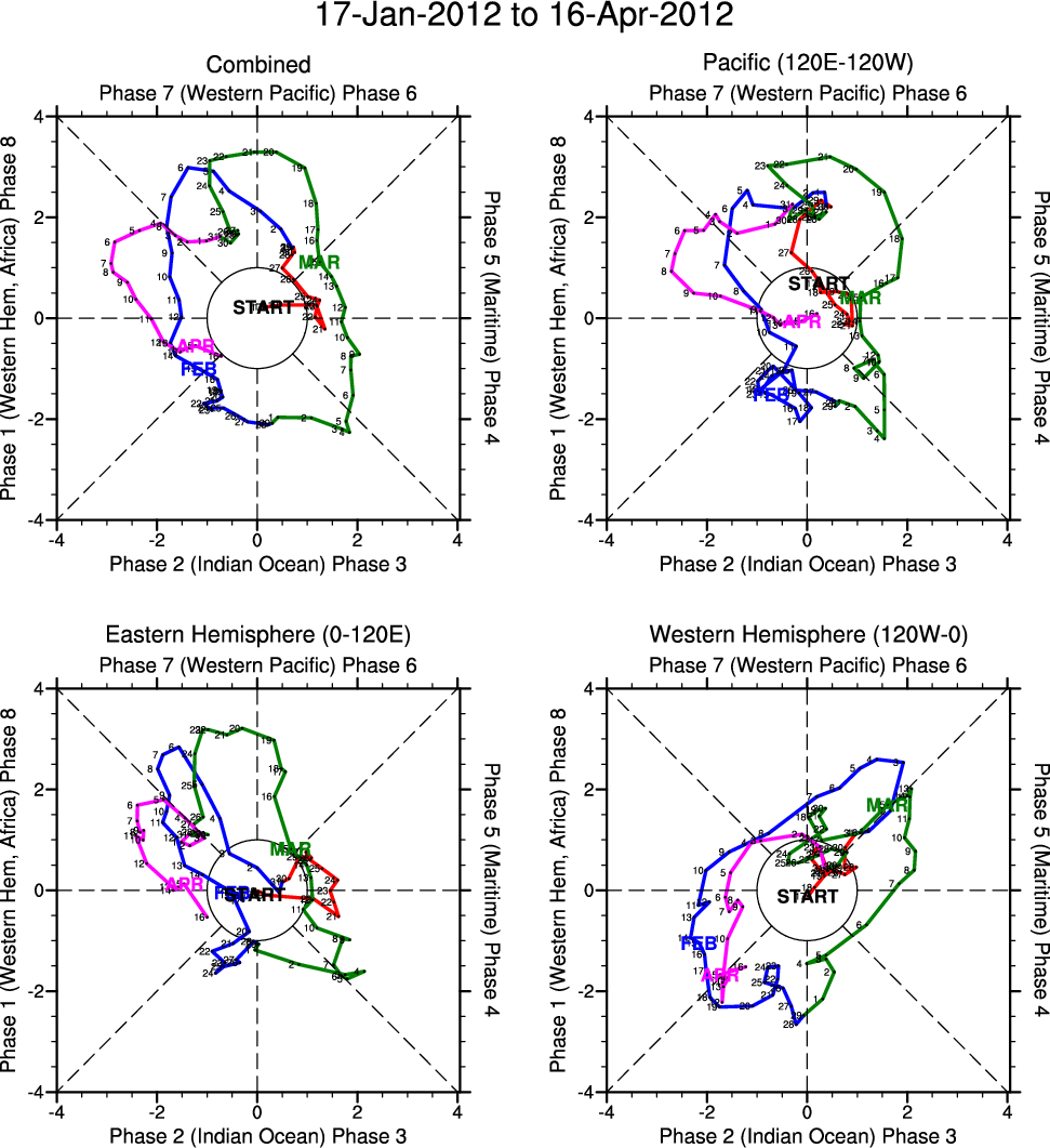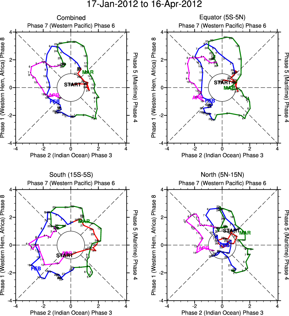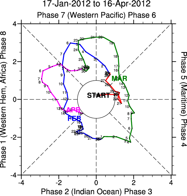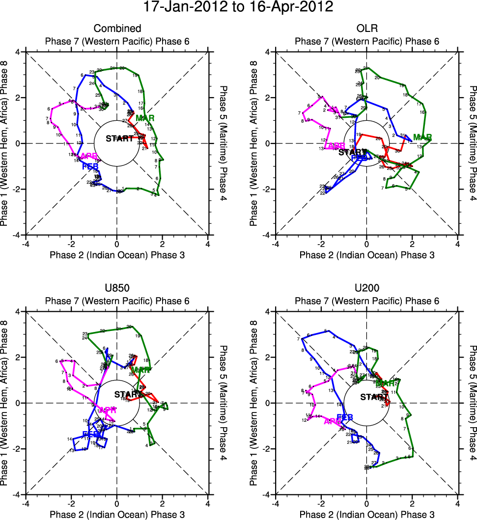 Wheeler and Hendon (2004) constructed the RMM index for monitoring the MJO. This index consists of the first two principal components (PCs) of OLR, 850-hPa zonal wind, and 200-hPa zonal wind averaged 15S-15N.