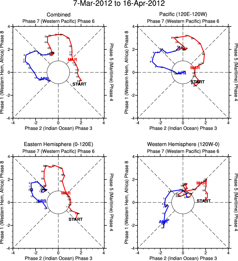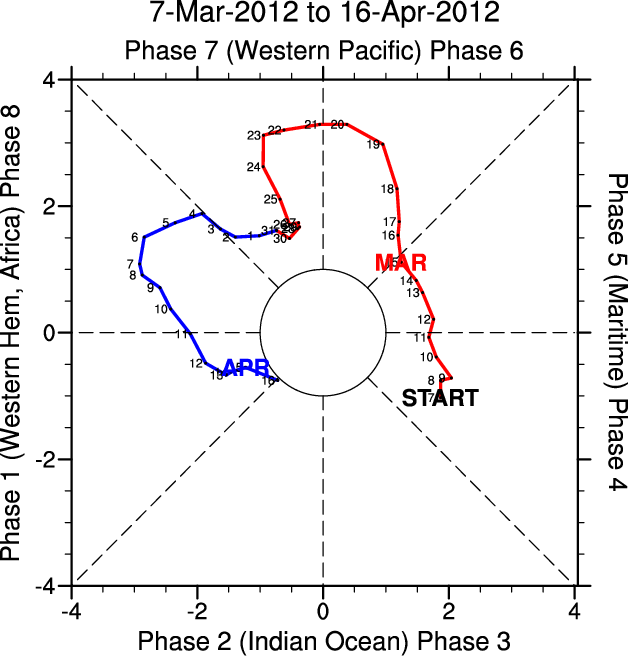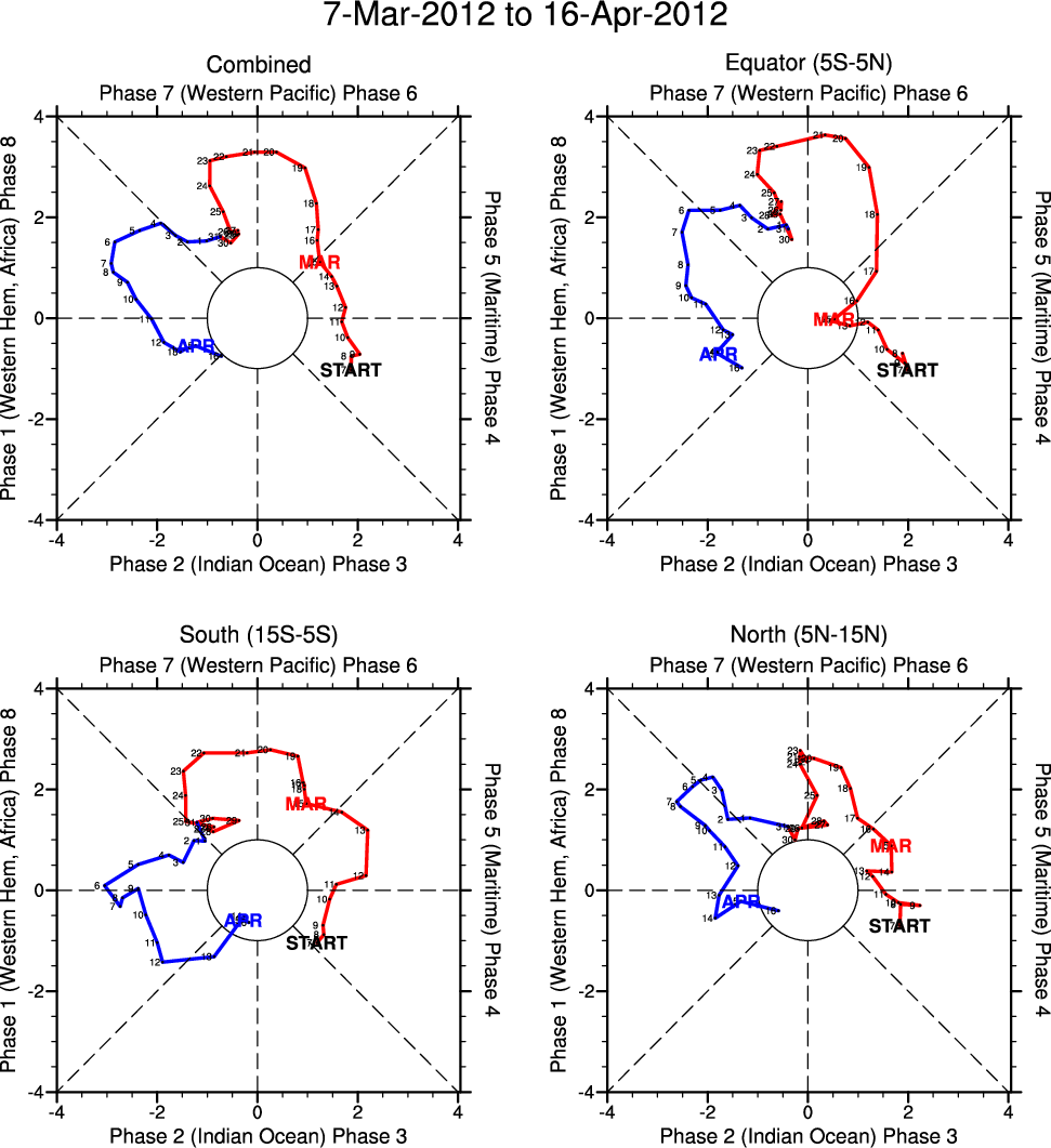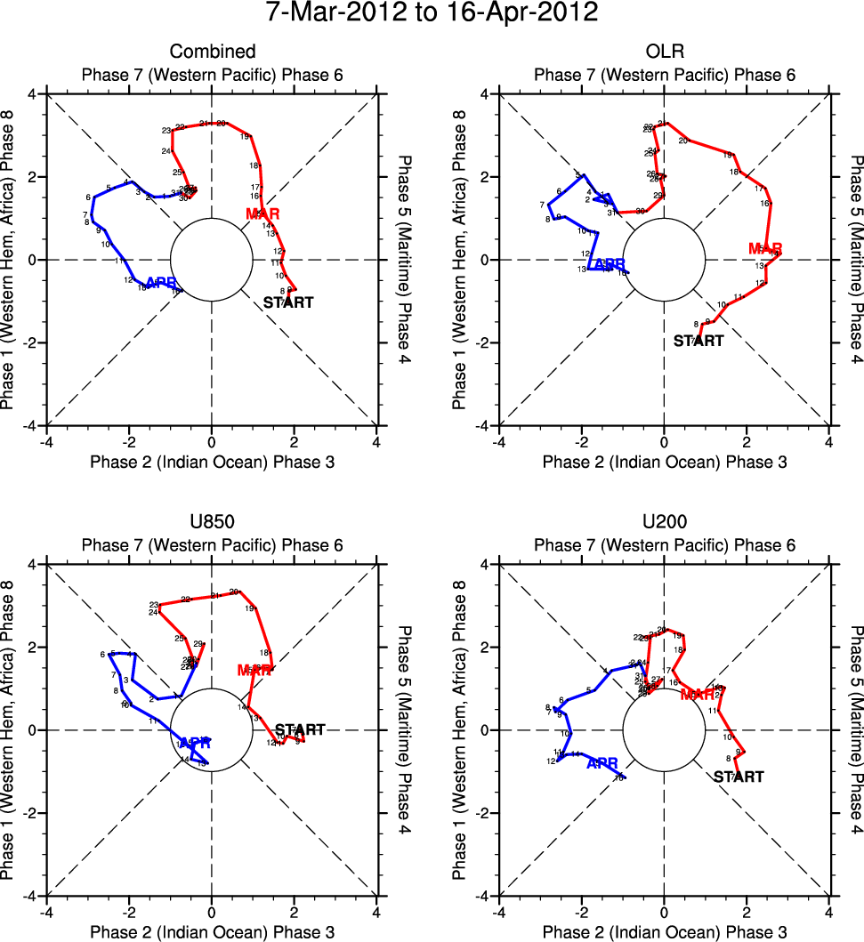 Wheeler and Hendon (2004) constructed the RMM index for monitoring the MJO. This index consists of the first two principal components (PCs) of OLR, 850-hPa zonal wind, and 200-hPa zonal wind averaged 15S-15N.