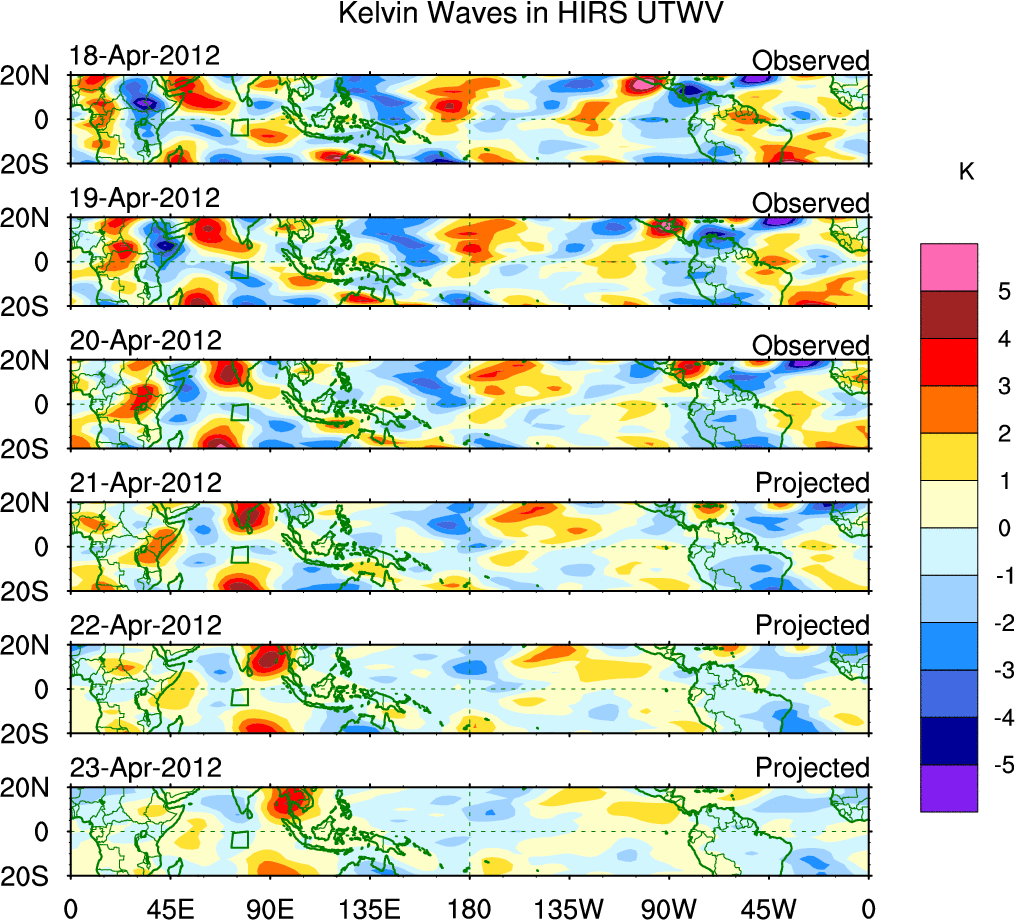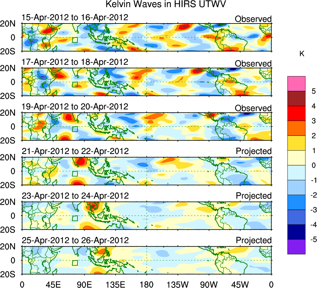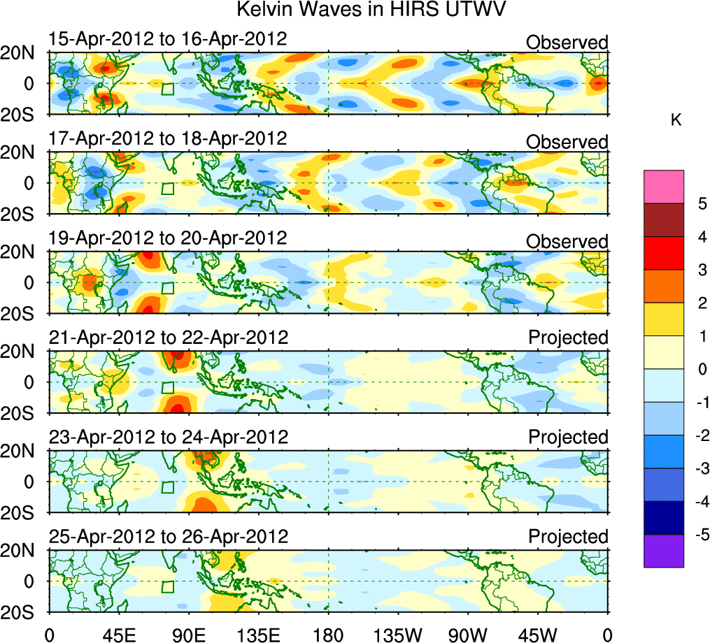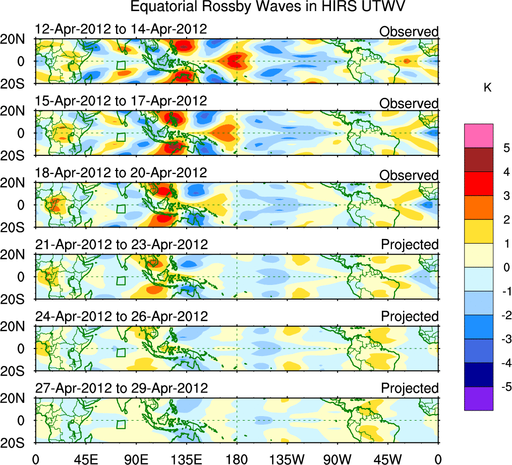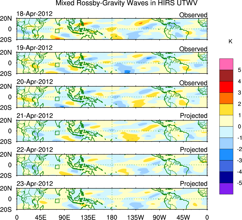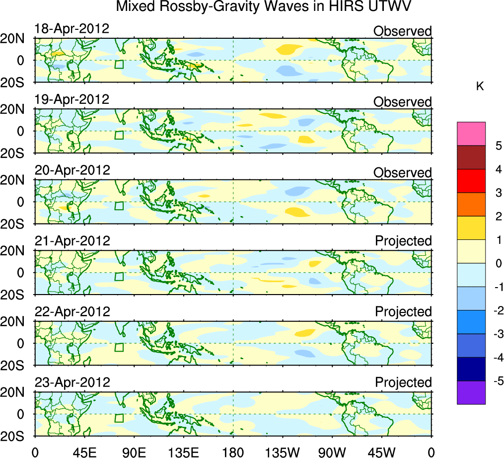 To identify tropical waves in near real-time, the OLR and UTWV data are filtered following Wheeler & Weickmann (2001 MWR). The daily anomalies are calculated using the first 3 harmonics of the seasonal cycle for 1979–2009. Missing values are then filled using linear interpolation in space and time. The most recent 365 days of anomalies are padded with 659 days of zeroes, and the result is filtered for each wave type.
