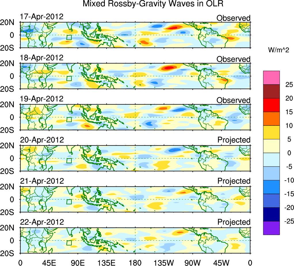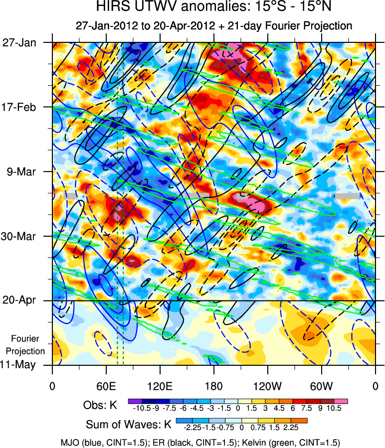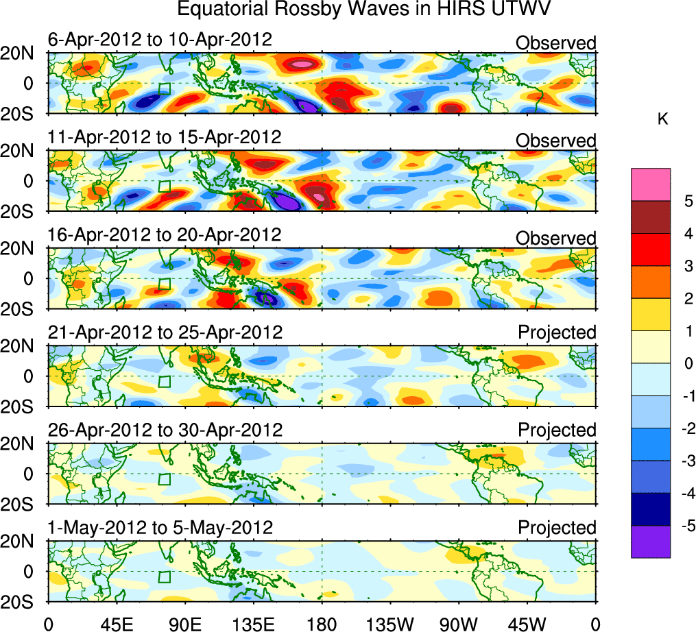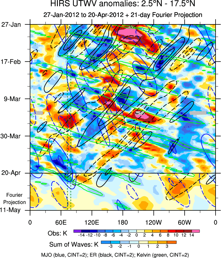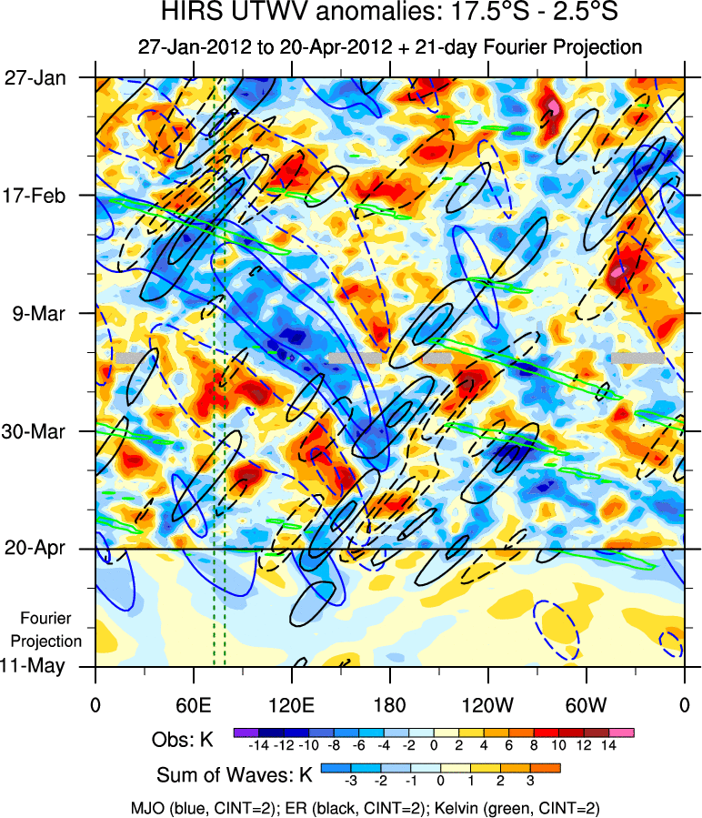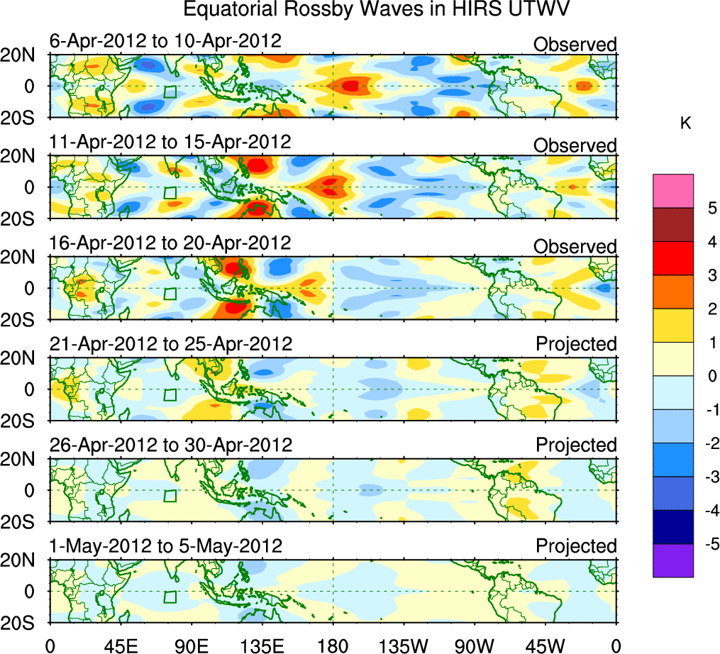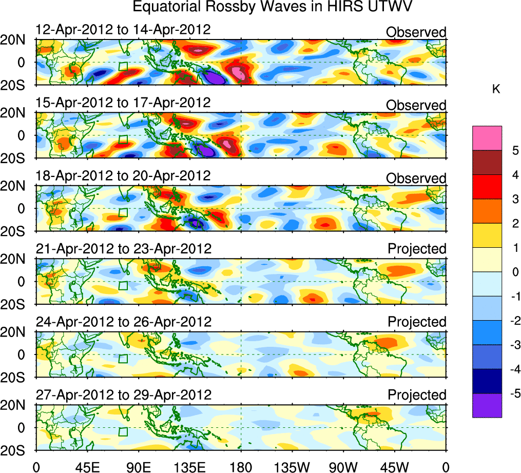 To identify tropical waves in near real-time, the OLR and UTWV data are filtered following Wheeler & Weickmann (2001 MWR). The daily anomalies are calculated using the first 3 harmonics of the seasonal cycle for 1979–2009. Missing values are then filled using linear interpolation in space and time. The most recent 365 days of anomalies are padded with 659 days of zeroes, and the result is filtered for each wave type.
