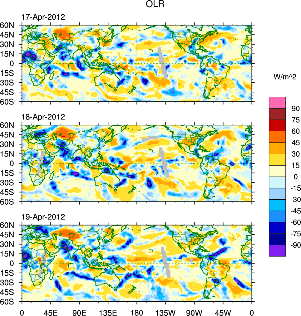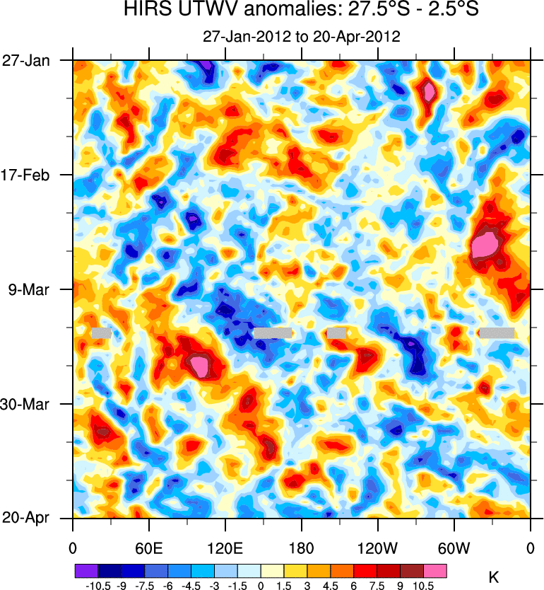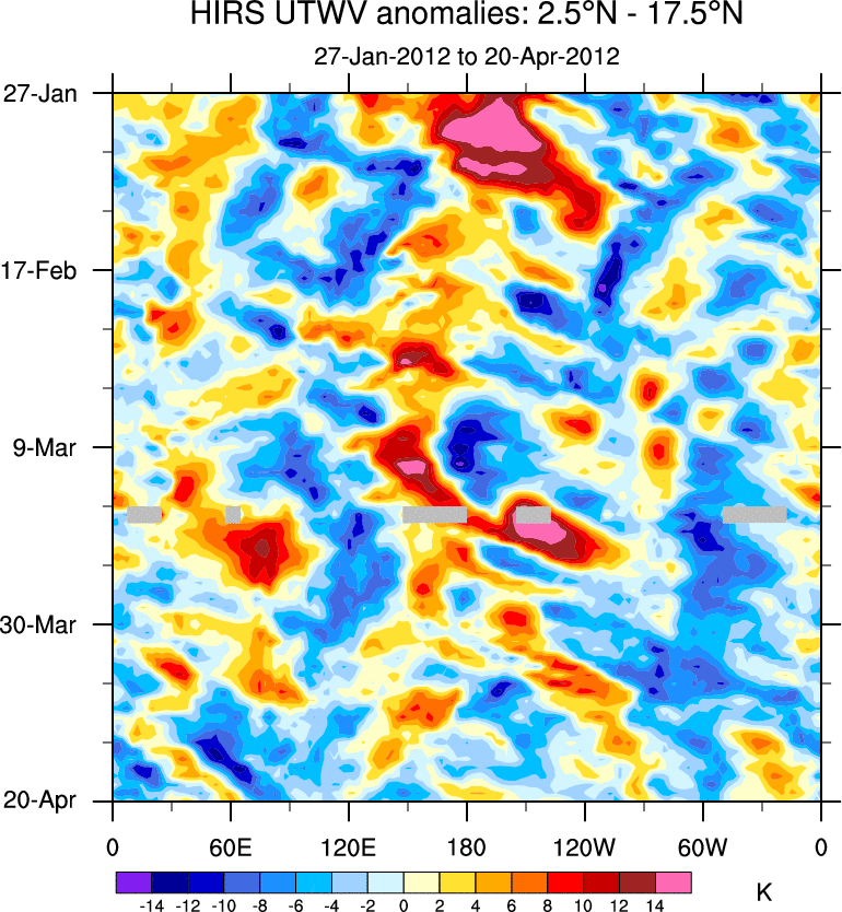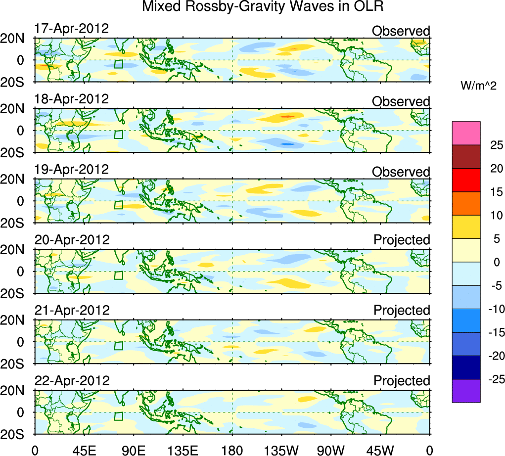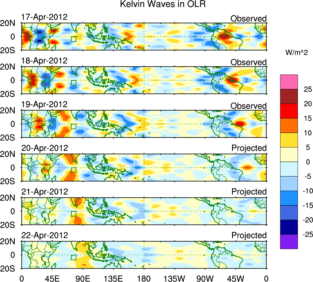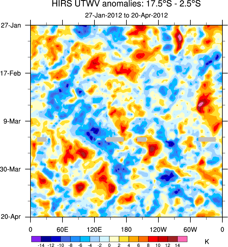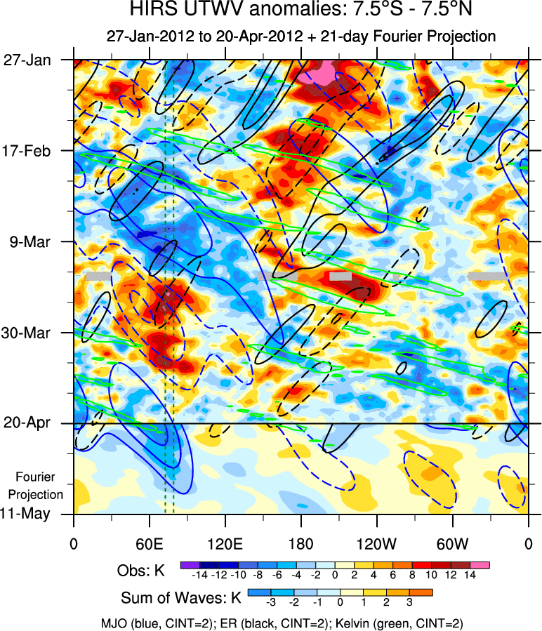 To identify tropical waves in near real-time, the OLR and UTWV data are filtered following Wheeler & Weickmann (2001 MWR). The daily anomalies are calculated using the first 3 harmonics of the seasonal cycle for 1979–2009. Missing values are then filled using linear interpolation in space and time. The most recent 365 days of anomalies are padded with 659 days of zeroes, and the result is filtered for each wave type.