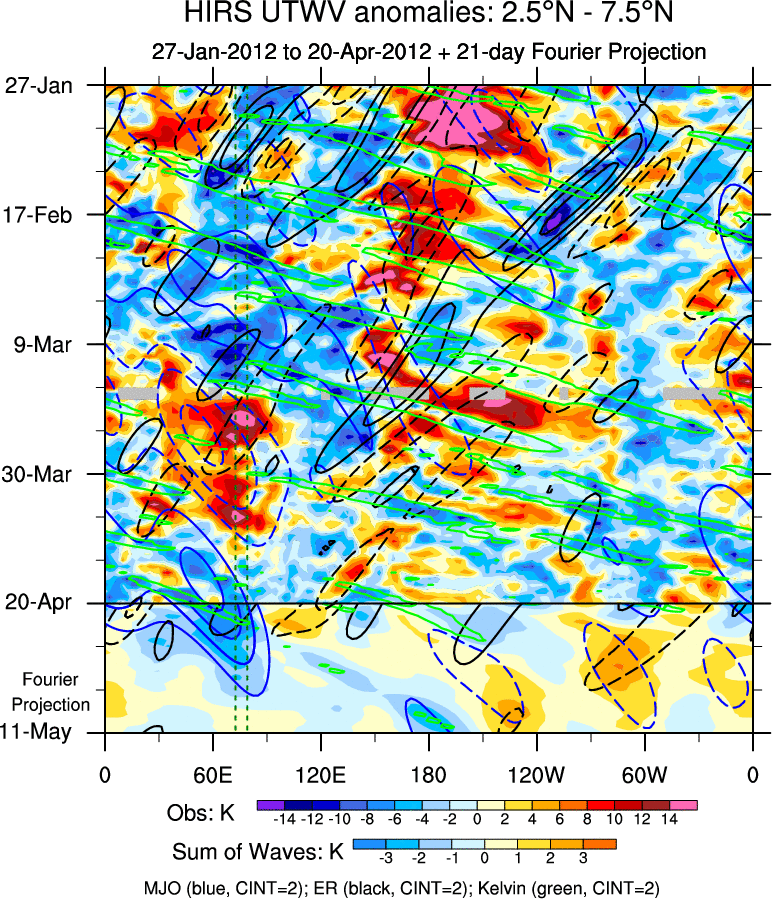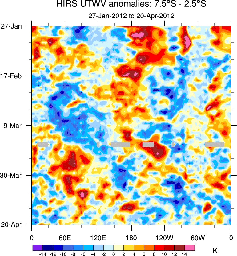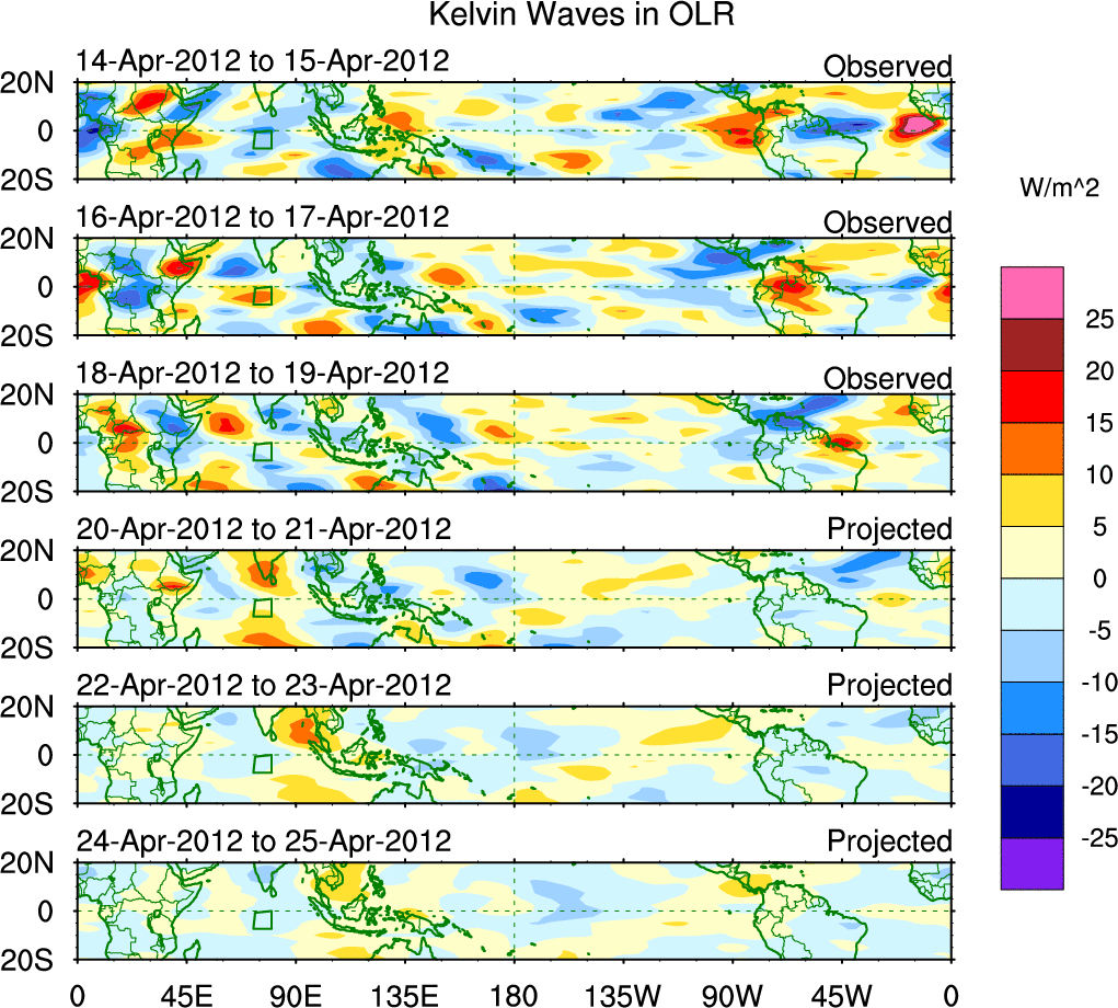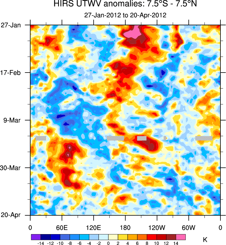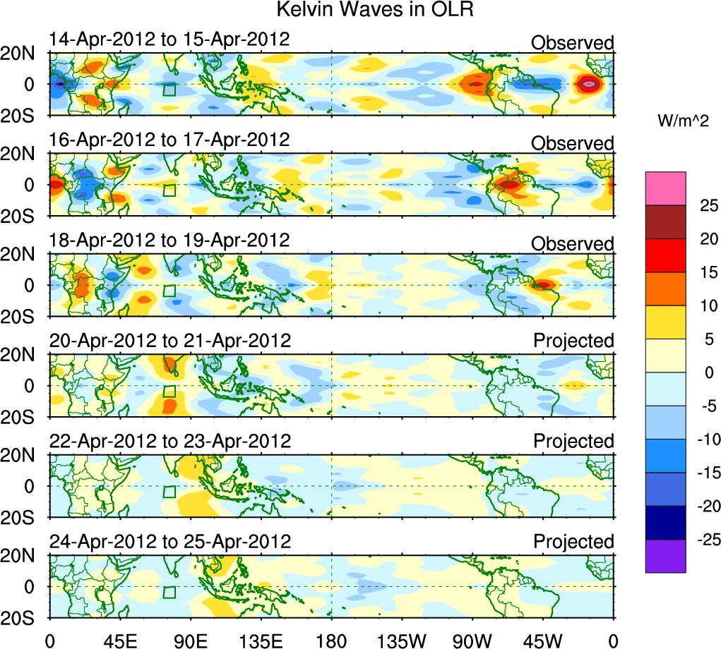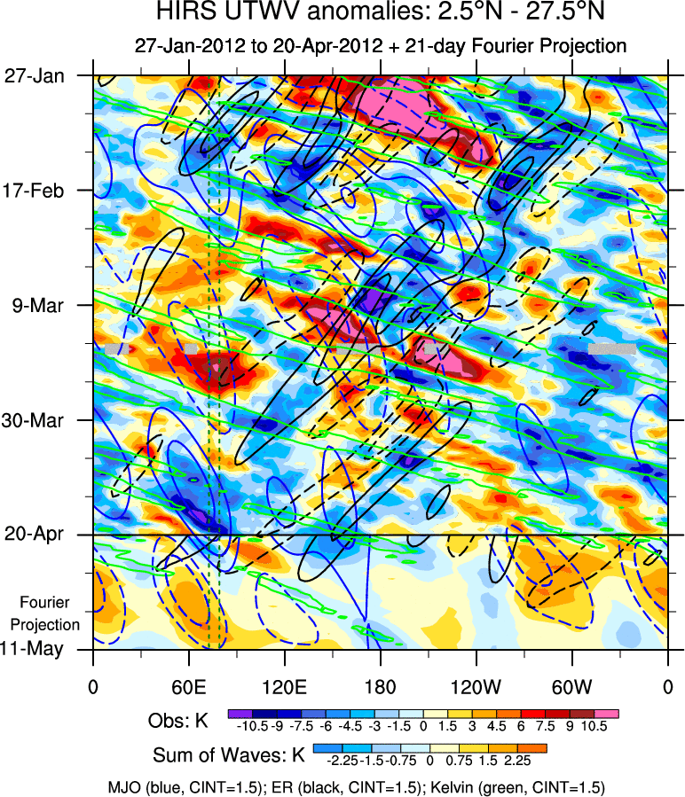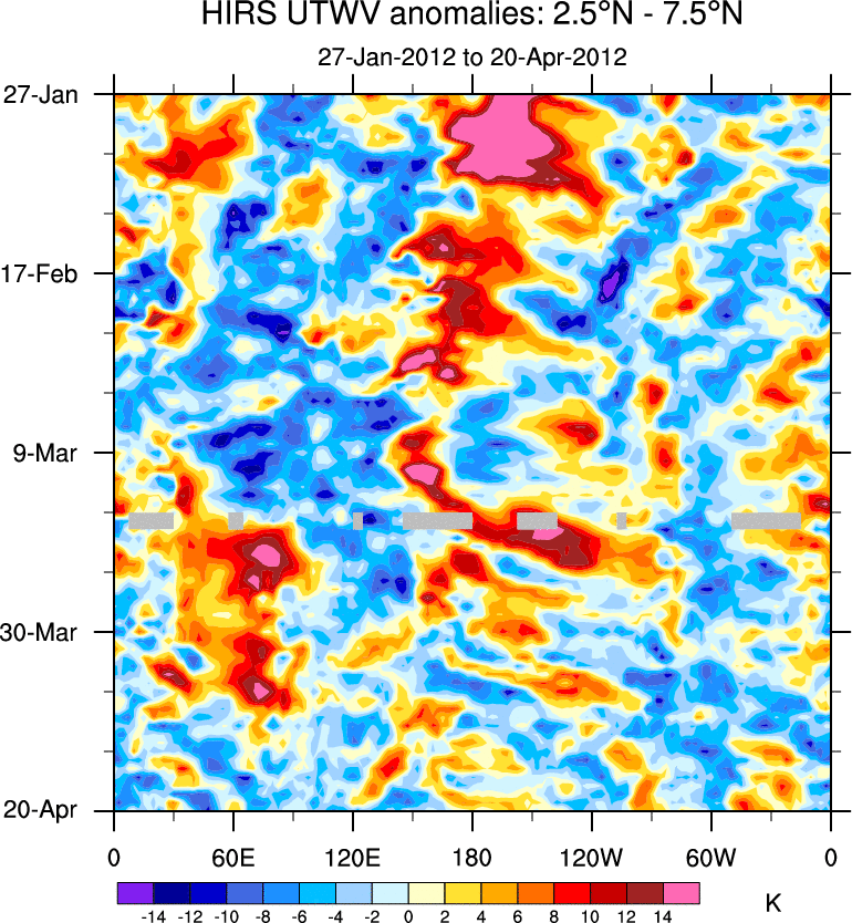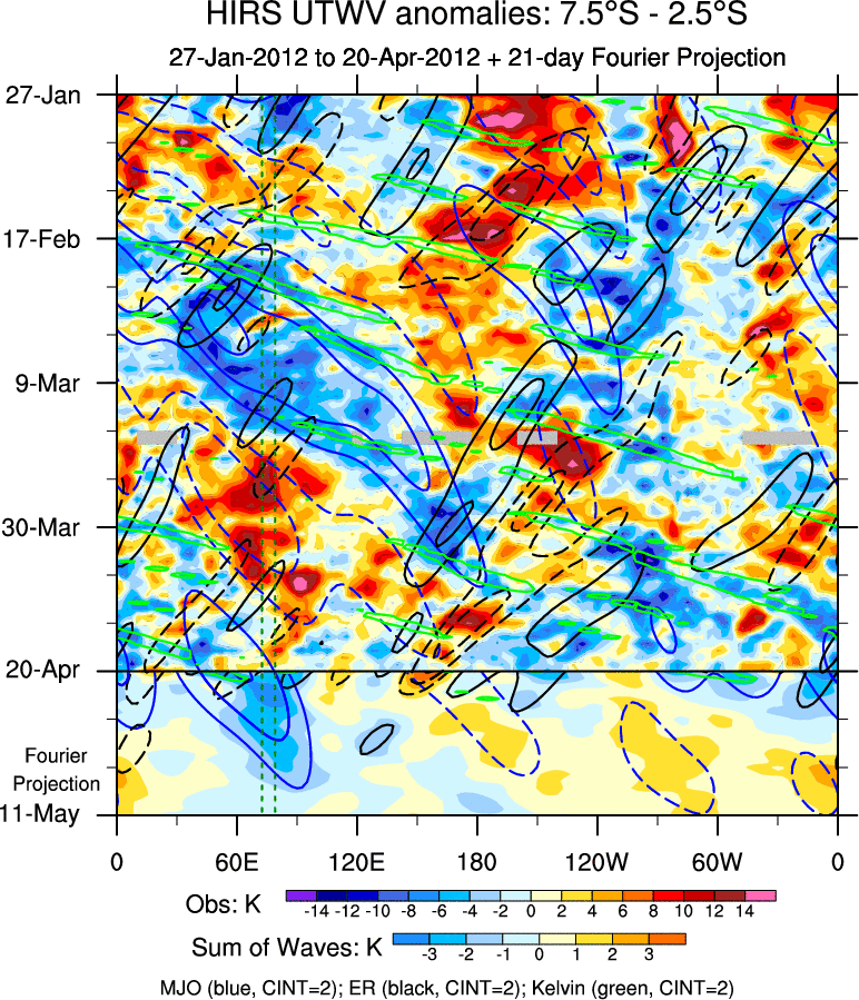 To identify tropical waves in near real-time, the OLR and UTWV data are filtered following Wheeler & Weickmann (2001 MWR). The daily anomalies are calculated using the first 3 harmonics of the seasonal cycle for 1979–2009. Missing values are then filled using linear interpolation in space and time. The most recent 365 days of anomalies are padded with 659 days of zeroes, and the result is filtered for each wave type.