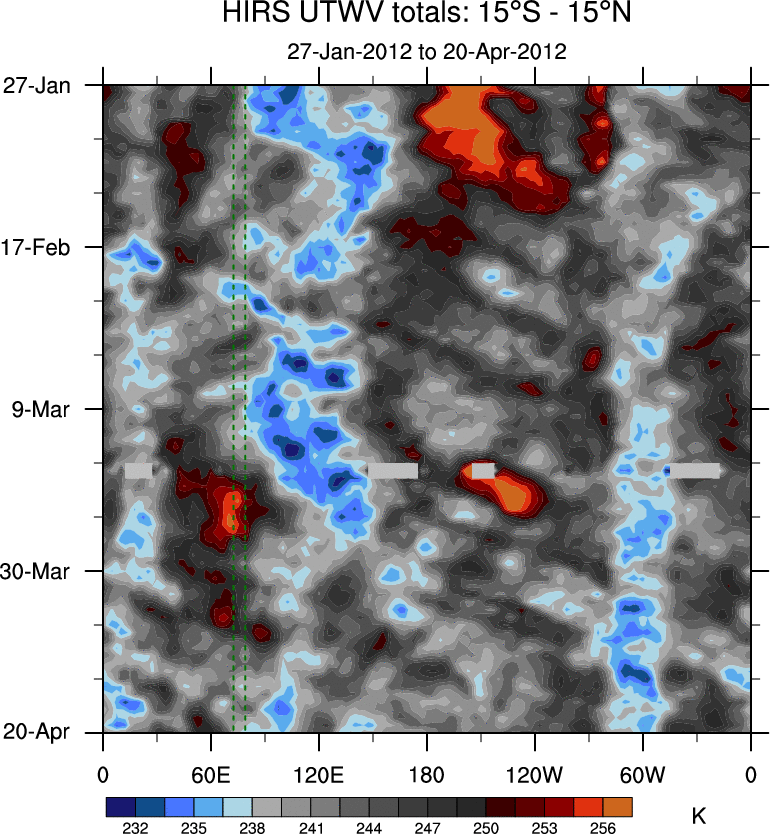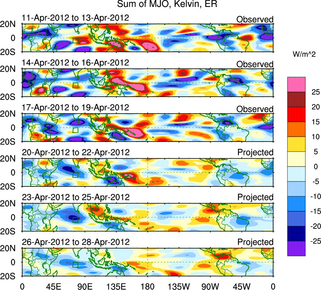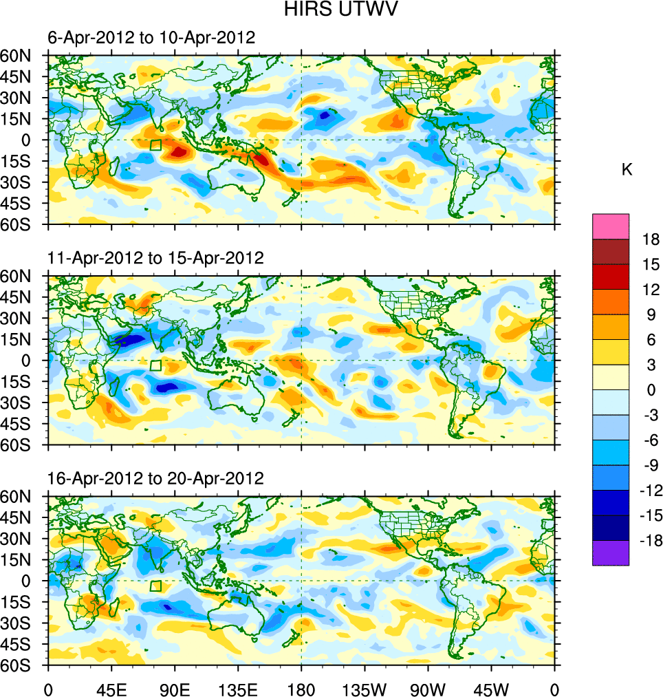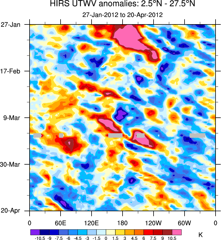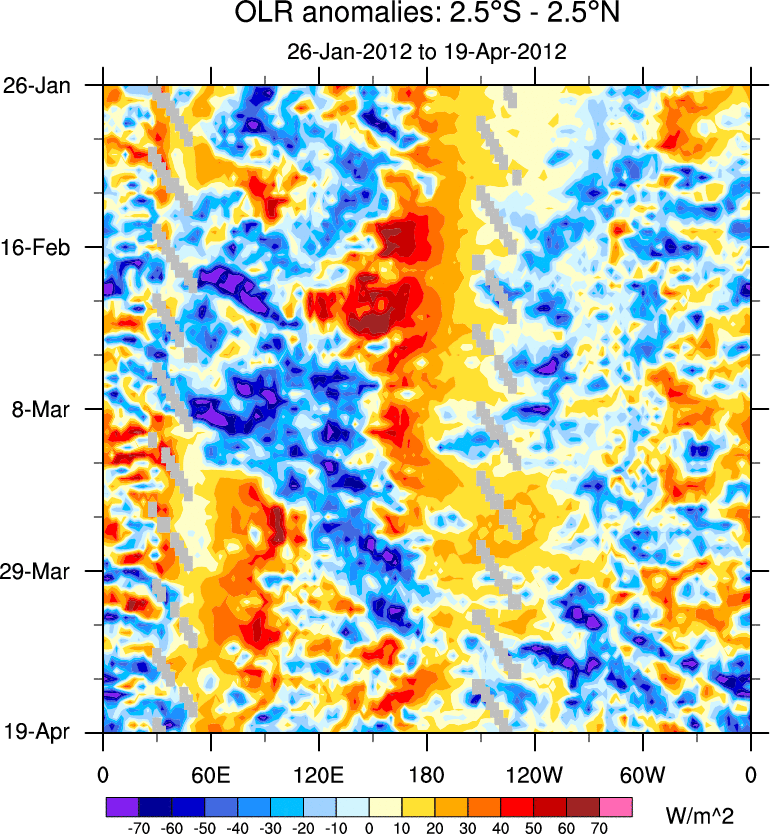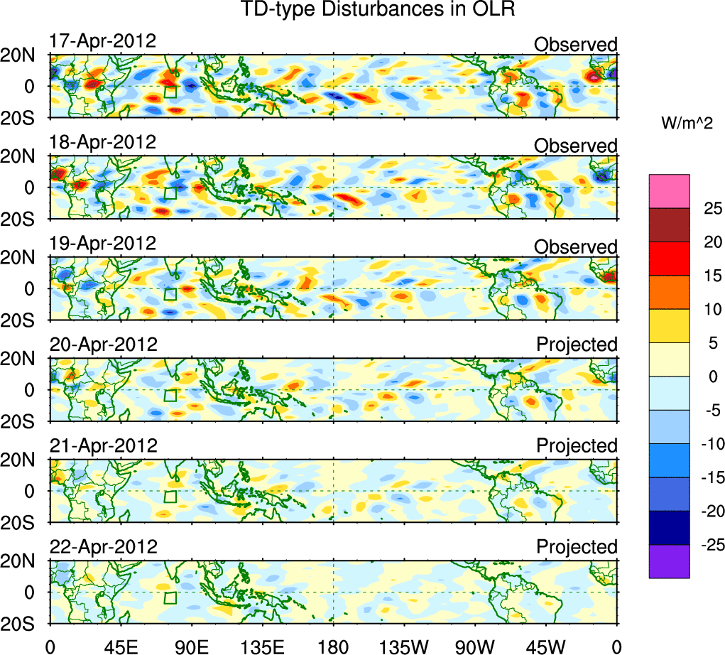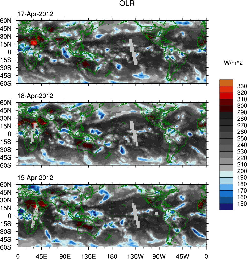 To identify tropical waves in near real-time, the OLR and UTWV data are filtered following Wheeler & Weickmann (2001 MWR). The daily anomalies are calculated using the first 3 harmonics of the seasonal cycle for 1979–2009. Missing values are then filled using linear interpolation in space and time. The most recent 365 days of anomalies are padded with 659 days of zeroes, and the result is filtered for each wave type.