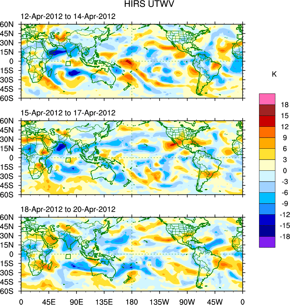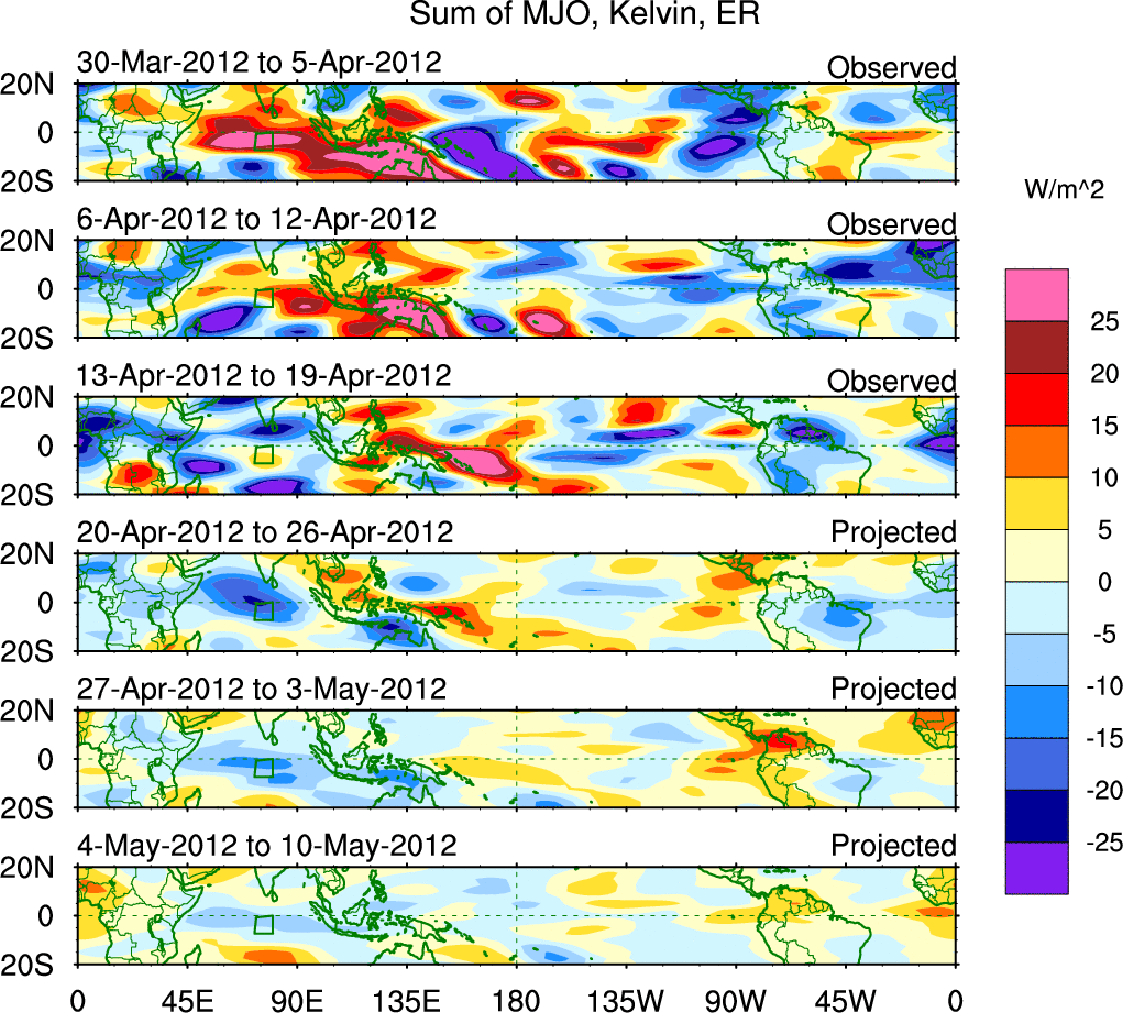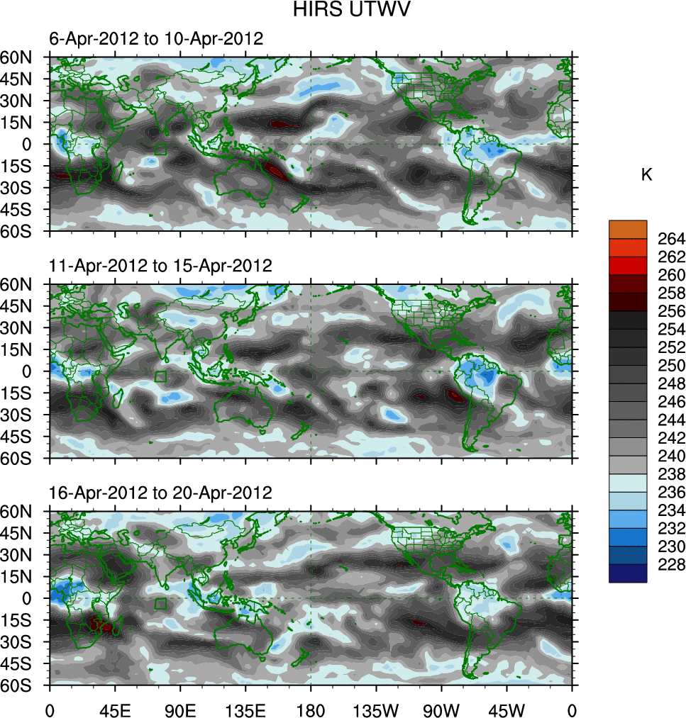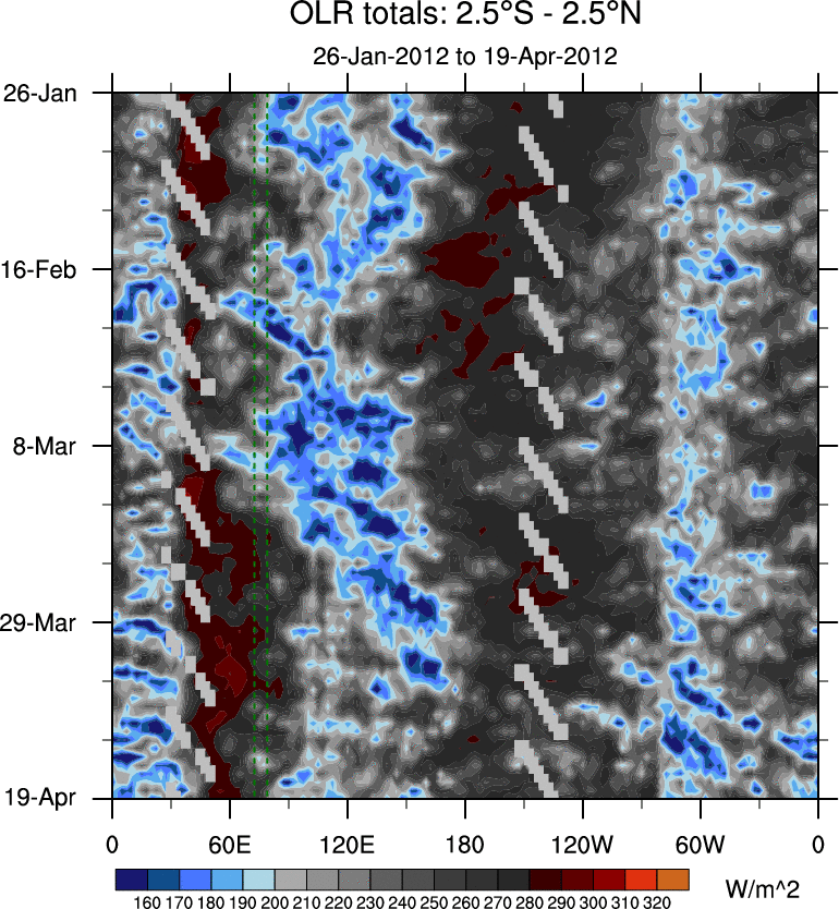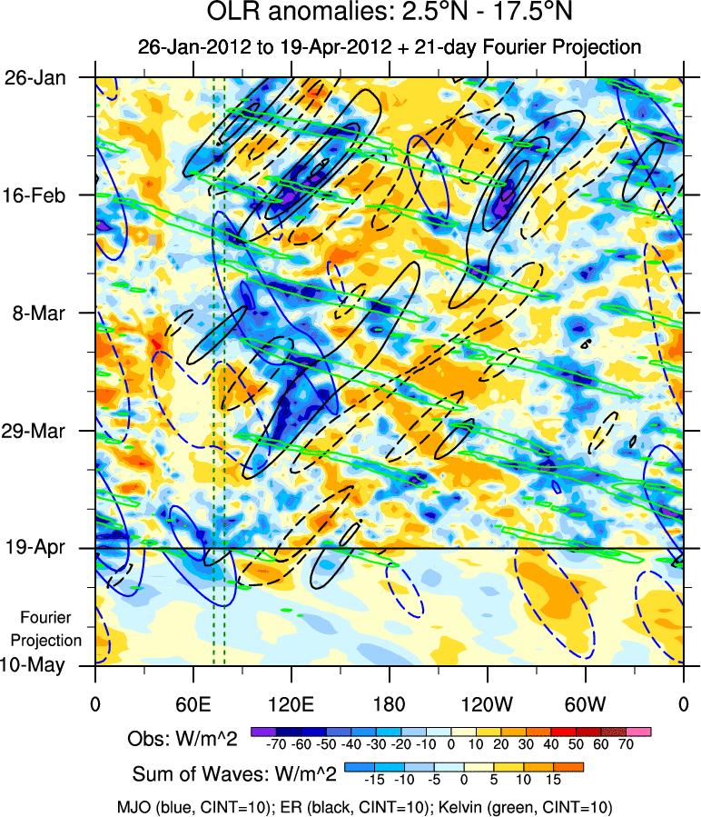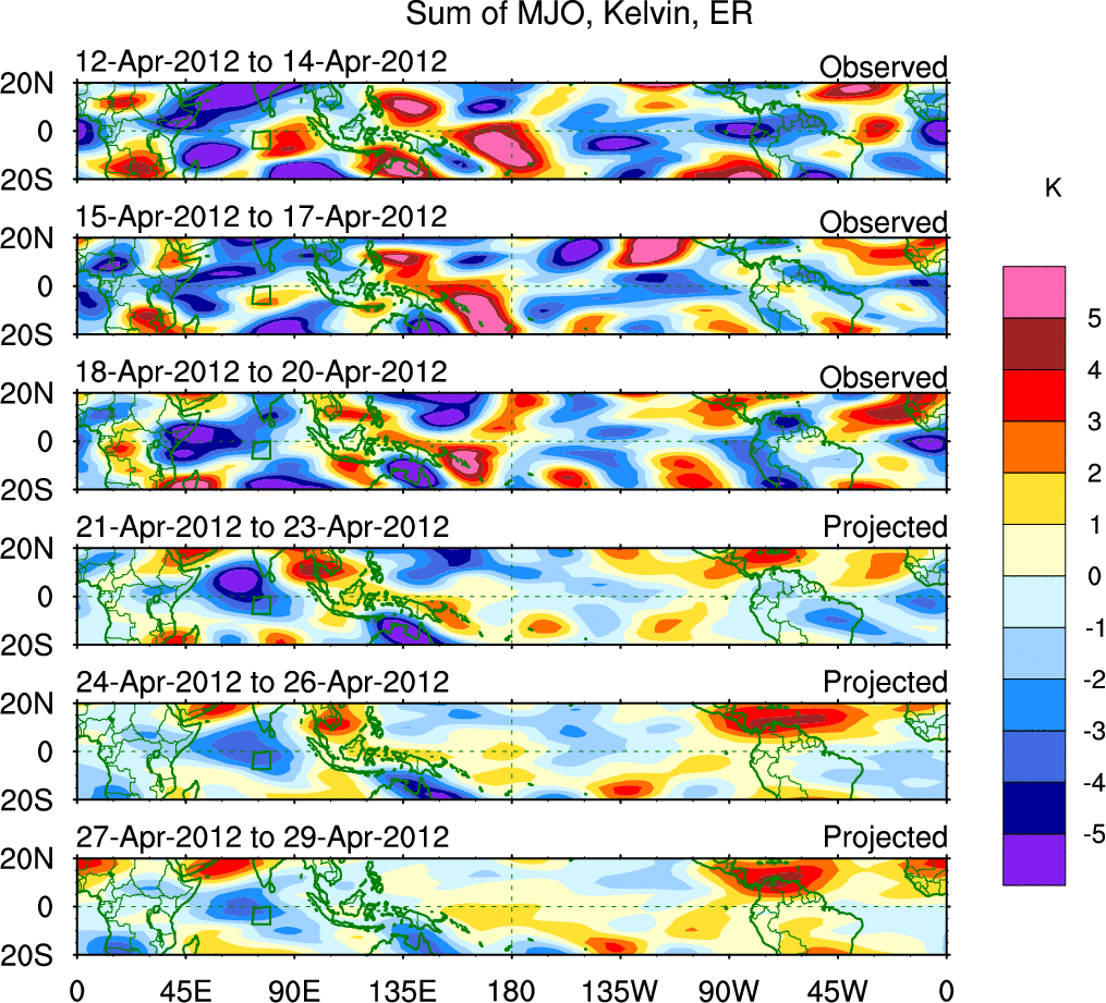 To identify tropical waves in near real-time, the OLR and UTWV data are filtered following Wheeler & Weickmann (2001 MWR). The daily anomalies are calculated using the first 3 harmonics of the seasonal cycle for 1979–2009. Missing values are then filled using linear interpolation in space and time. The most recent 365 days of anomalies are padded with 659 days of zeroes, and the result is filtered for each wave type.