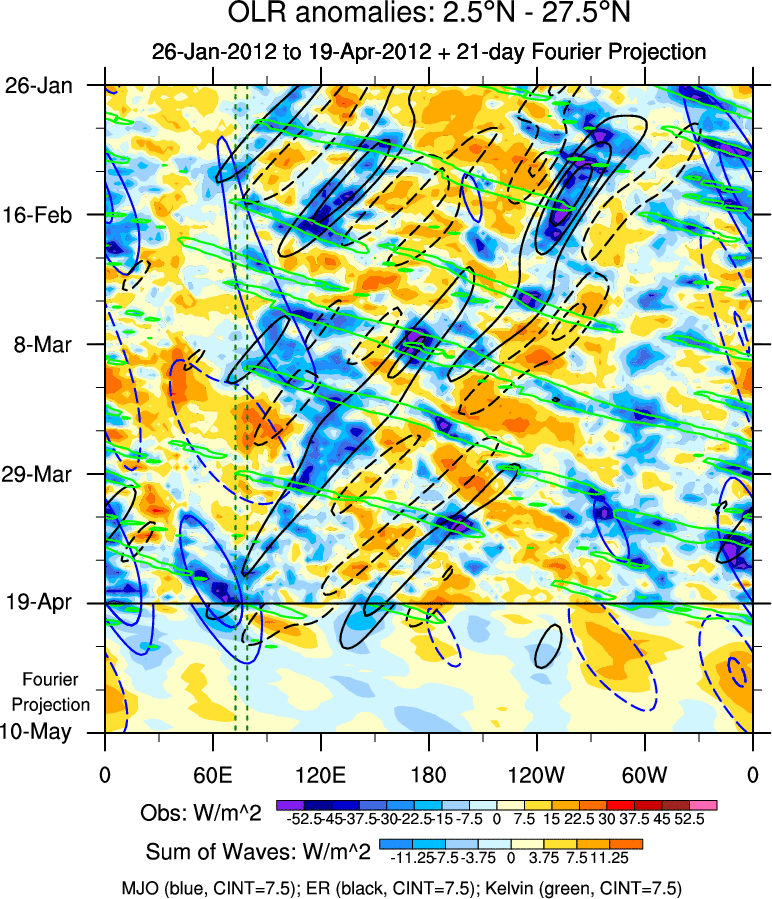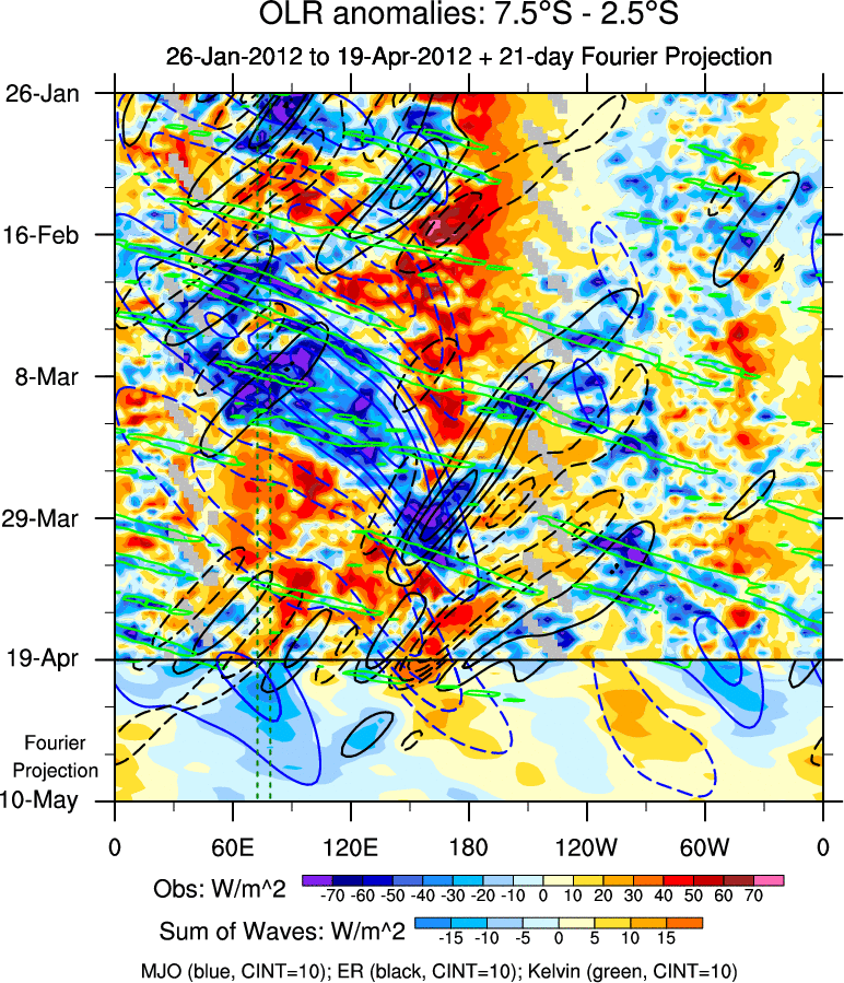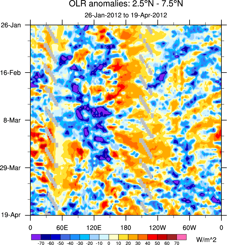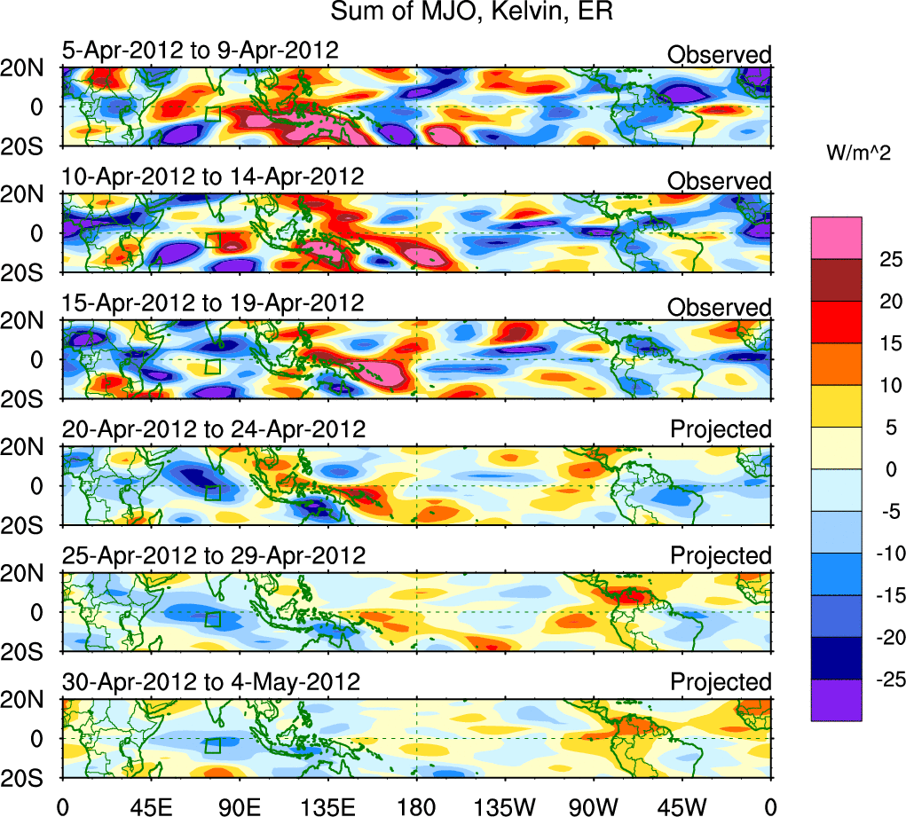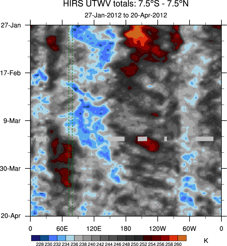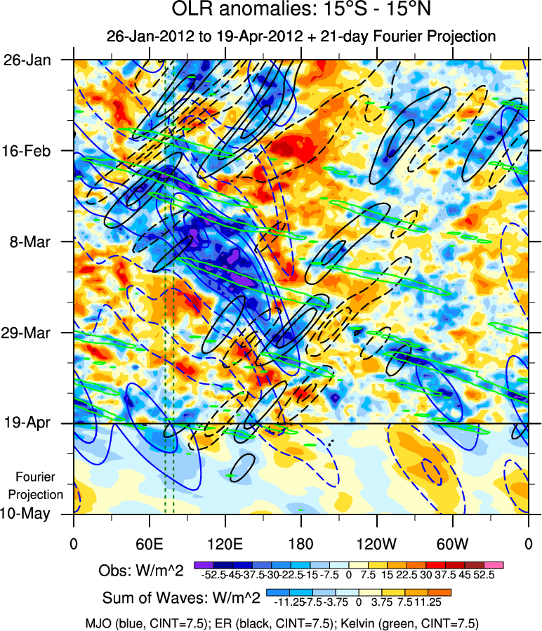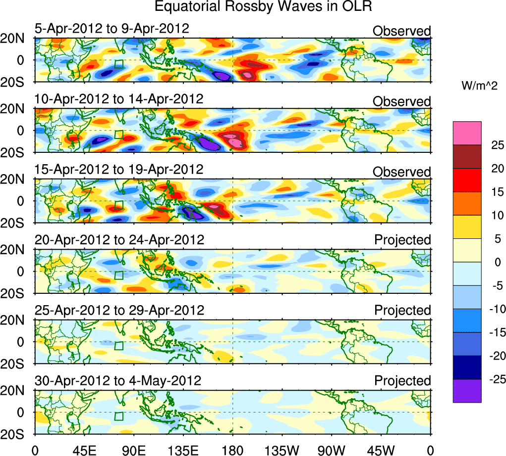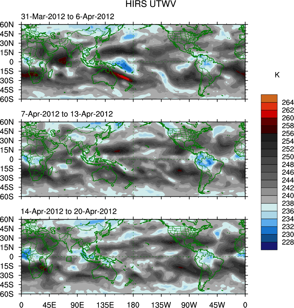 To identify tropical waves in near real-time, the OLR and UTWV data are filtered following Wheeler & Weickmann (2001 MWR). The daily anomalies are calculated using the first 3 harmonics of the seasonal cycle for 1979–2009. Missing values are then filled using linear interpolation in space and time. The most recent 365 days of anomalies are padded with 659 days of zeroes, and the result is filtered for each wave type.