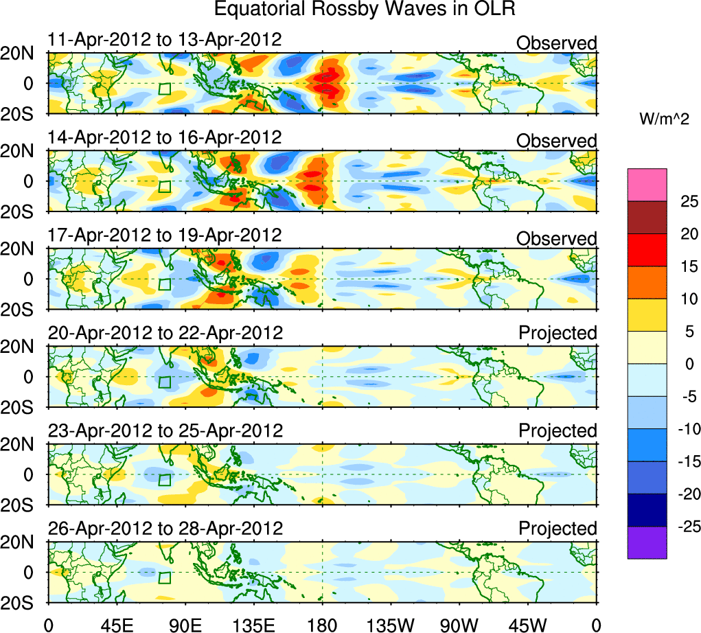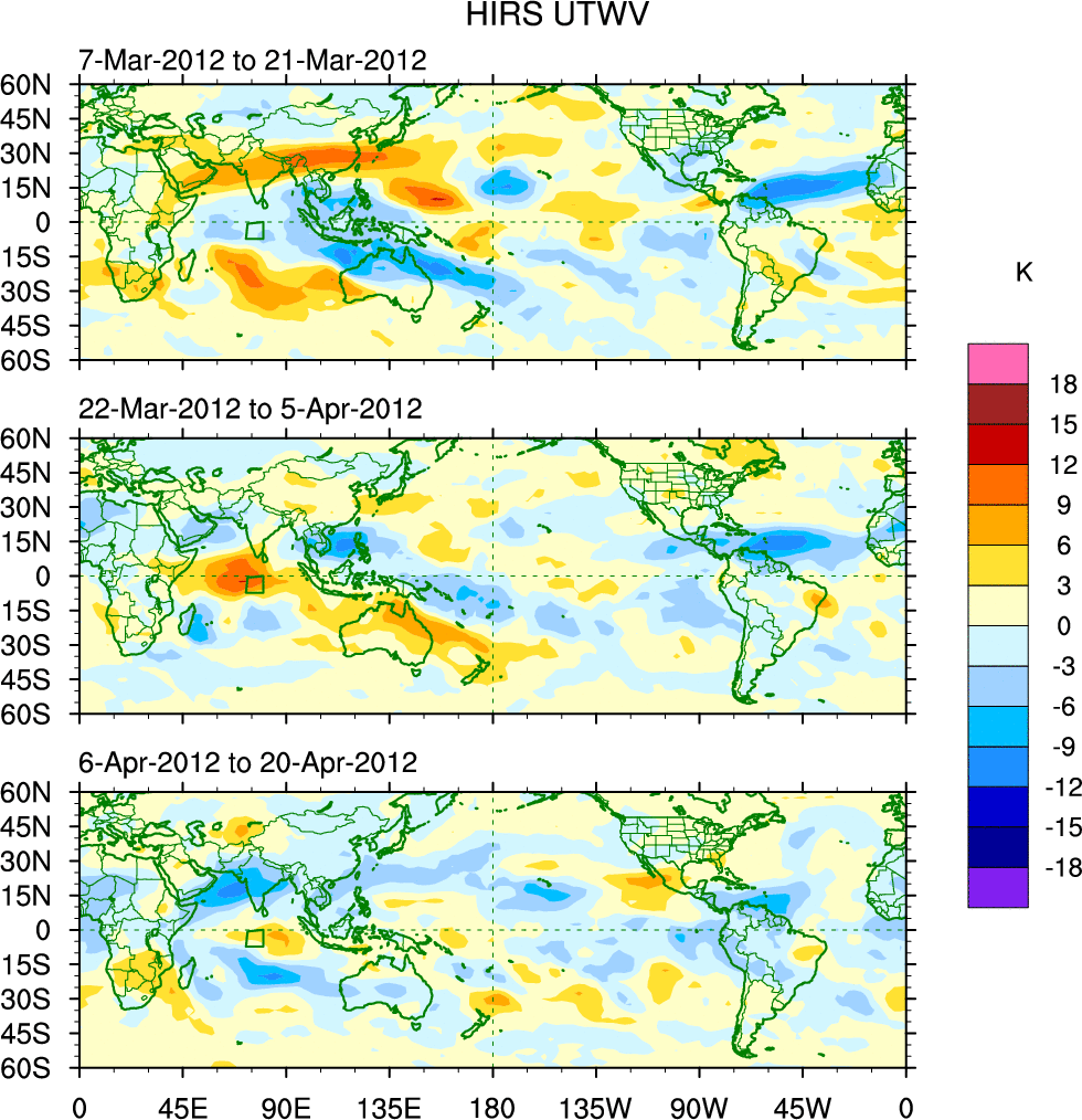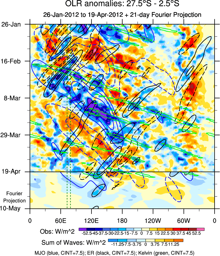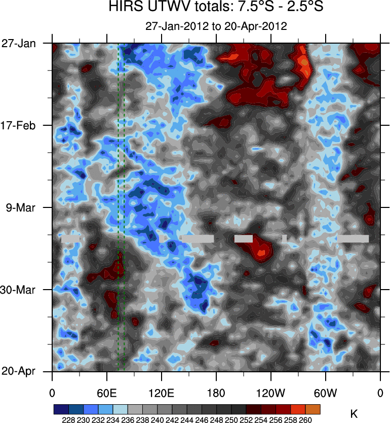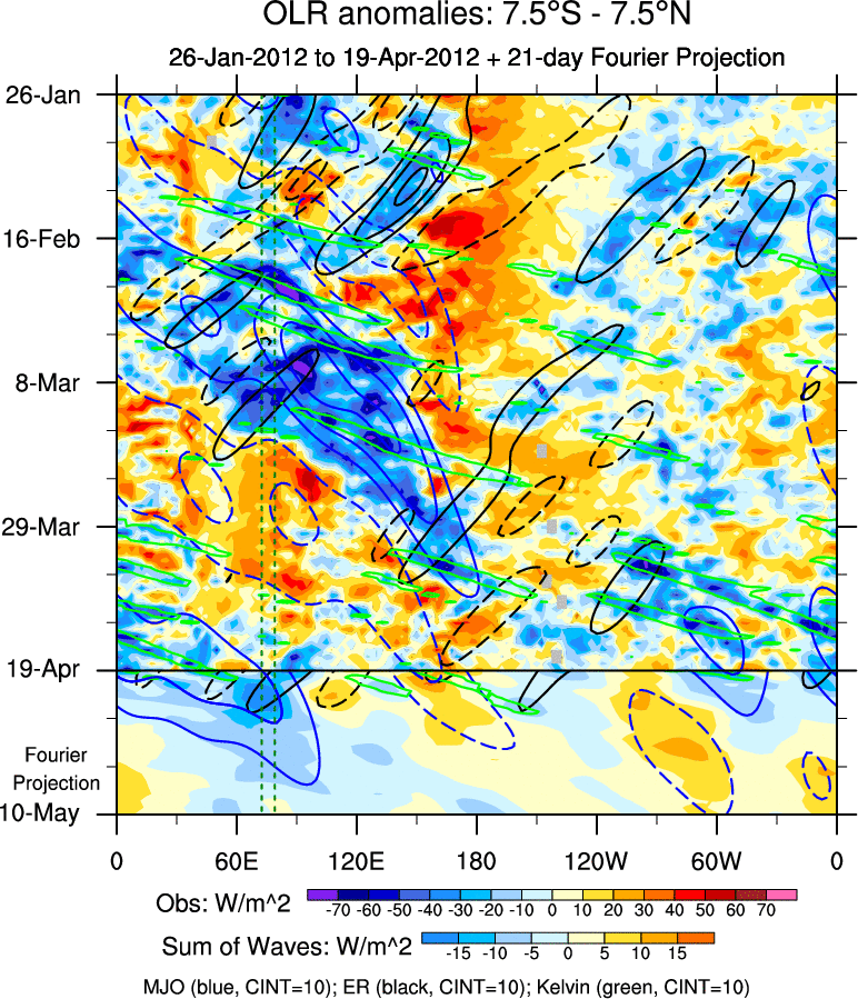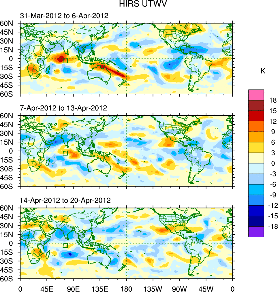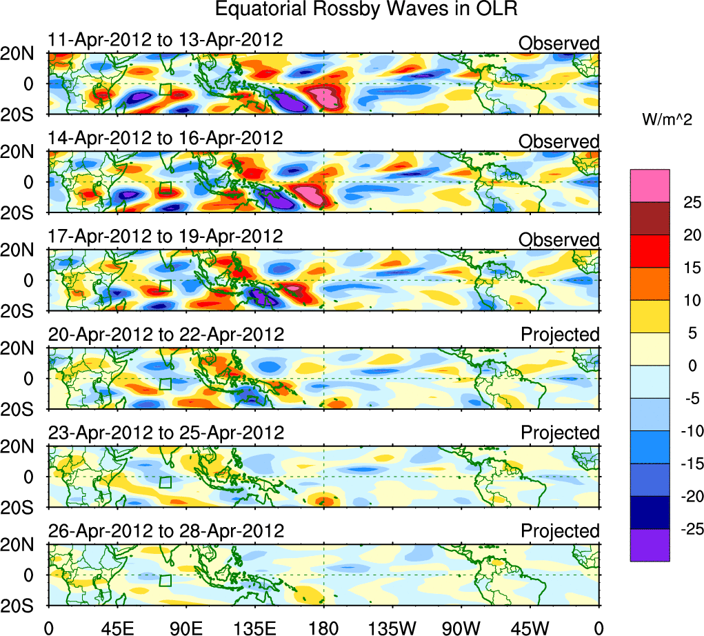 To identify tropical waves in near real-time, the OLR and UTWV data are filtered following Wheeler & Weickmann (2001 MWR). The daily anomalies are calculated using the first 3 harmonics of the seasonal cycle for 1979–2009. Missing values are then filled using linear interpolation in space and time. The most recent 365 days of anomalies are padded with 659 days of zeroes, and the result is filtered for each wave type.