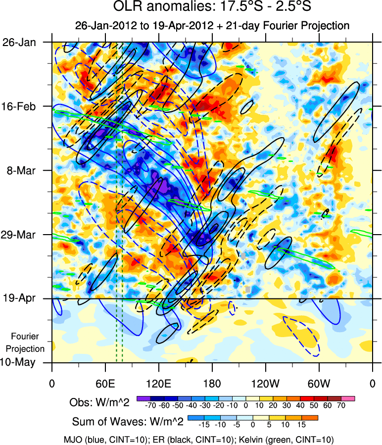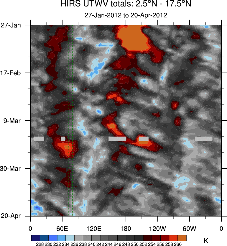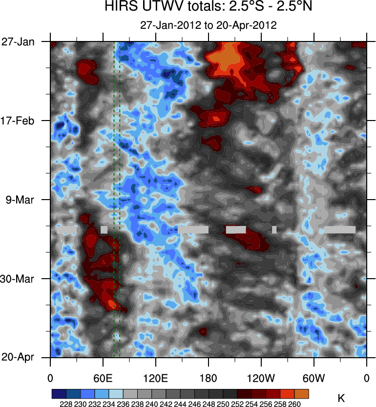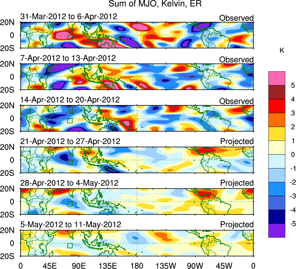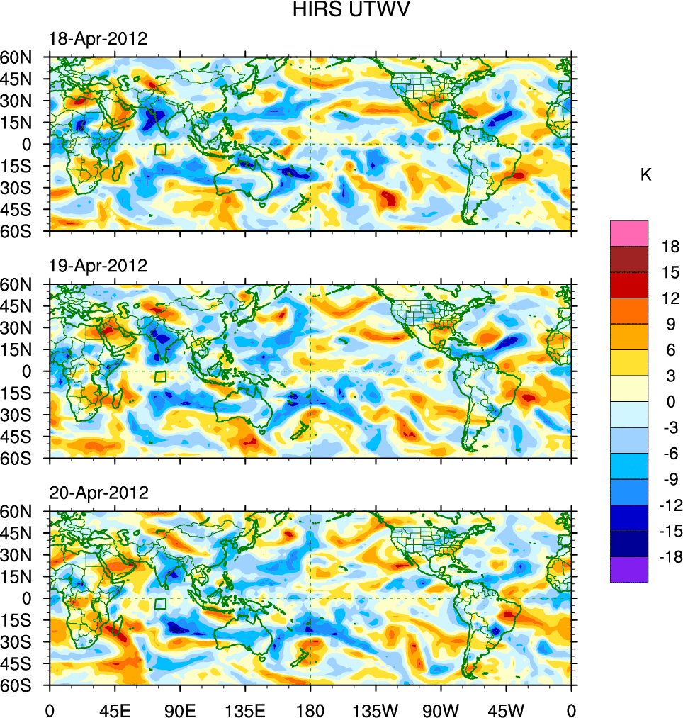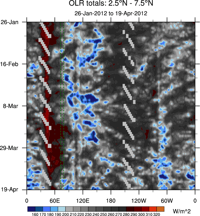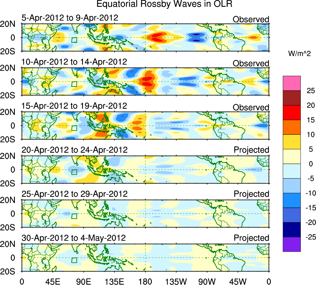 To identify tropical waves in near real-time, the OLR and UTWV data are filtered following Wheeler & Weickmann (2001 MWR). The daily anomalies are calculated using the first 3 harmonics of the seasonal cycle for 1979–2009. Missing values are then filled using linear interpolation in space and time. The most recent 365 days of anomalies are padded with 659 days of zeroes, and the result is filtered for each wave type.