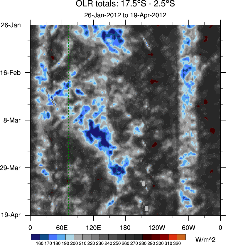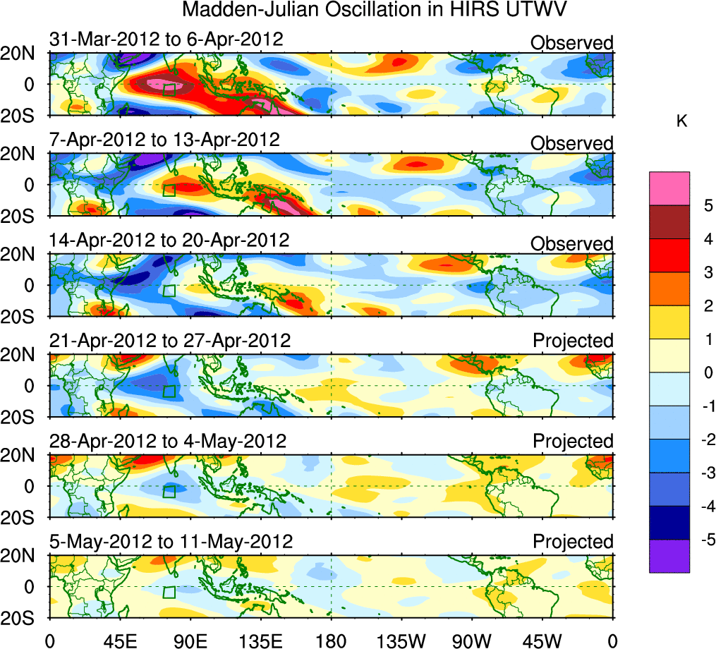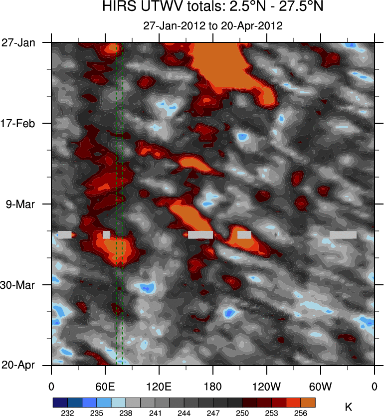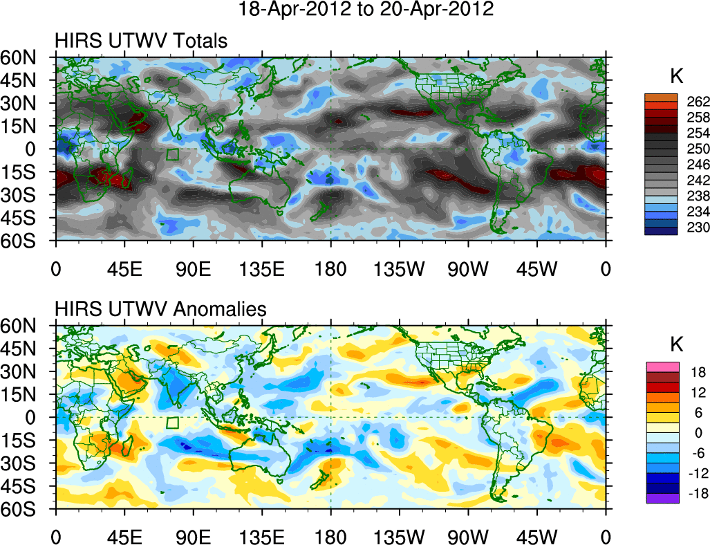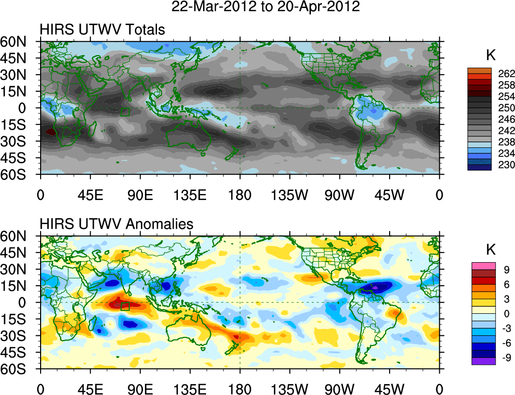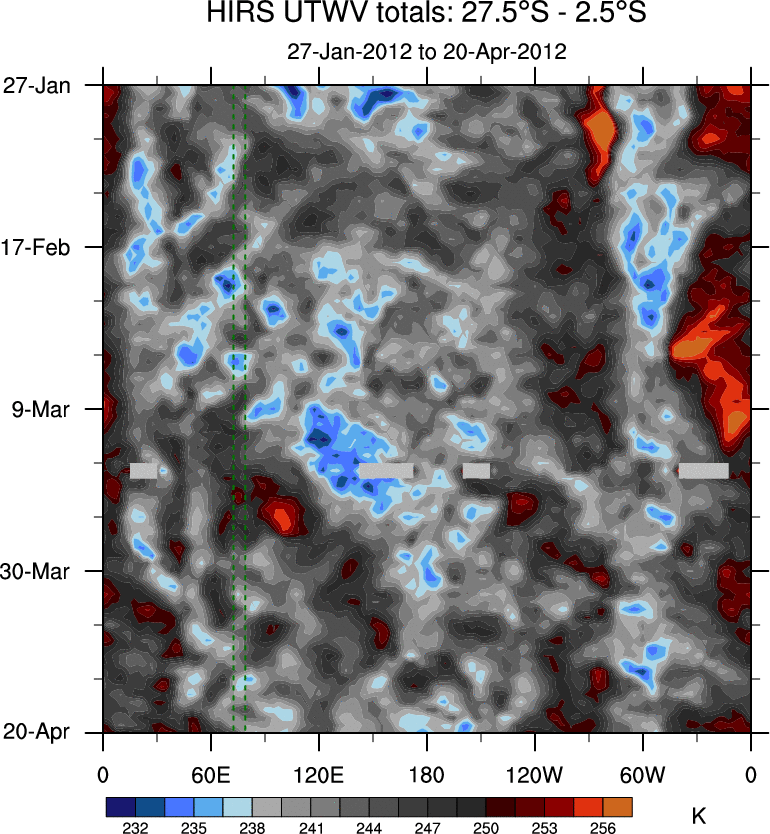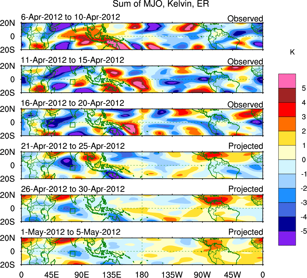 To identify tropical waves in near real-time, the OLR and UTWV data are filtered following Wheeler & Weickmann (2001 MWR). The daily anomalies are calculated using the first 3 harmonics of the seasonal cycle for 1979–2009. Missing values are then filled using linear interpolation in space and time. The most recent 365 days of anomalies are padded with 659 days of zeroes, and the result is filtered for each wave type.