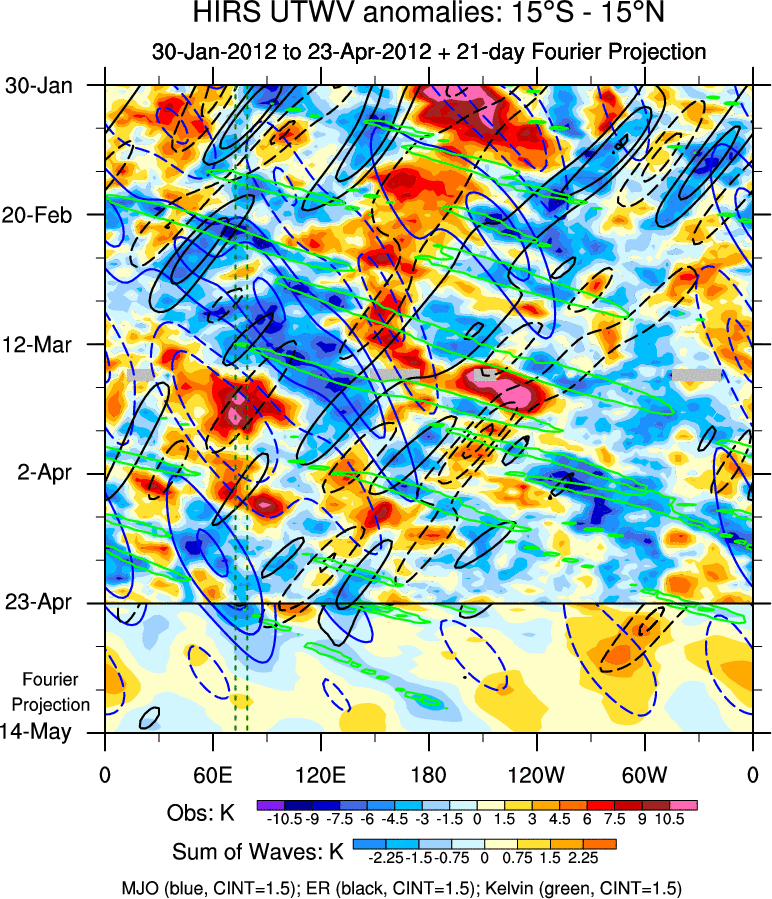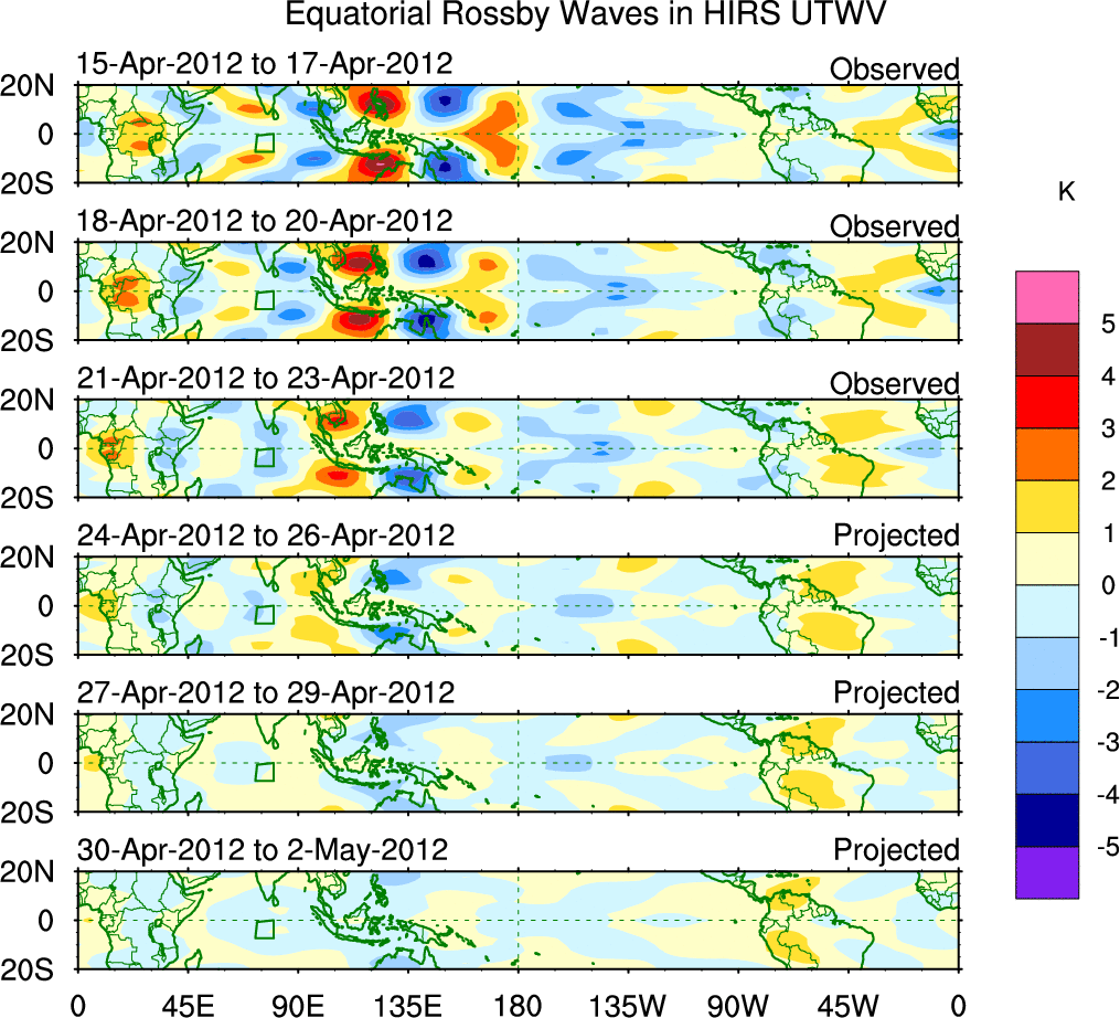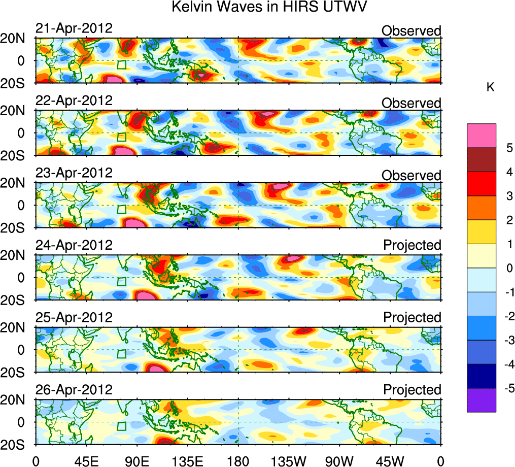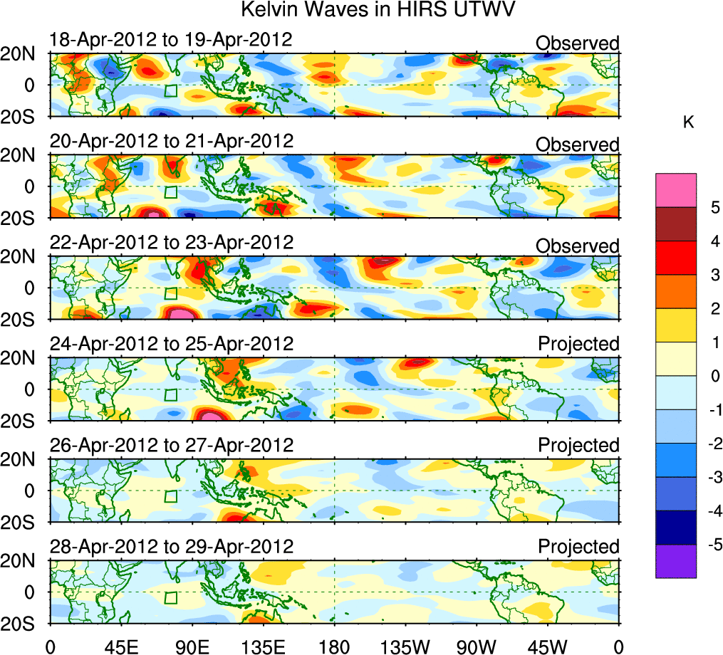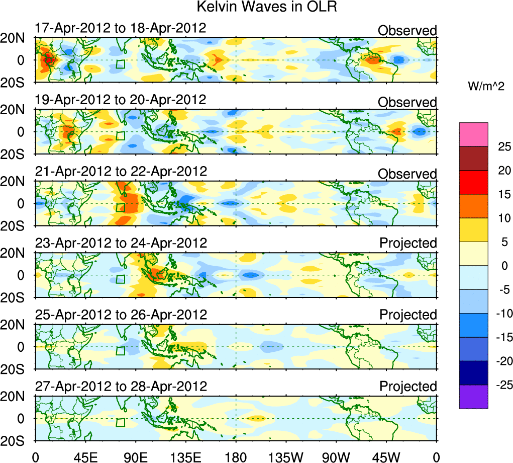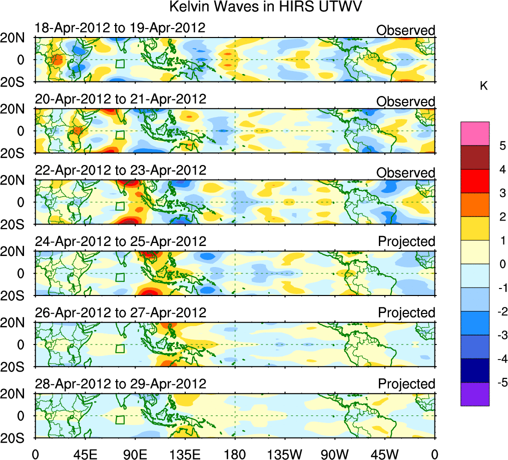 To identify tropical waves in near real-time, the OLR and UTWV data are filtered following Wheeler & Weickmann (2001 MWR). The daily anomalies are calculated using the first 3 harmonics of the seasonal cycle for 1979–2009. Missing values are then filled using linear interpolation in space and time. The most recent 365 days of anomalies are padded with 659 days of zeroes, and the result is filtered for each wave type.