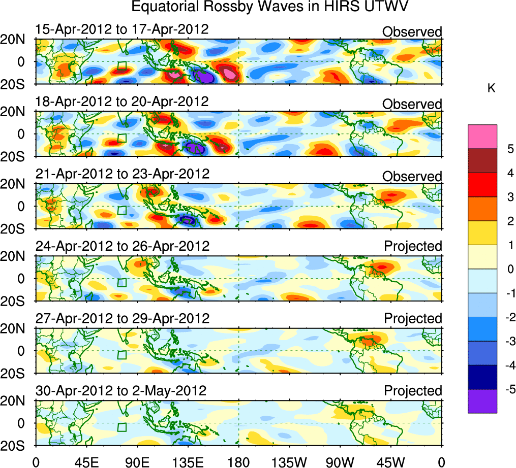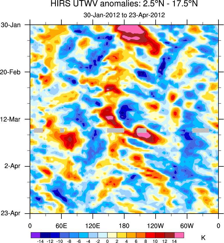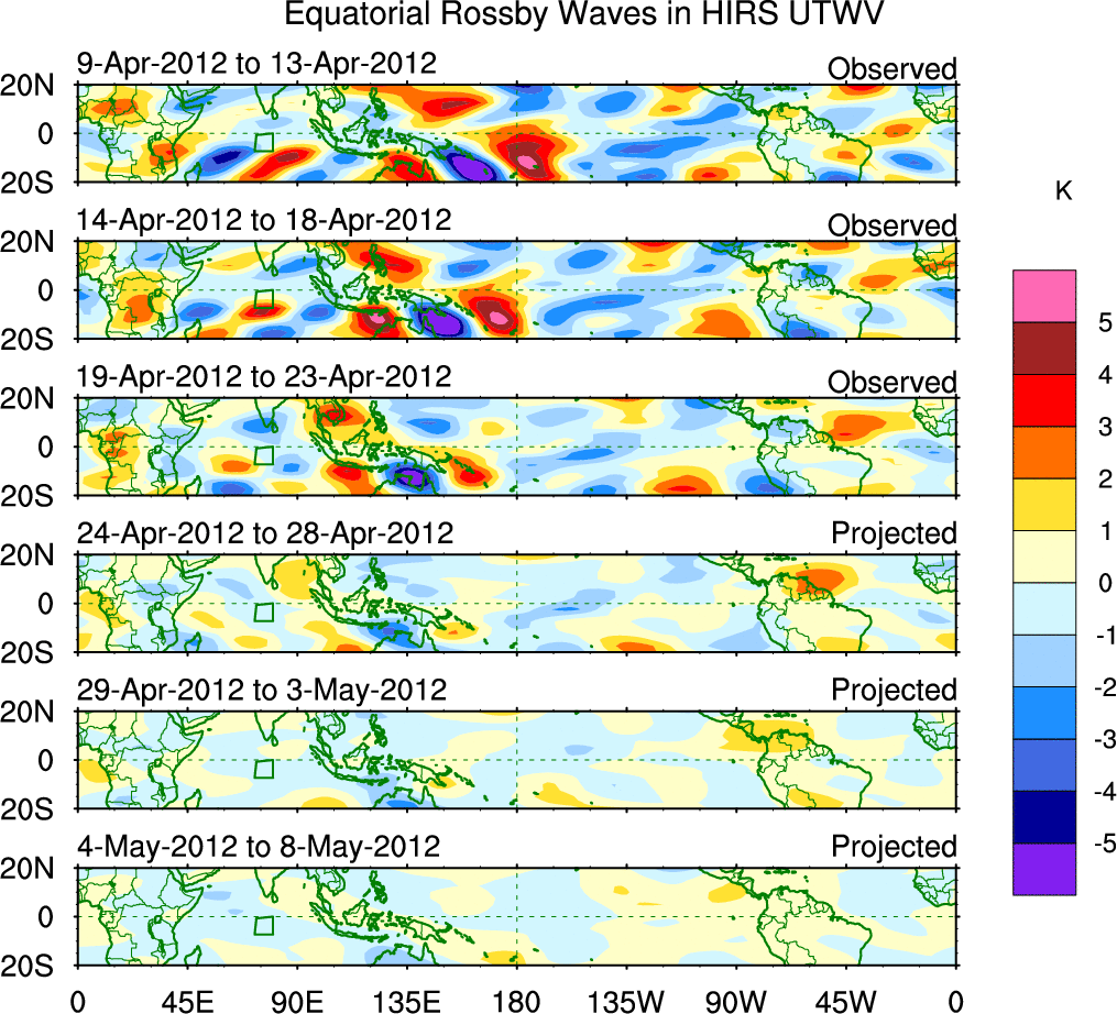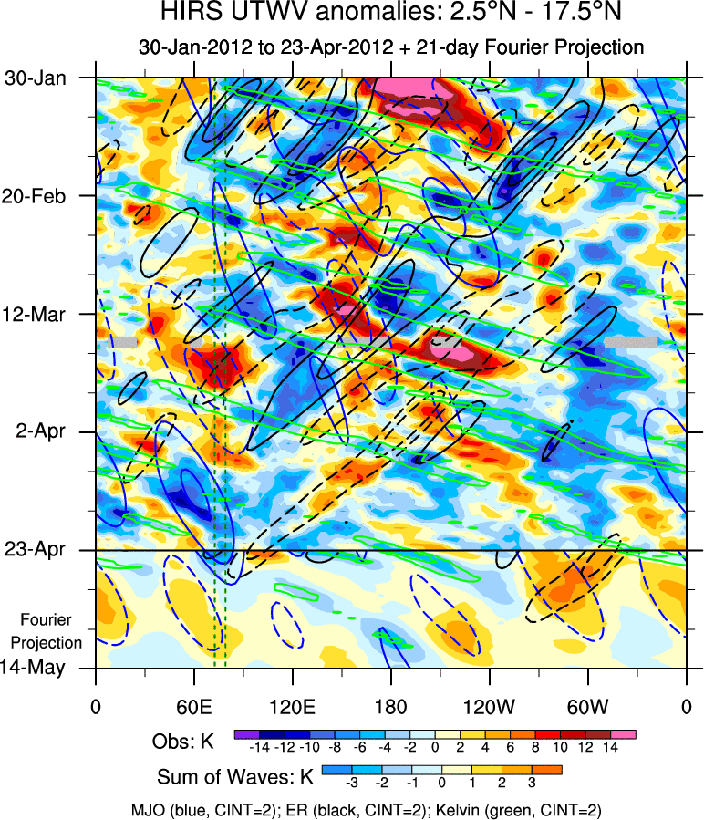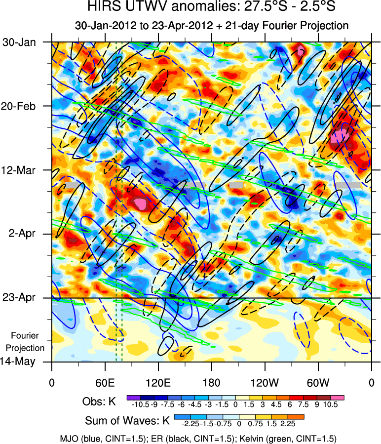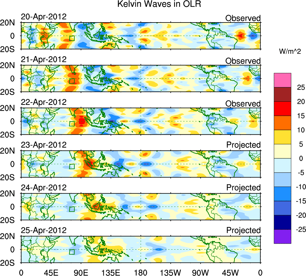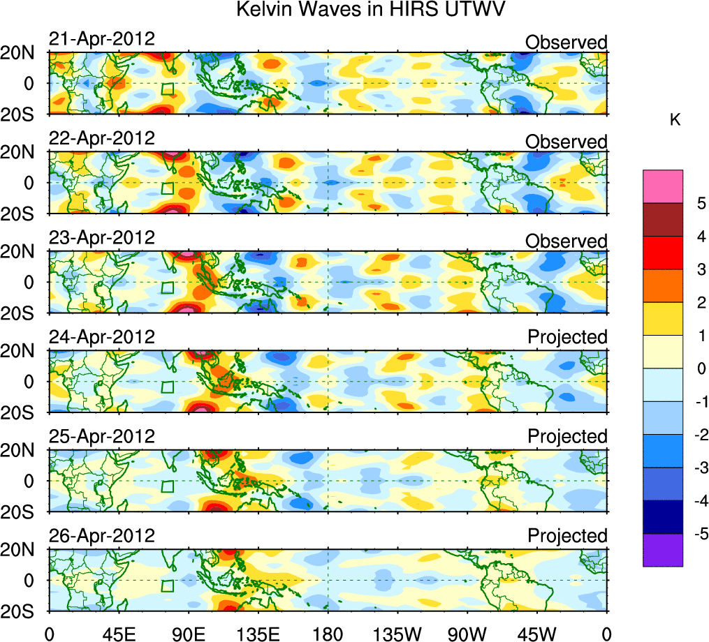 To identify tropical waves in near real-time, the OLR and UTWV data are filtered following Wheeler & Weickmann (2001 MWR). The daily anomalies are calculated using the first 3 harmonics of the seasonal cycle for 1979–2009. Missing values are then filled using linear interpolation in space and time. The most recent 365 days of anomalies are padded with 659 days of zeroes, and the result is filtered for each wave type.