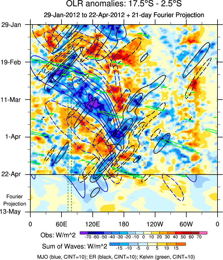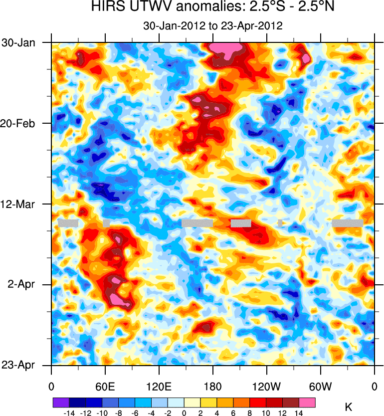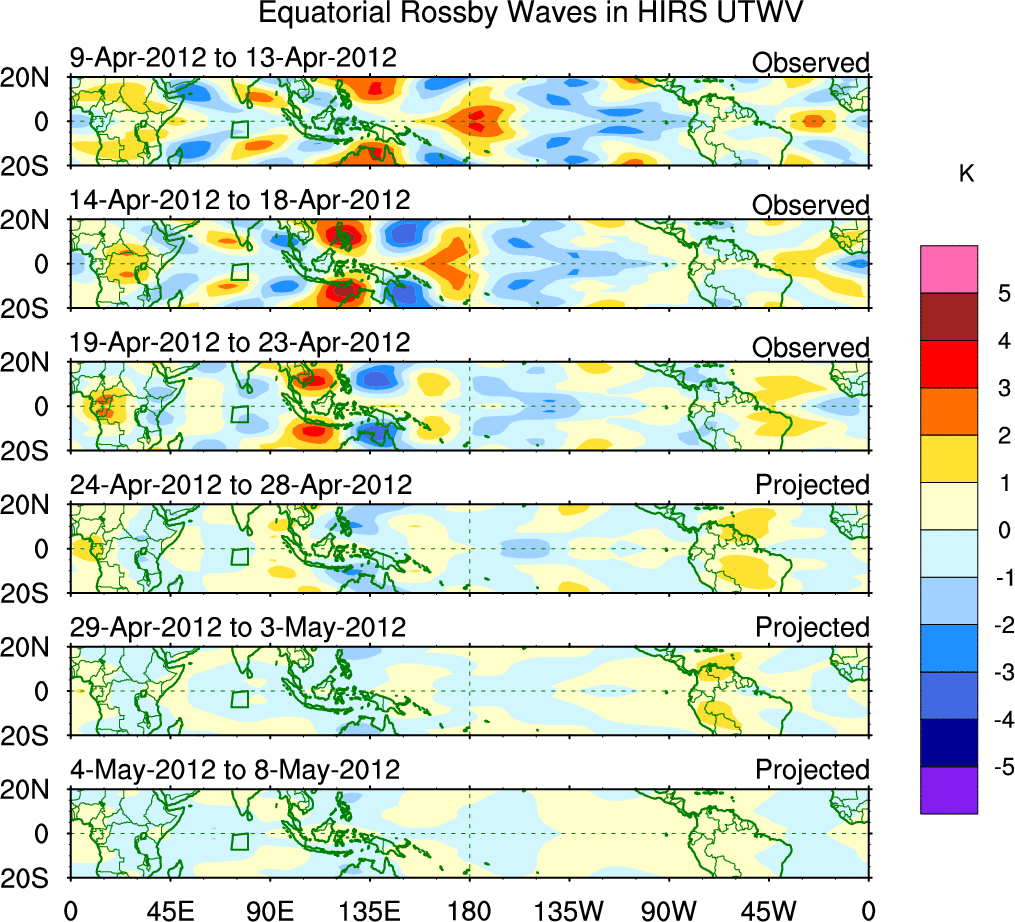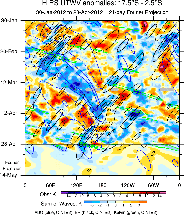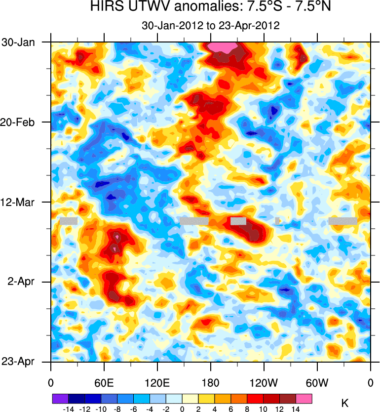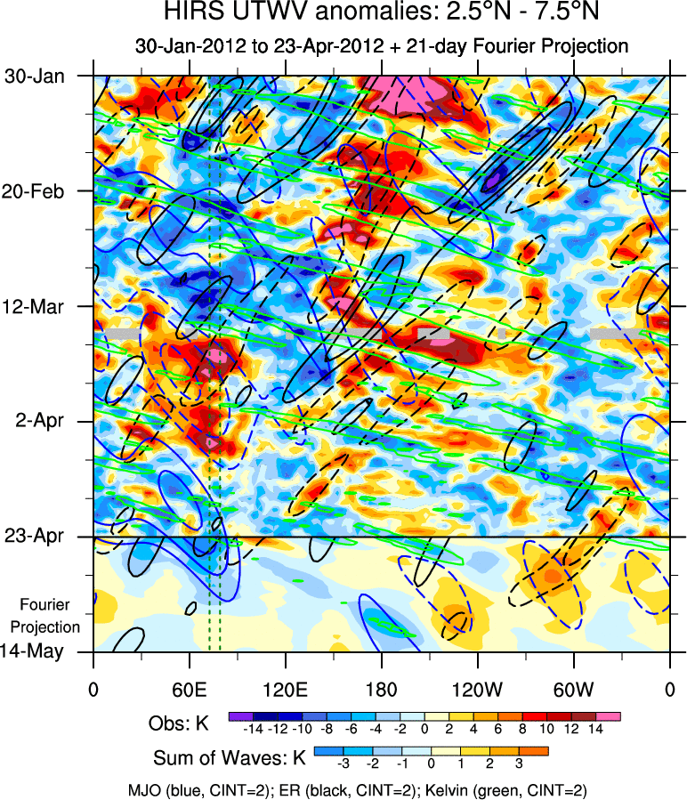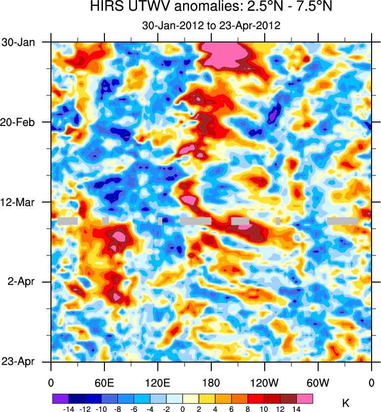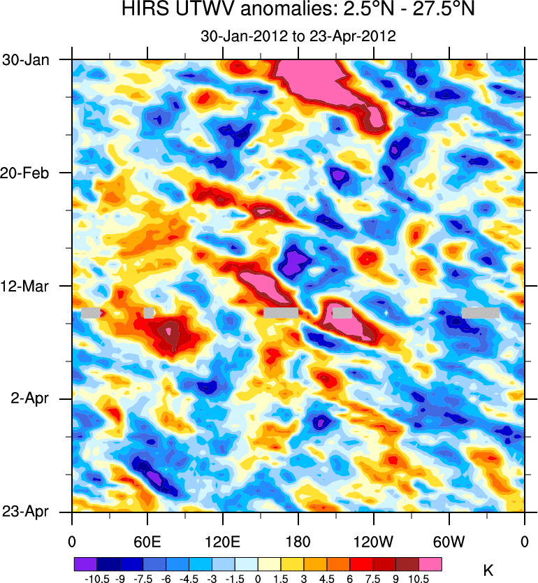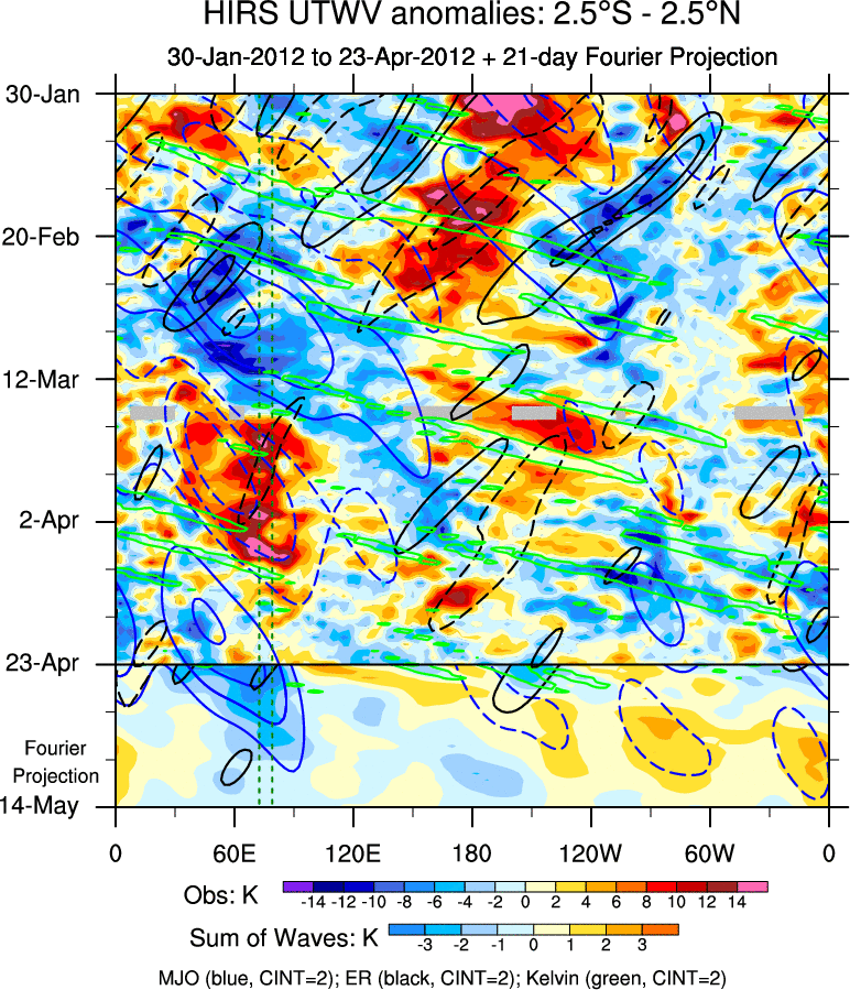 To identify tropical waves in near real-time, the OLR and UTWV data are filtered following Wheeler & Weickmann (2001 MWR). The daily anomalies are calculated using the first 3 harmonics of the seasonal cycle for 1979–2009. Missing values are then filled using linear interpolation in space and time. The most recent 365 days of anomalies are padded with 659 days of zeroes, and the result is filtered for each wave type.