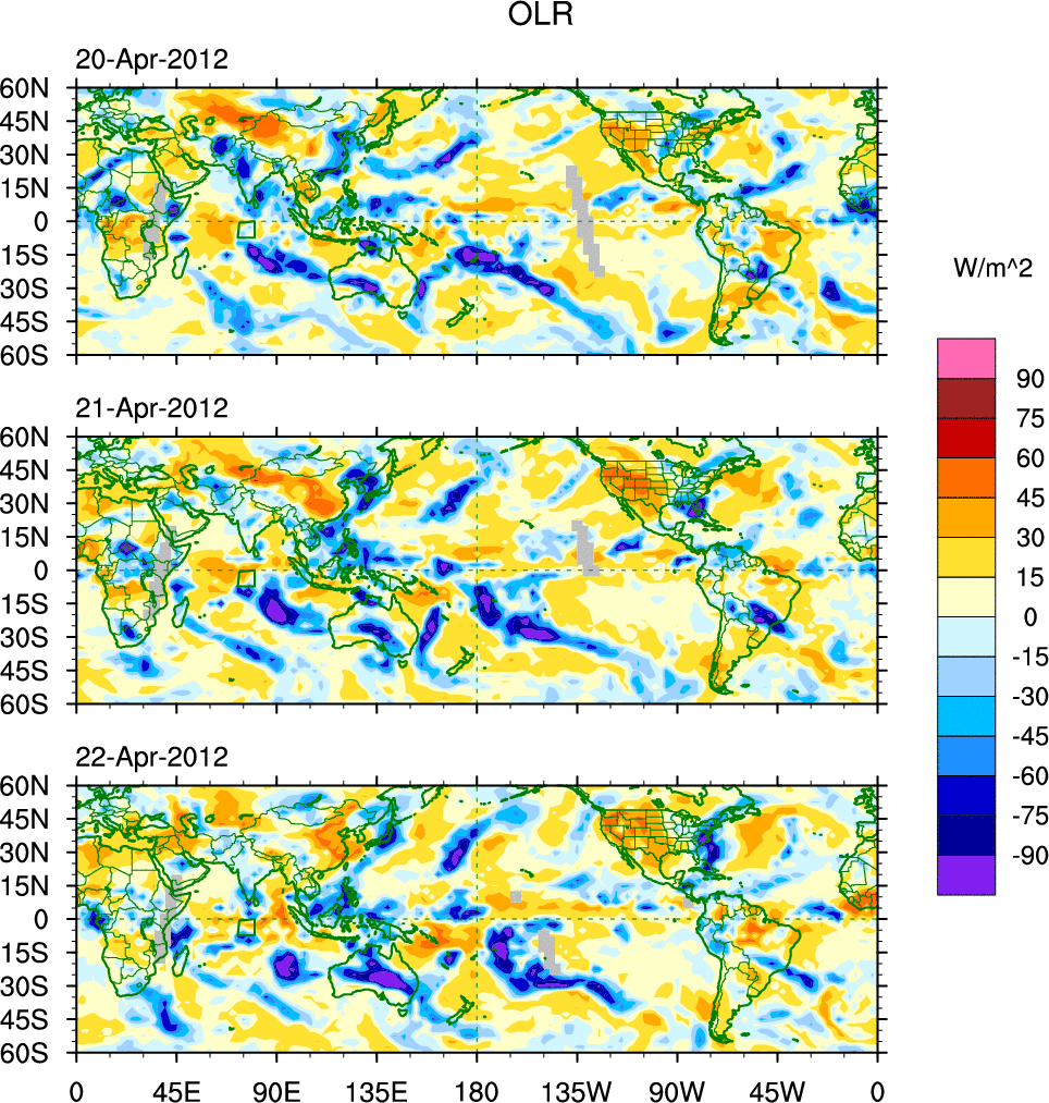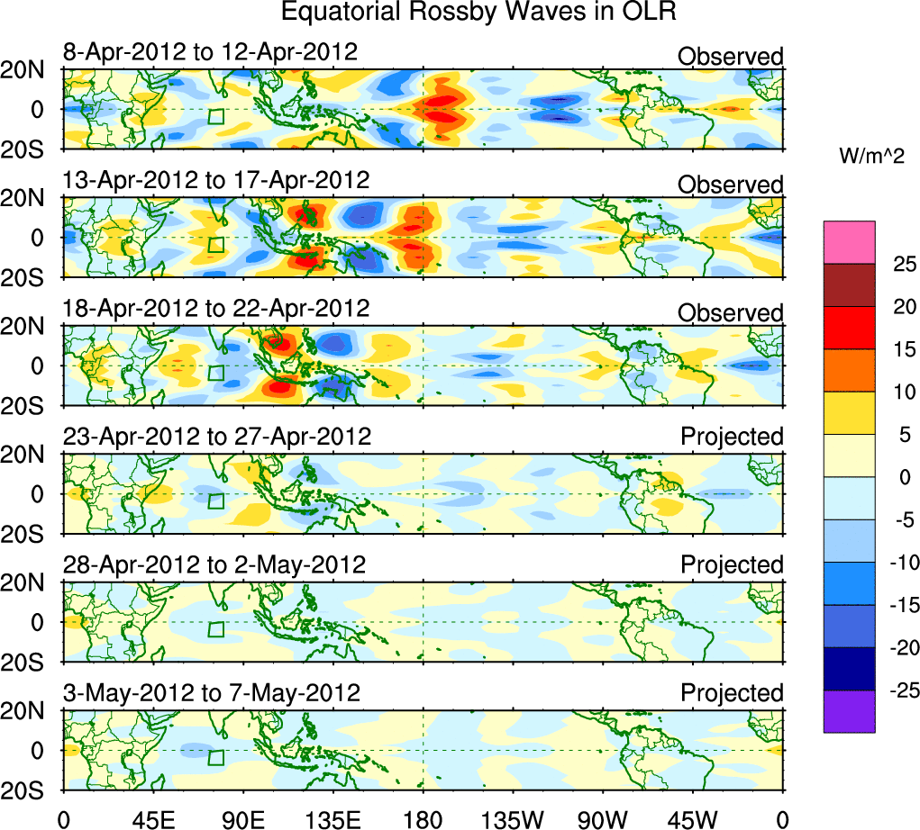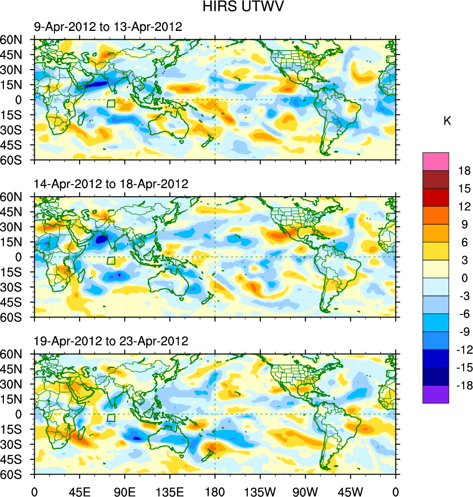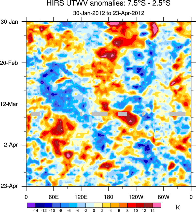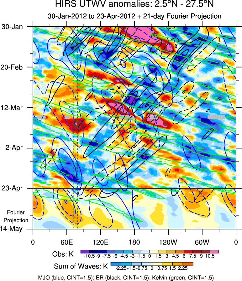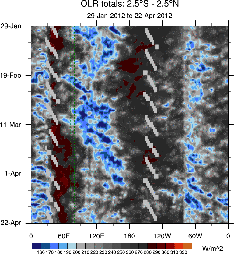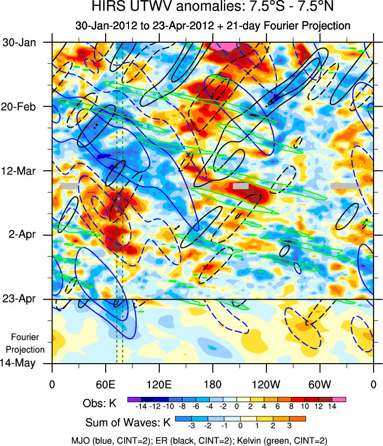 To identify tropical waves in near real-time, the OLR and UTWV data are filtered following Wheeler & Weickmann (2001 MWR). The daily anomalies are calculated using the first 3 harmonics of the seasonal cycle for 1979–2009. Missing values are then filled using linear interpolation in space and time. The most recent 365 days of anomalies are padded with 659 days of zeroes, and the result is filtered for each wave type.