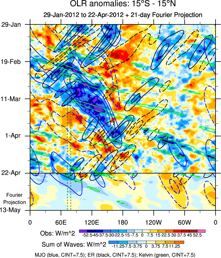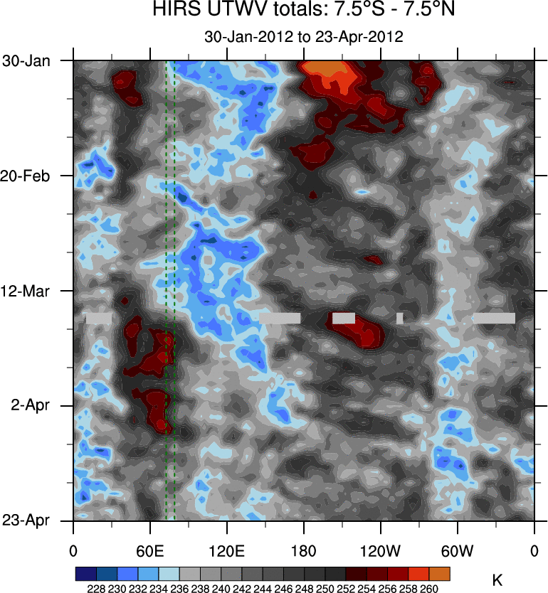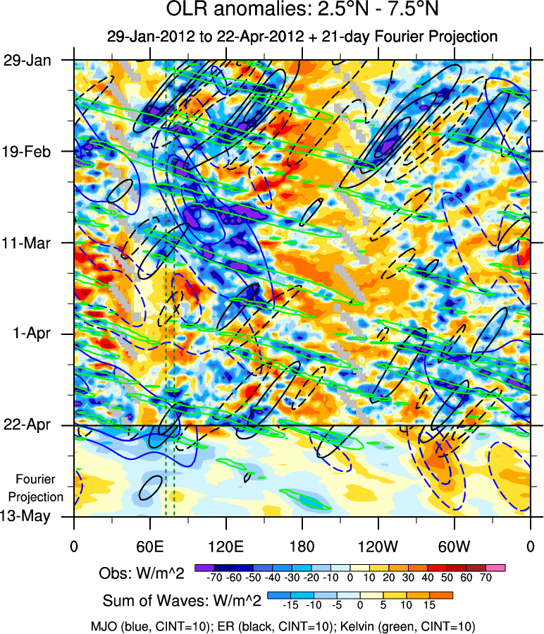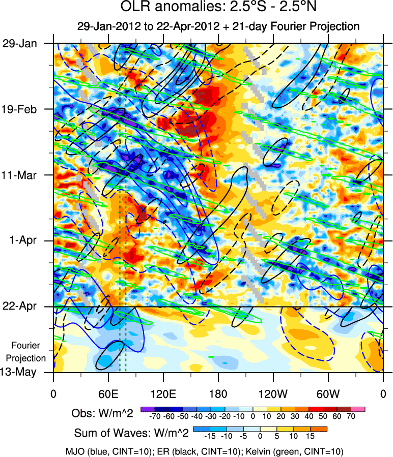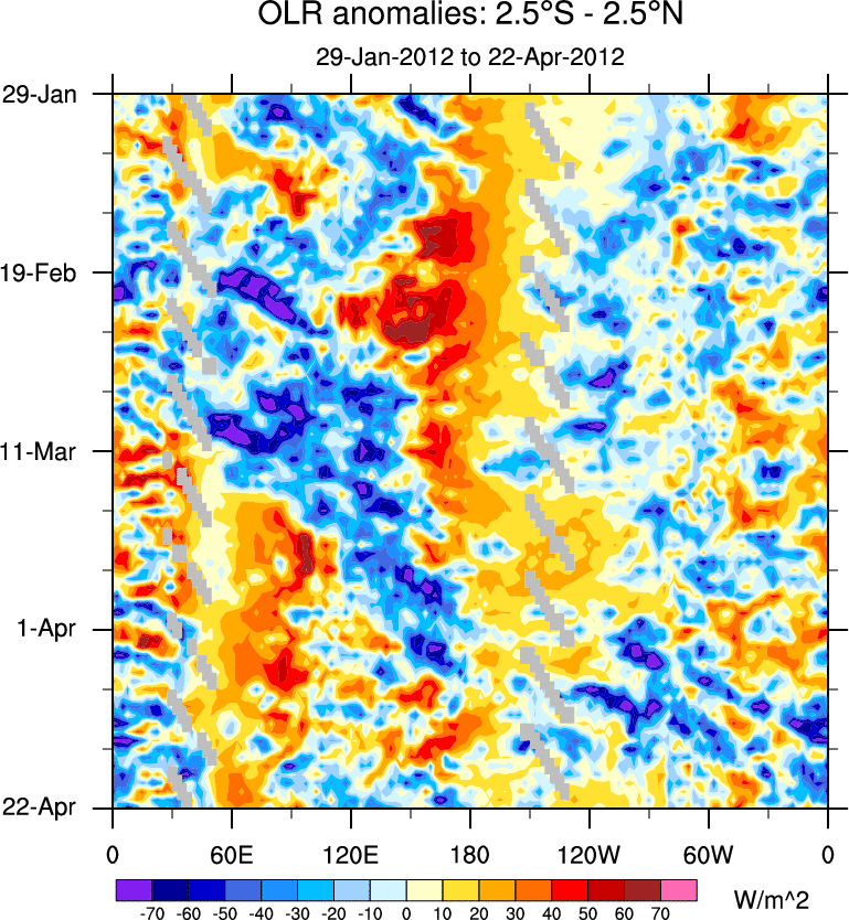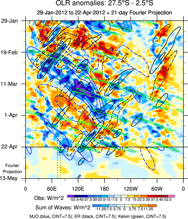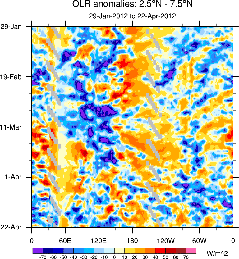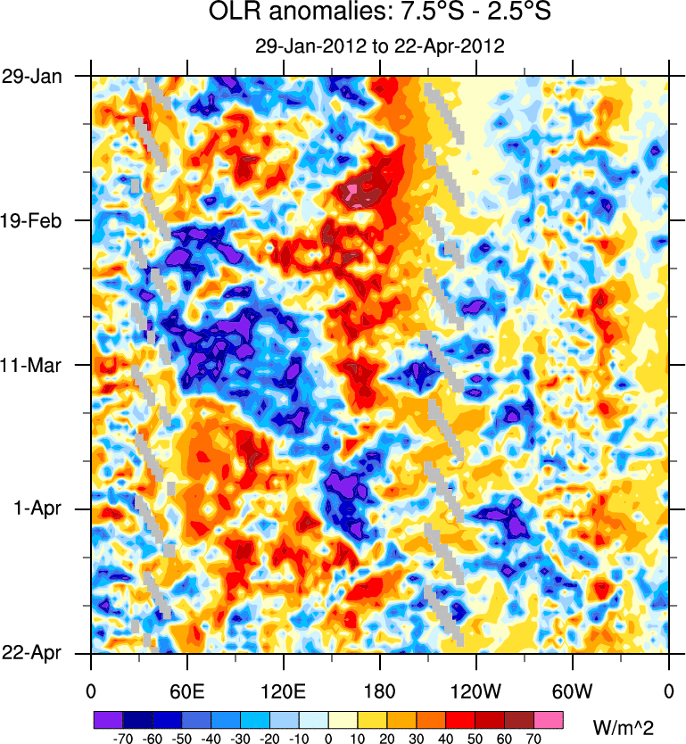 To identify tropical waves in near real-time, the OLR and UTWV data are filtered following Wheeler & Weickmann (2001 MWR). The daily anomalies are calculated using the first 3 harmonics of the seasonal cycle for 1979–2009. Missing values are then filled using linear interpolation in space and time. The most recent 365 days of anomalies are padded with 659 days of zeroes, and the result is filtered for each wave type.