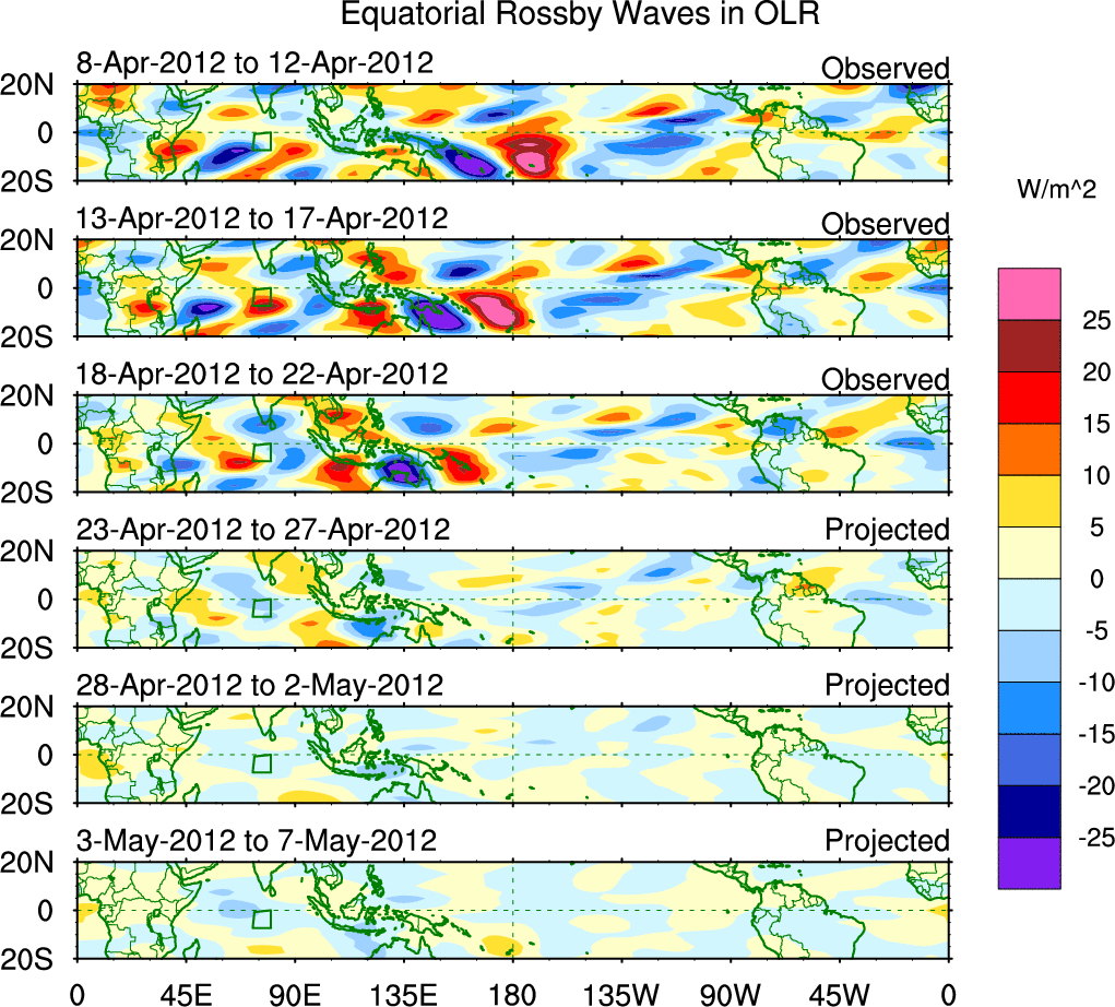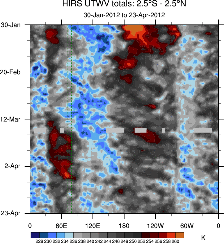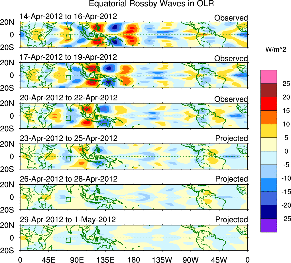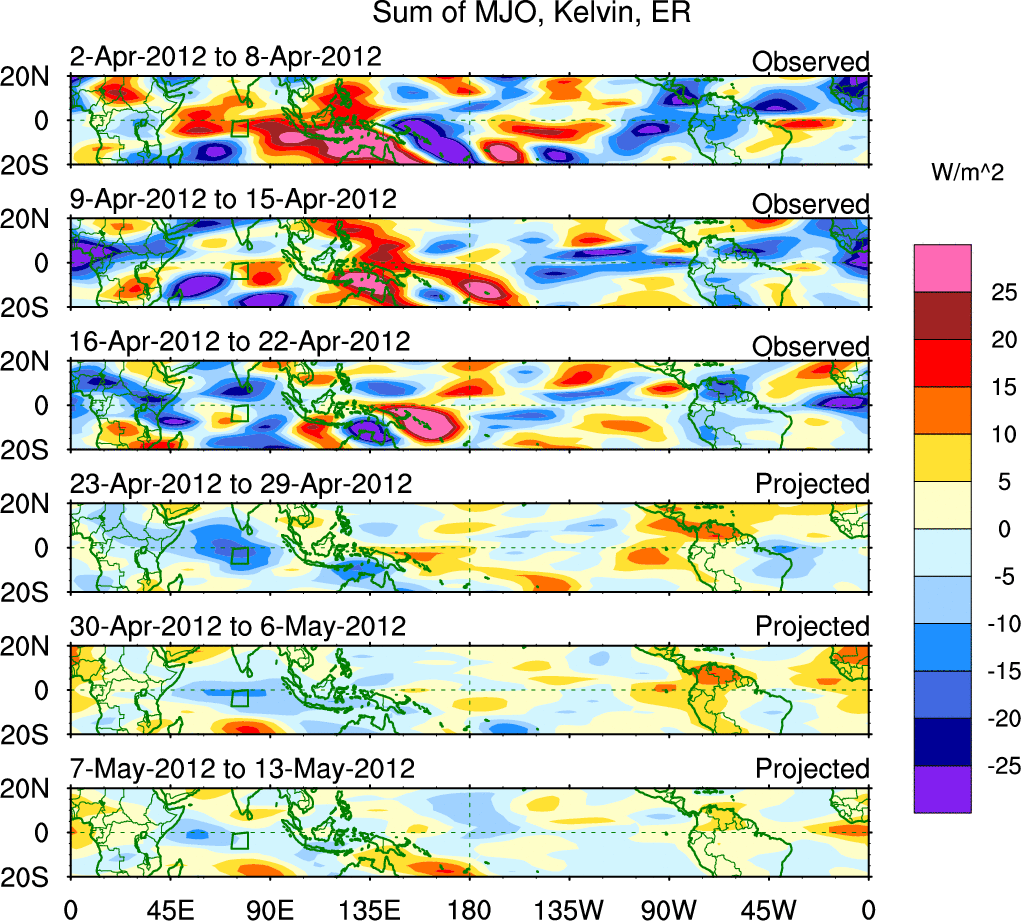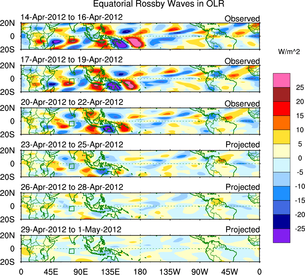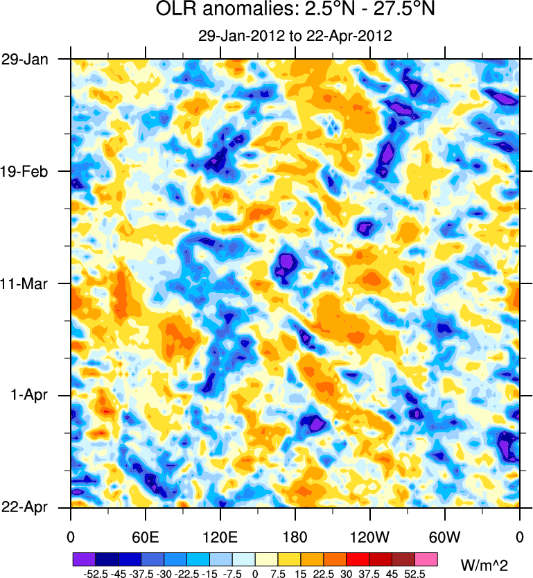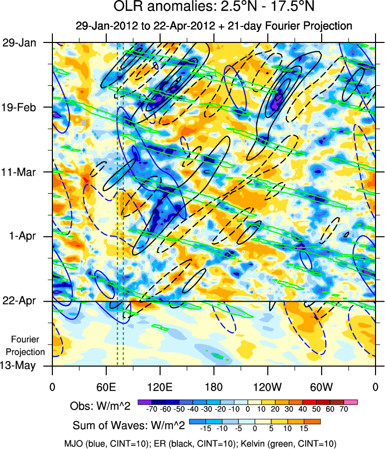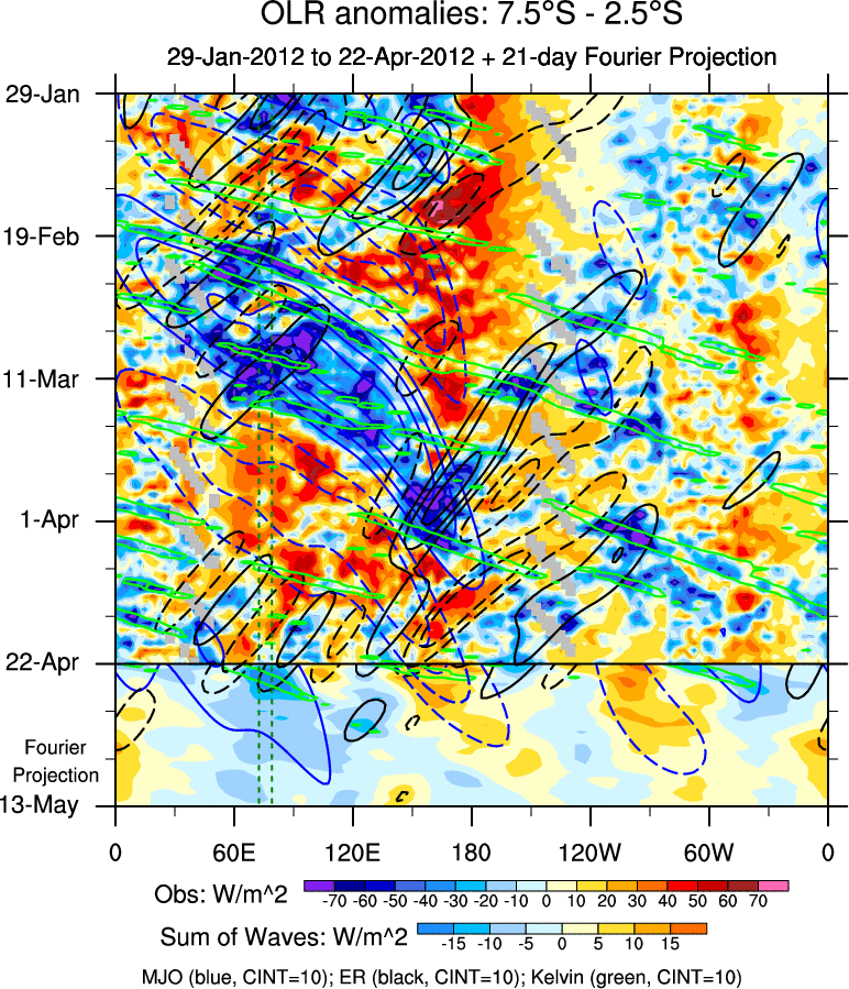 To identify tropical waves in near real-time, the OLR and UTWV data are filtered following Wheeler & Weickmann (2001 MWR). The daily anomalies are calculated using the first 3 harmonics of the seasonal cycle for 1979–2009. Missing values are then filled using linear interpolation in space and time. The most recent 365 days of anomalies are padded with 659 days of zeroes, and the result is filtered for each wave type.