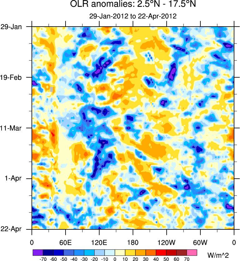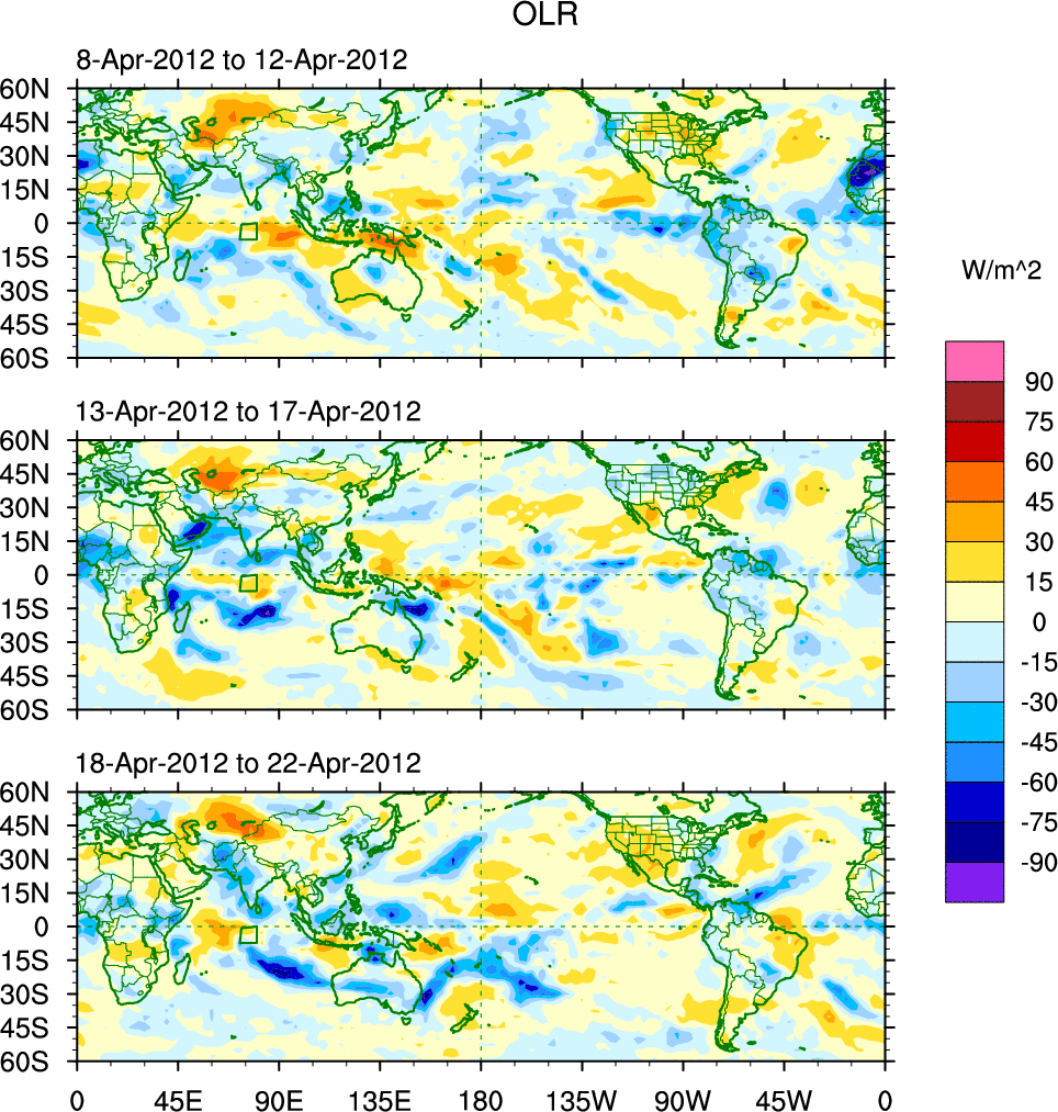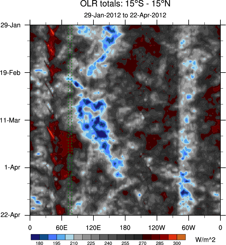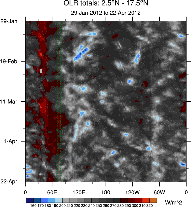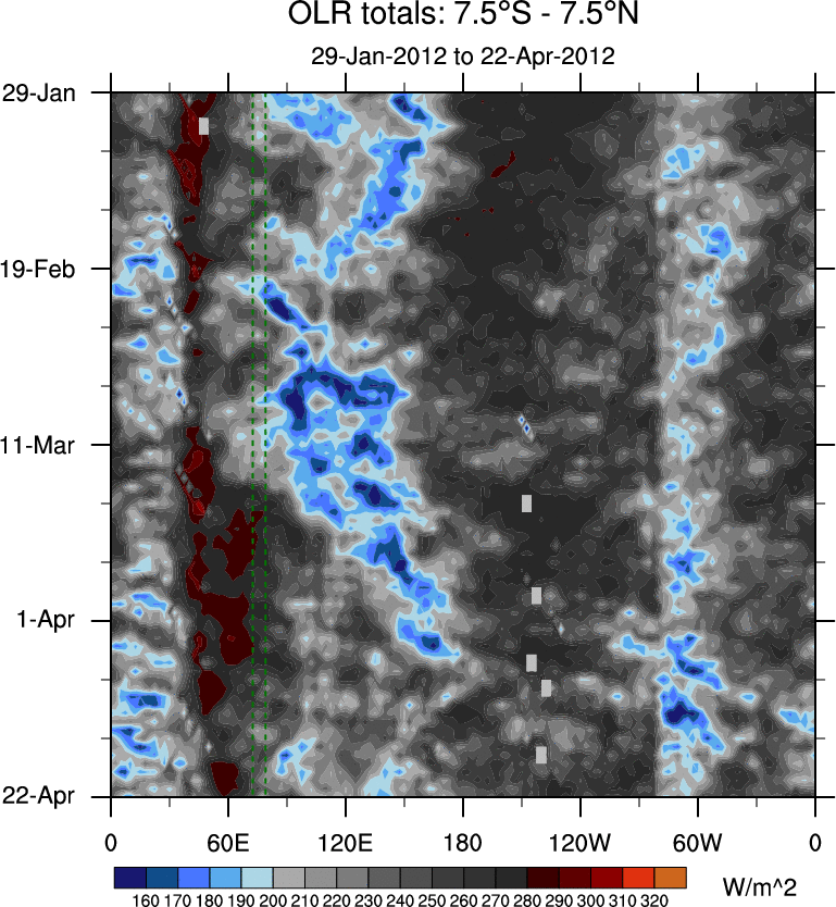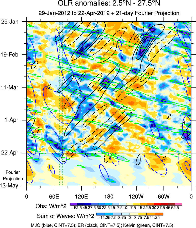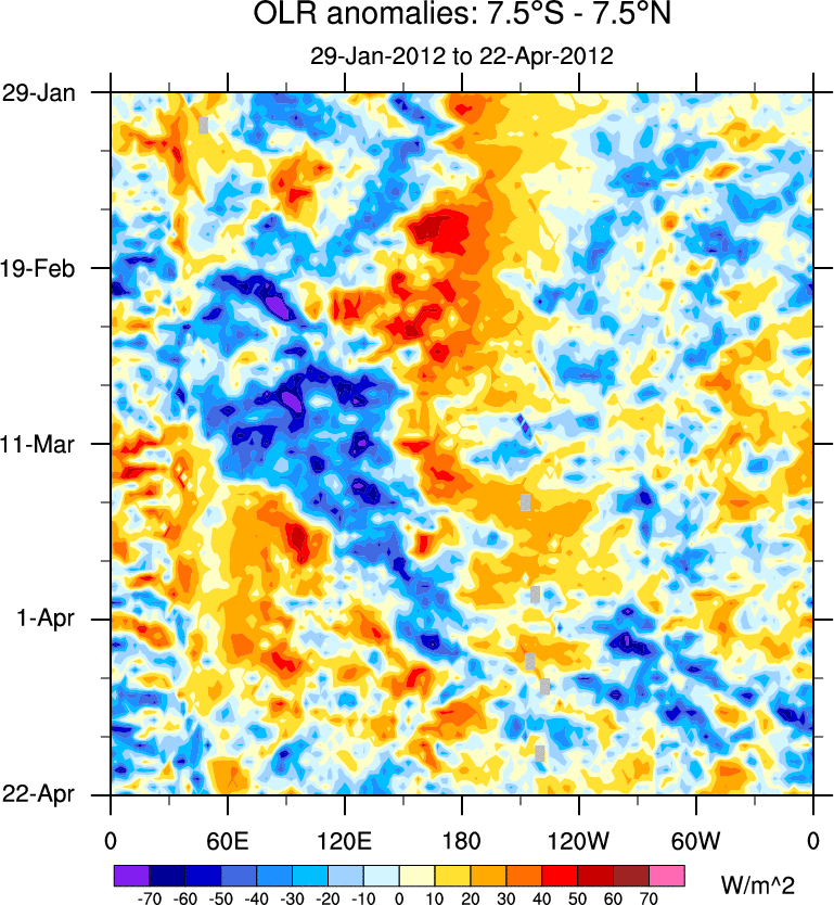 To identify tropical waves in near real-time, the OLR and UTWV data are filtered following Wheeler & Weickmann (2001 MWR). The daily anomalies are calculated using the first 3 harmonics of the seasonal cycle for 1979–2009. Missing values are then filled using linear interpolation in space and time. The most recent 365 days of anomalies are padded with 659 days of zeroes, and the result is filtered for each wave type.