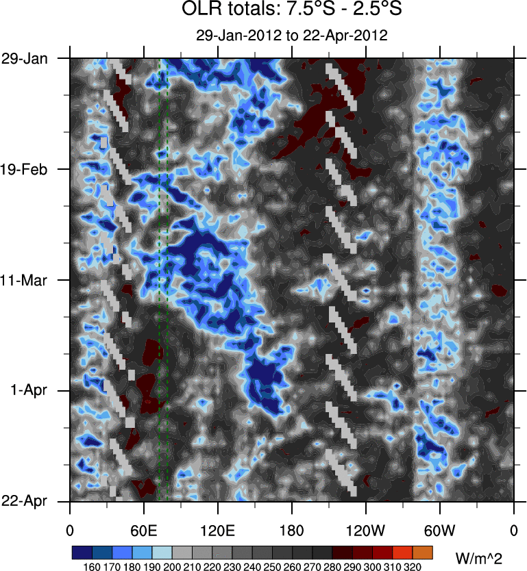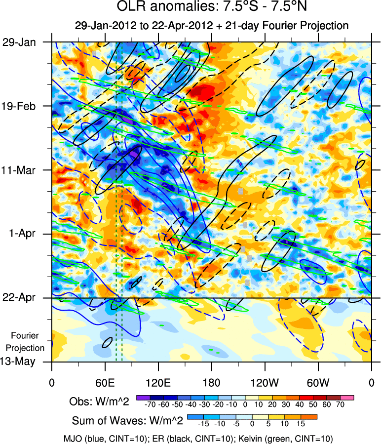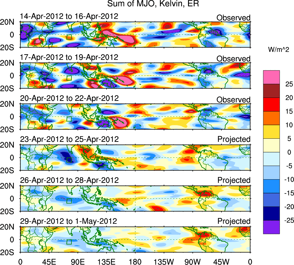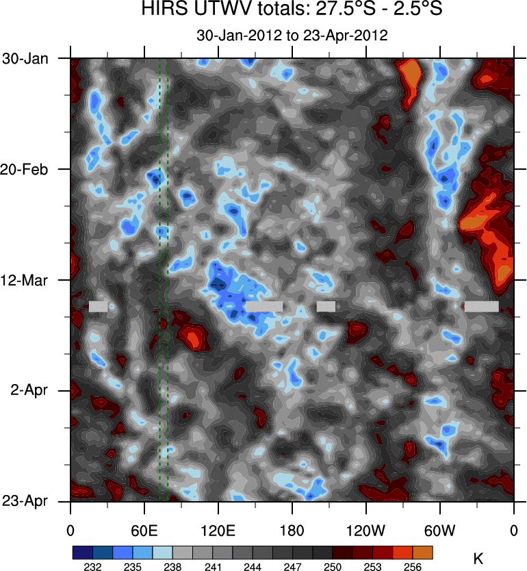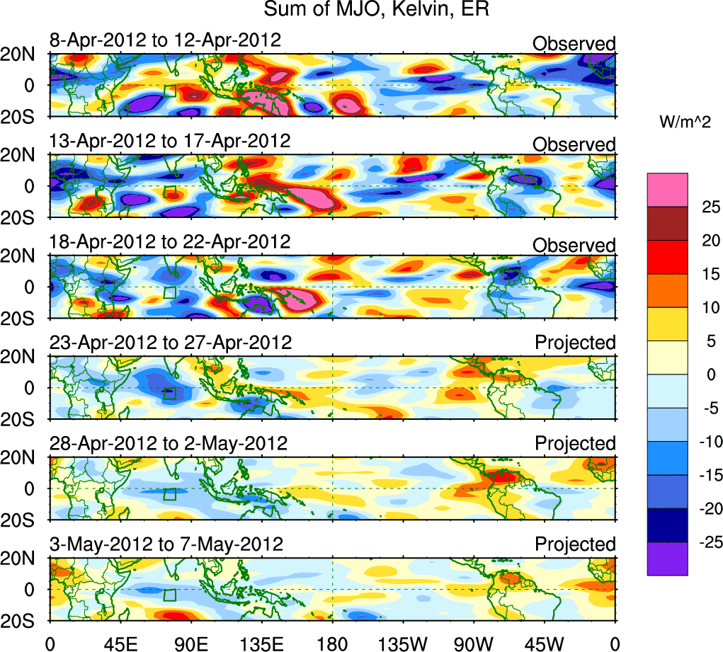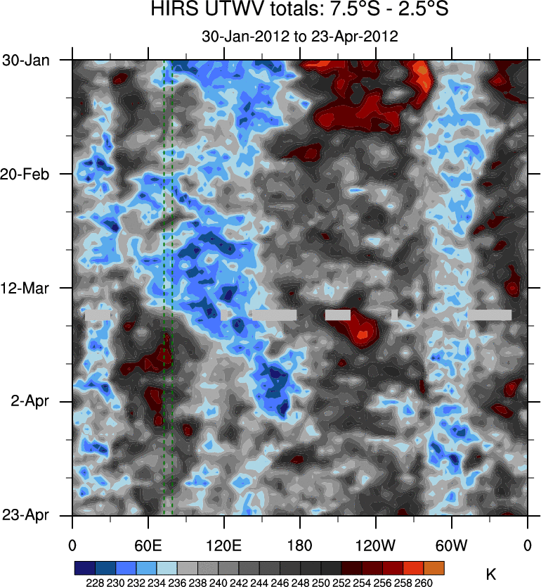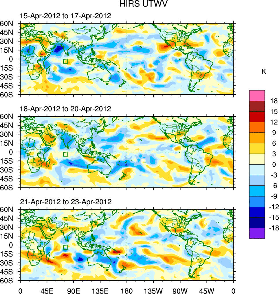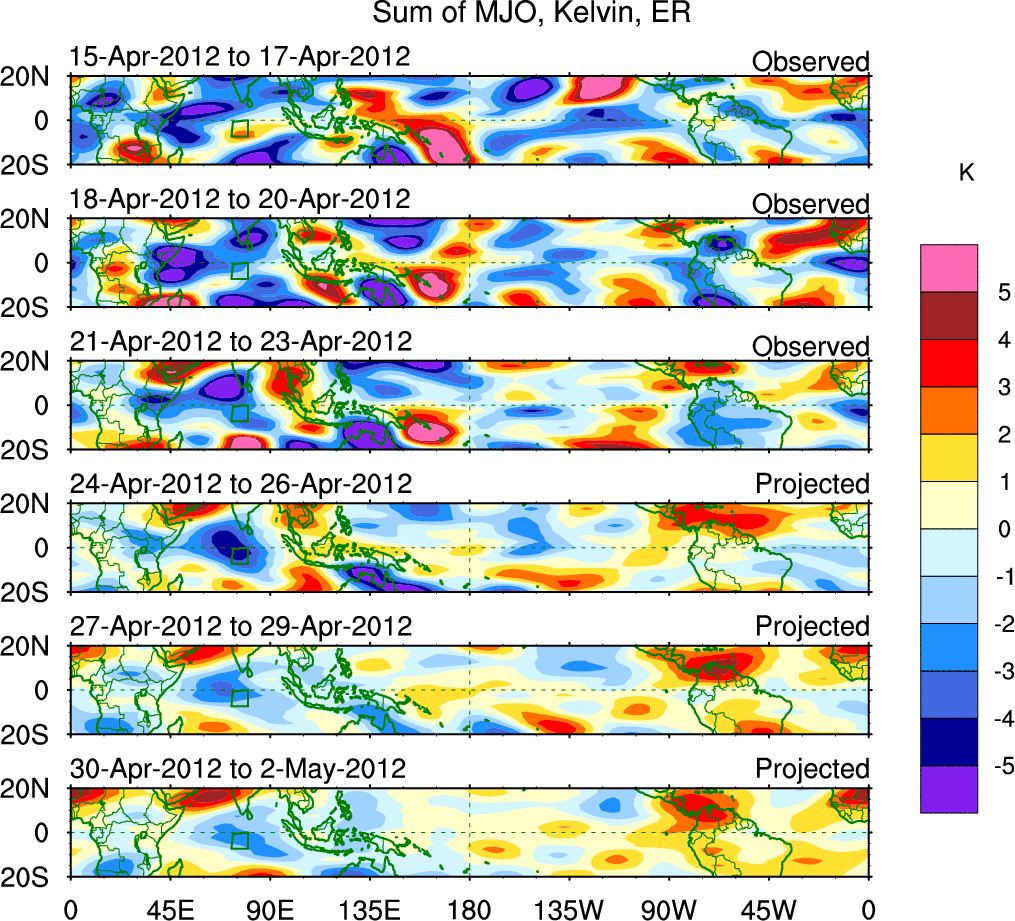 To identify tropical waves in near real-time, the OLR and UTWV data are filtered following Wheeler & Weickmann (2001 MWR). The daily anomalies are calculated using the first 3 harmonics of the seasonal cycle for 1979–2009. Missing values are then filled using linear interpolation in space and time. The most recent 365 days of anomalies are padded with 659 days of zeroes, and the result is filtered for each wave type.