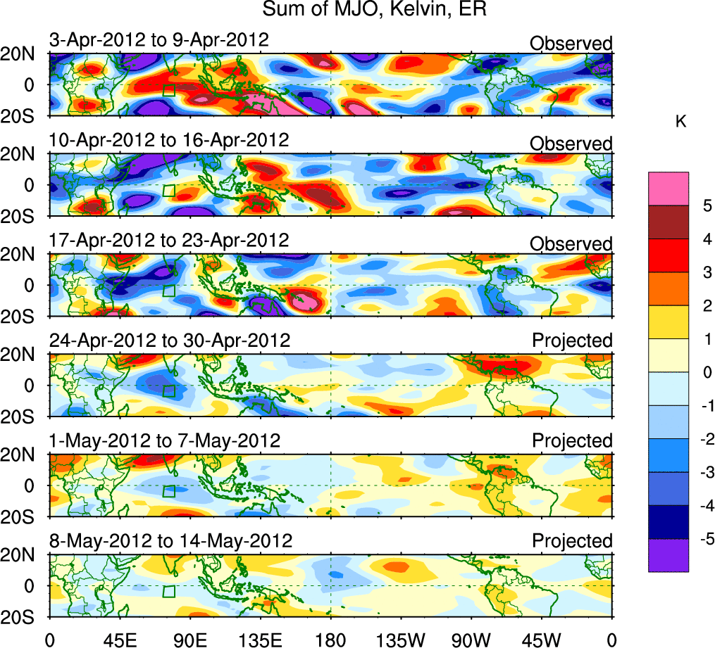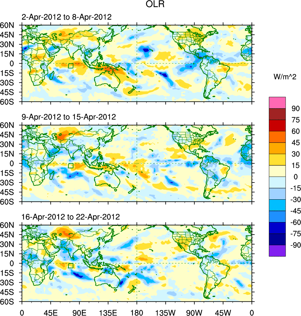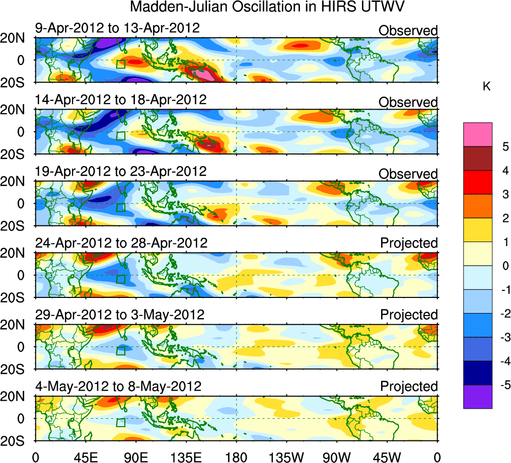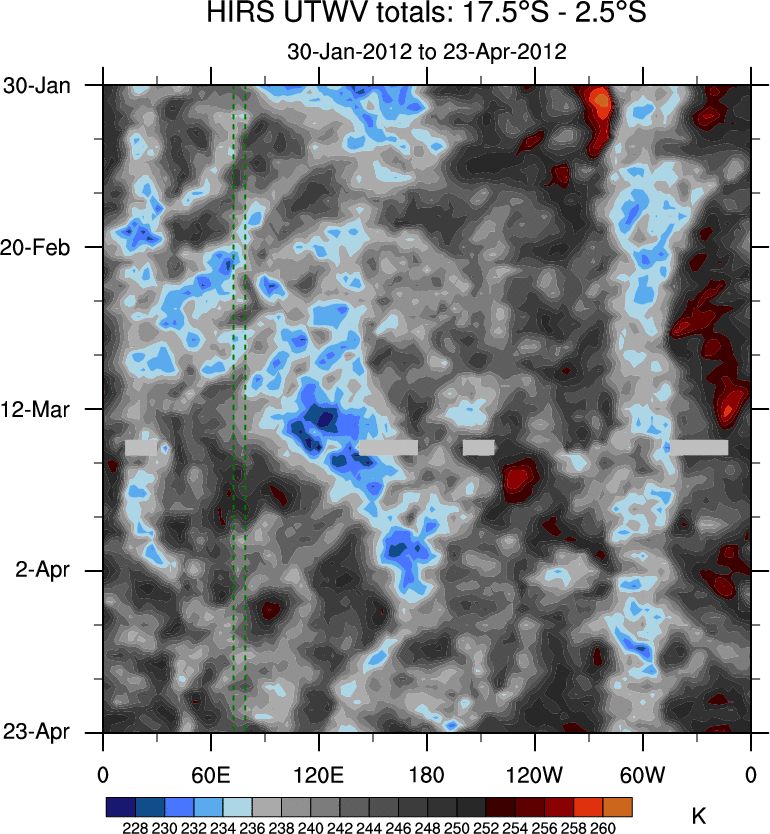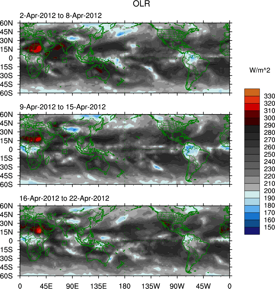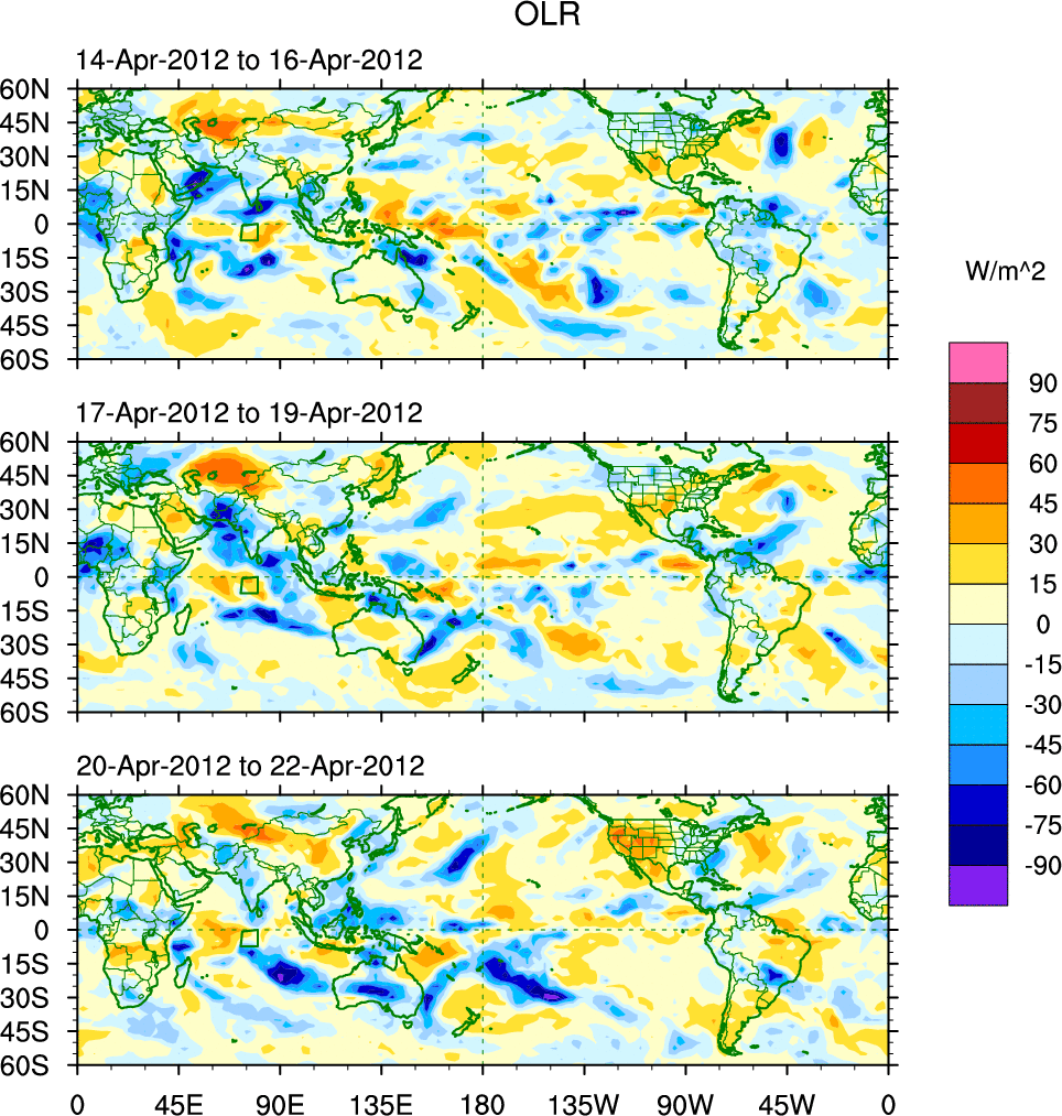 To identify tropical waves in near real-time, the OLR and UTWV data are filtered following Wheeler & Weickmann (2001 MWR). The daily anomalies are calculated using the first 3 harmonics of the seasonal cycle for 1979–2009. Missing values are then filled using linear interpolation in space and time. The most recent 365 days of anomalies are padded with 659 days of zeroes, and the result is filtered for each wave type.