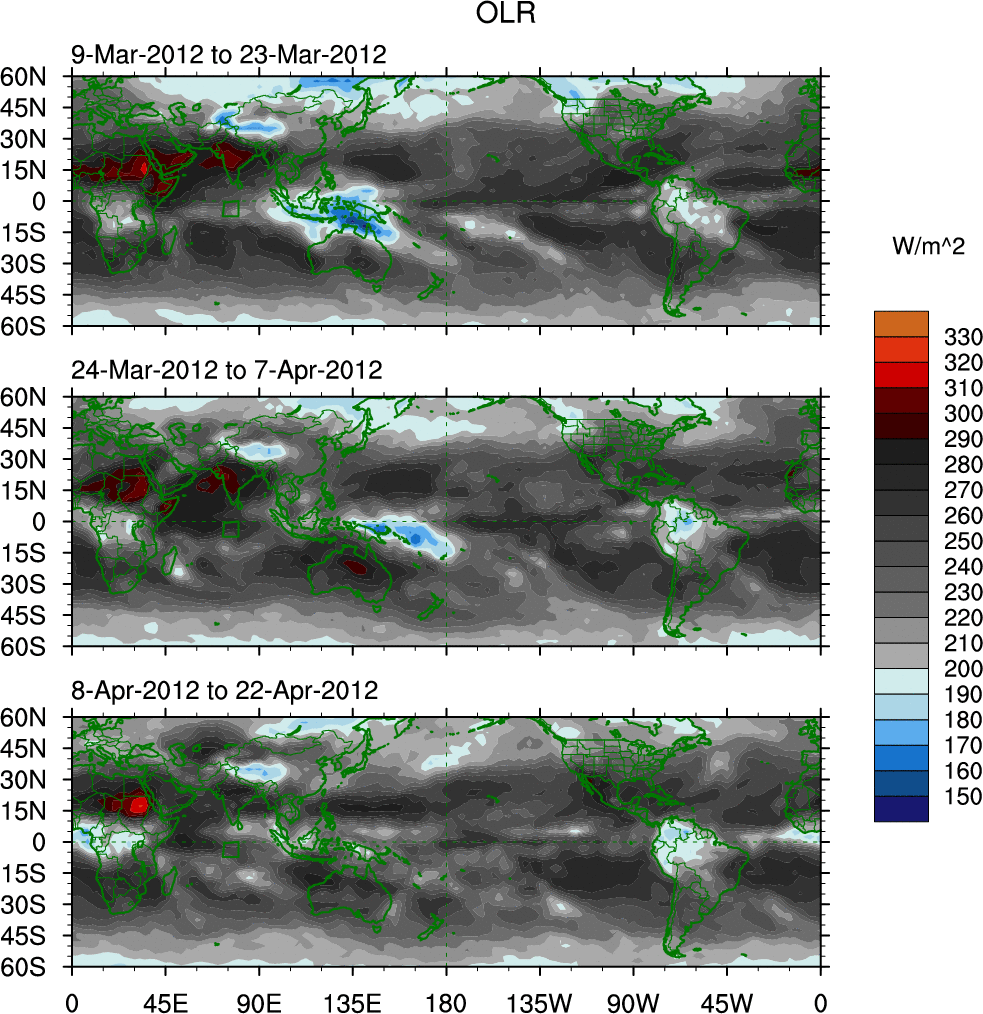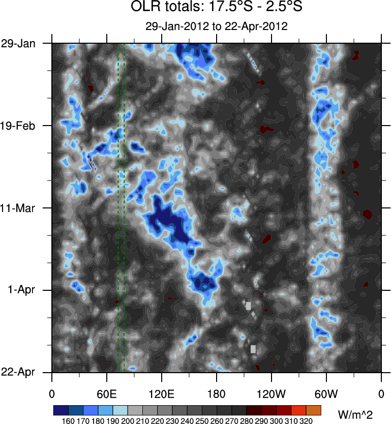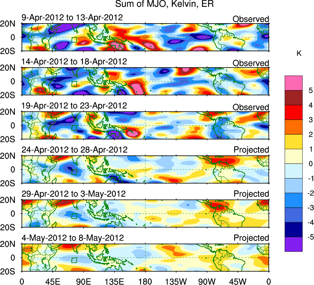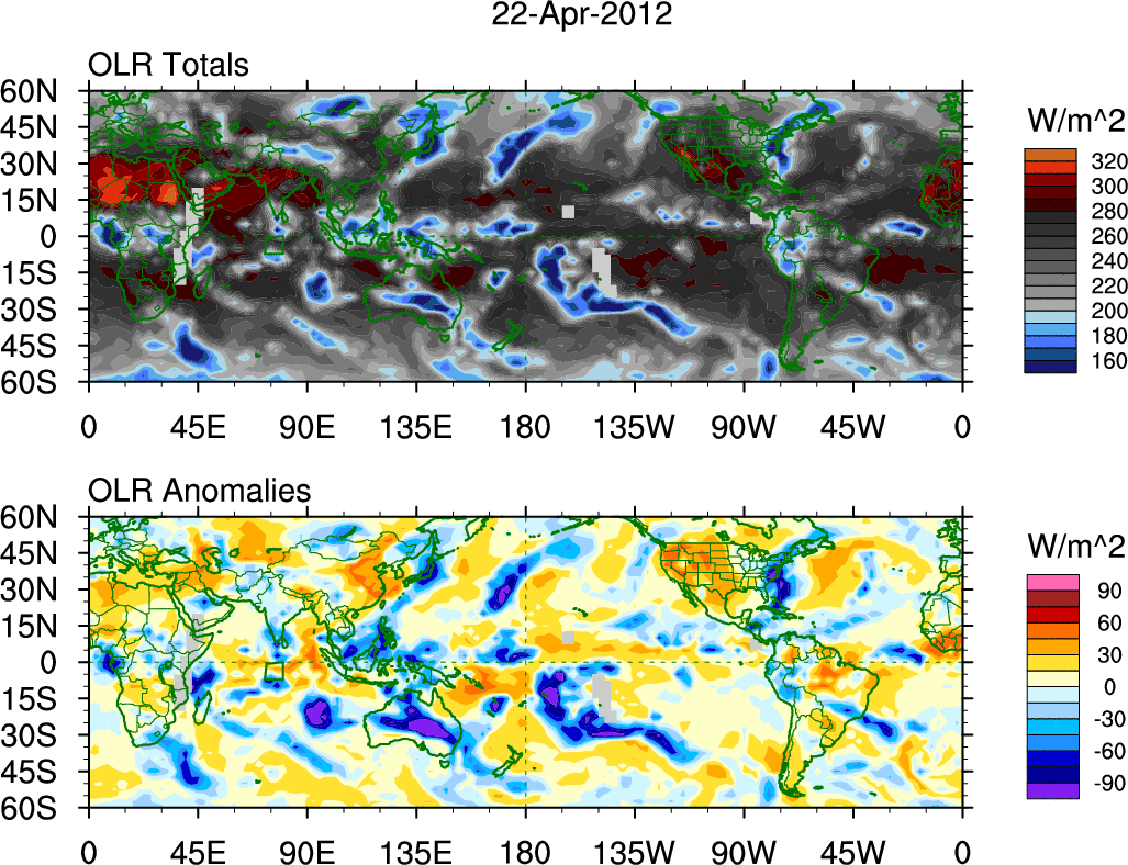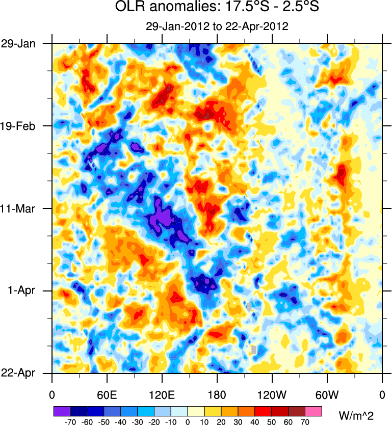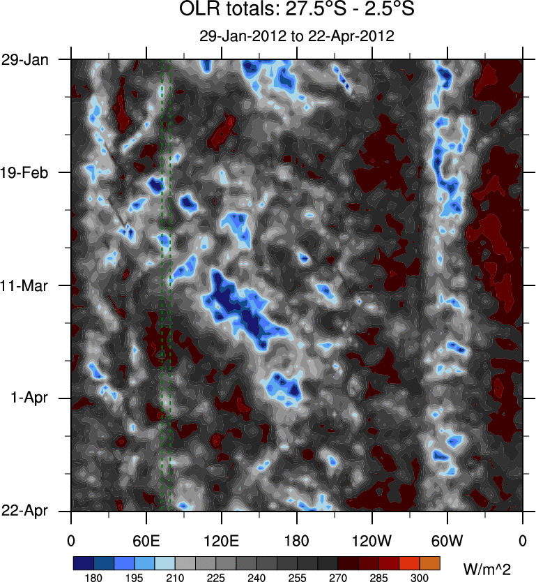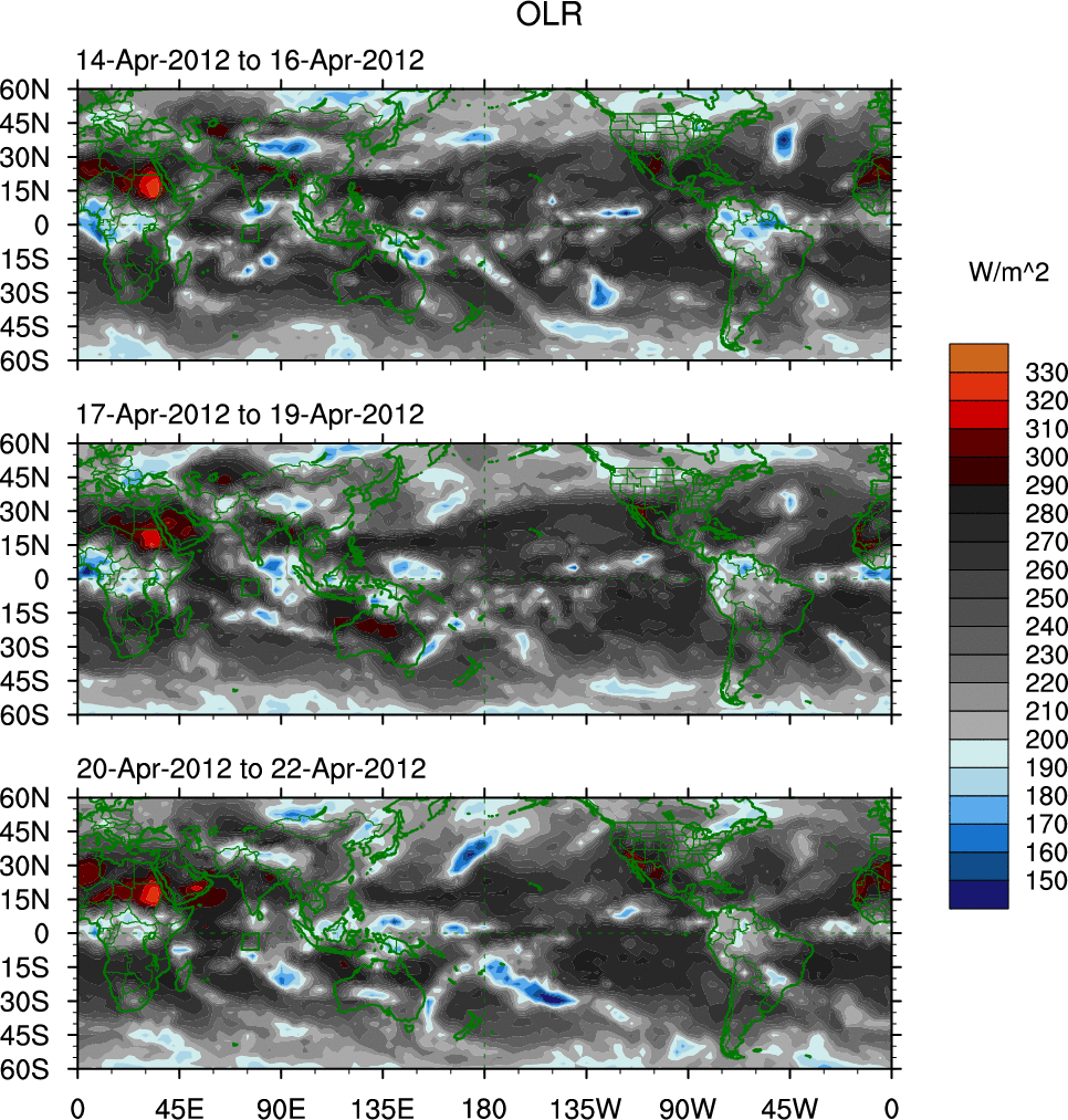 To identify tropical waves in near real-time, the OLR and UTWV data are filtered following Wheeler & Weickmann (2001 MWR). The daily anomalies are calculated using the first 3 harmonics of the seasonal cycle for 1979–2009. Missing values are then filled using linear interpolation in space and time. The most recent 365 days of anomalies are padded with 659 days of zeroes, and the result is filtered for each wave type.