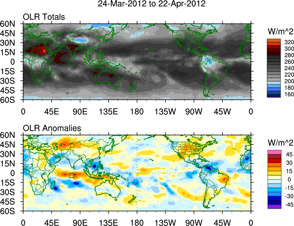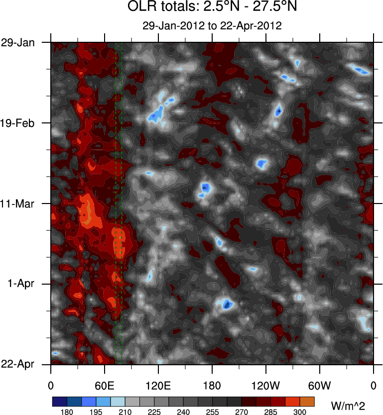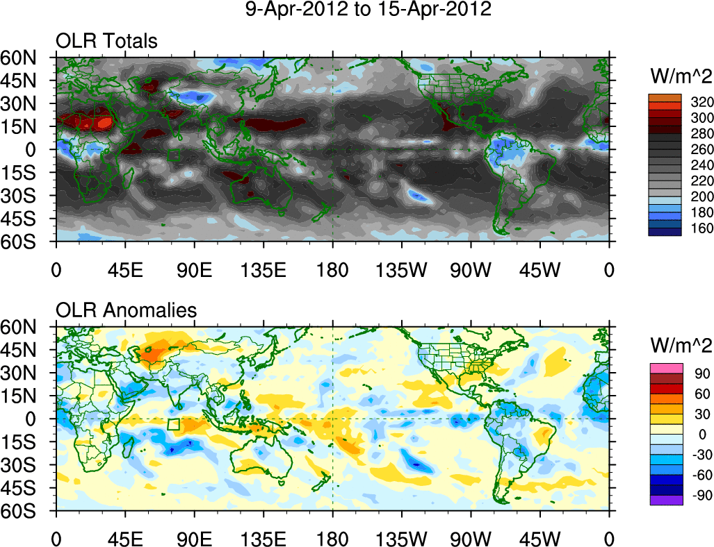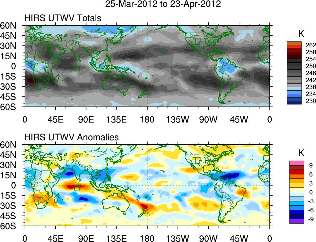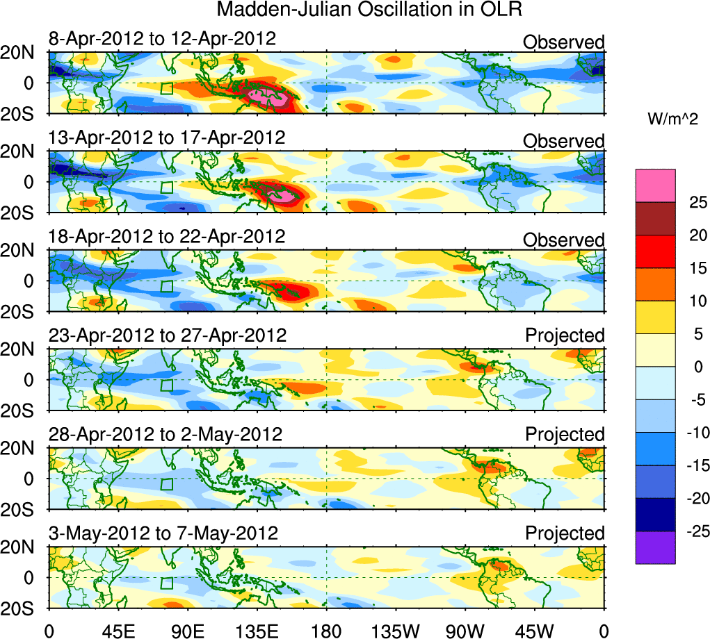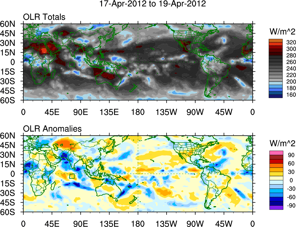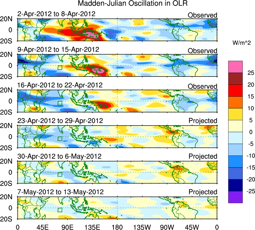 To identify tropical waves in near real-time, the OLR and UTWV data are filtered following Wheeler & Weickmann (2001 MWR). The daily anomalies are calculated using the first 3 harmonics of the seasonal cycle for 1979–2009. Missing values are then filled using linear interpolation in space and time. The most recent 365 days of anomalies are padded with 659 days of zeroes, and the result is filtered for each wave type.