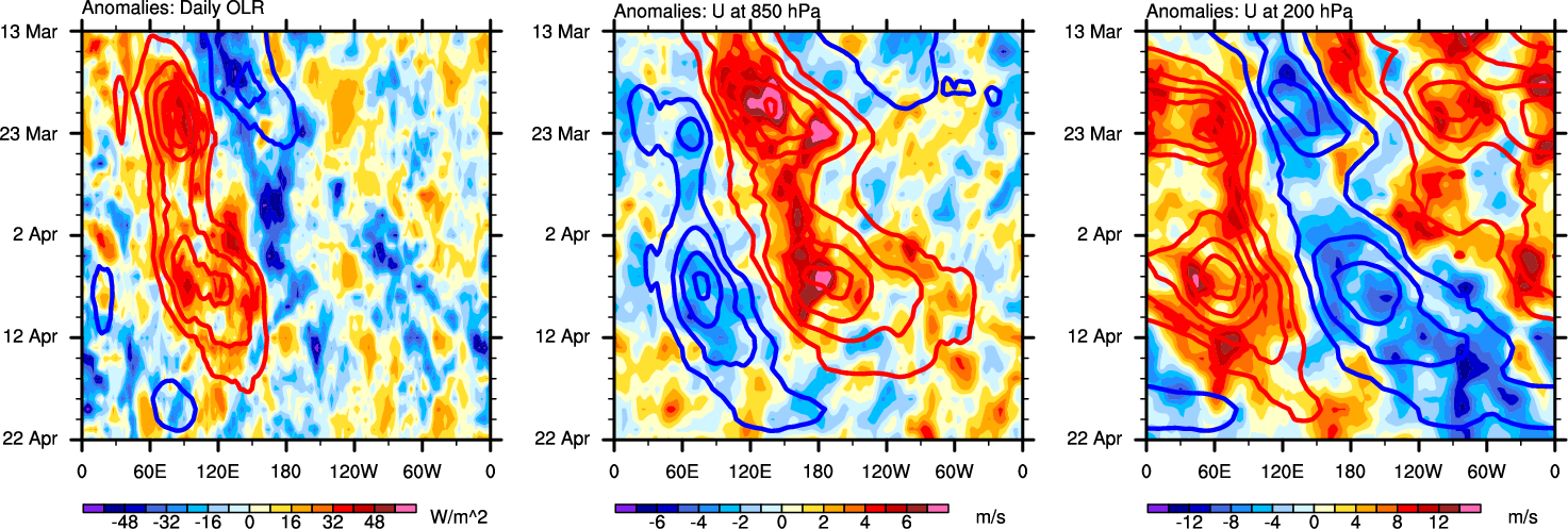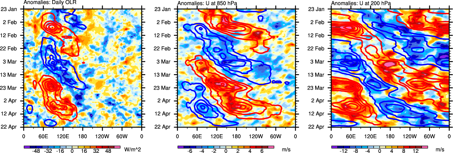 The Hovmollers show longitude-time plots for OLR, U-850, and U-200. The shading indicates the observed anomalies, while the contours are the projection of those anomalies onto the RMM EOFs.