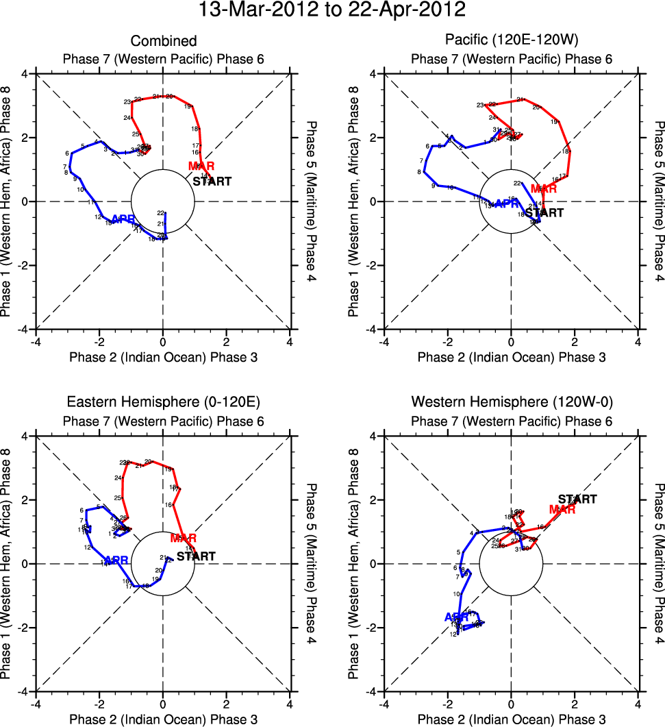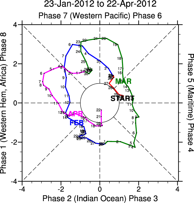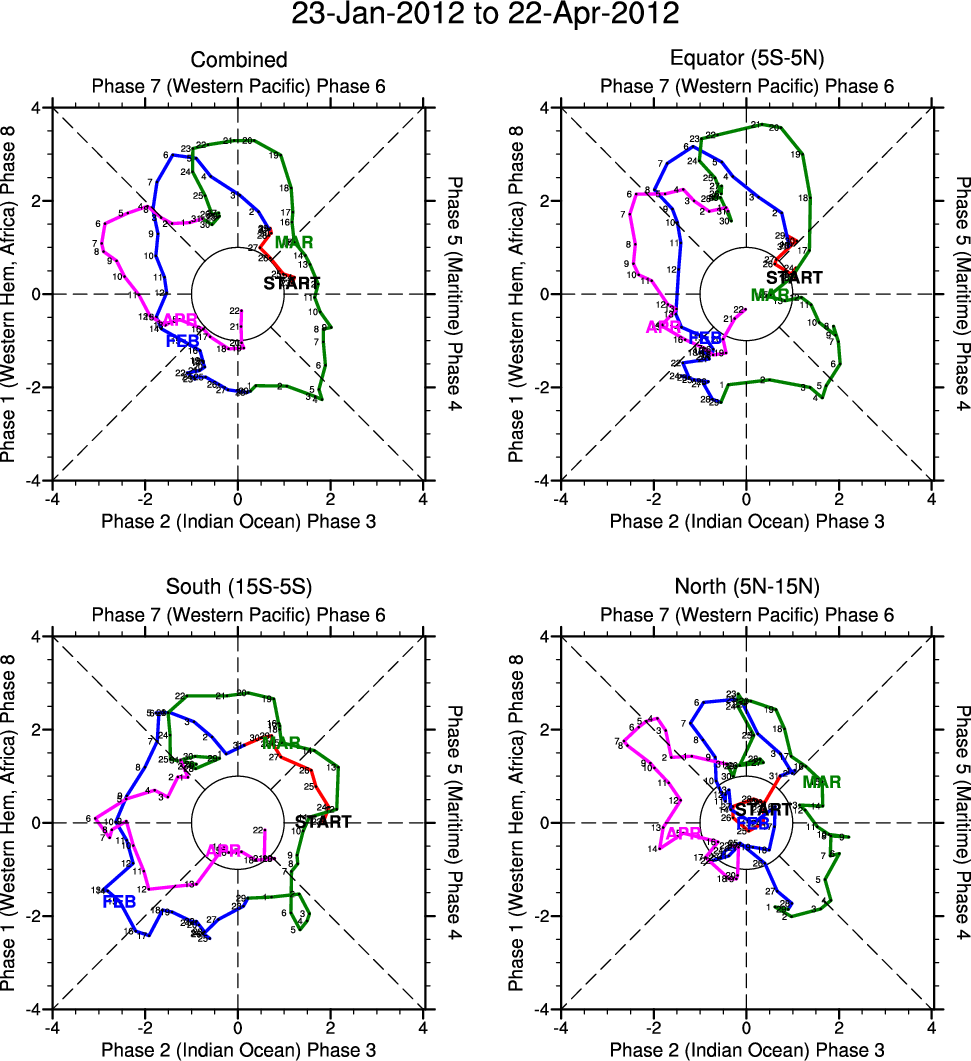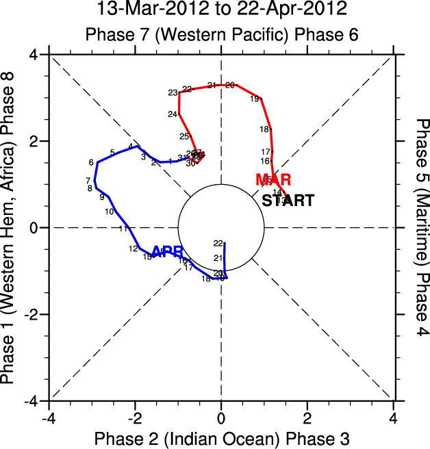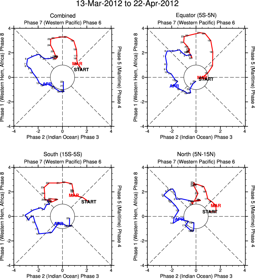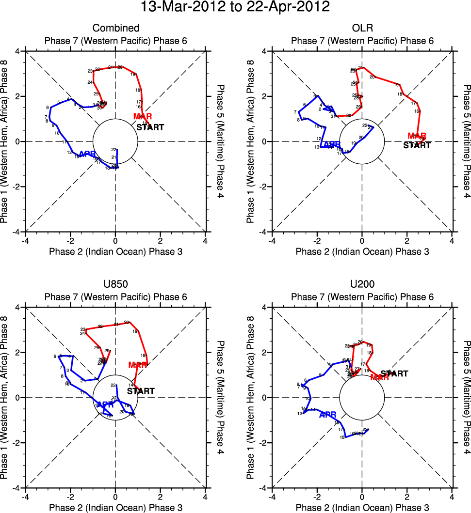 Wheeler and Hendon (2004) constructed the RMM index for monitoring the MJO. This index consists of the first two principal components (PCs) of OLR, 850-hPa zonal wind, and 200-hPa zonal wind averaged 15S-15N.