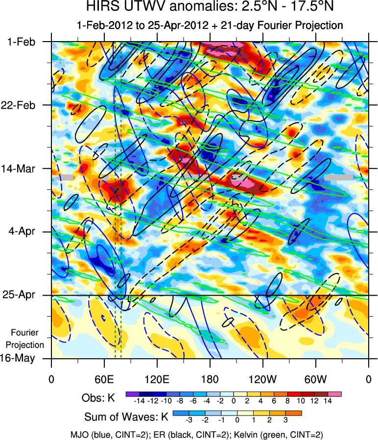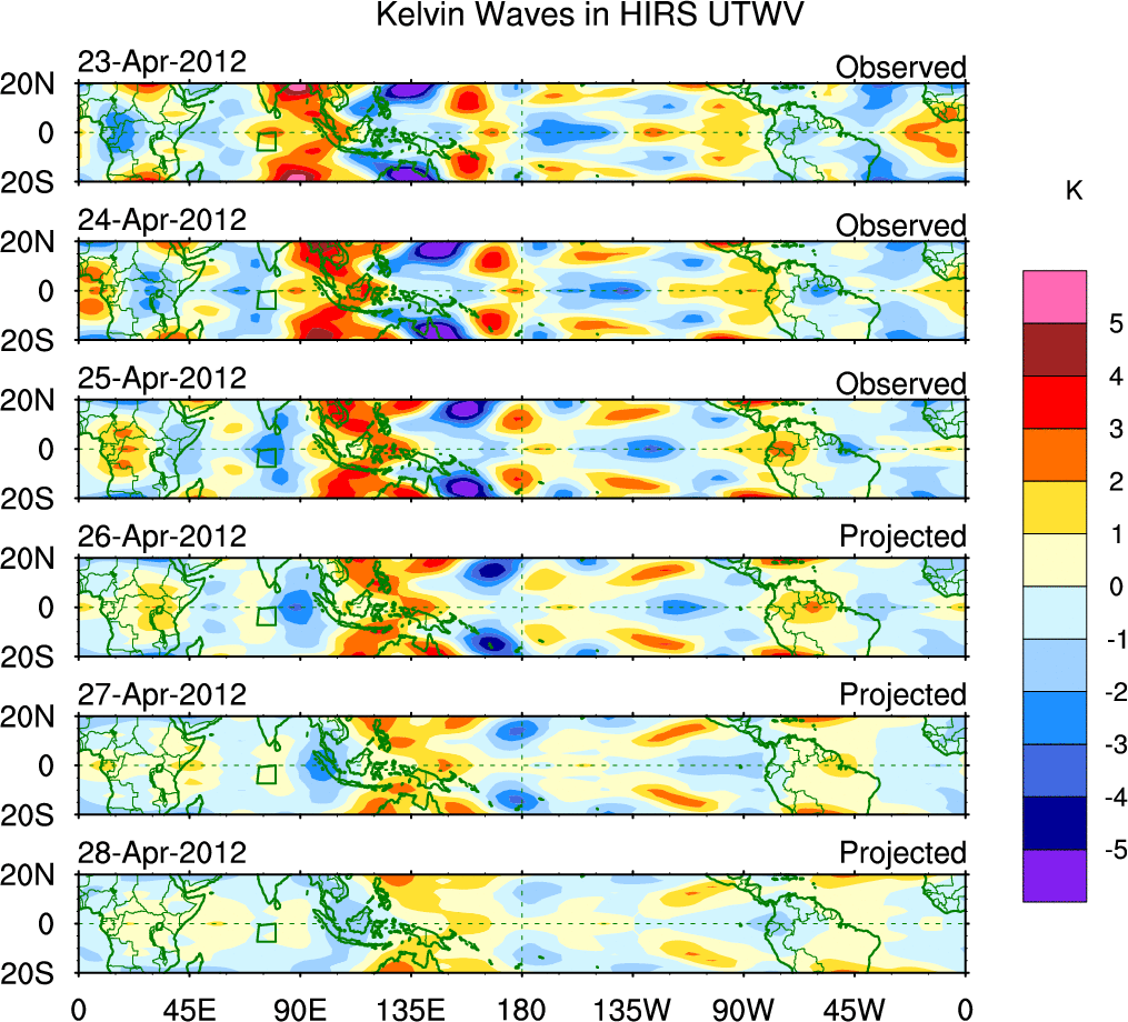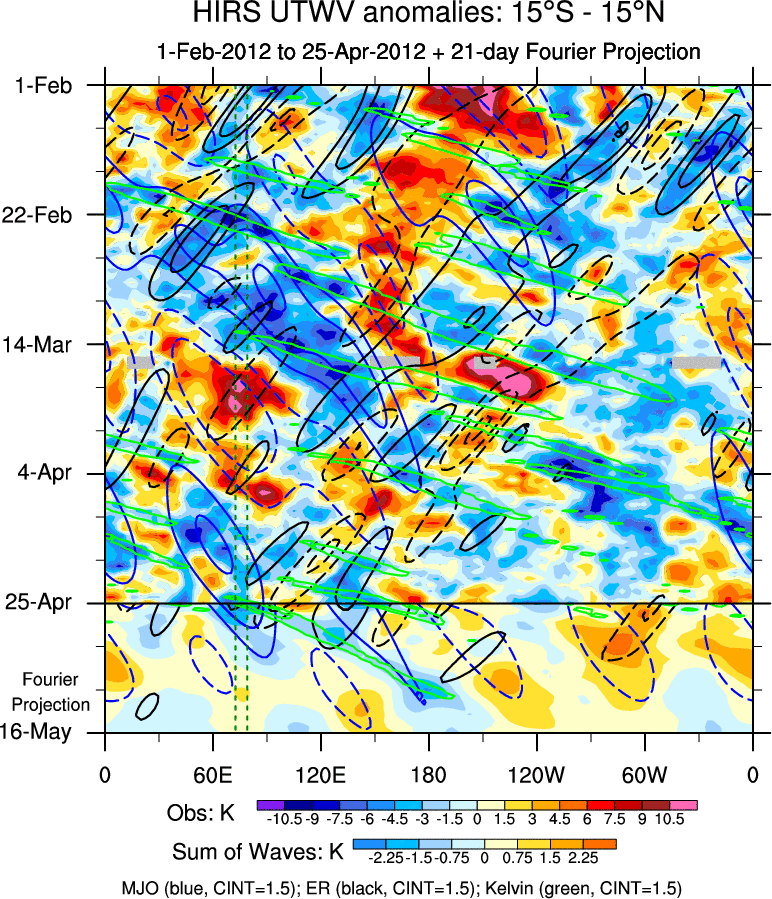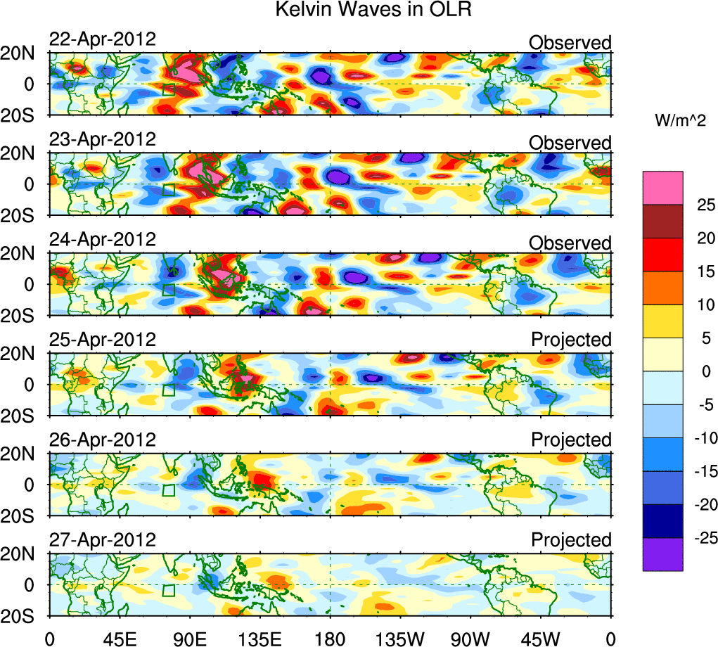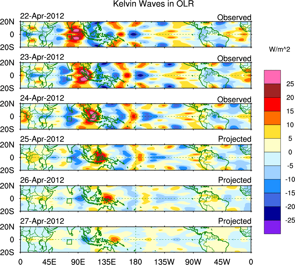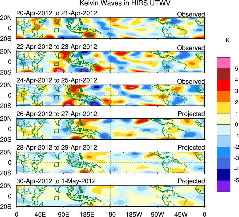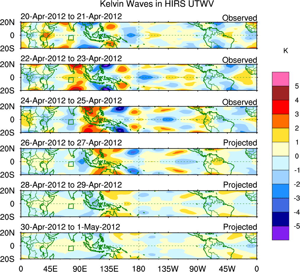 To identify tropical waves in near real-time, the OLR and UTWV data are filtered following Wheeler & Weickmann (2001 MWR). The daily anomalies are calculated using the first 3 harmonics of the seasonal cycle for 1979–2009. Missing values are then filled using linear interpolation in space and time. The most recent 365 days of anomalies are padded with 659 days of zeroes, and the result is filtered for each wave type.