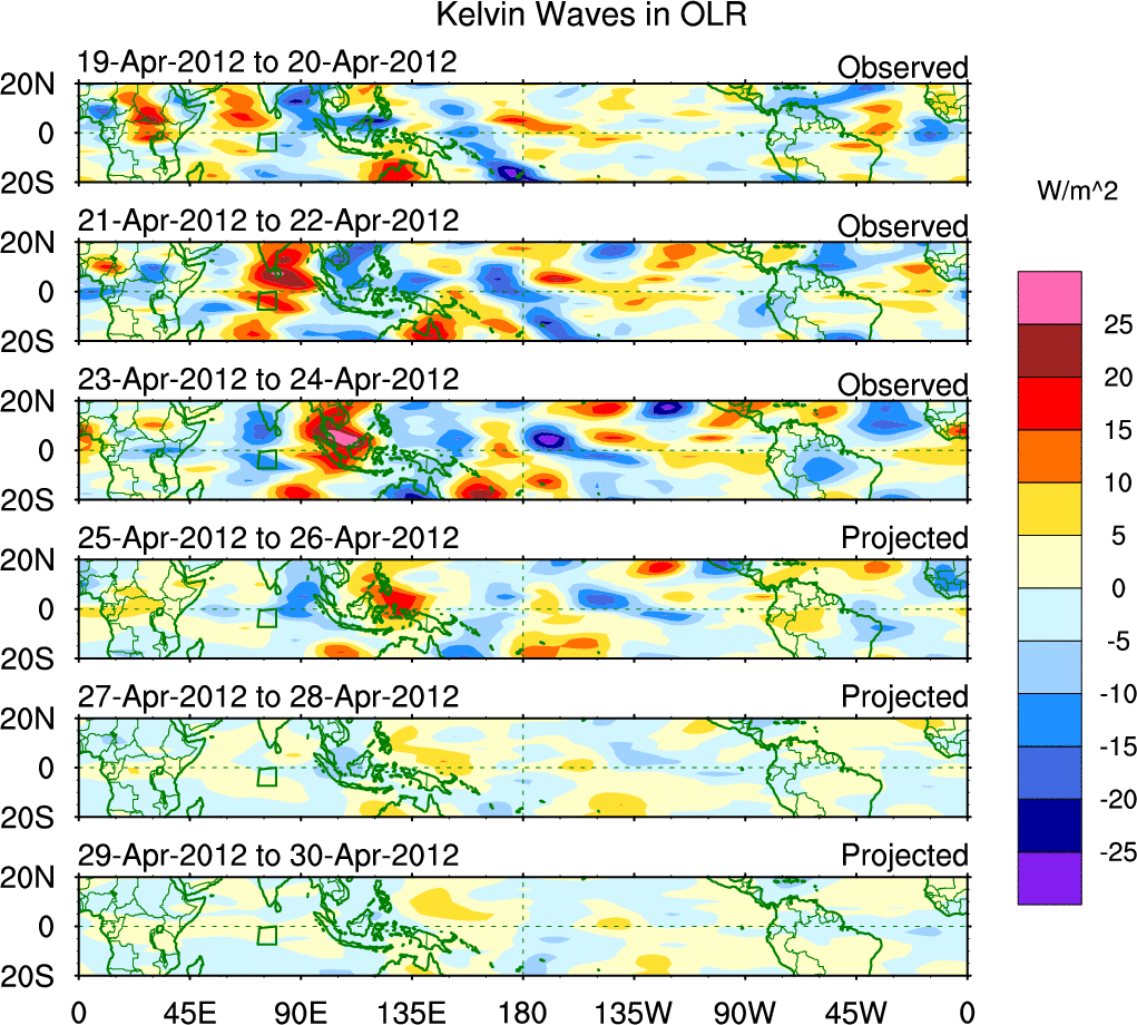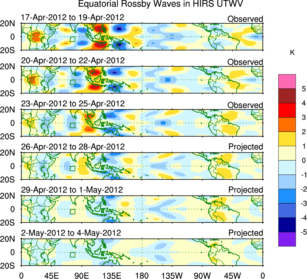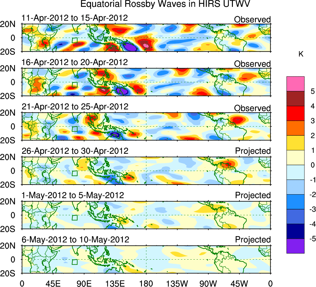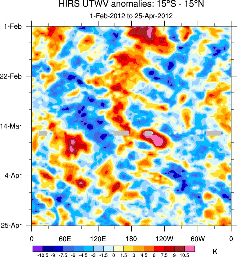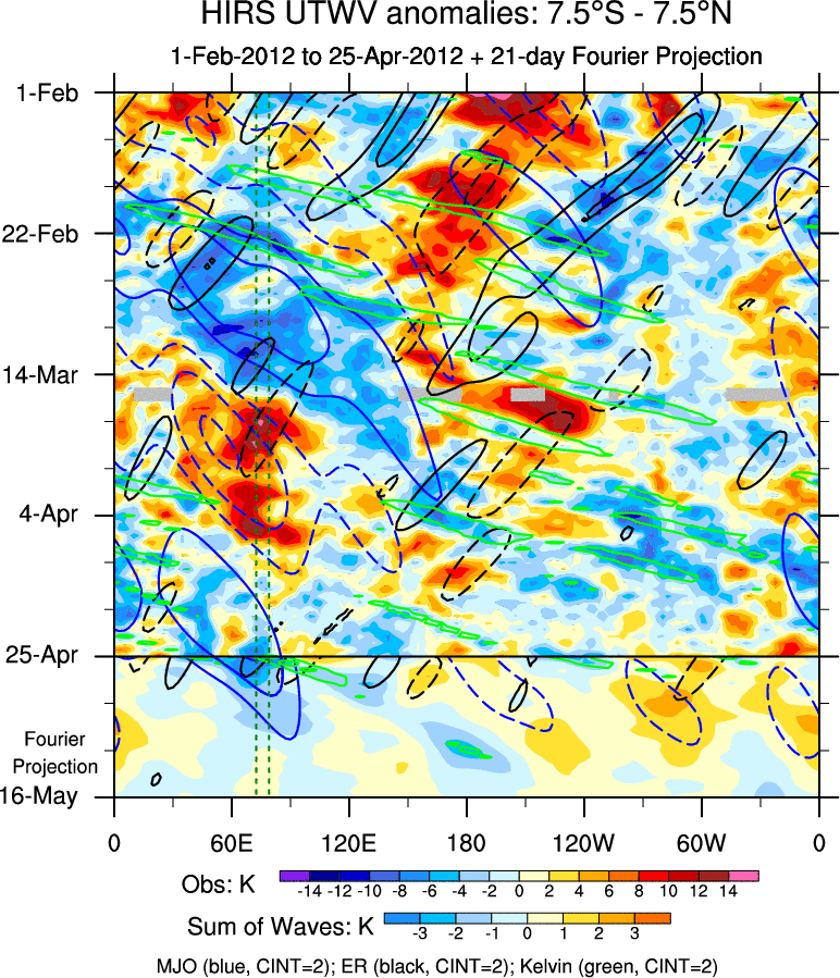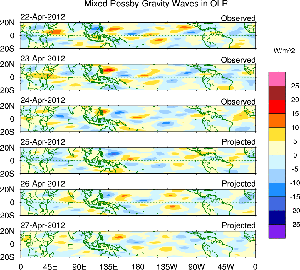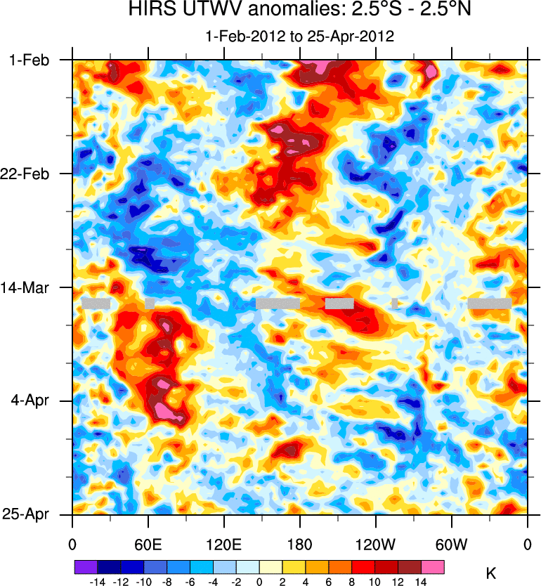 To identify tropical waves in near real-time, the OLR and UTWV data are filtered following Wheeler & Weickmann (2001 MWR). The daily anomalies are calculated using the first 3 harmonics of the seasonal cycle for 1979–2009. Missing values are then filled using linear interpolation in space and time. The most recent 365 days of anomalies are padded with 659 days of zeroes, and the result is filtered for each wave type.
