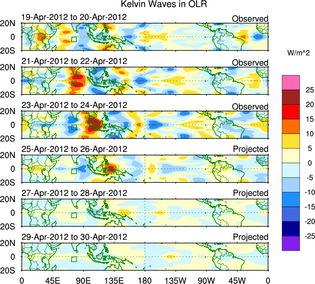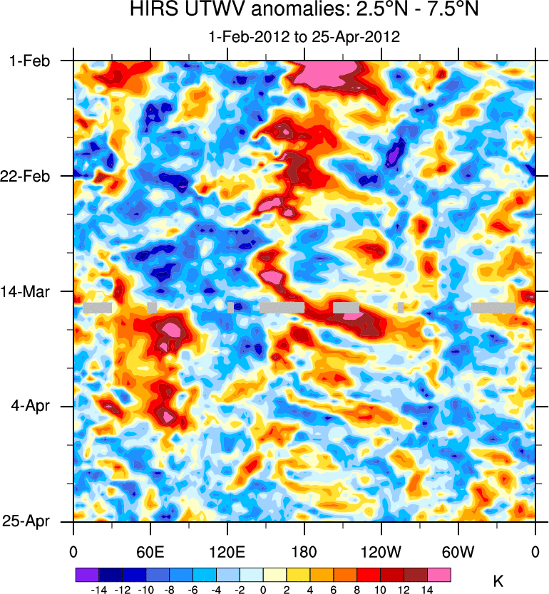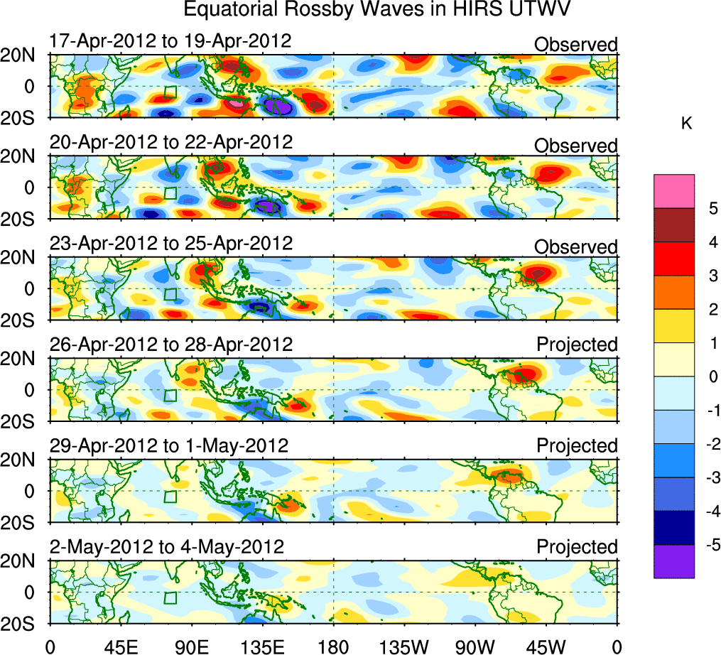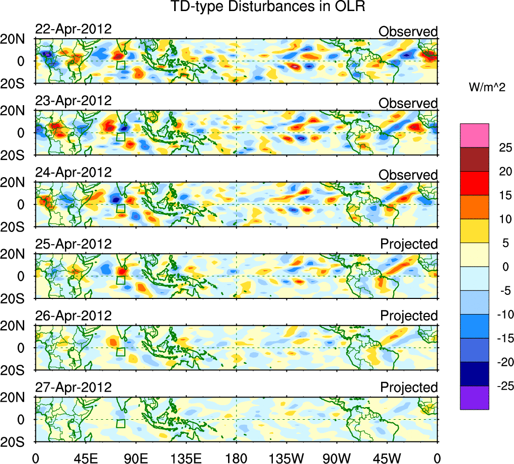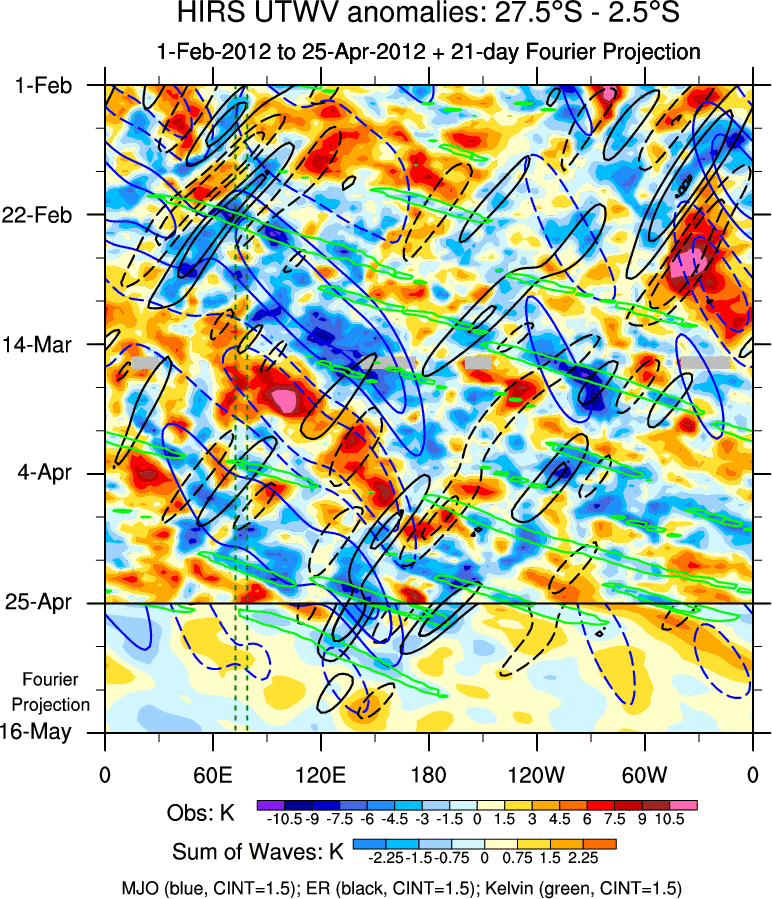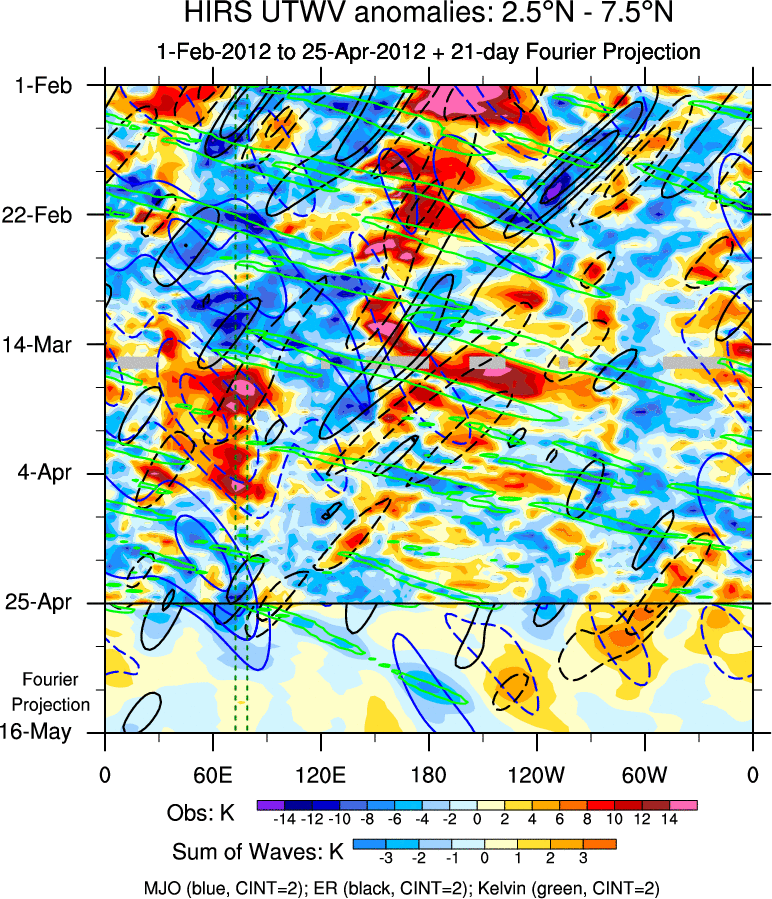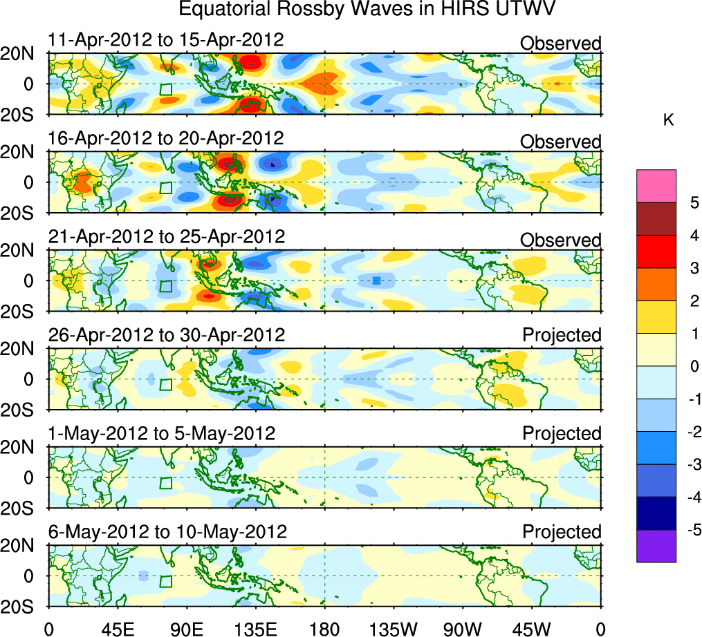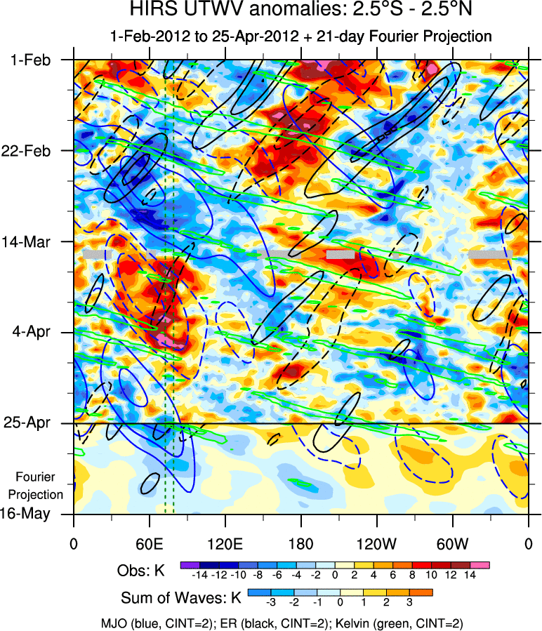 To identify tropical waves in near real-time, the OLR and UTWV data are filtered following Wheeler & Weickmann (2001 MWR). The daily anomalies are calculated using the first 3 harmonics of the seasonal cycle for 1979–2009. Missing values are then filled using linear interpolation in space and time. The most recent 365 days of anomalies are padded with 659 days of zeroes, and the result is filtered for each wave type.