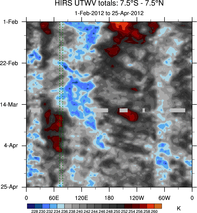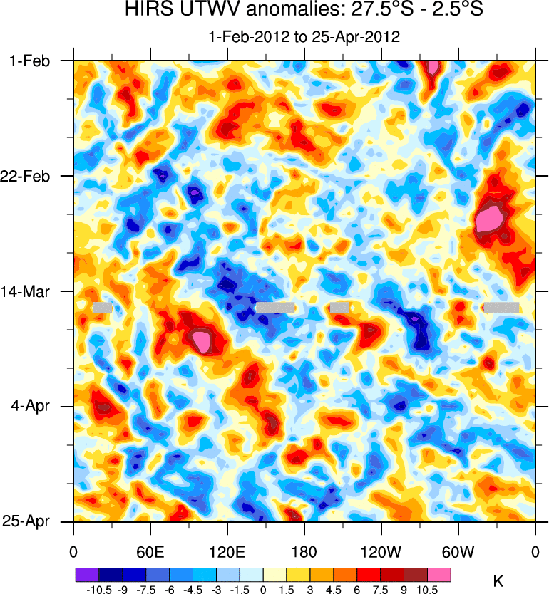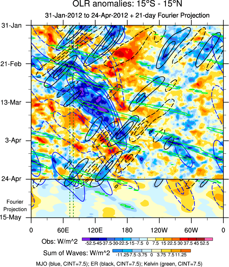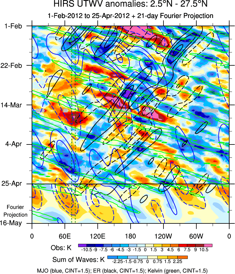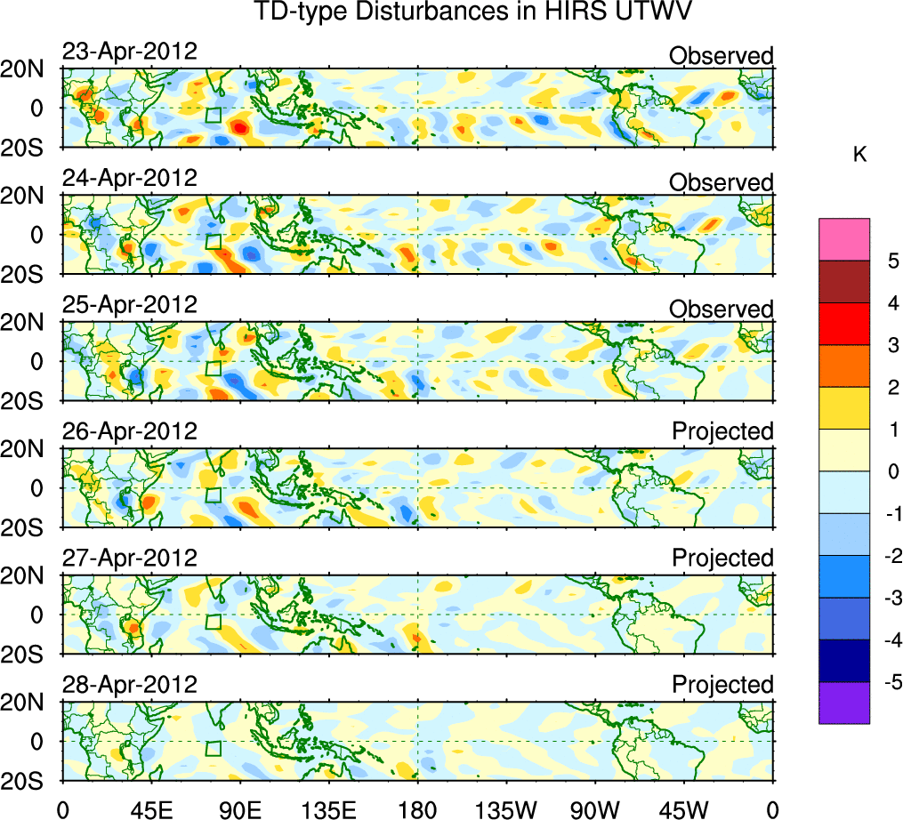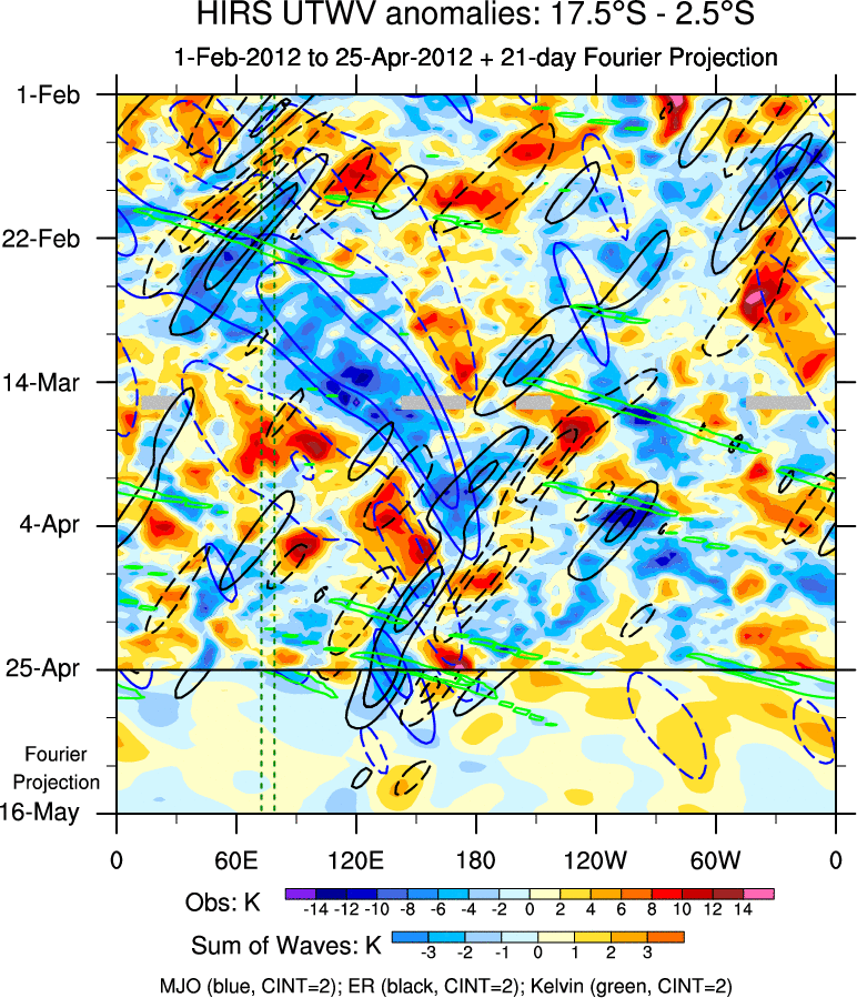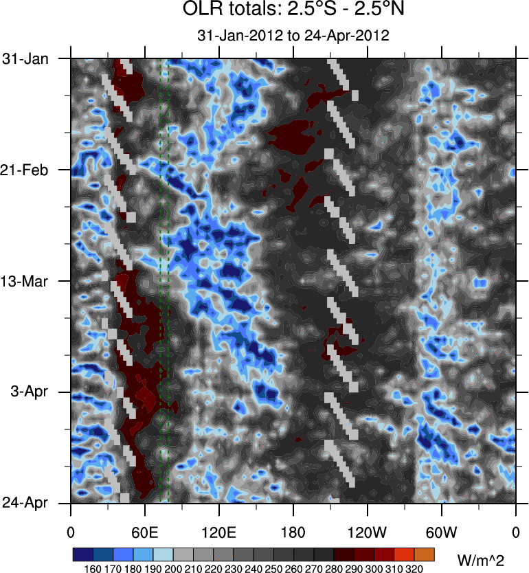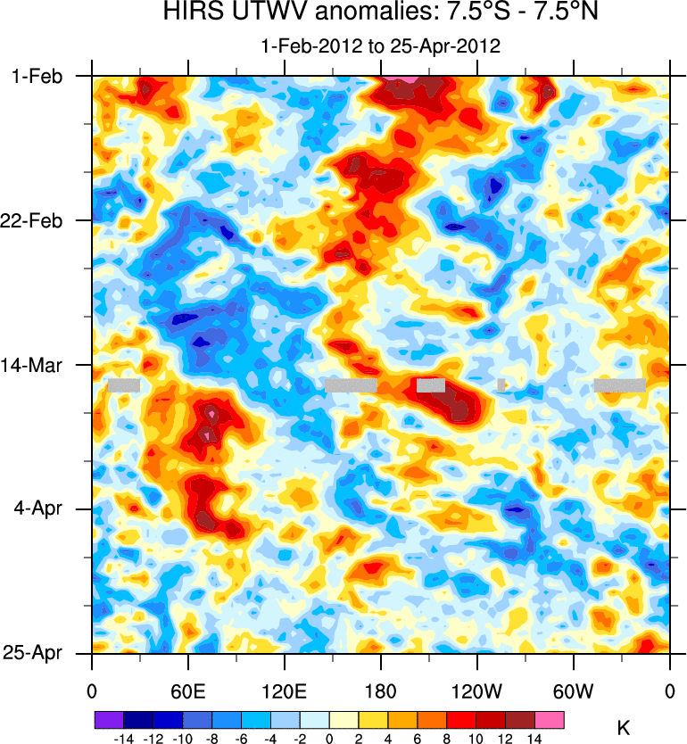 To identify tropical waves in near real-time, the OLR and UTWV data are filtered following Wheeler & Weickmann (2001 MWR). The daily anomalies are calculated using the first 3 harmonics of the seasonal cycle for 1979–2009. Missing values are then filled using linear interpolation in space and time. The most recent 365 days of anomalies are padded with 659 days of zeroes, and the result is filtered for each wave type.