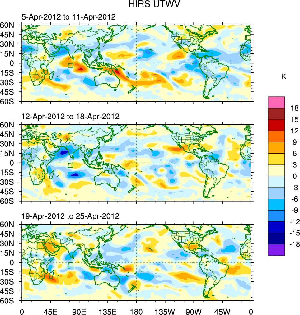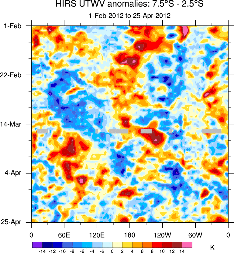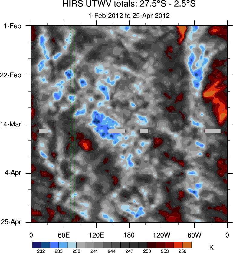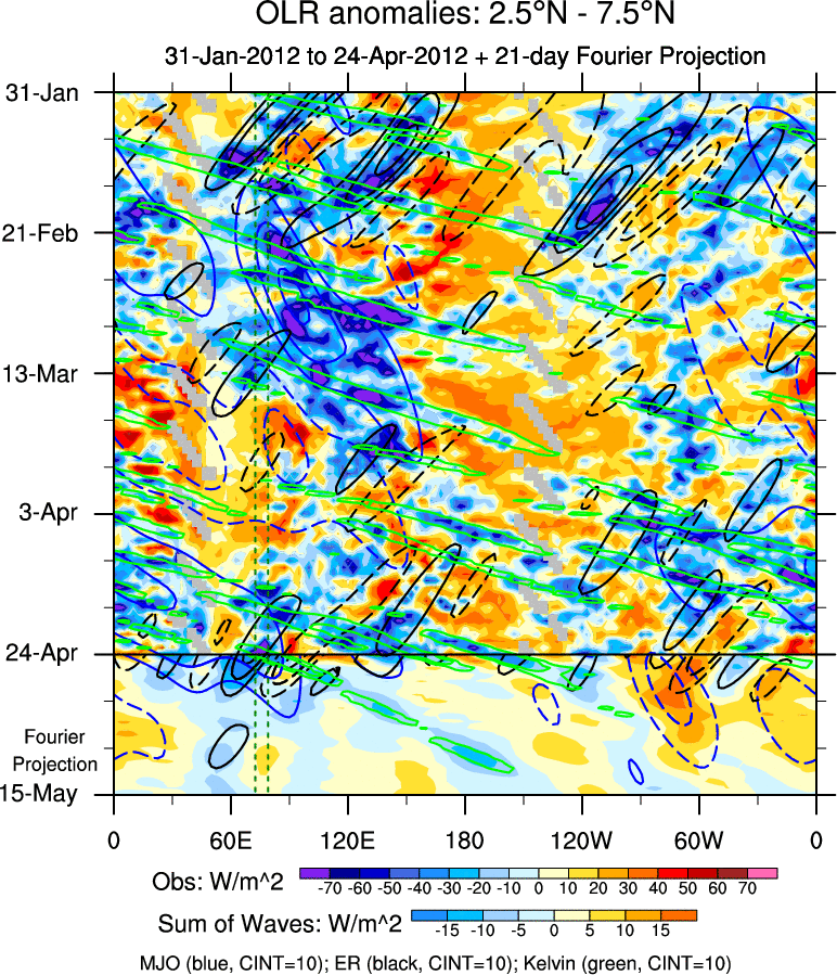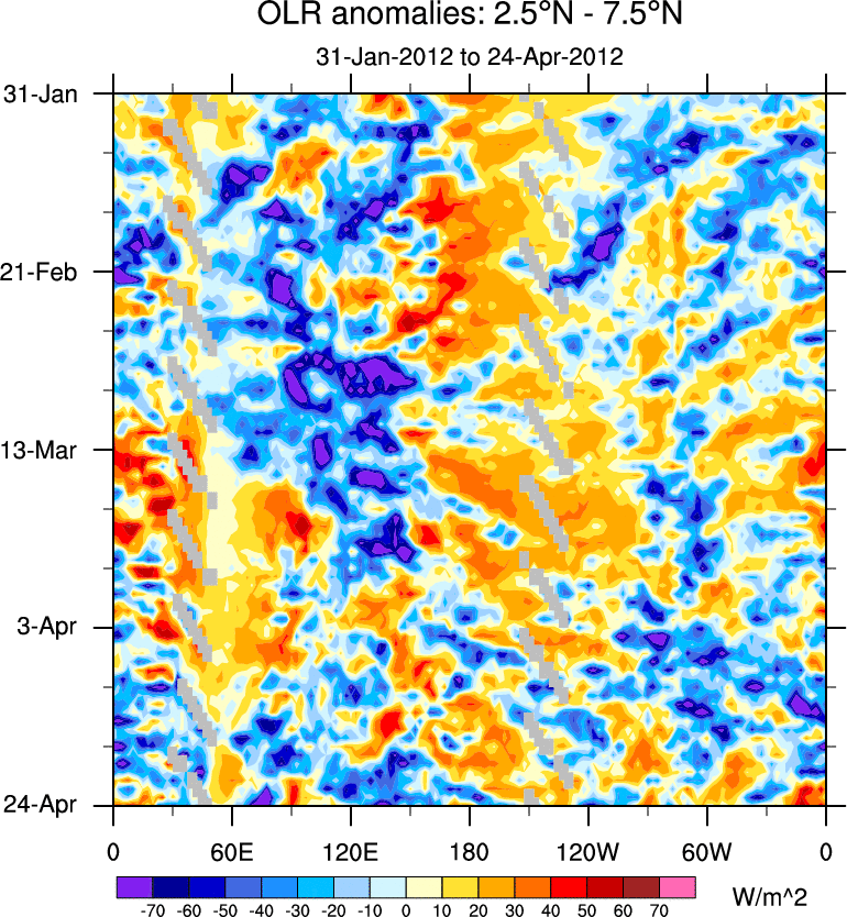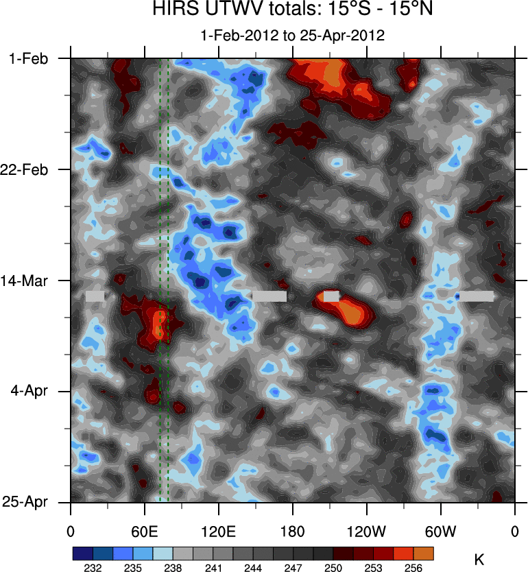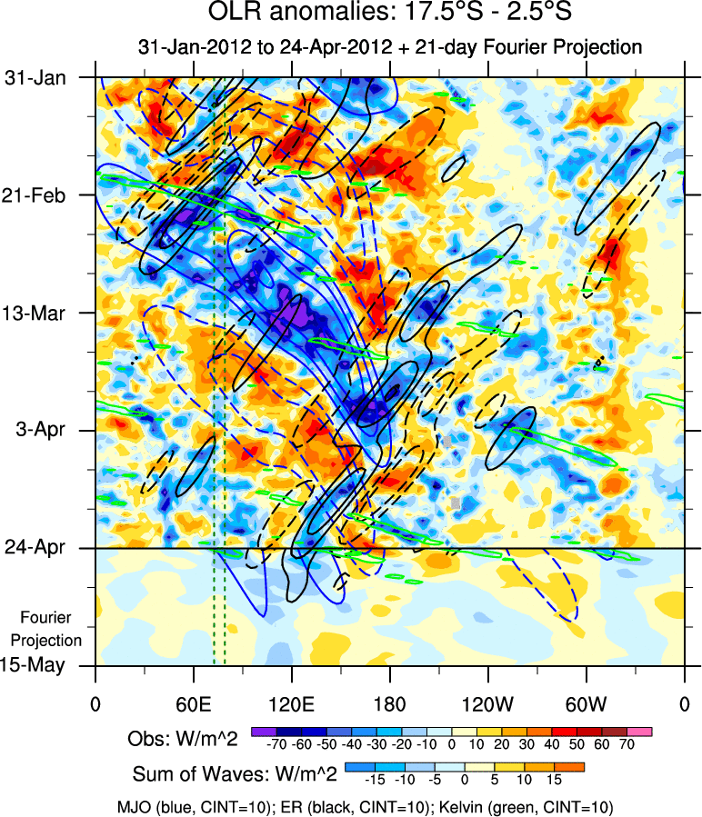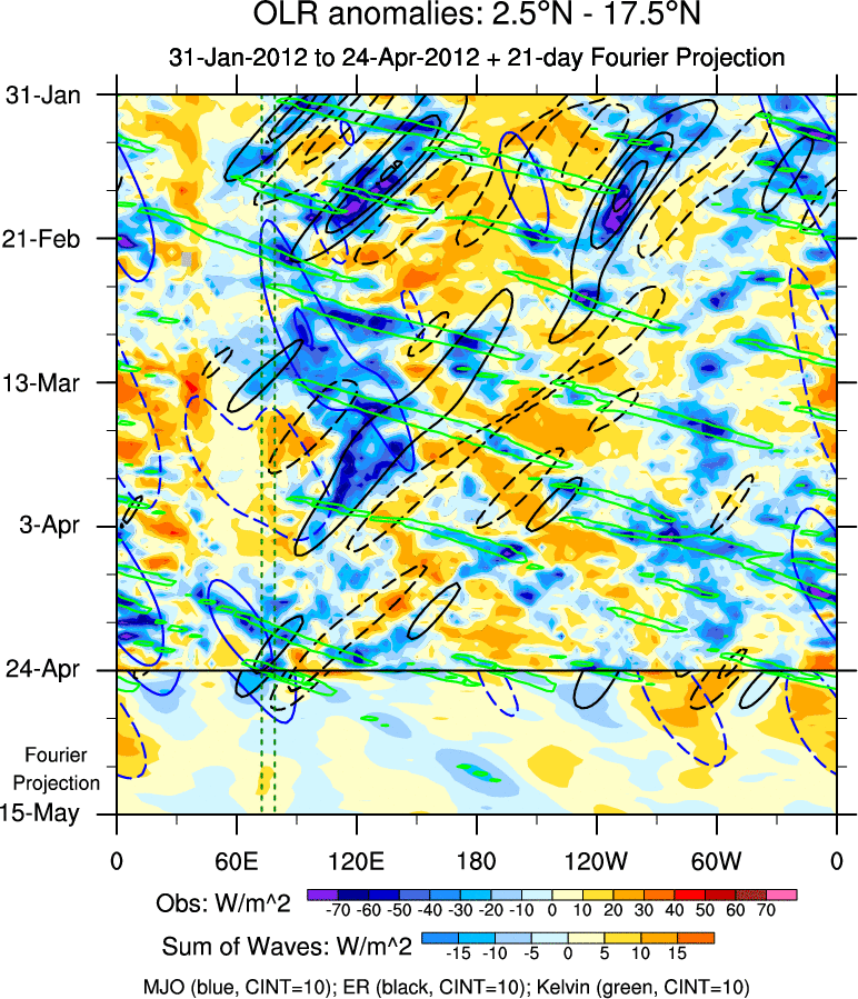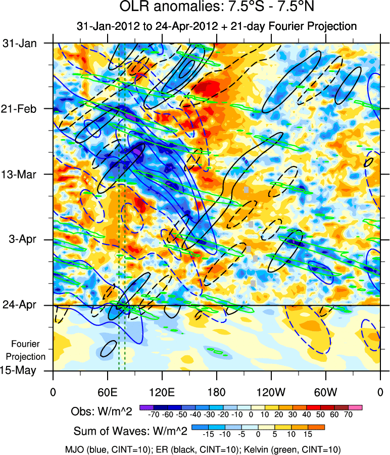 To identify tropical waves in near real-time, the OLR and UTWV data are filtered following Wheeler & Weickmann (2001 MWR). The daily anomalies are calculated using the first 3 harmonics of the seasonal cycle for 1979–2009. Missing values are then filled using linear interpolation in space and time. The most recent 365 days of anomalies are padded with 659 days of zeroes, and the result is filtered for each wave type.