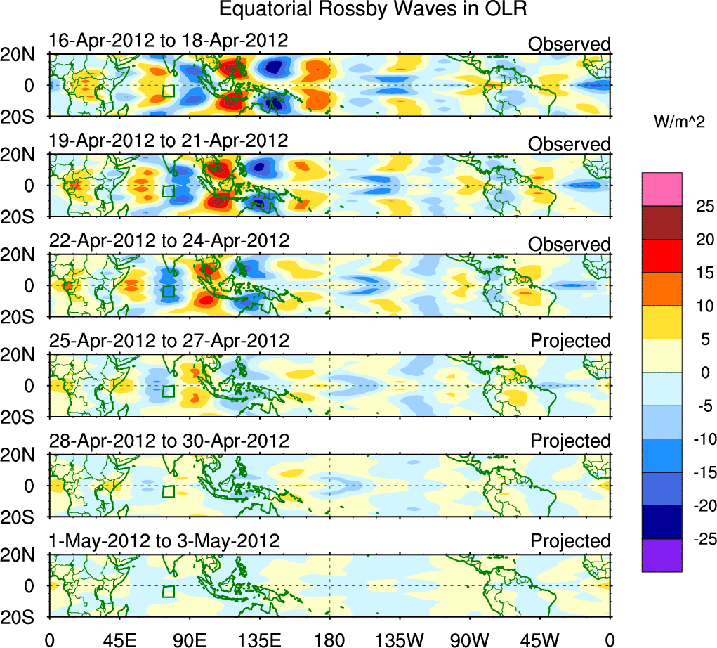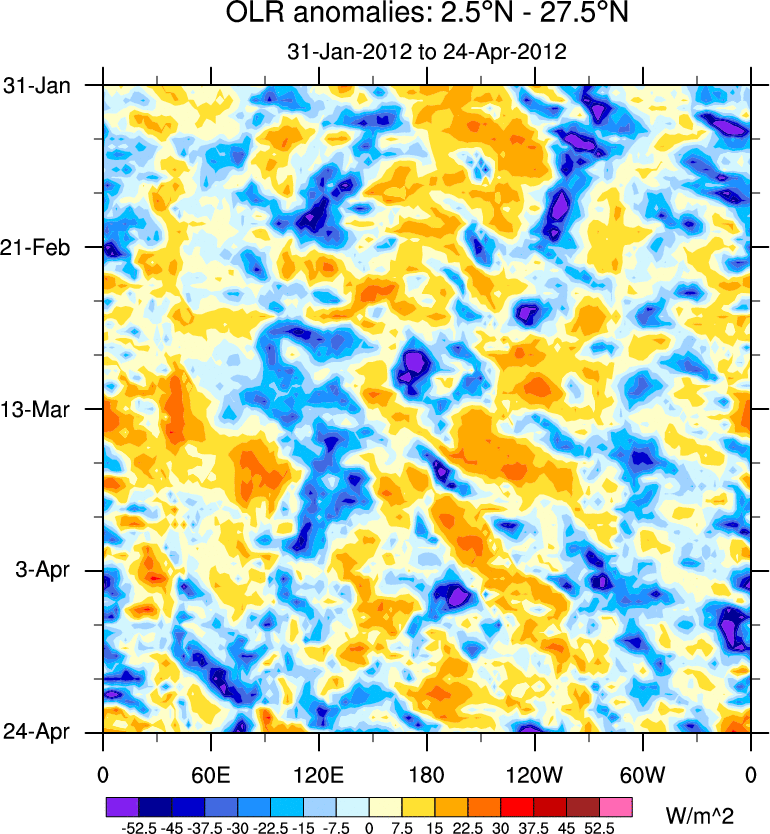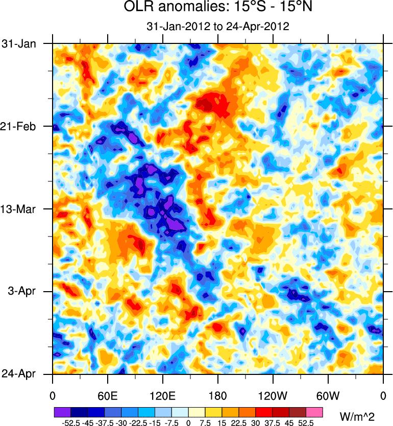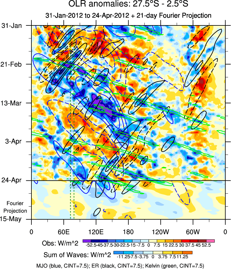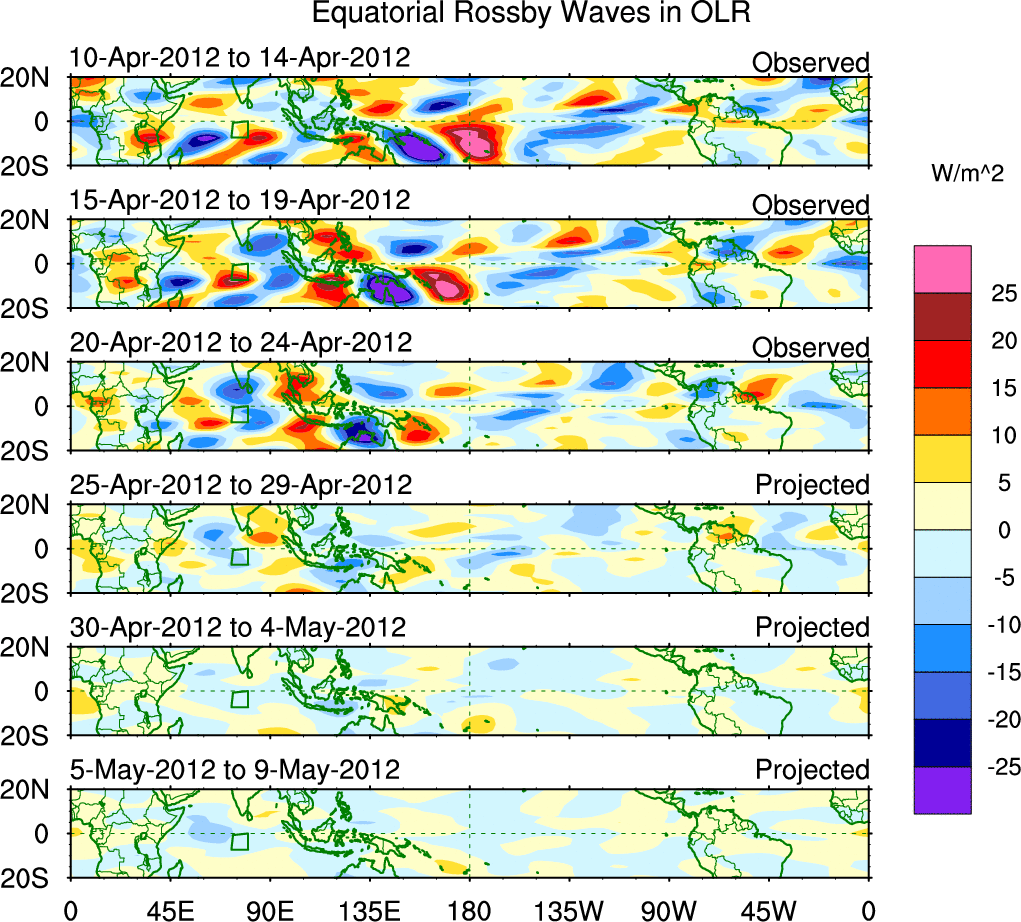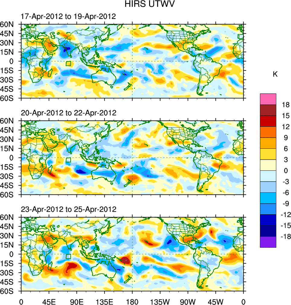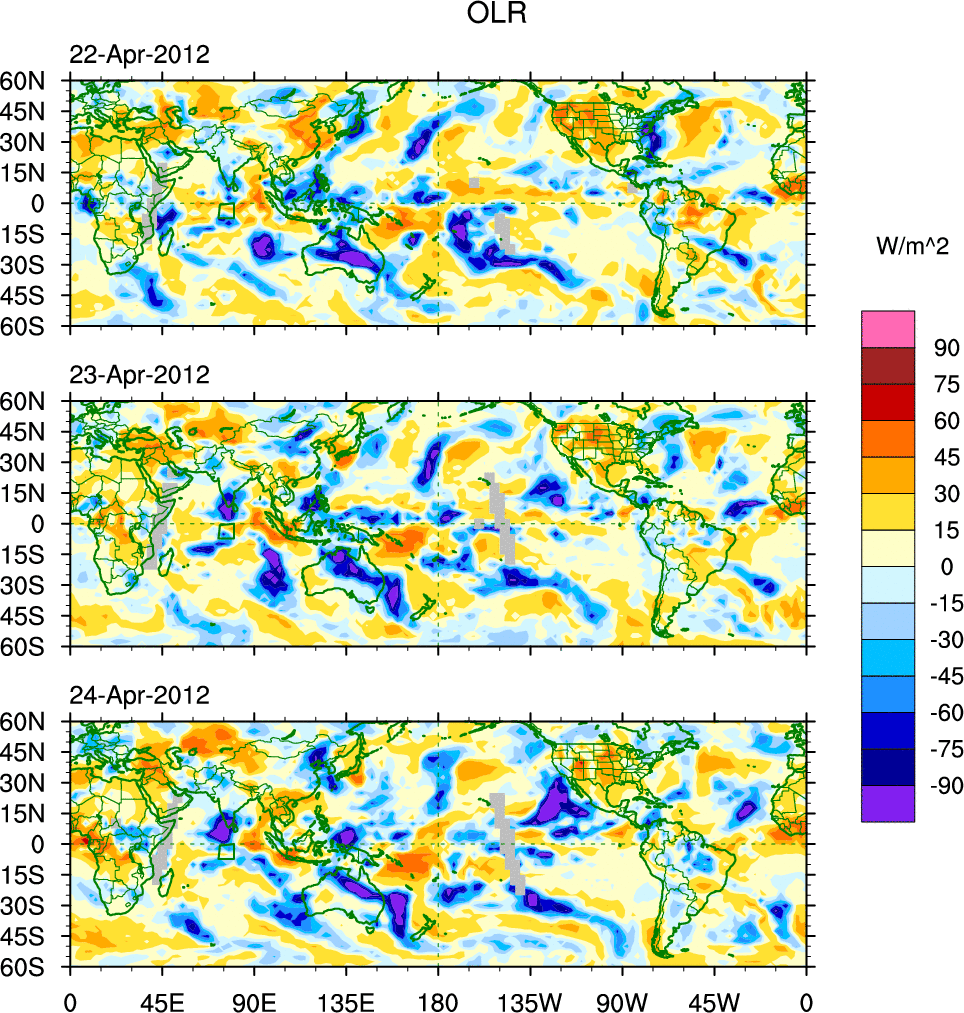 To identify tropical waves in near real-time, the OLR and UTWV data are filtered following Wheeler & Weickmann (2001 MWR). The daily anomalies are calculated using the first 3 harmonics of the seasonal cycle for 1979–2009. Missing values are then filled using linear interpolation in space and time. The most recent 365 days of anomalies are padded with 659 days of zeroes, and the result is filtered for each wave type.