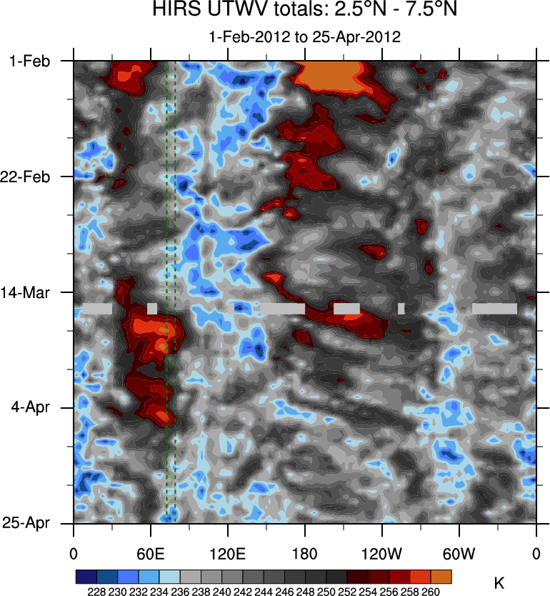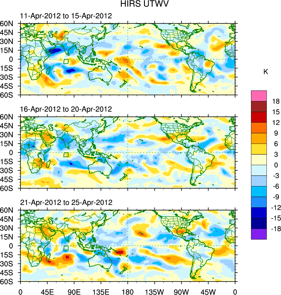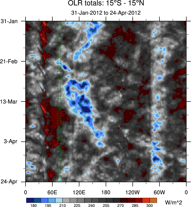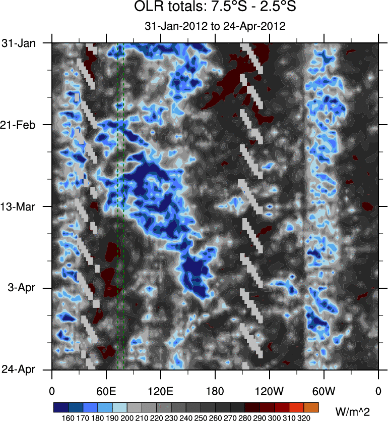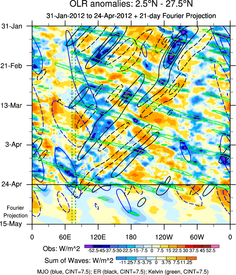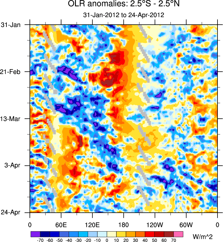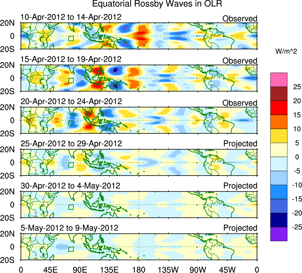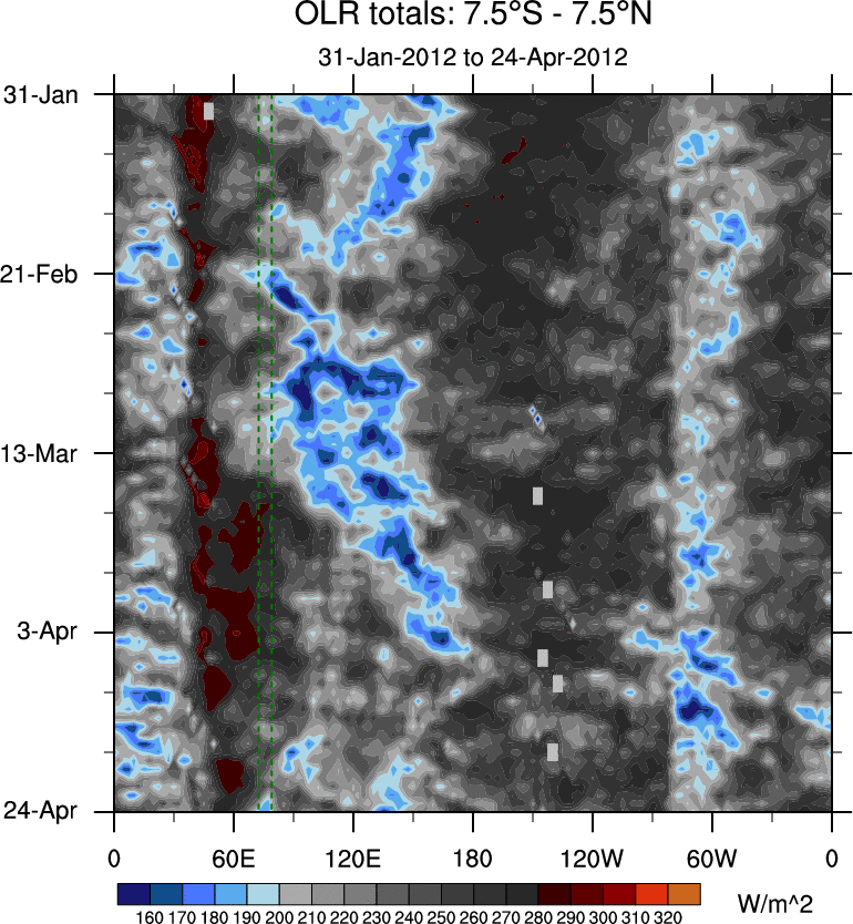 To identify tropical waves in near real-time, the OLR and UTWV data are filtered following Wheeler & Weickmann (2001 MWR). The daily anomalies are calculated using the first 3 harmonics of the seasonal cycle for 1979–2009. Missing values are then filled using linear interpolation in space and time. The most recent 365 days of anomalies are padded with 659 days of zeroes, and the result is filtered for each wave type.