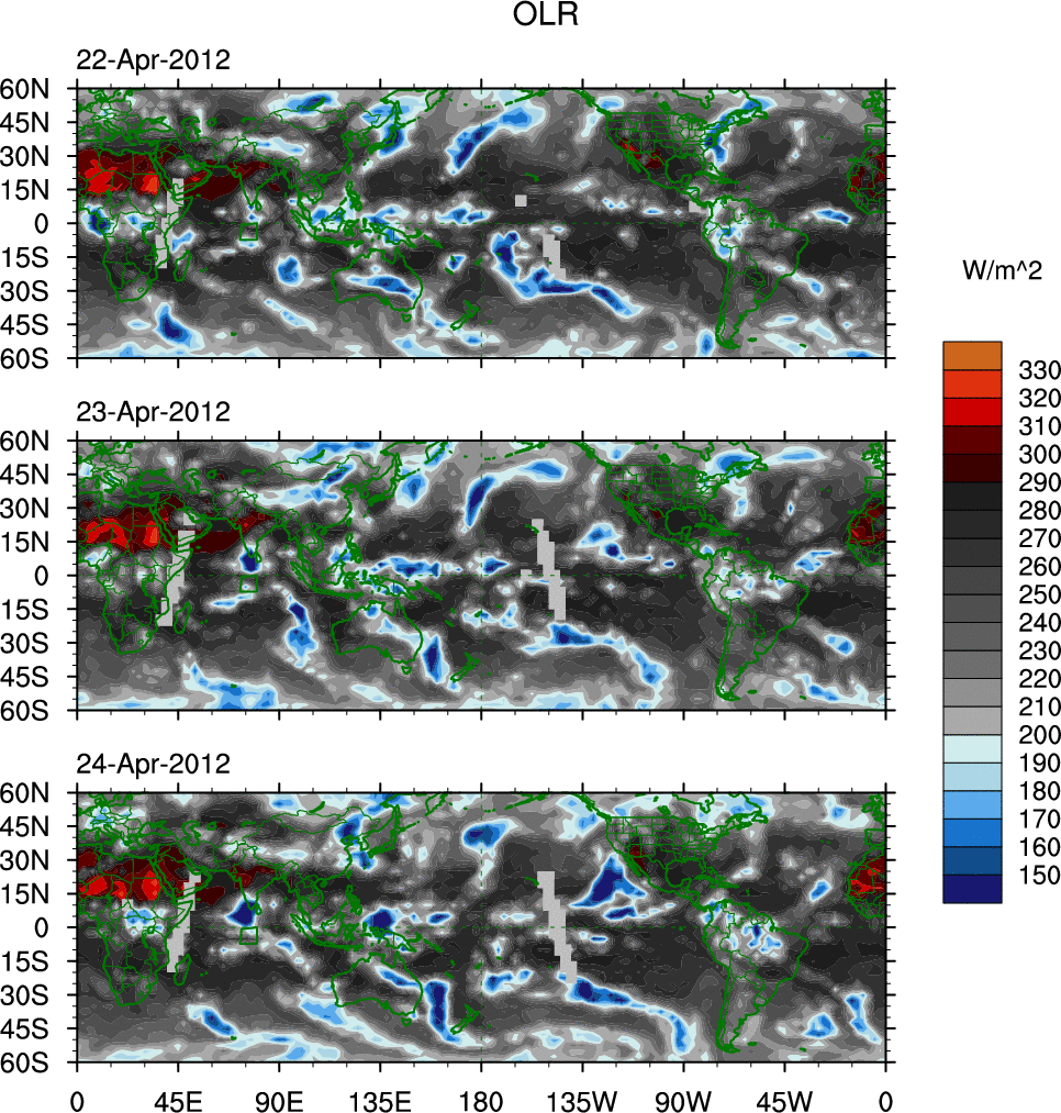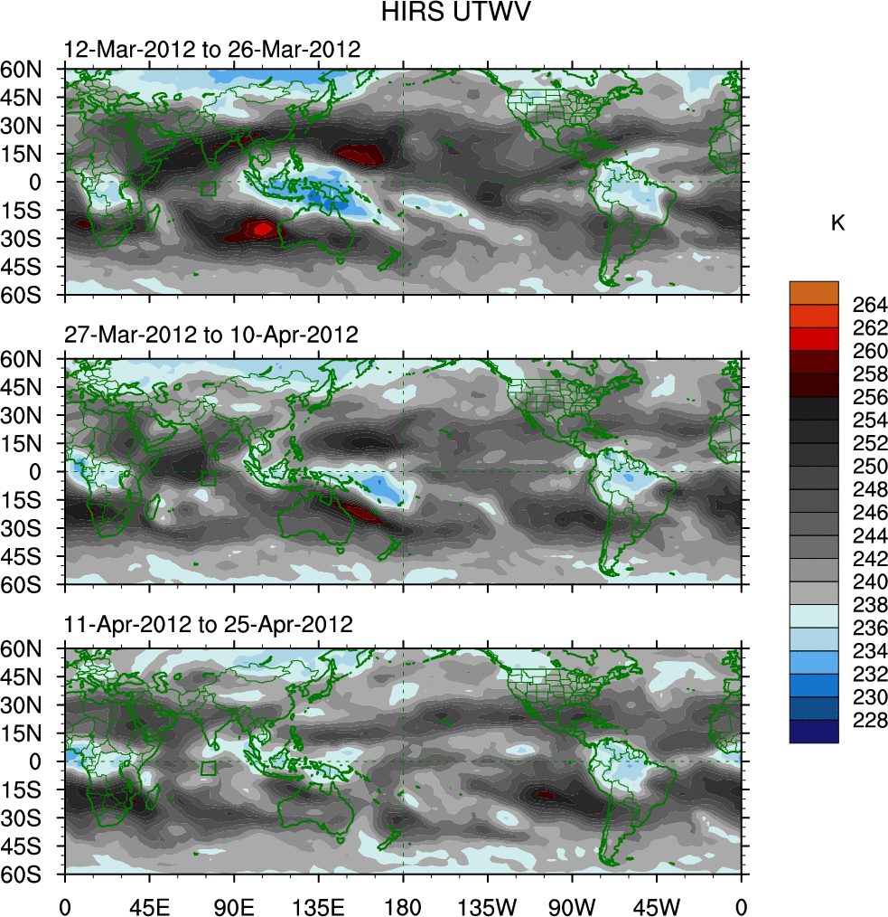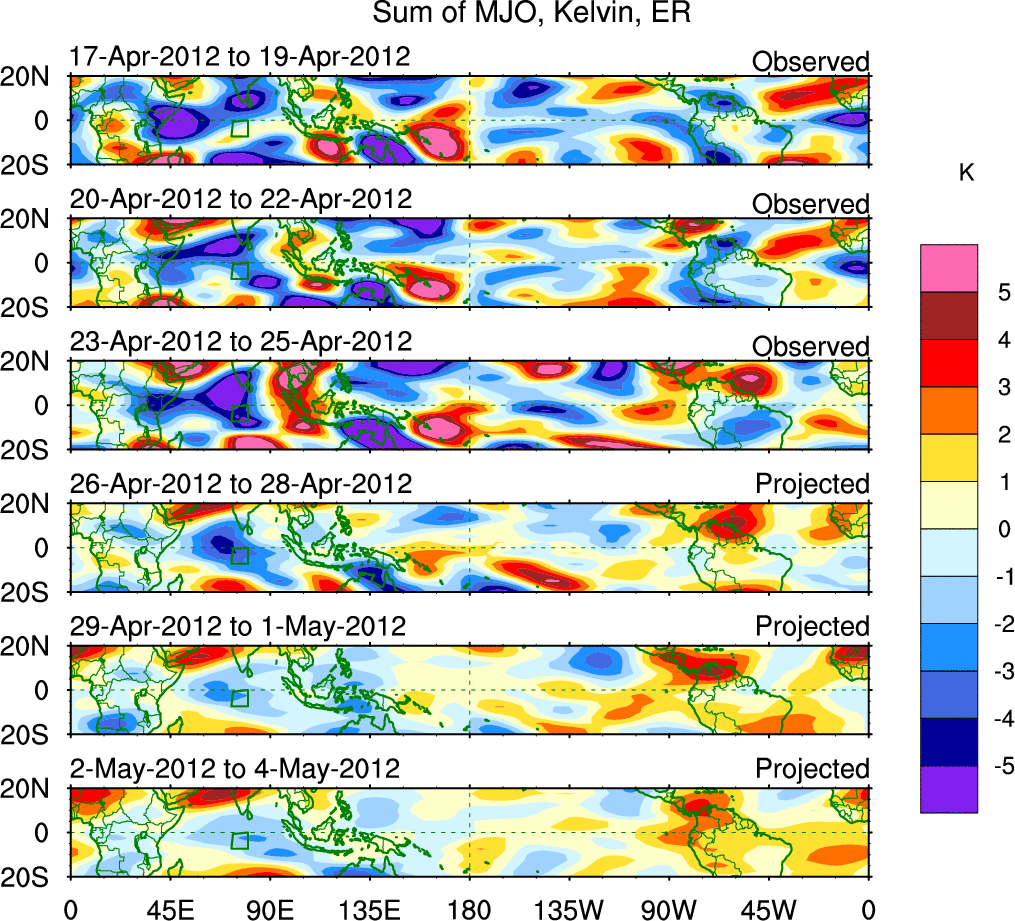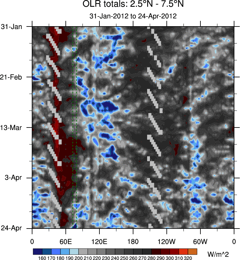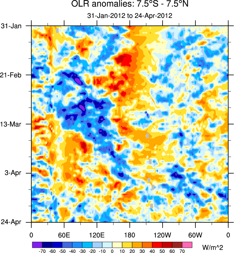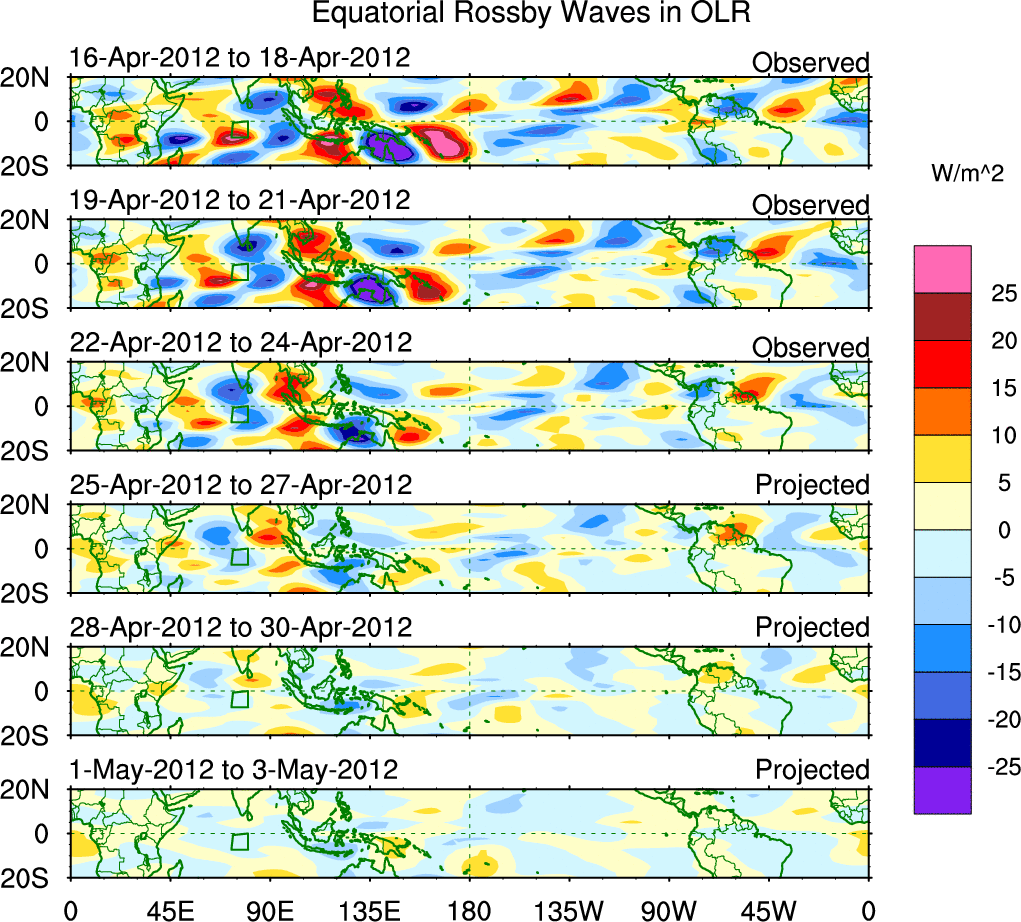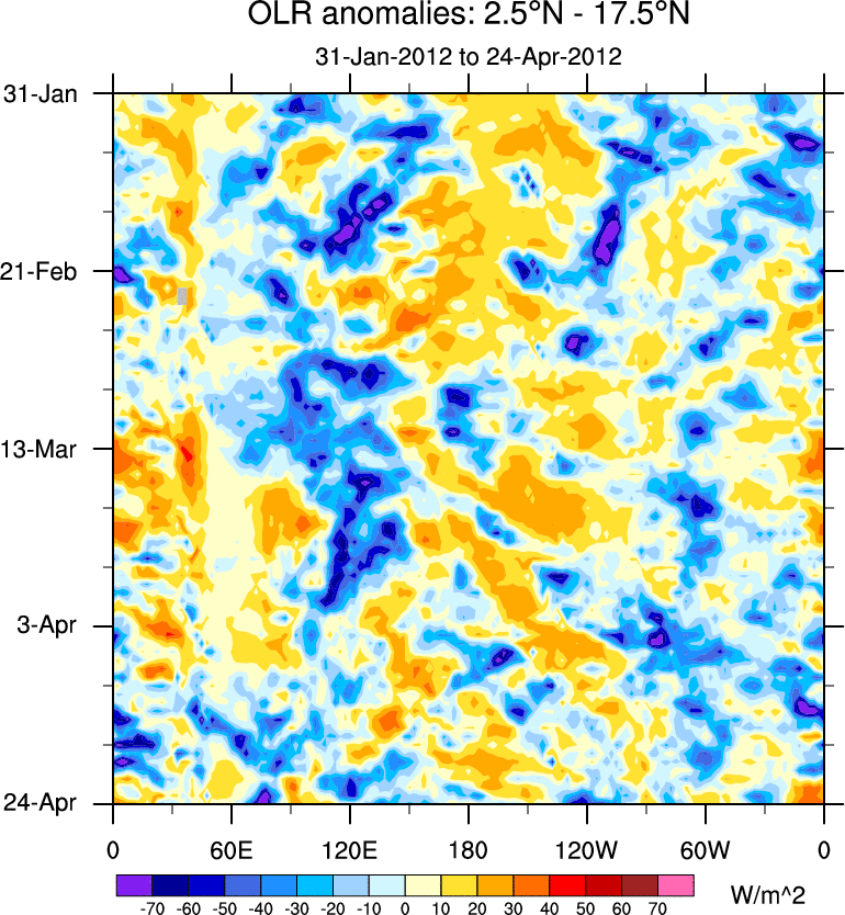 To identify tropical waves in near real-time, the OLR and UTWV data are filtered following Wheeler & Weickmann (2001 MWR). The daily anomalies are calculated using the first 3 harmonics of the seasonal cycle for 1979–2009. Missing values are then filled using linear interpolation in space and time. The most recent 365 days of anomalies are padded with 659 days of zeroes, and the result is filtered for each wave type.