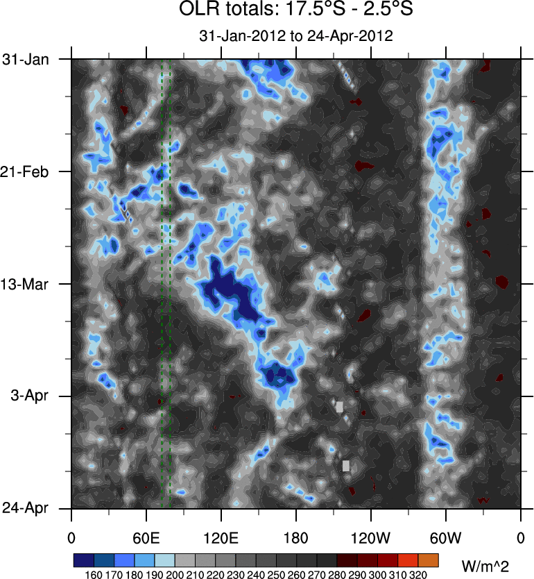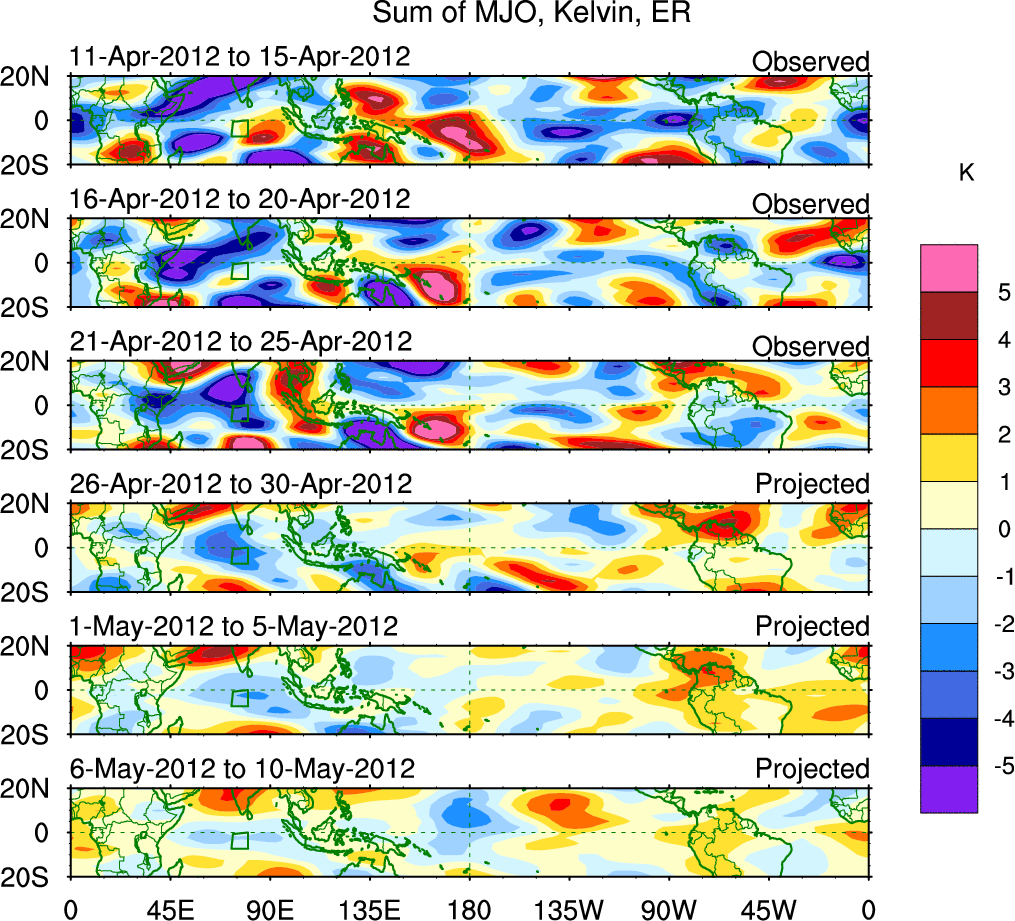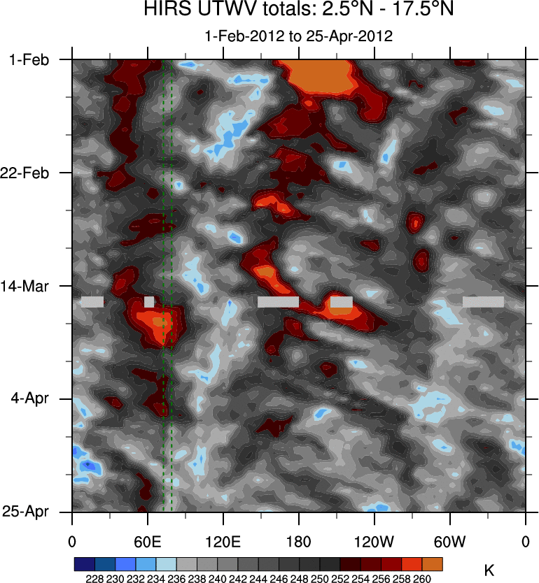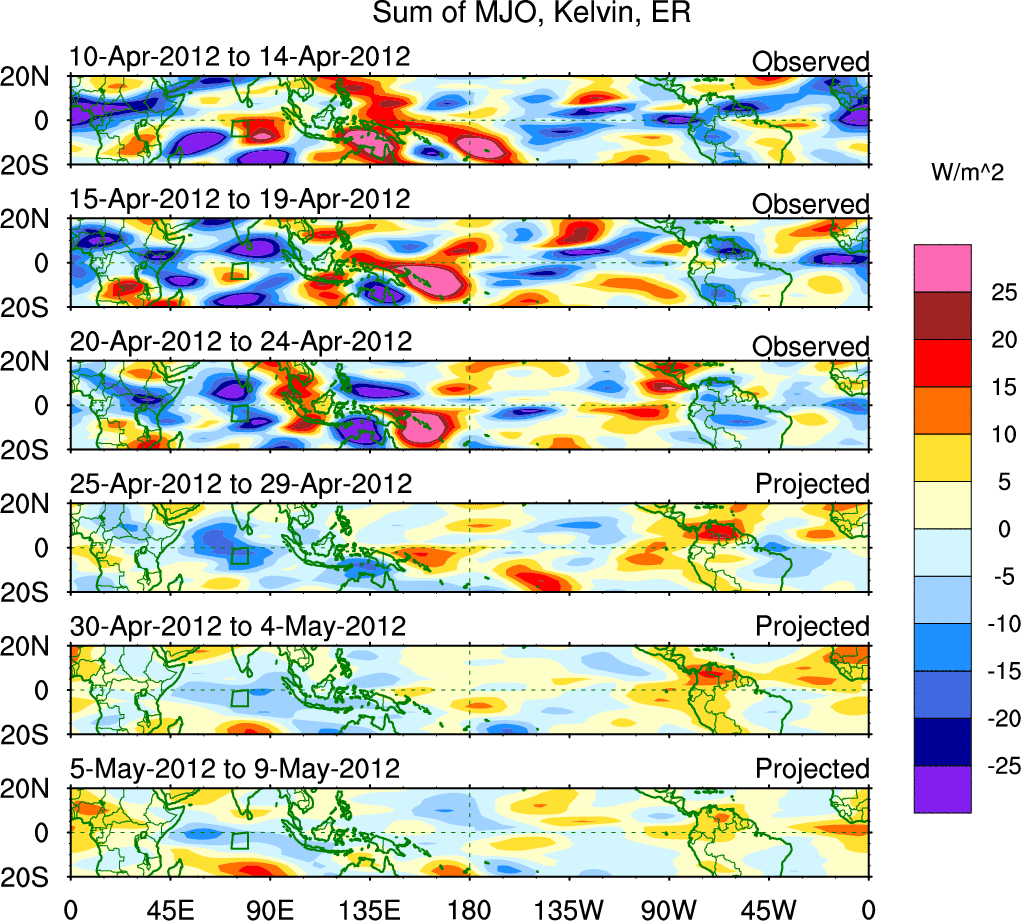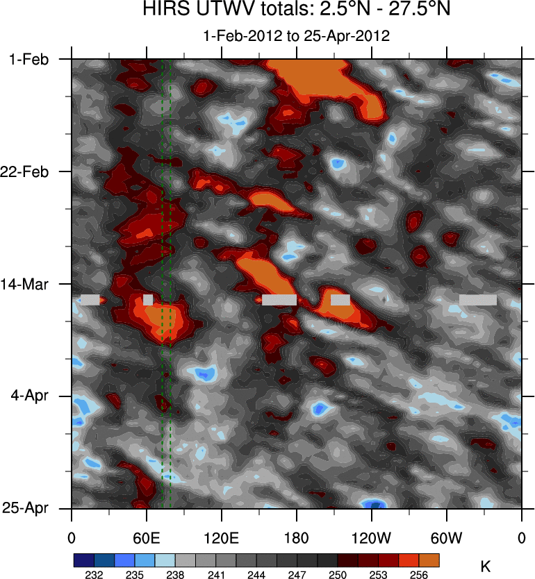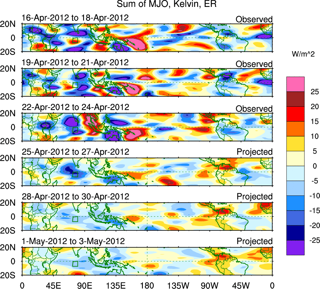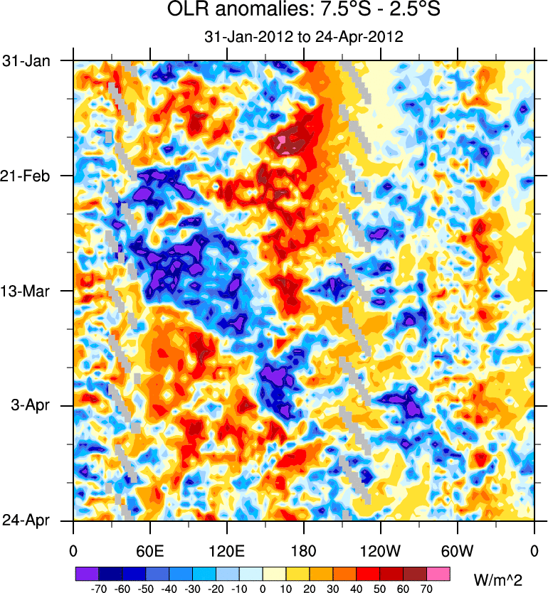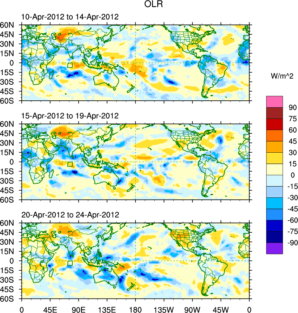 To identify tropical waves in near real-time, the OLR and UTWV data are filtered following Wheeler & Weickmann (2001 MWR). The daily anomalies are calculated using the first 3 harmonics of the seasonal cycle for 1979–2009. Missing values are then filled using linear interpolation in space and time. The most recent 365 days of anomalies are padded with 659 days of zeroes, and the result is filtered for each wave type.