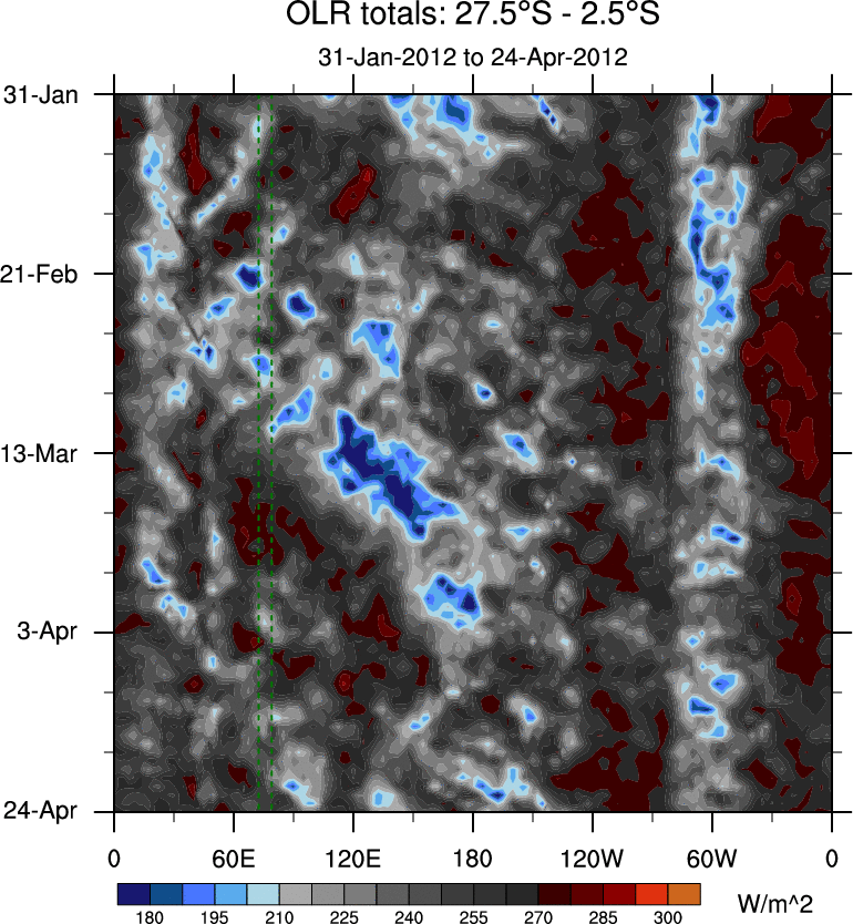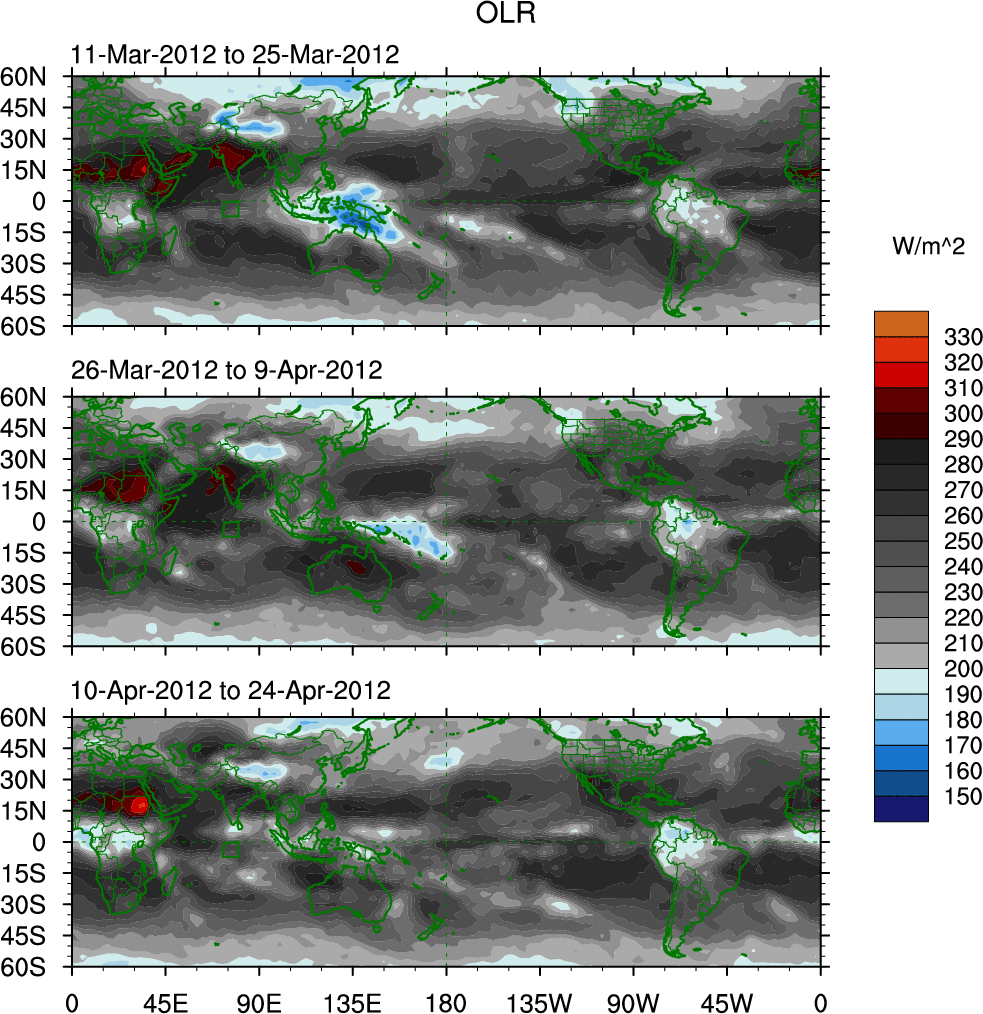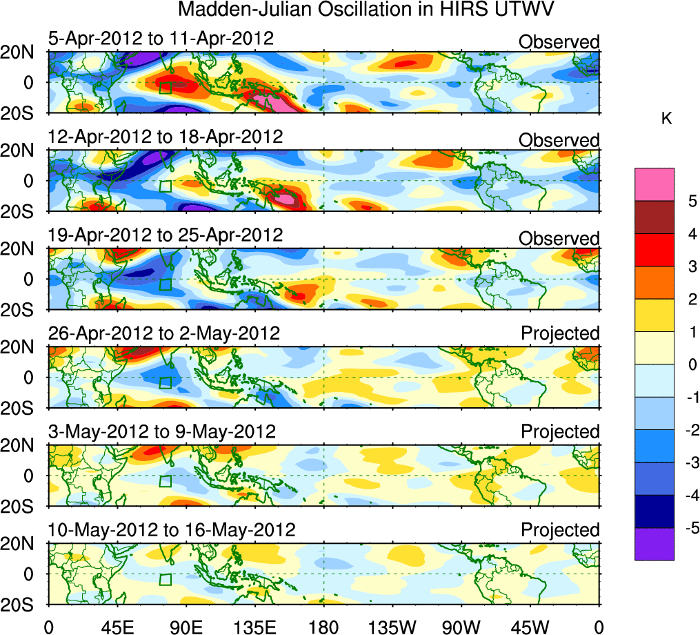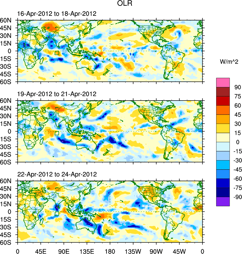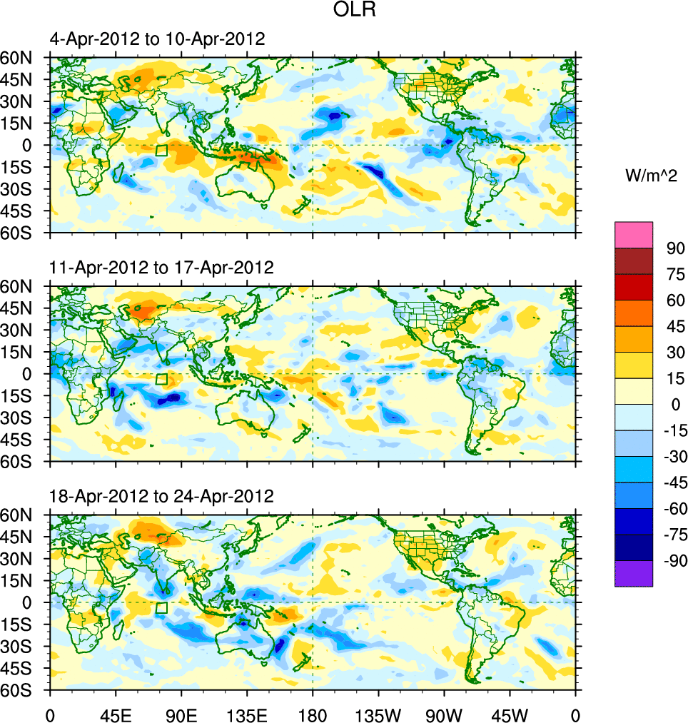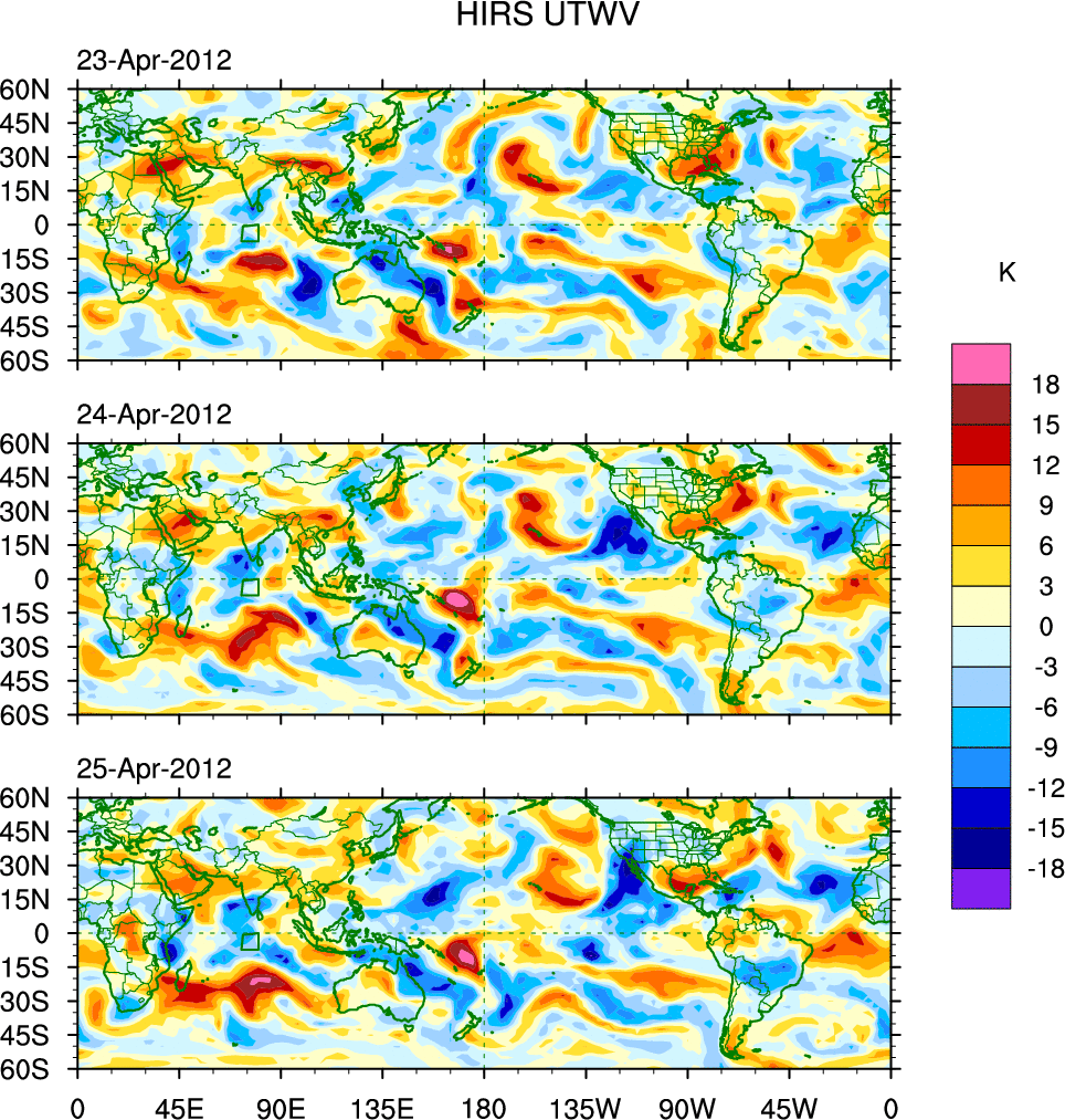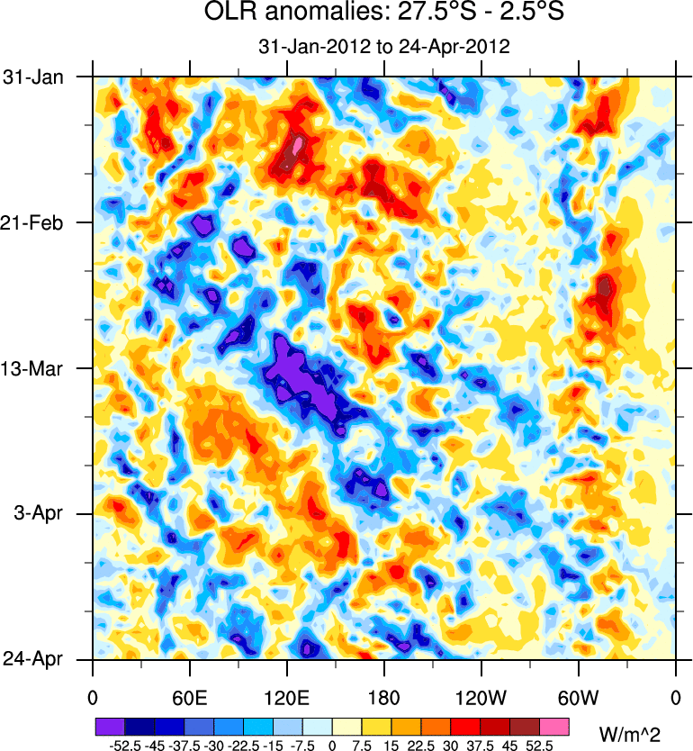 To identify tropical waves in near real-time, the OLR and UTWV data are filtered following Wheeler & Weickmann (2001 MWR). The daily anomalies are calculated using the first 3 harmonics of the seasonal cycle for 1979–2009. Missing values are then filled using linear interpolation in space and time. The most recent 365 days of anomalies are padded with 659 days of zeroes, and the result is filtered for each wave type.