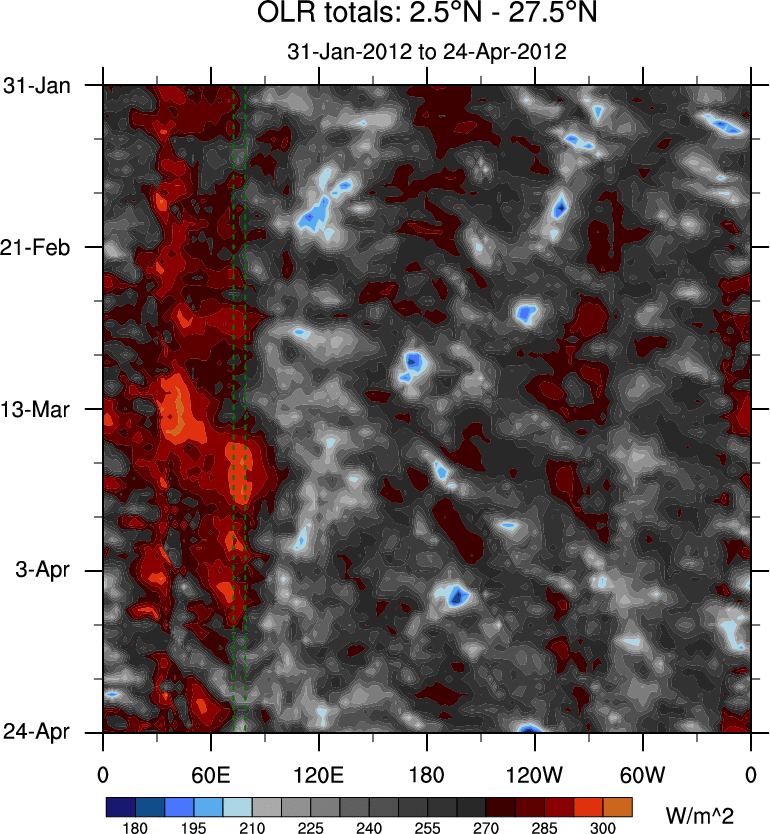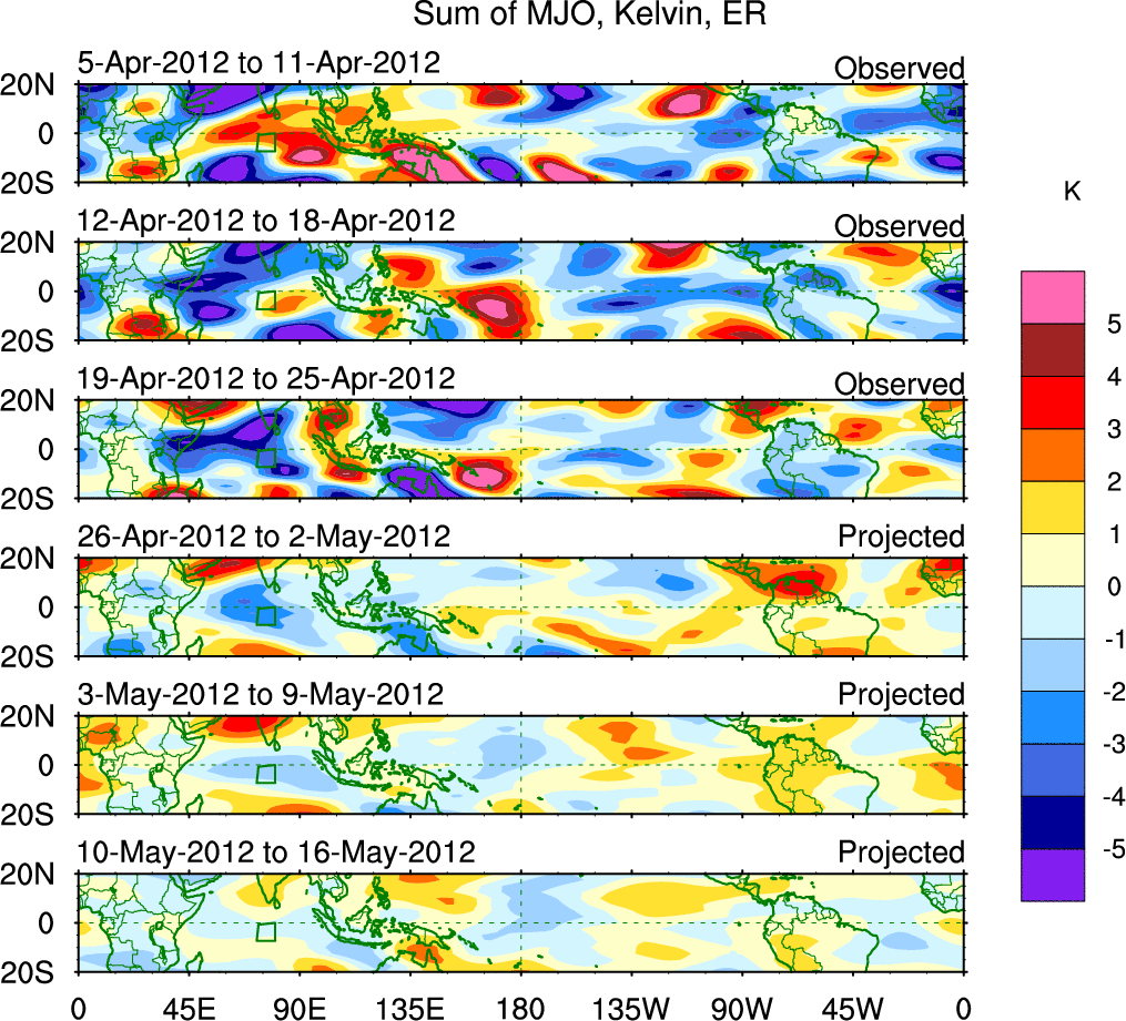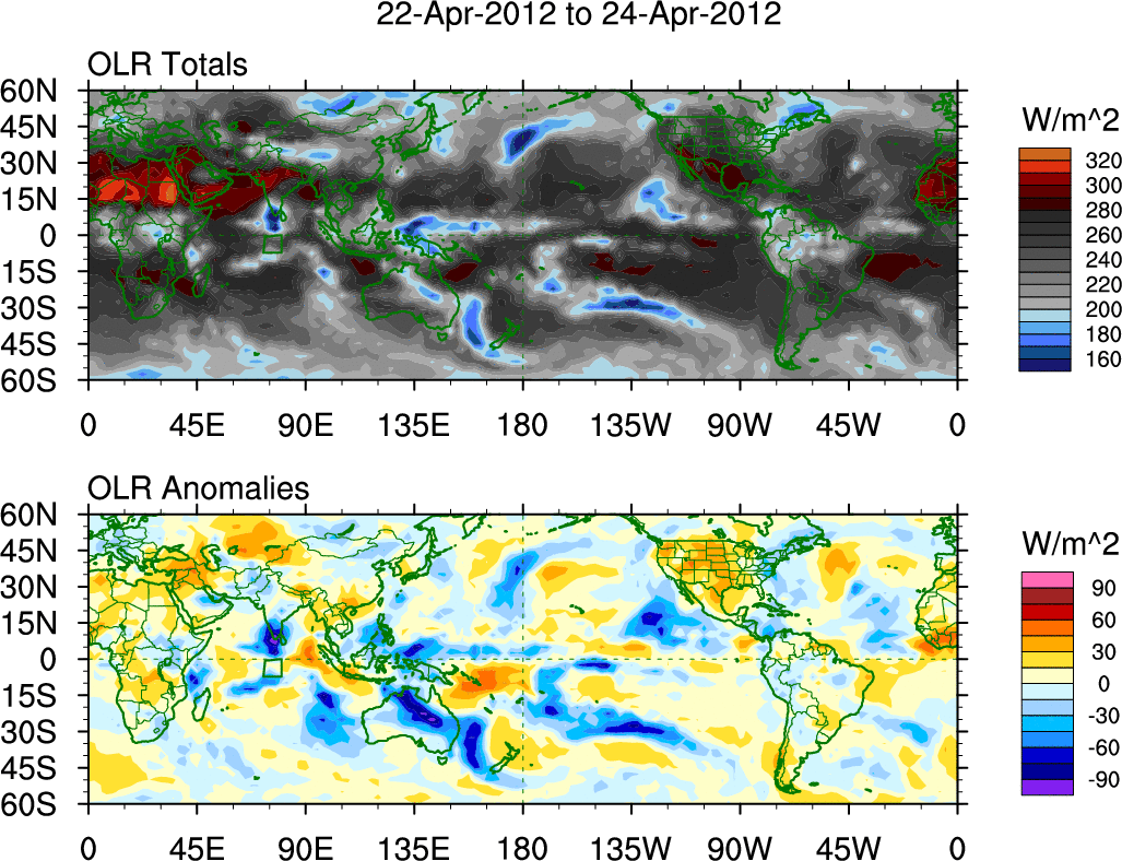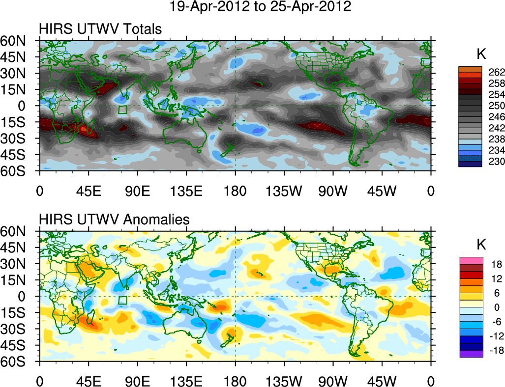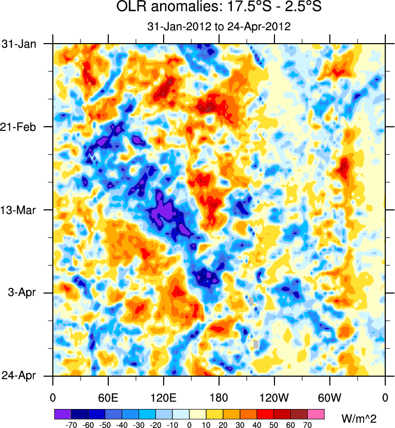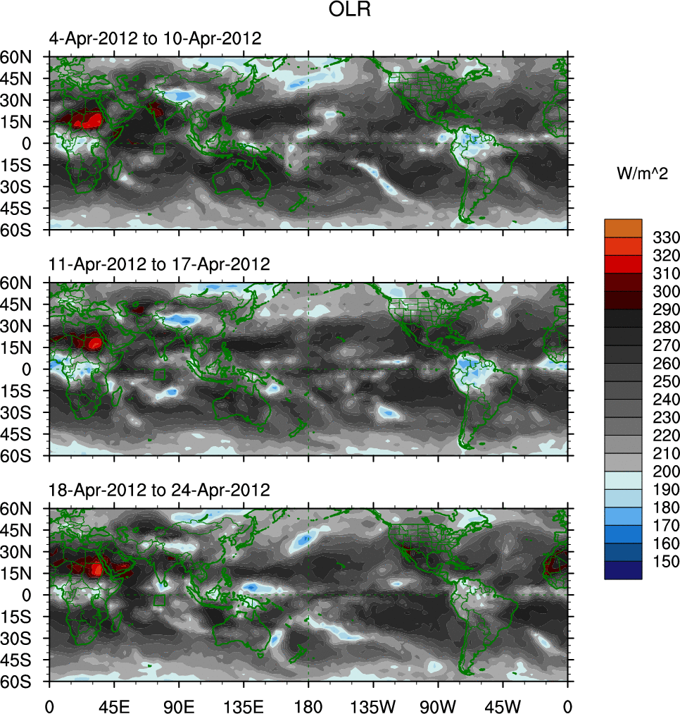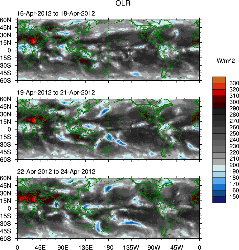 To identify tropical waves in near real-time, the OLR and UTWV data are filtered following Wheeler & Weickmann (2001 MWR). The daily anomalies are calculated using the first 3 harmonics of the seasonal cycle for 1979–2009. Missing values are then filled using linear interpolation in space and time. The most recent 365 days of anomalies are padded with 659 days of zeroes, and the result is filtered for each wave type.