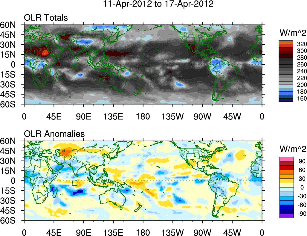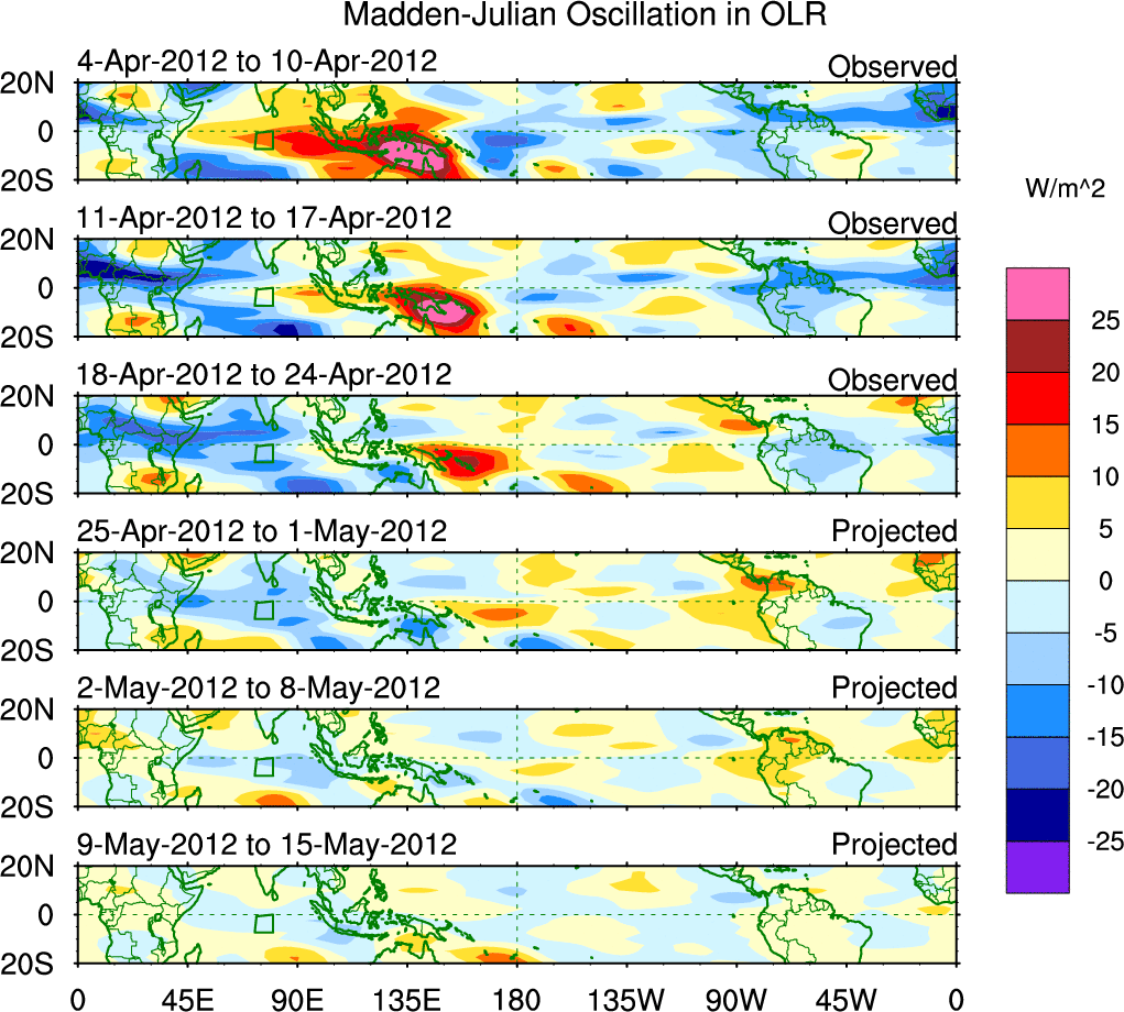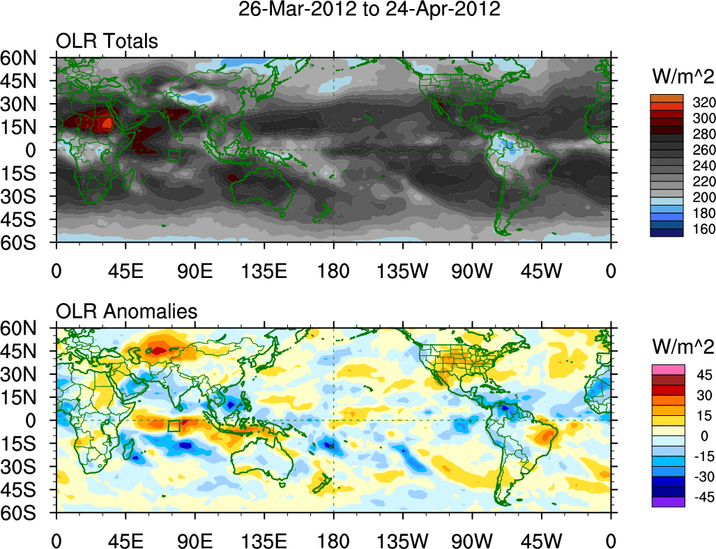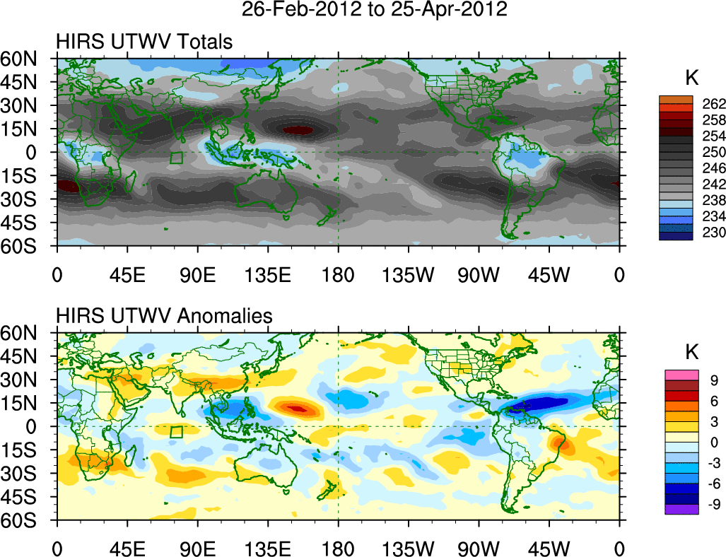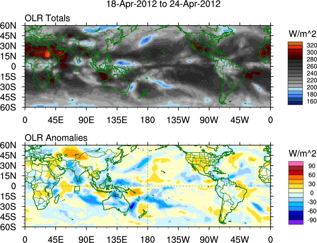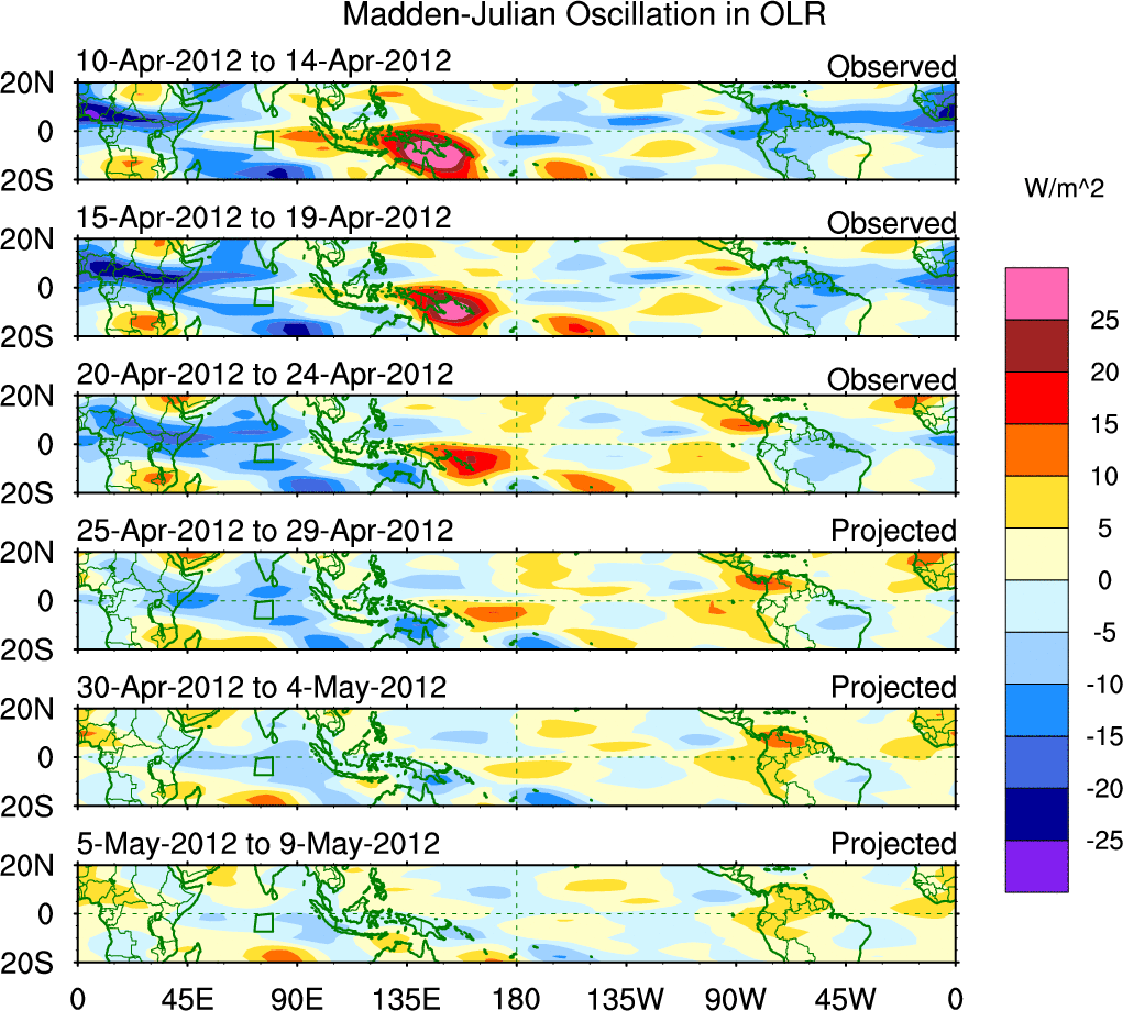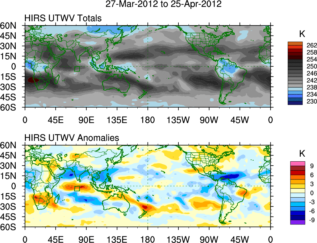 To identify tropical waves in near real-time, the OLR and UTWV data are filtered following Wheeler & Weickmann (2001 MWR). The daily anomalies are calculated using the first 3 harmonics of the seasonal cycle for 1979–2009. Missing values are then filled using linear interpolation in space and time. The most recent 365 days of anomalies are padded with 659 days of zeroes, and the result is filtered for each wave type.