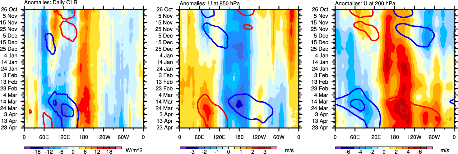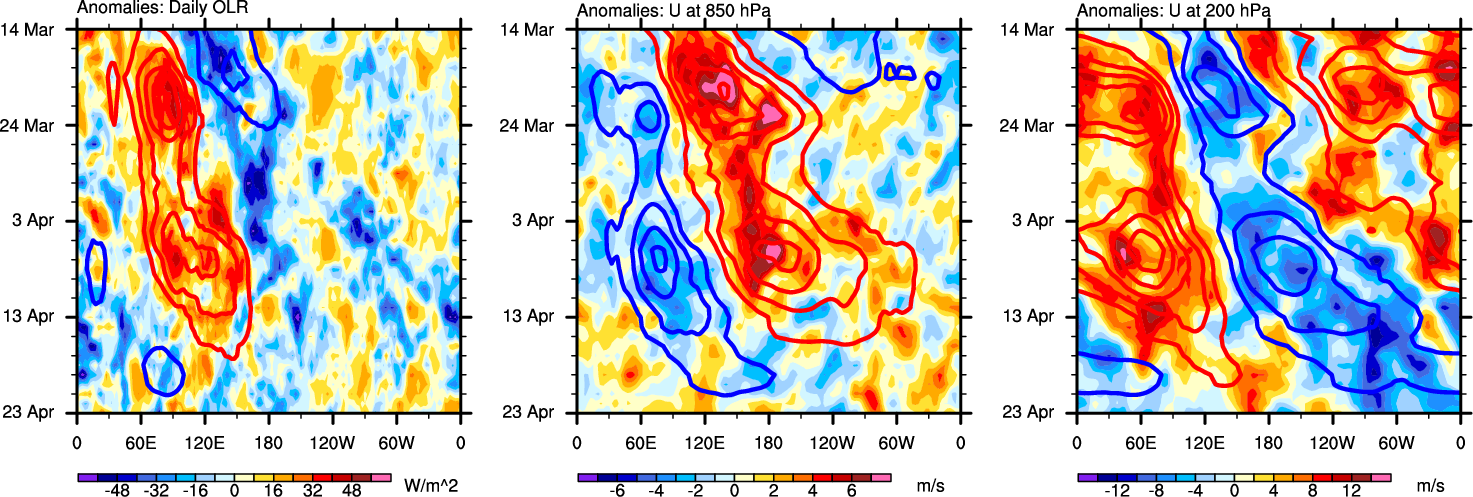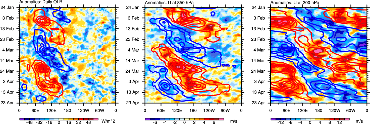 The Hovmollers show longitude-time plots for OLR, U-850, and U-200. The shading indicates the observed anomalies, while the contours are the projection of those anomalies onto the RMM EOFs.