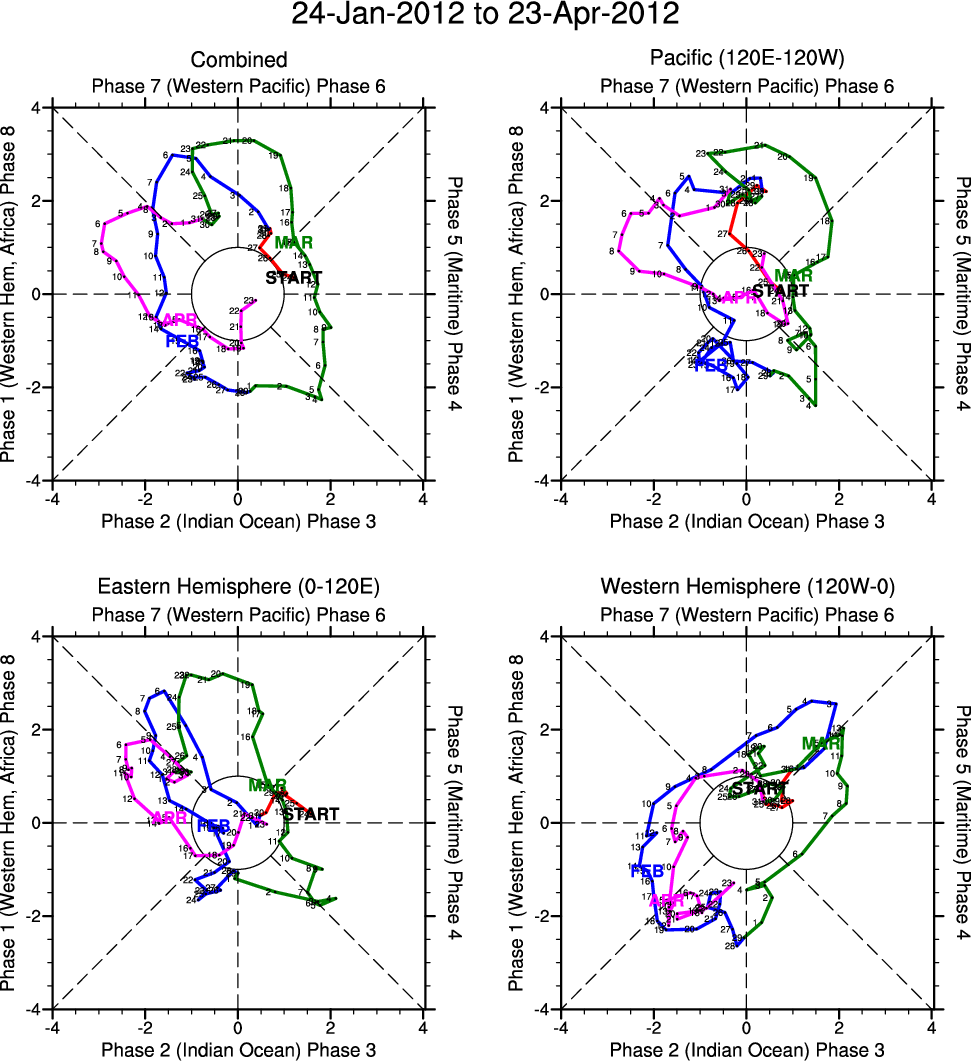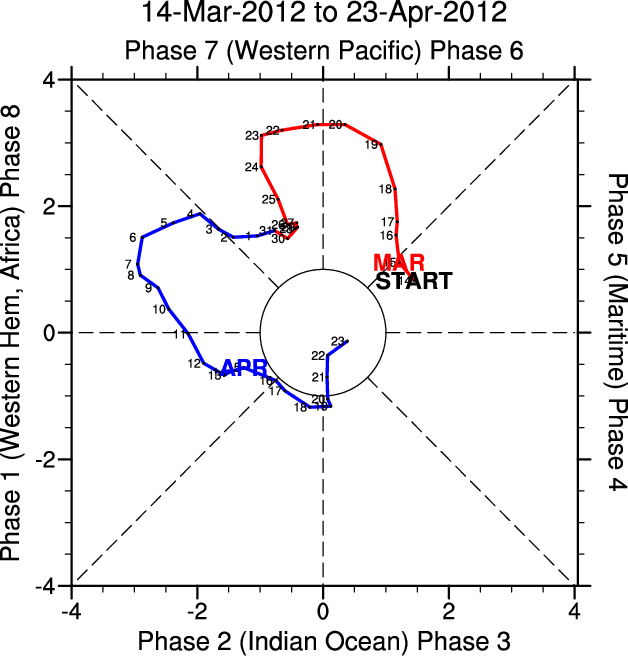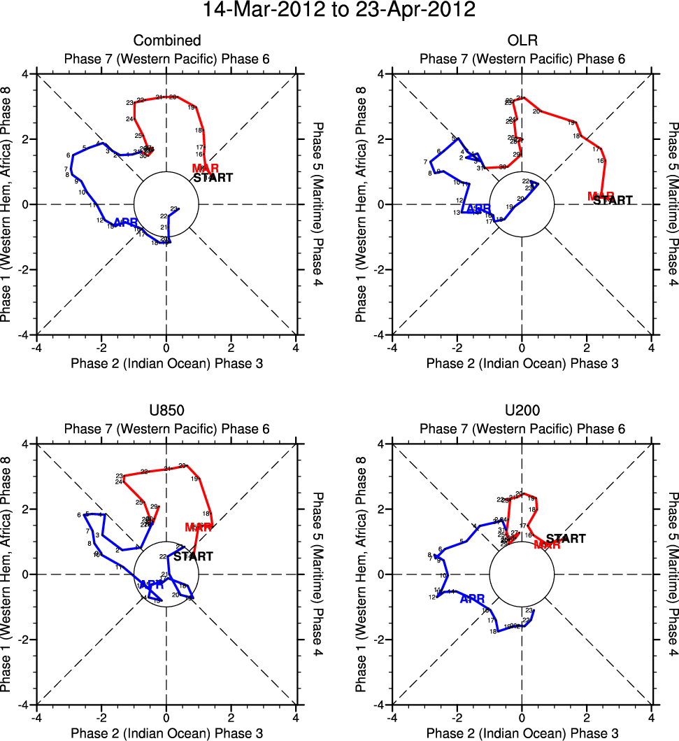 Wheeler and Hendon (2004) constructed the RMM index for monitoring the MJO. This index consists of the first two principal components (PCs) of OLR, 850-hPa zonal wind, and 200-hPa zonal wind averaged 15S-15N.