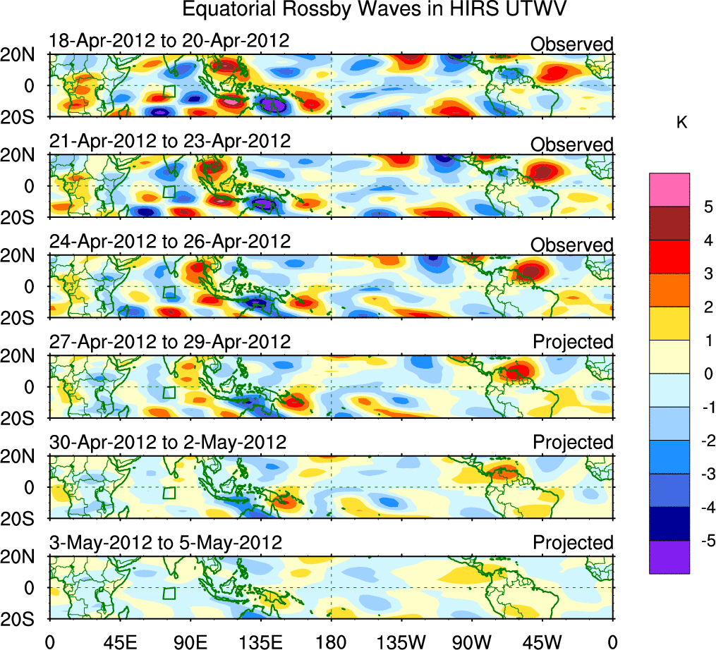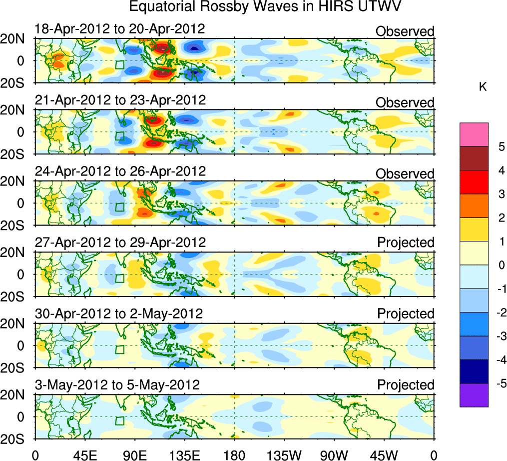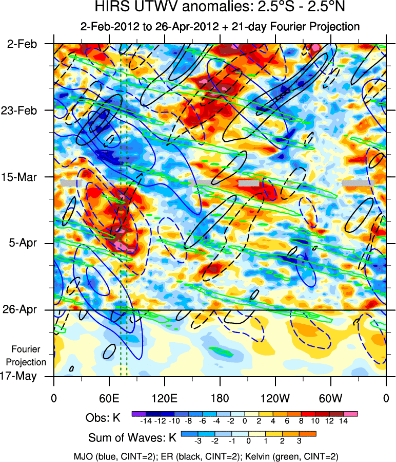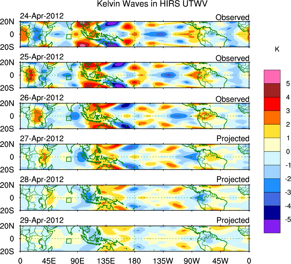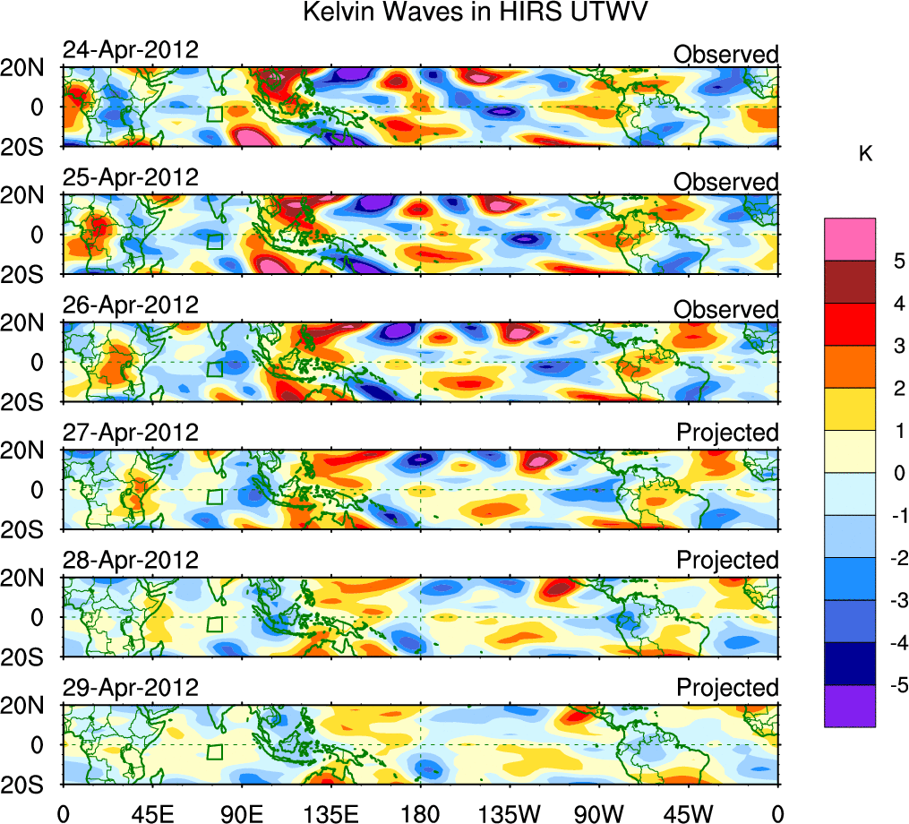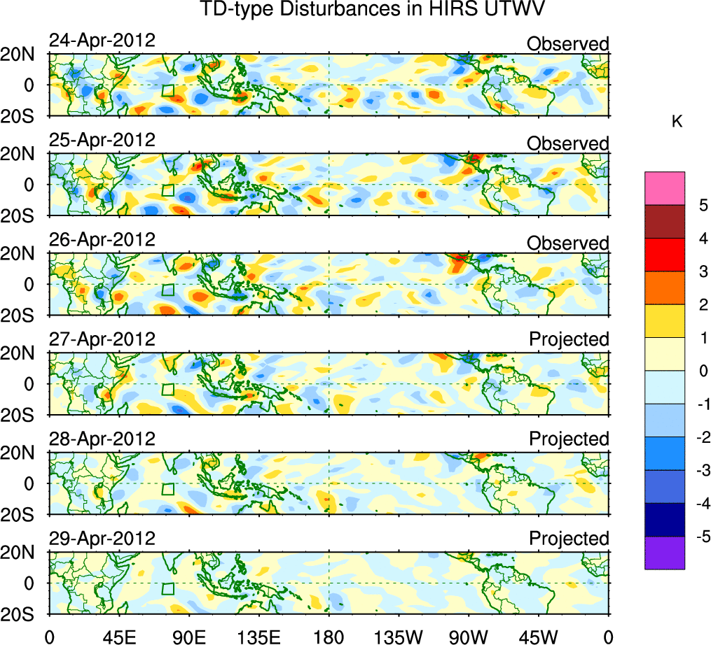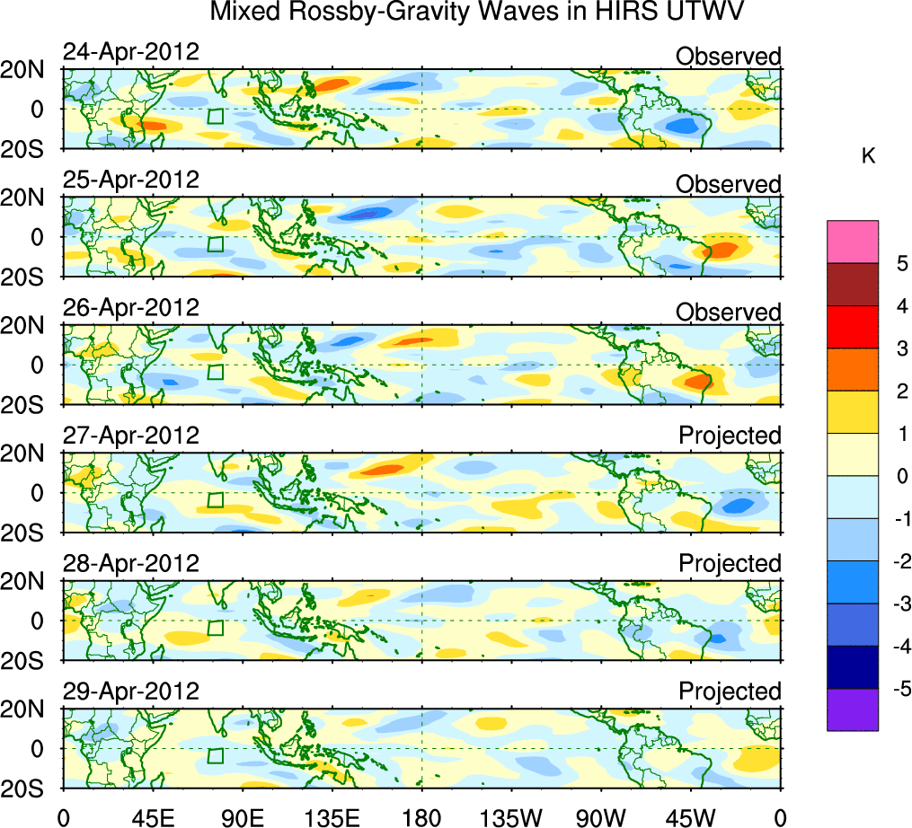 To identify tropical waves in near real-time, the OLR and UTWV data are filtered following Wheeler & Weickmann (2001 MWR). The daily anomalies are calculated using the first 3 harmonics of the seasonal cycle for 1979–2009. Missing values are then filled using linear interpolation in space and time. The most recent 365 days of anomalies are padded with 659 days of zeroes, and the result is filtered for each wave type.