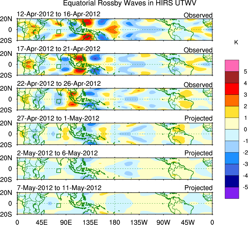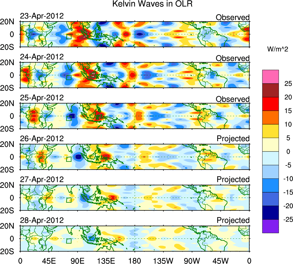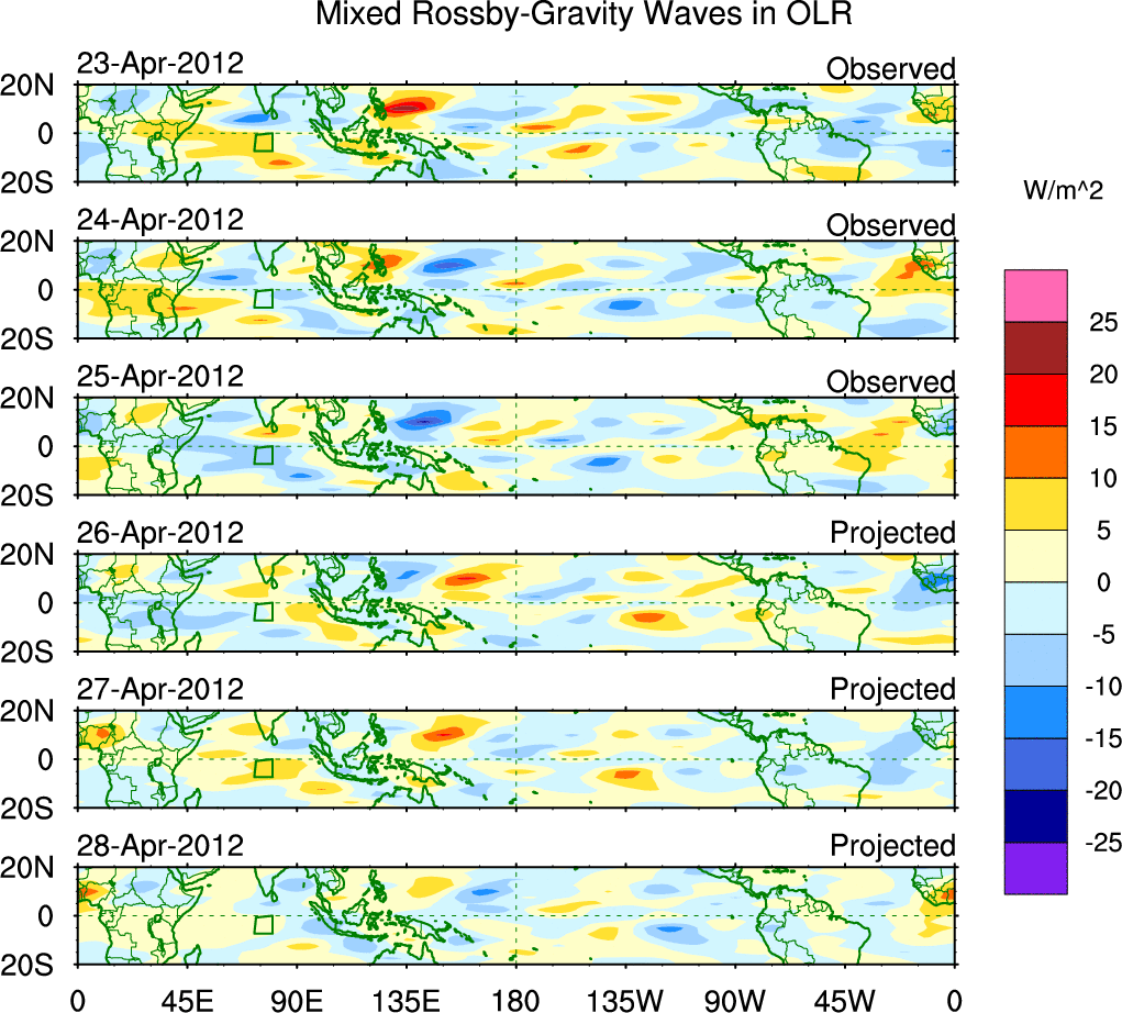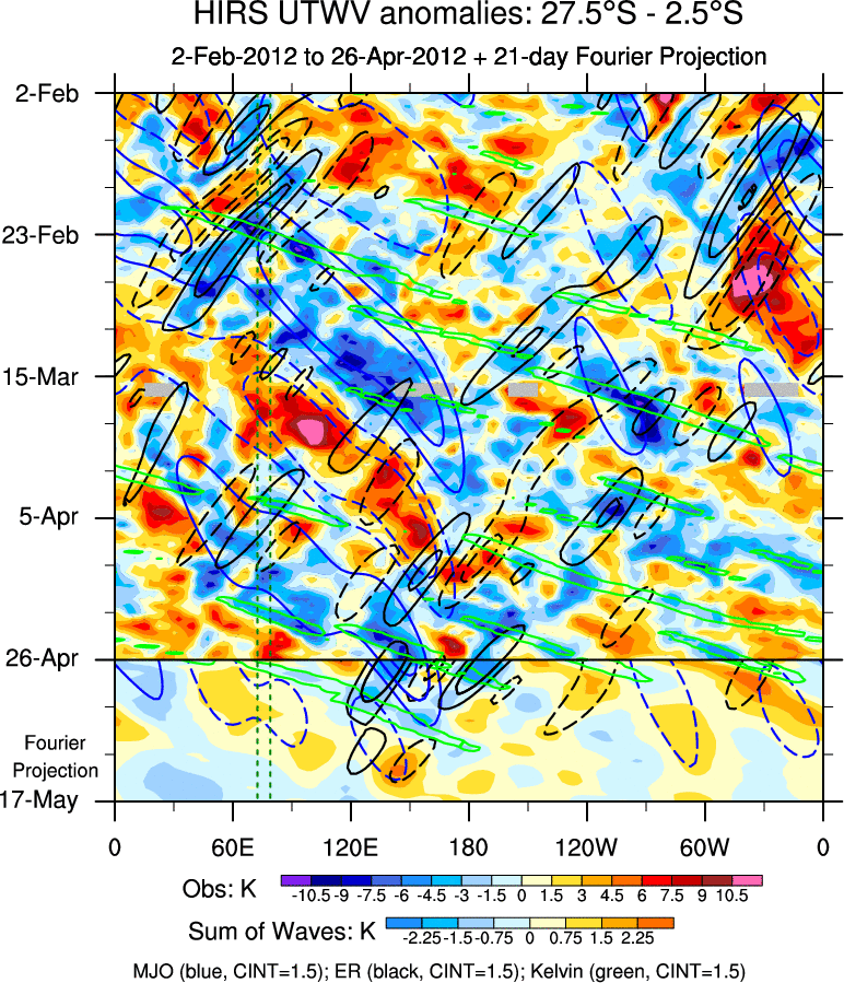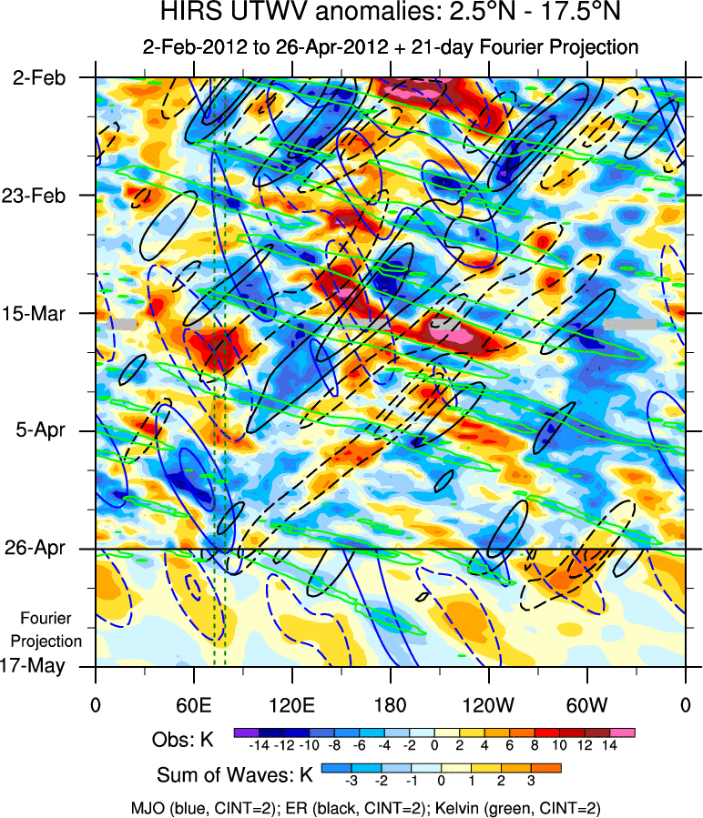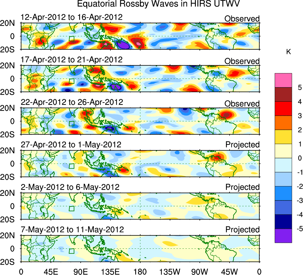 To identify tropical waves in near real-time, the OLR and UTWV data are filtered following Wheeler & Weickmann (2001 MWR). The daily anomalies are calculated using the first 3 harmonics of the seasonal cycle for 1979–2009. Missing values are then filled using linear interpolation in space and time. The most recent 365 days of anomalies are padded with 659 days of zeroes, and the result is filtered for each wave type.