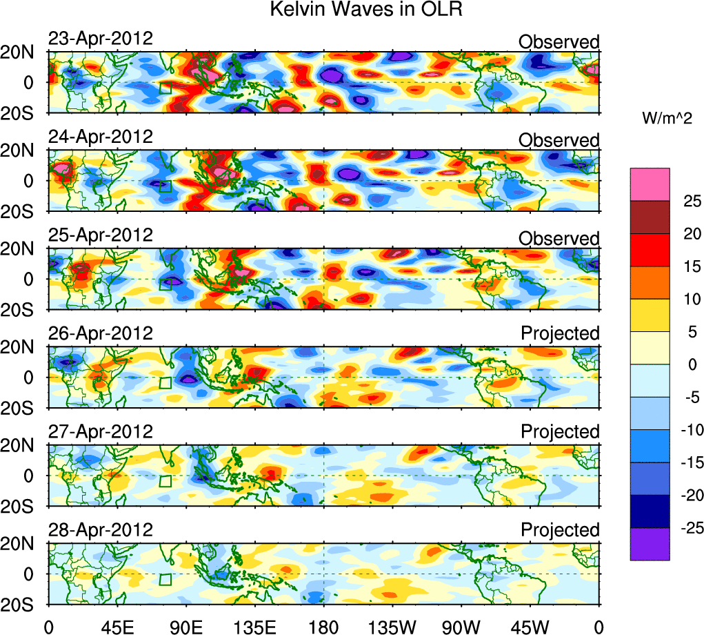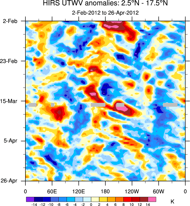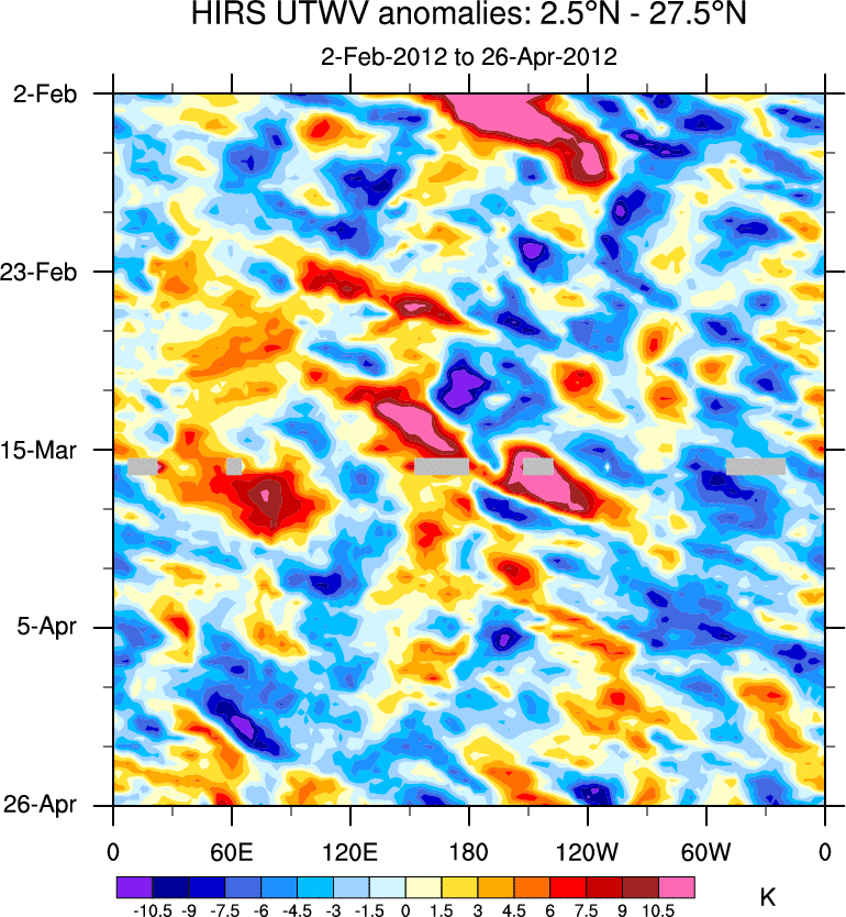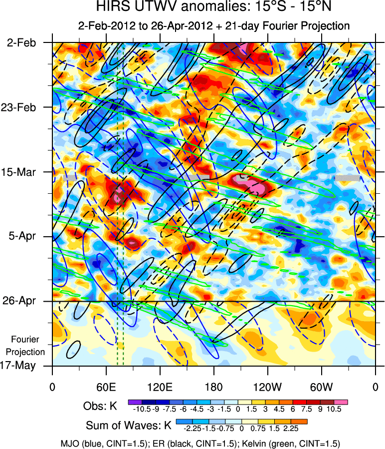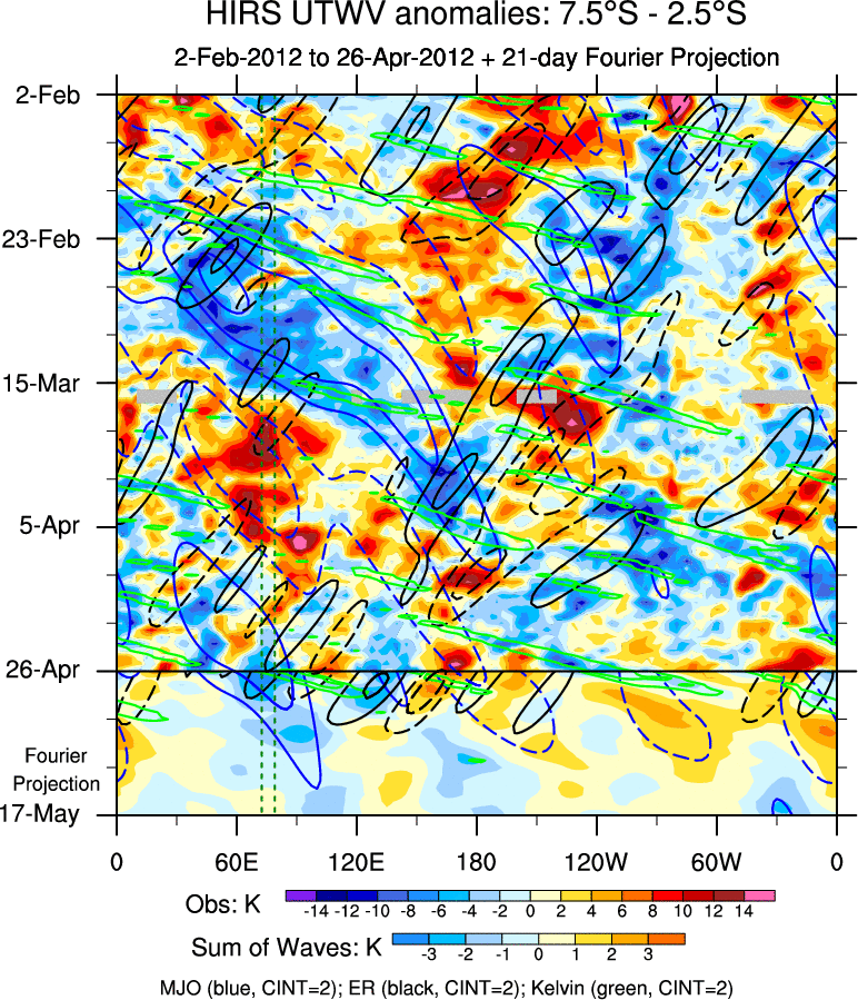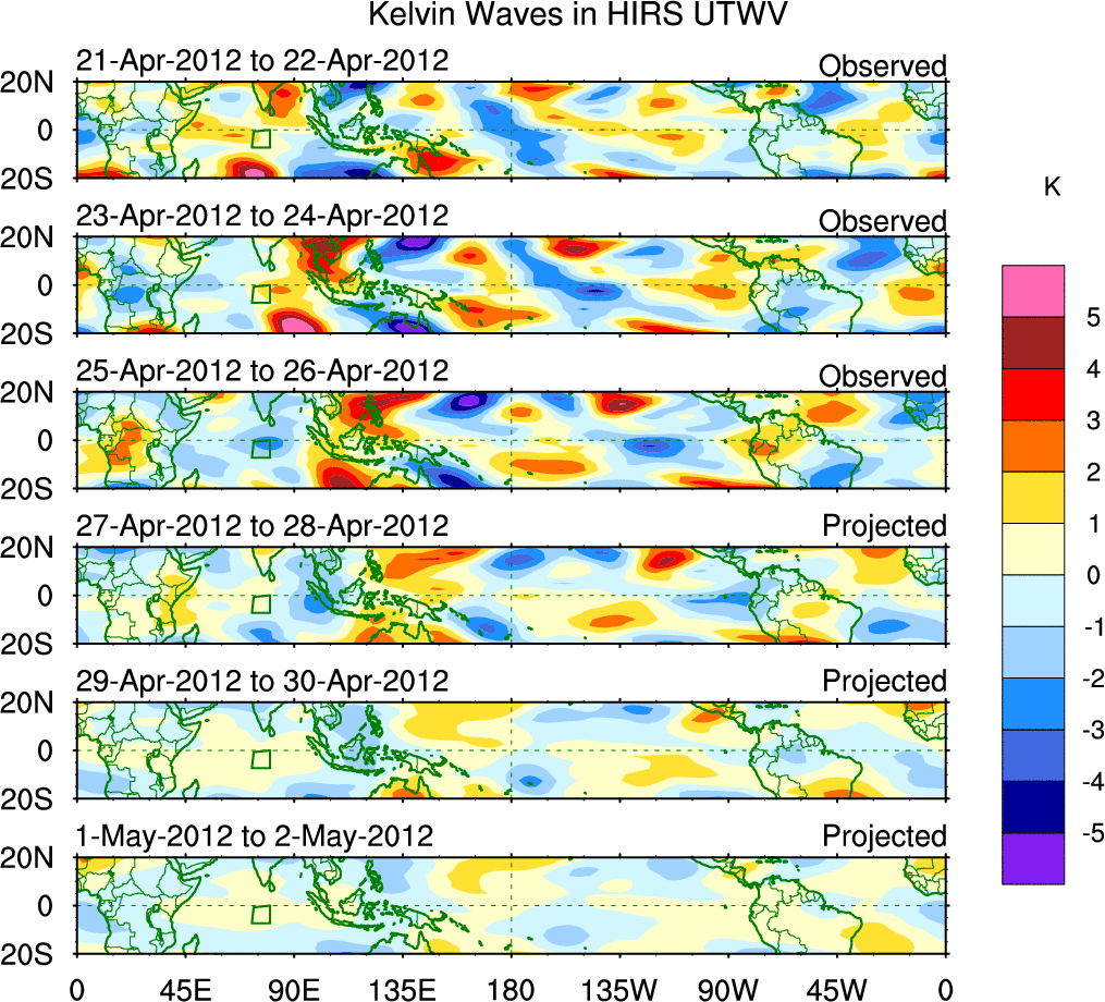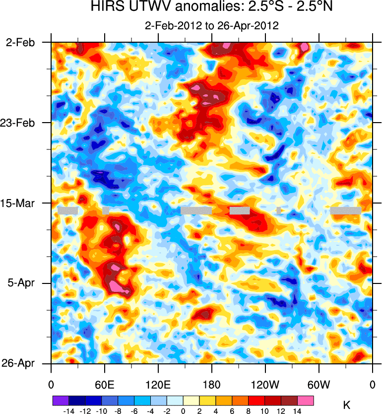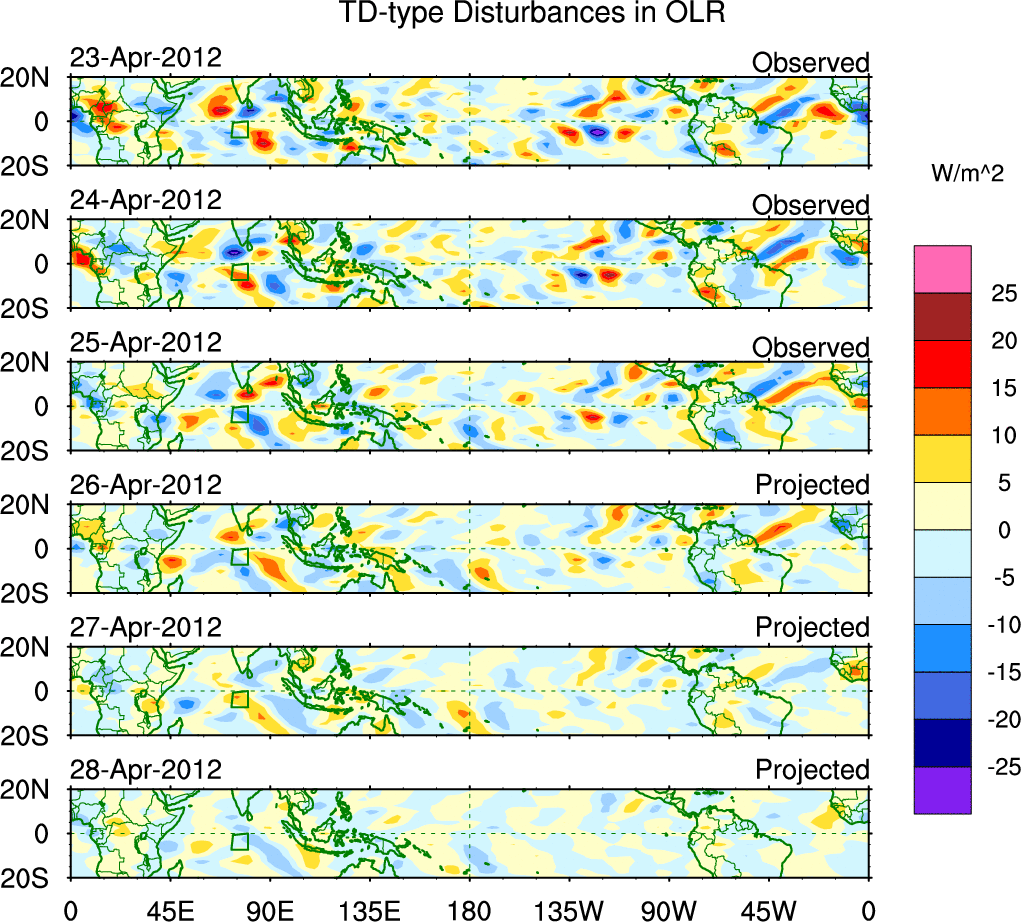 To identify tropical waves in near real-time, the OLR and UTWV data are filtered following Wheeler & Weickmann (2001 MWR). The daily anomalies are calculated using the first 3 harmonics of the seasonal cycle for 1979–2009. Missing values are then filled using linear interpolation in space and time. The most recent 365 days of anomalies are padded with 659 days of zeroes, and the result is filtered for each wave type.